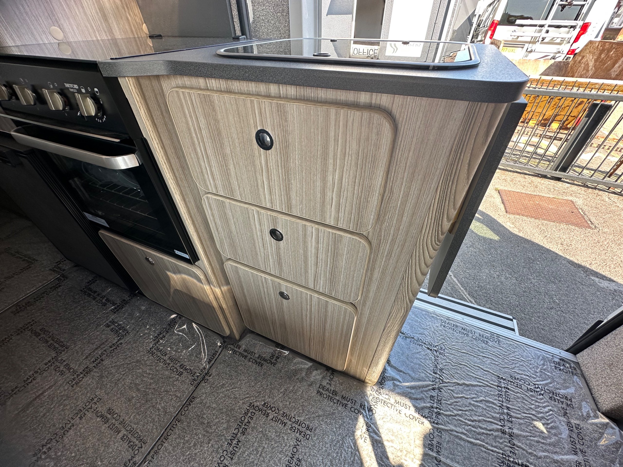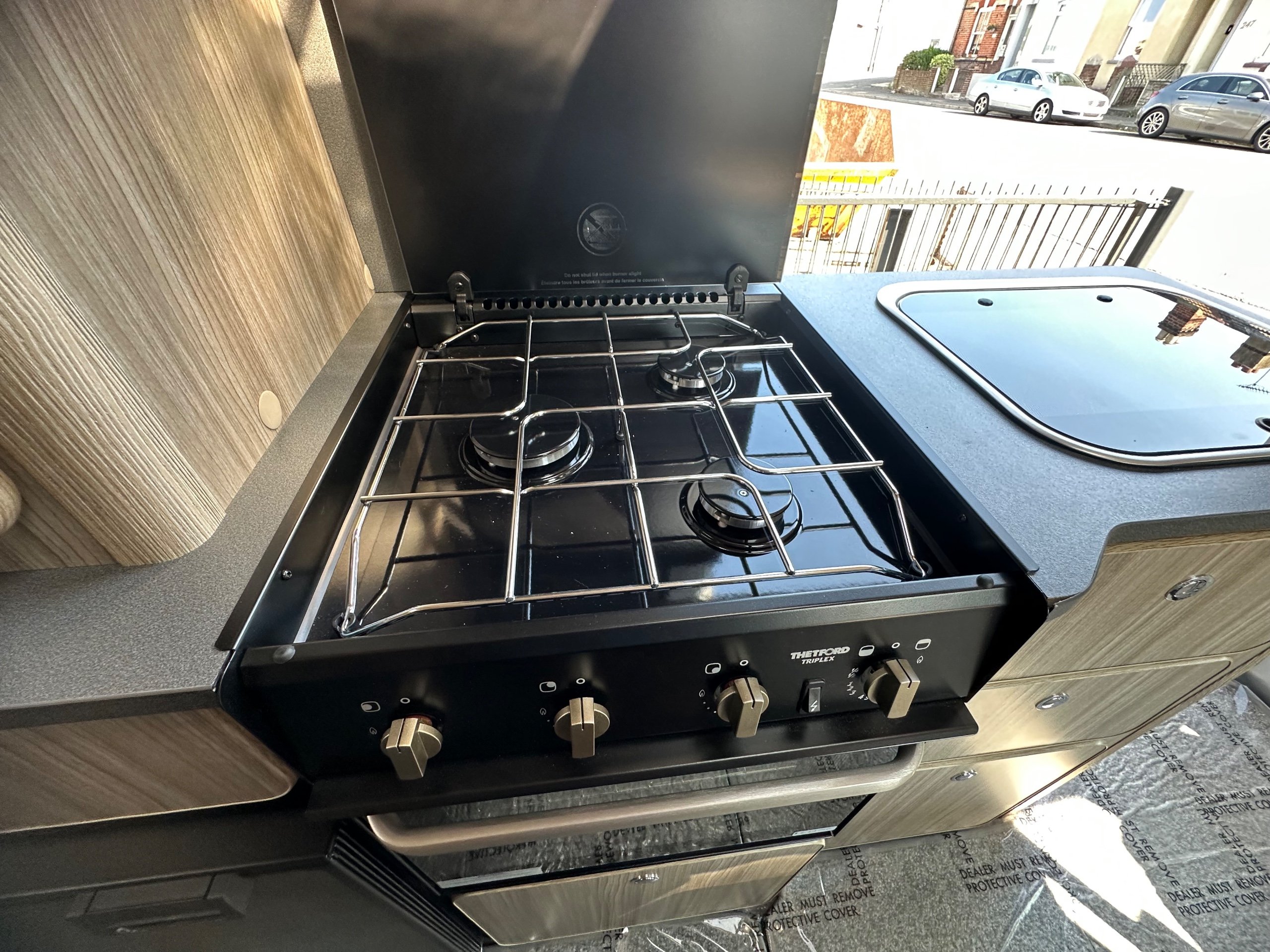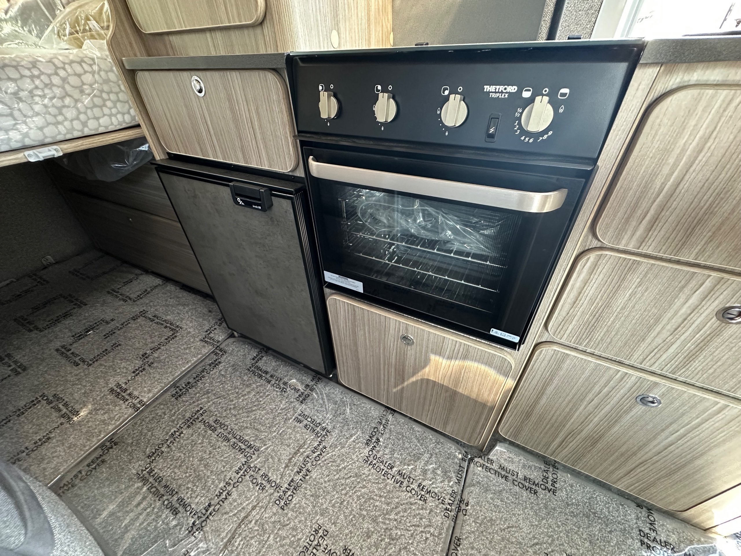 The kitchen is fitted with a new Thetford Triple X oven that also has a grill feature. In both the kitchen & washroom, the sink offers hot & cold water courtesy of the Truma combi boiler that is powered by either gas or mains electric.