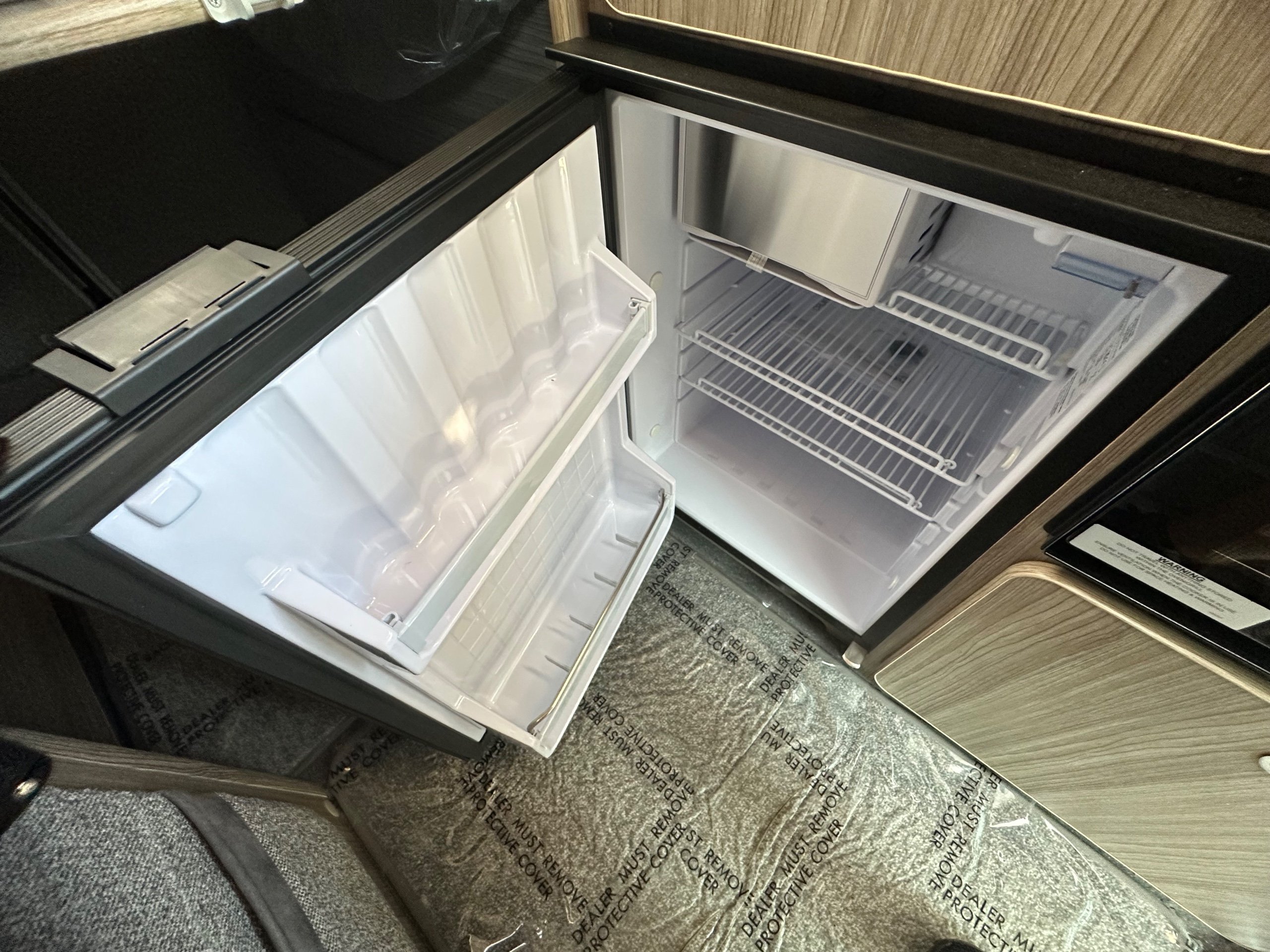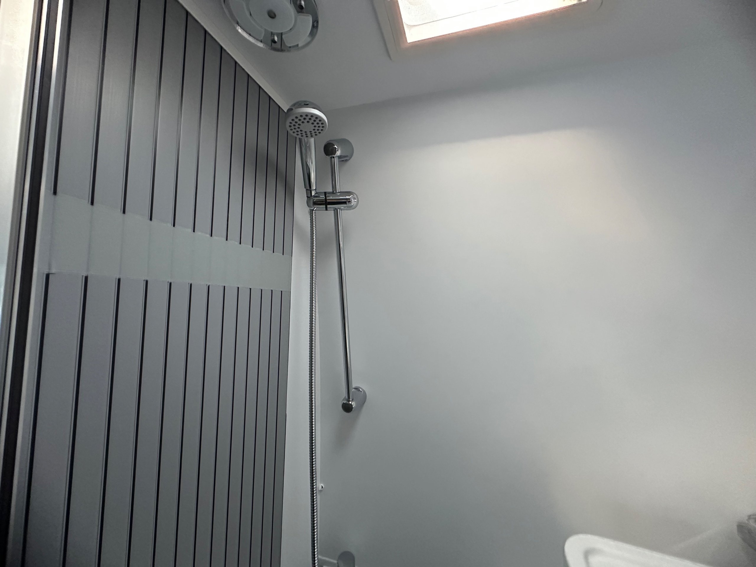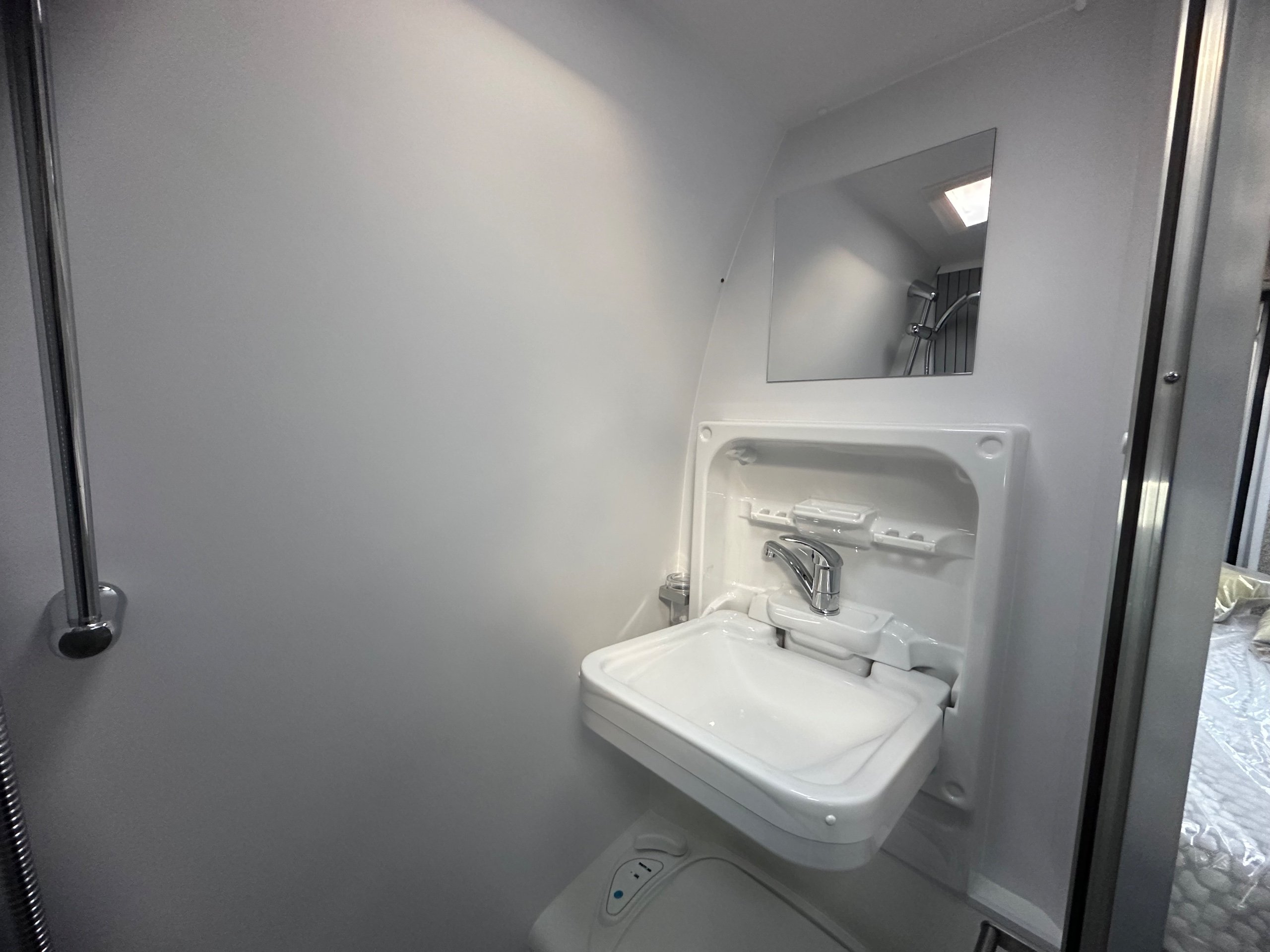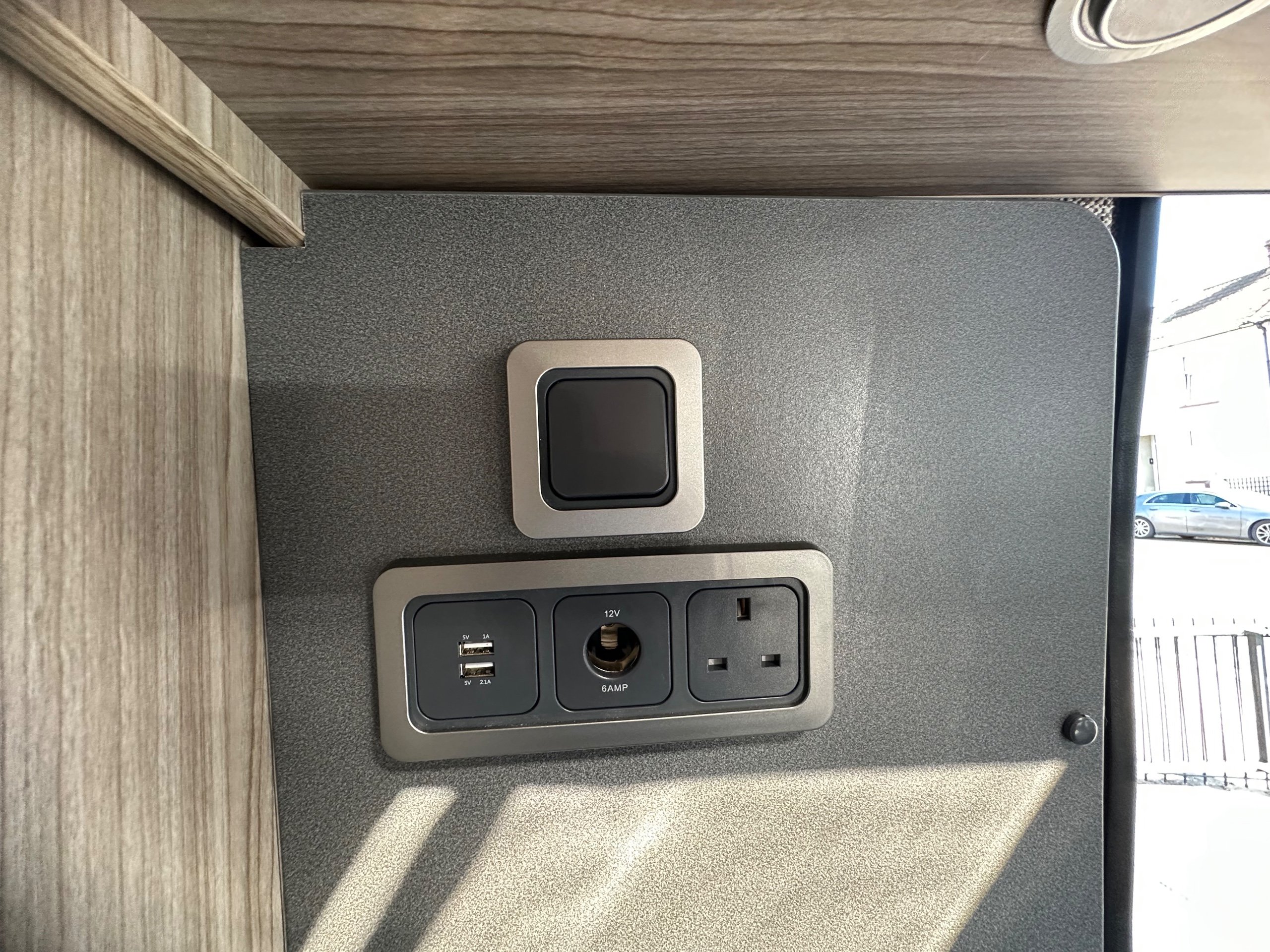 The kitchen is fitted with a new Thetford Triple X oven that also has a grill feature. In both the kitchen & washroom, the sink offers hot & cold water courtesy of the Truma combi boiler that is powered by either gas or mains electric.