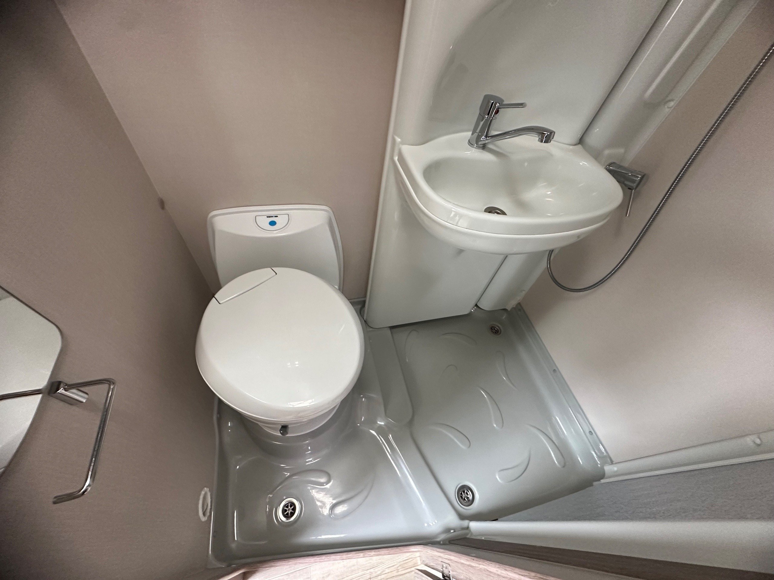 The washroom has a swing around sink unit, so you have a separate shower unit that wouldnt get the toilet wet. The Swivel electric flushing toilet, vanity mirror, toiletries cabinet, towel holder, and a washing line which retracts when not in use.