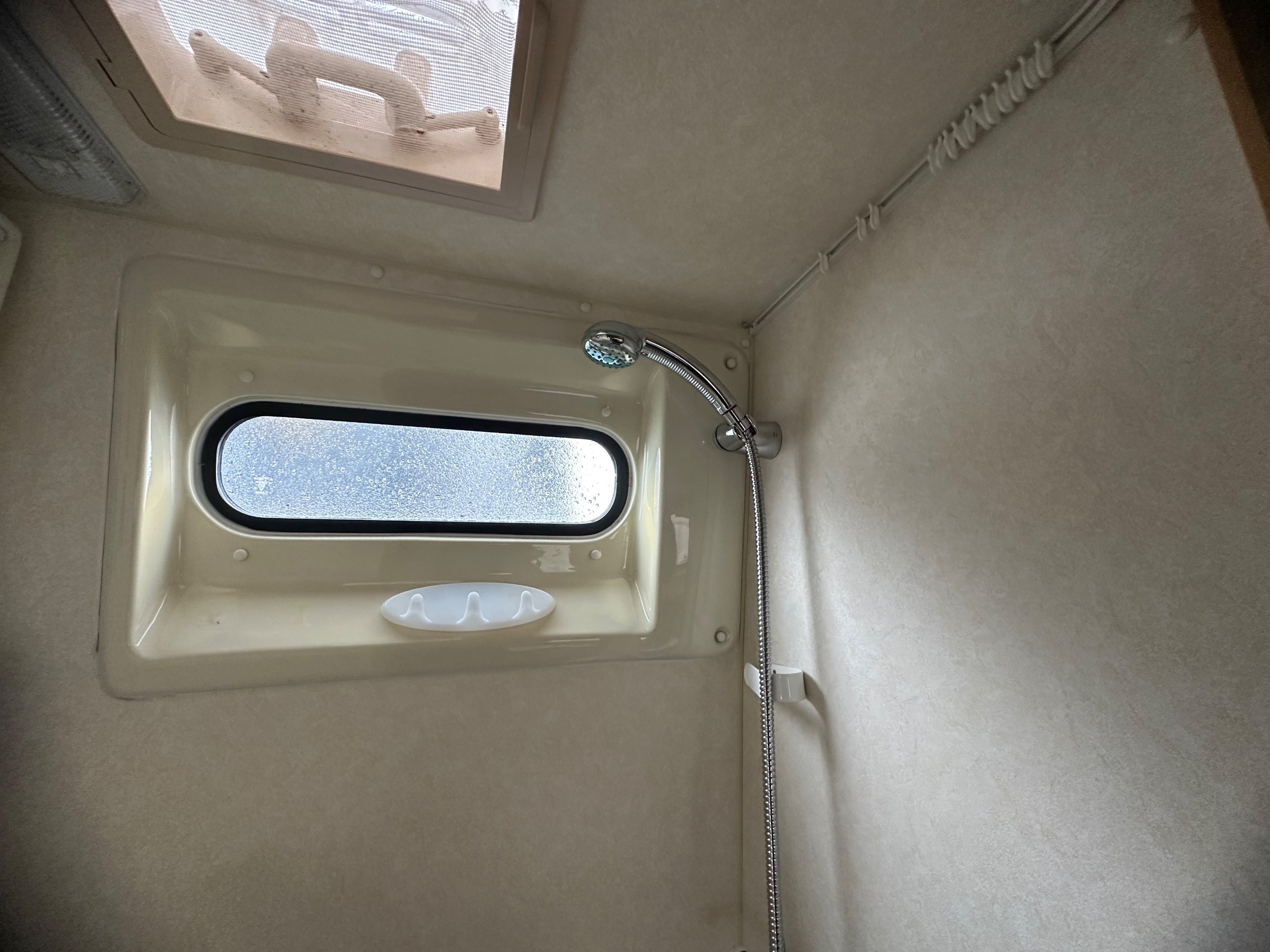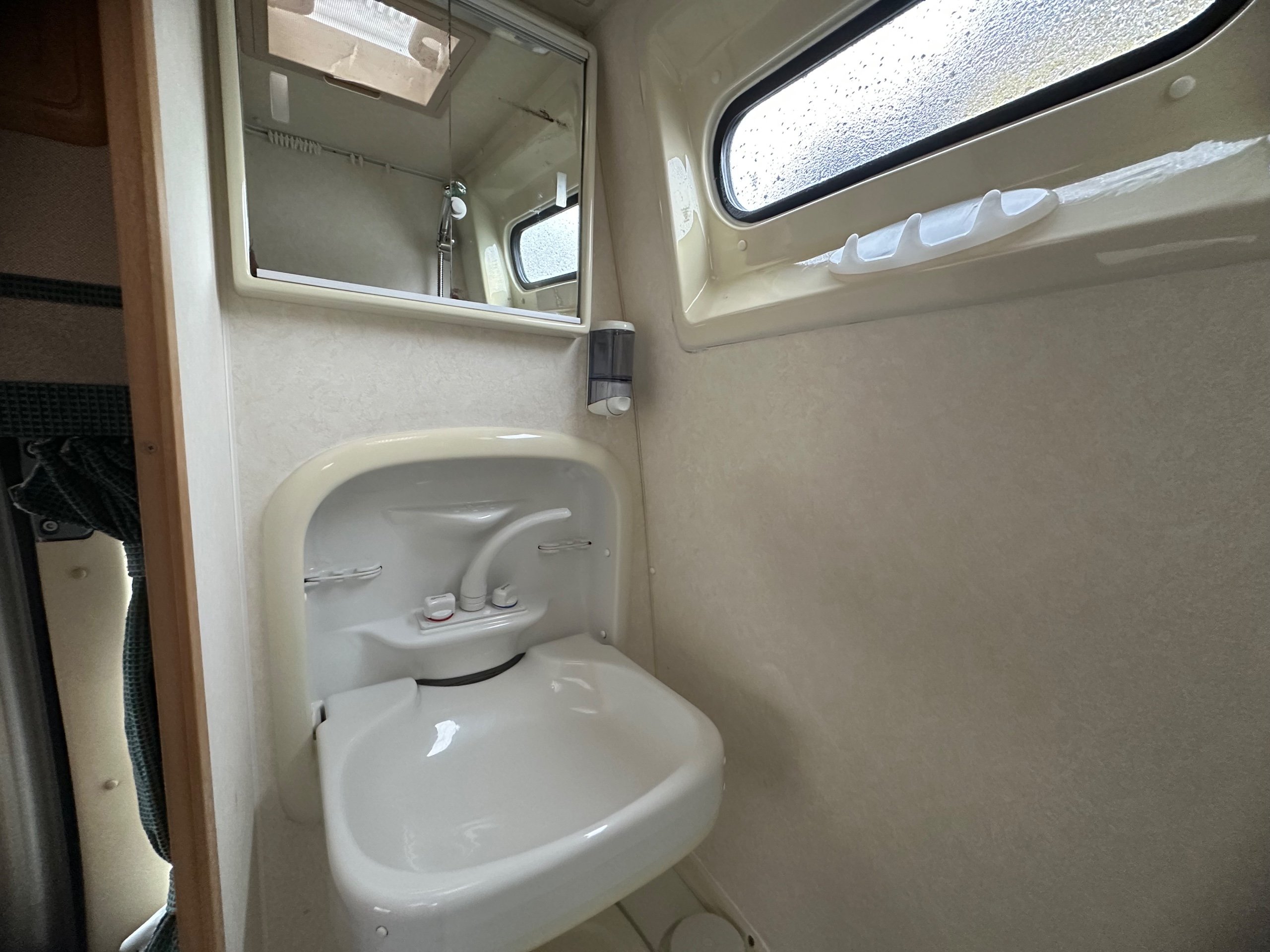 The washroom is opposite and has a shower, electric flushing toilet, drop down handbasin, washroom cabinet with vanity mirror.