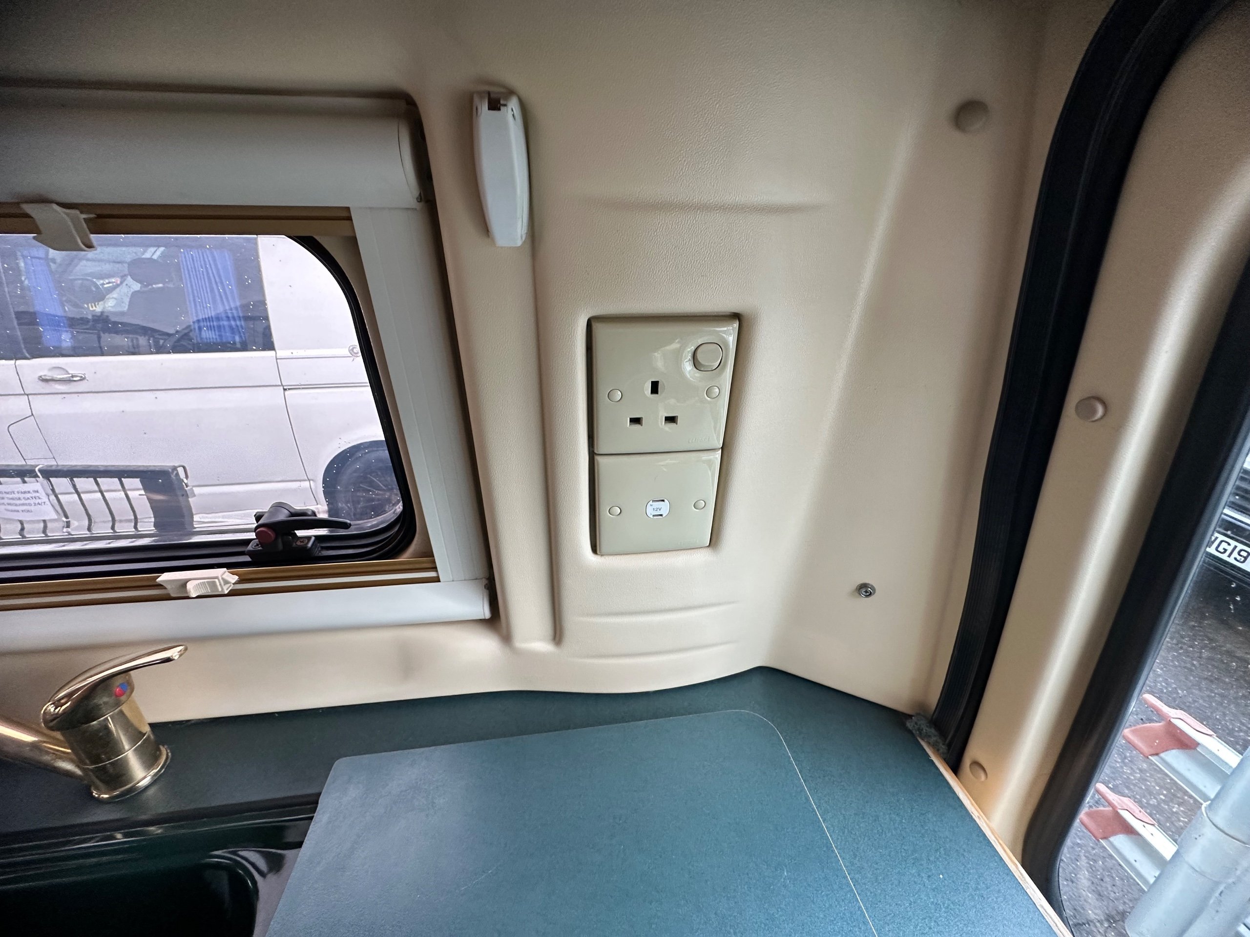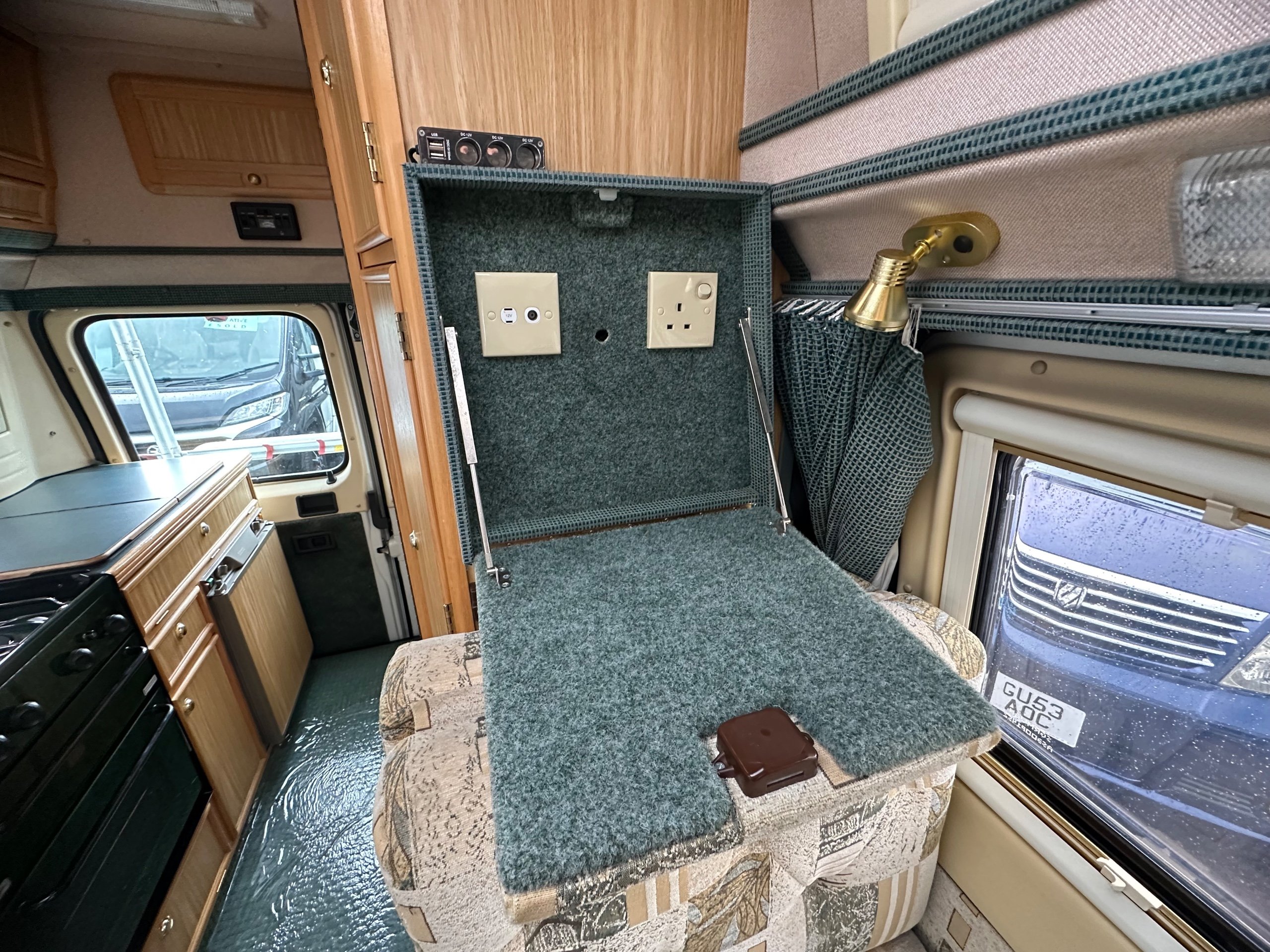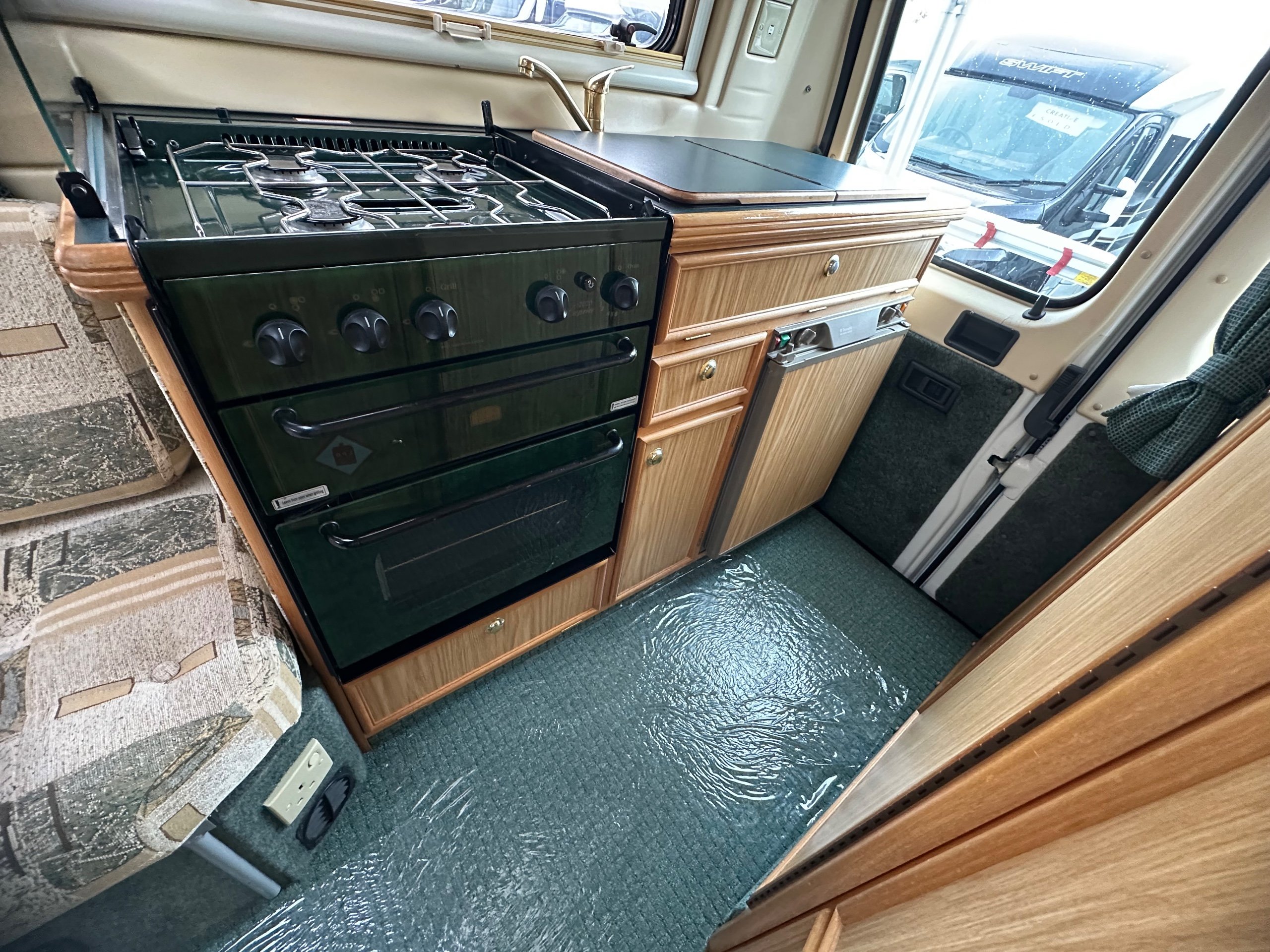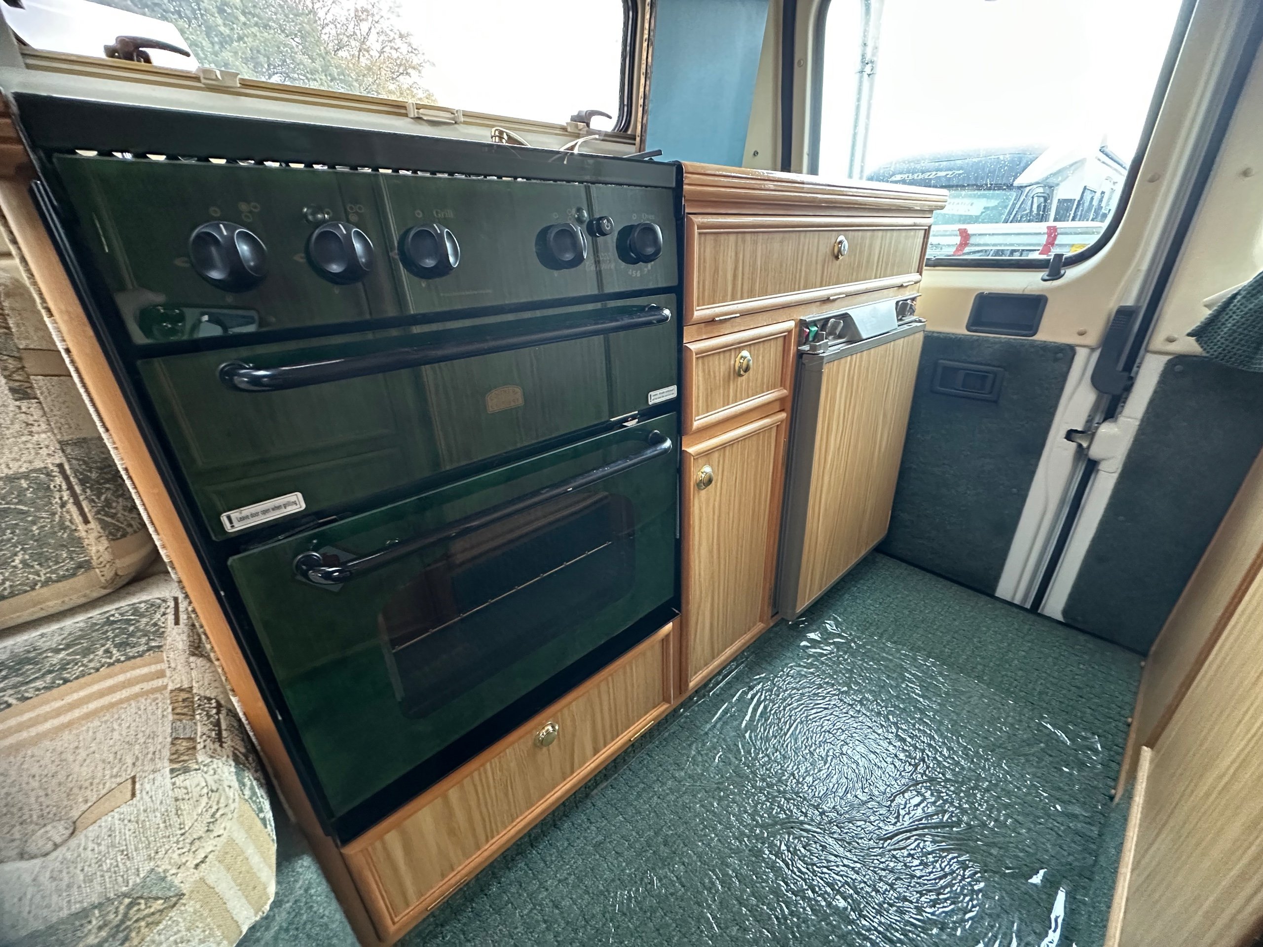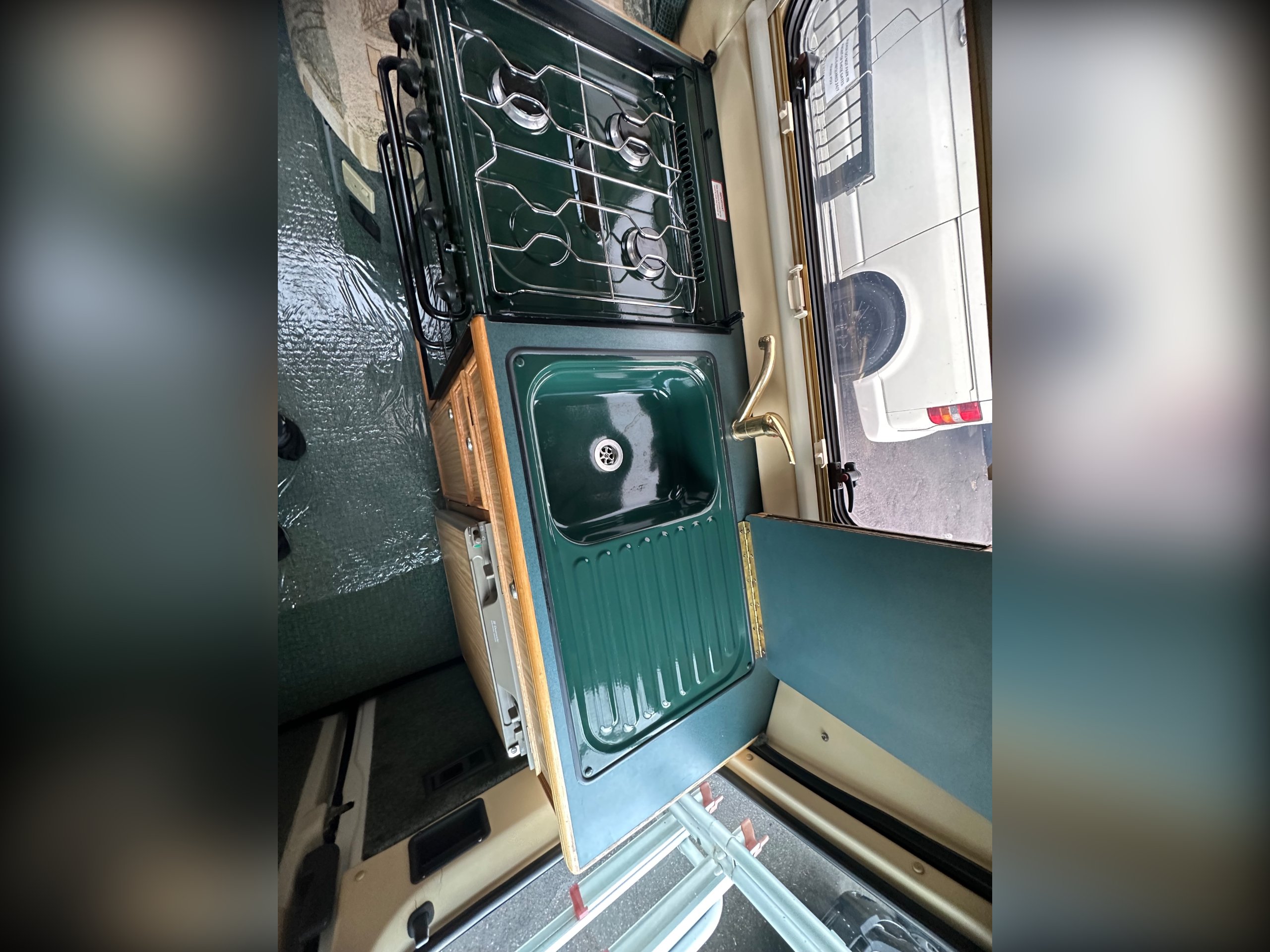 The kitchen has everything you would get from a bigger van with a full cooker which consists of a 4 burner gas hob, separate oven and grill, 3 way fridge with freezer compartment, sink with built in drainer/chopping board. There is storage for the groceries also.
