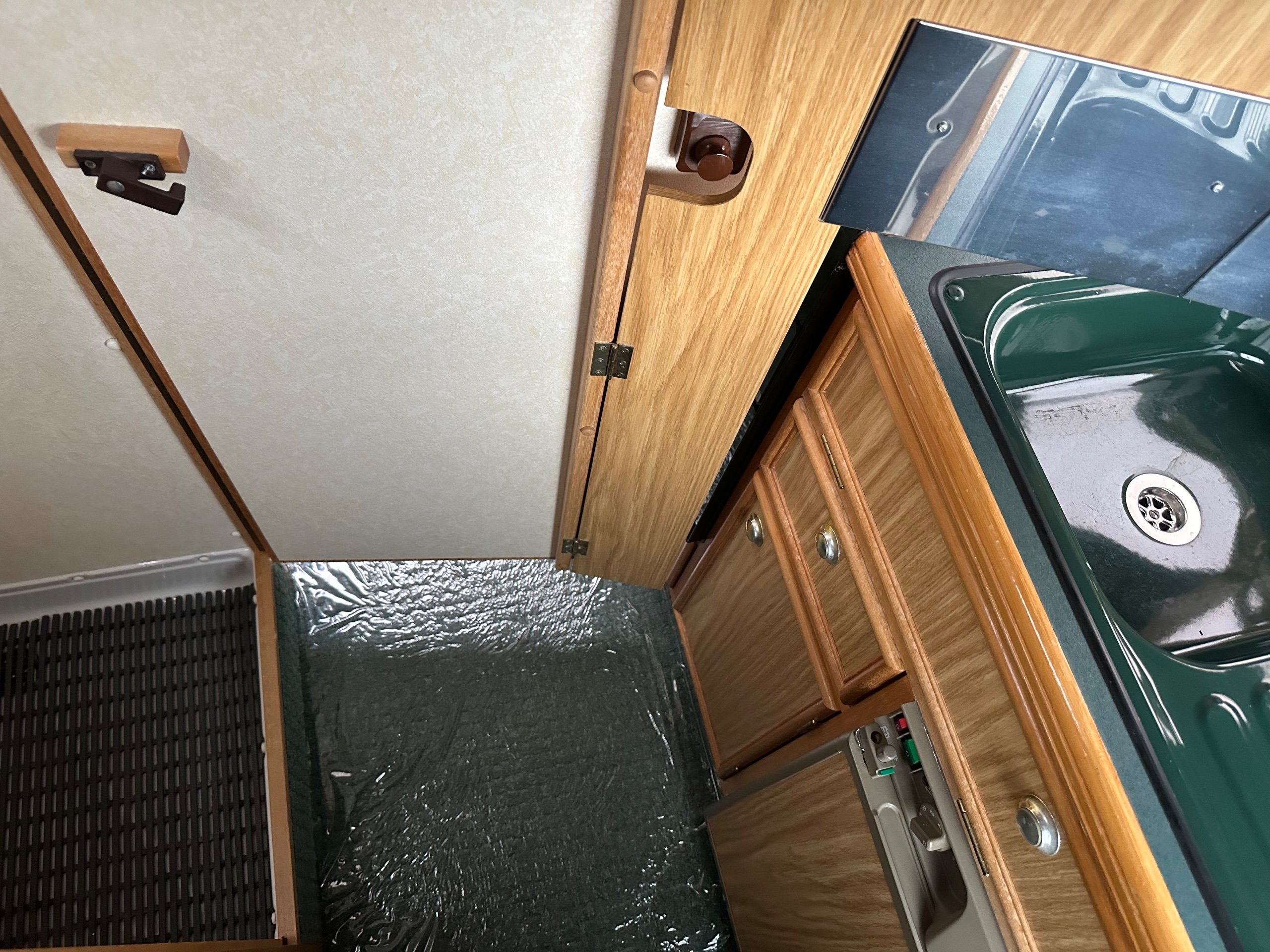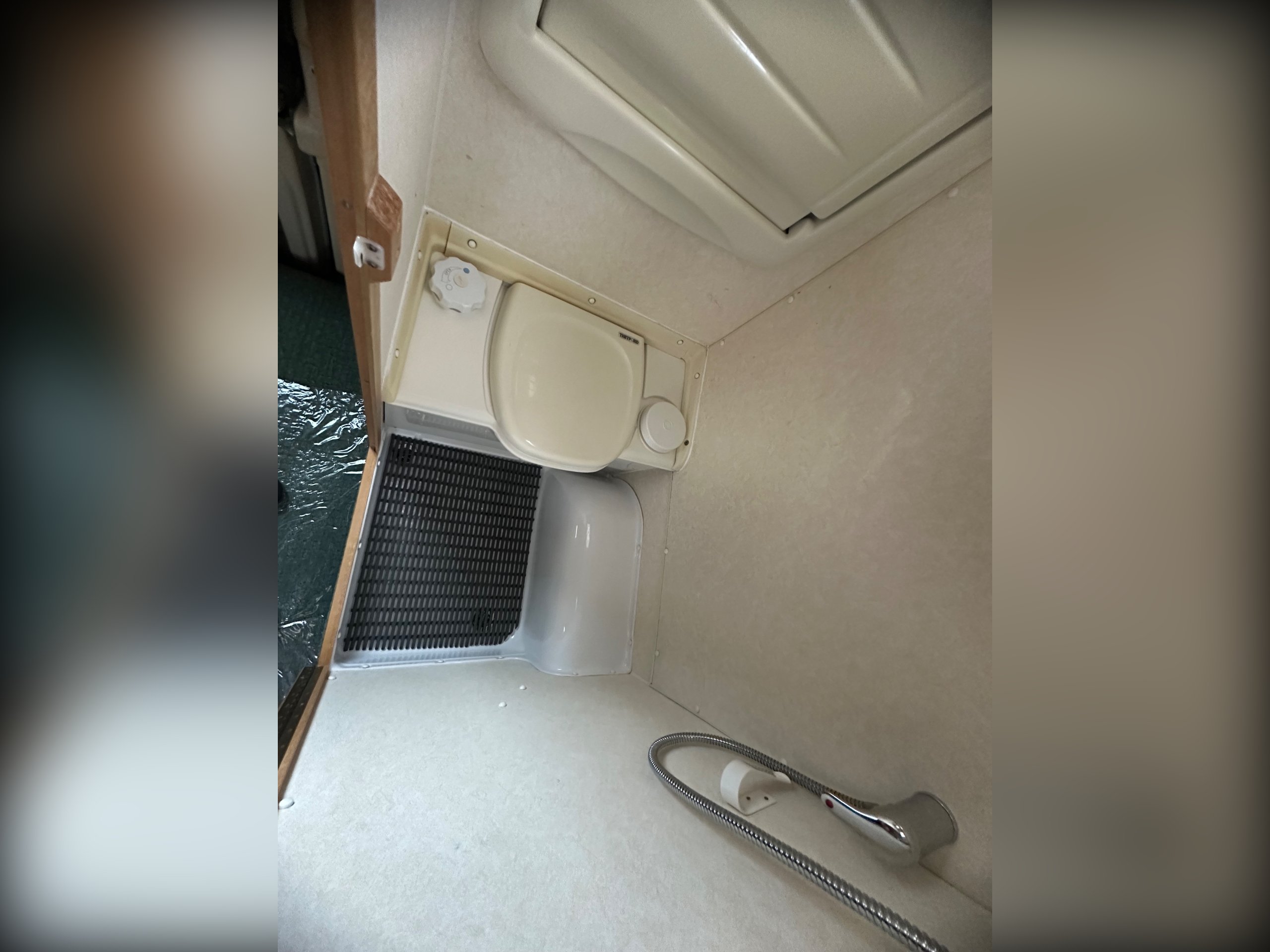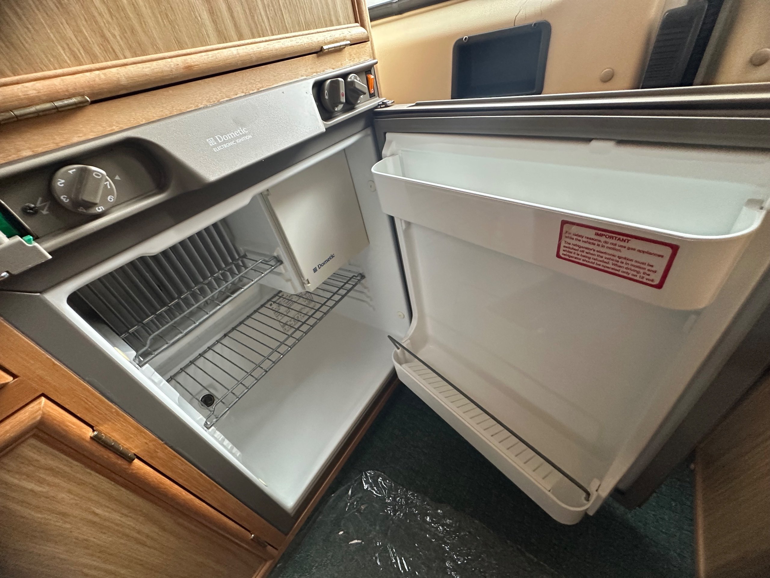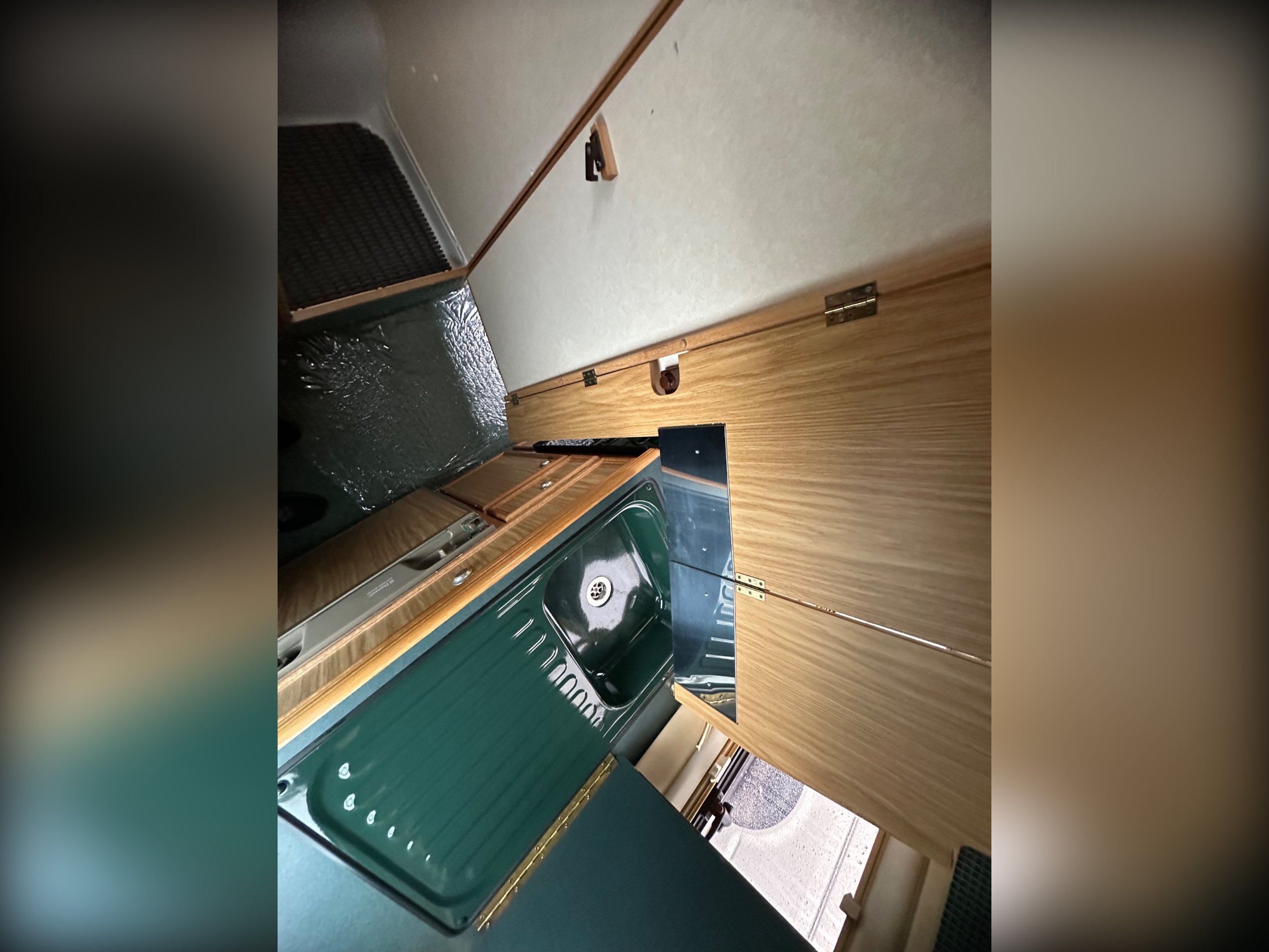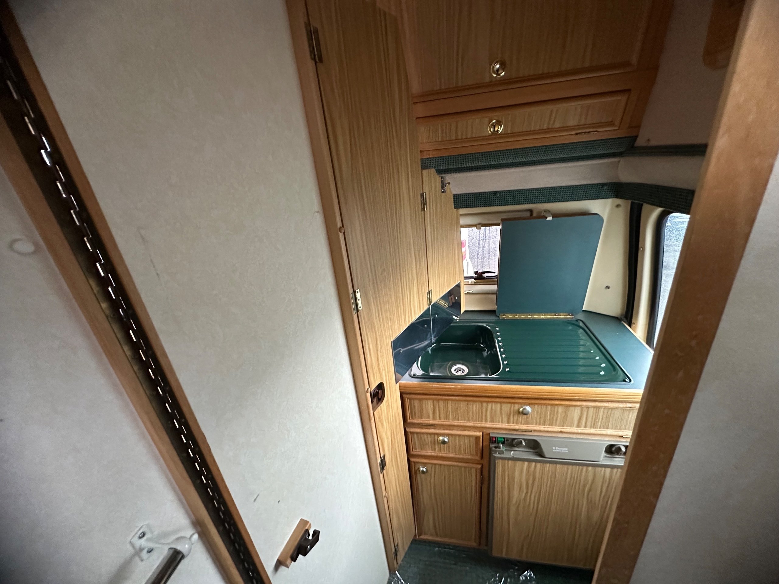 The kitchen has everything you would get from a bigger van with a full cooker which consists of a 4 burner gas hob, separate oven and grill, 3 way fridge with freezer compartment, sink with built in drainer/chopping board. There is storage for the groceries also.