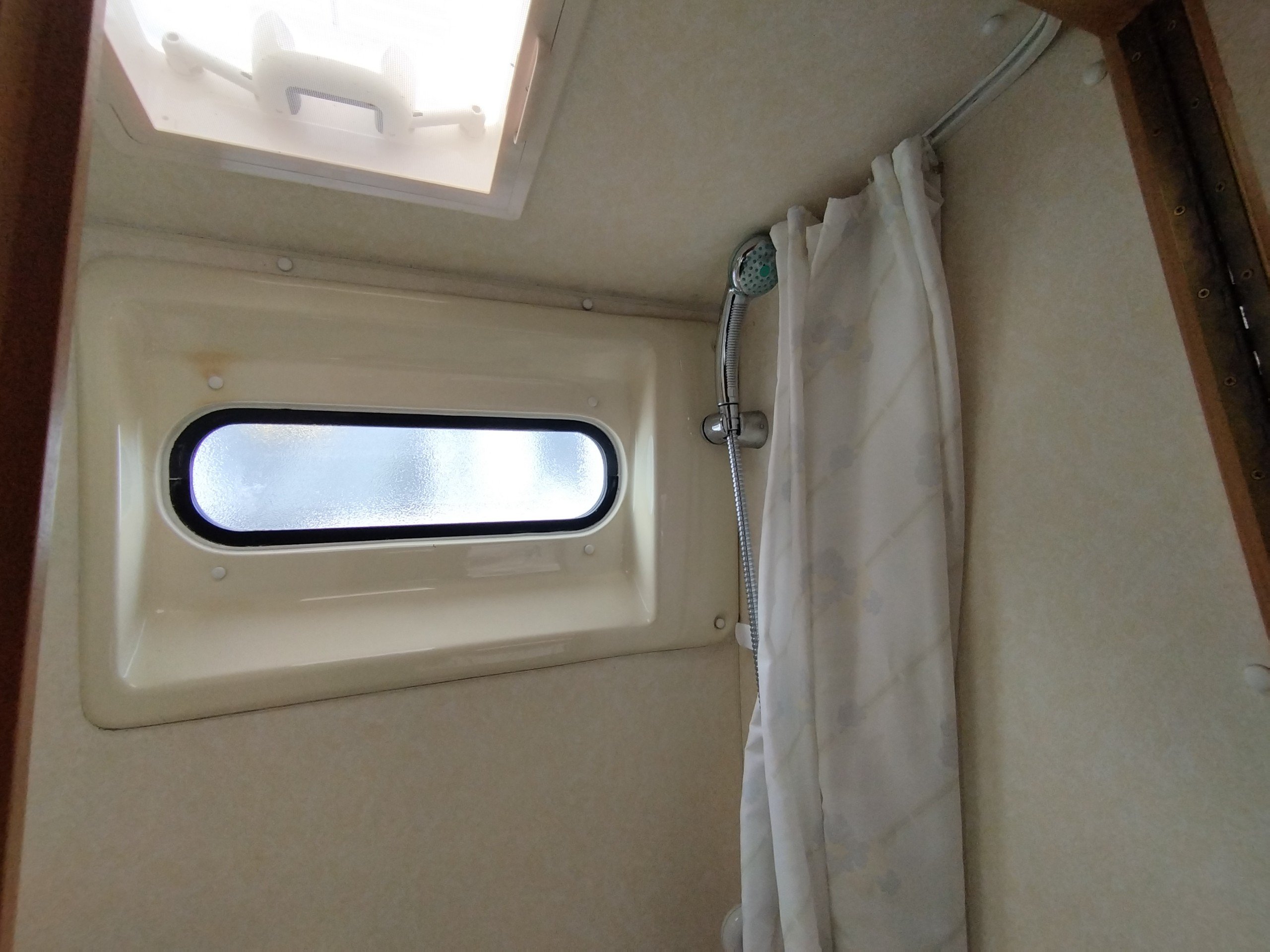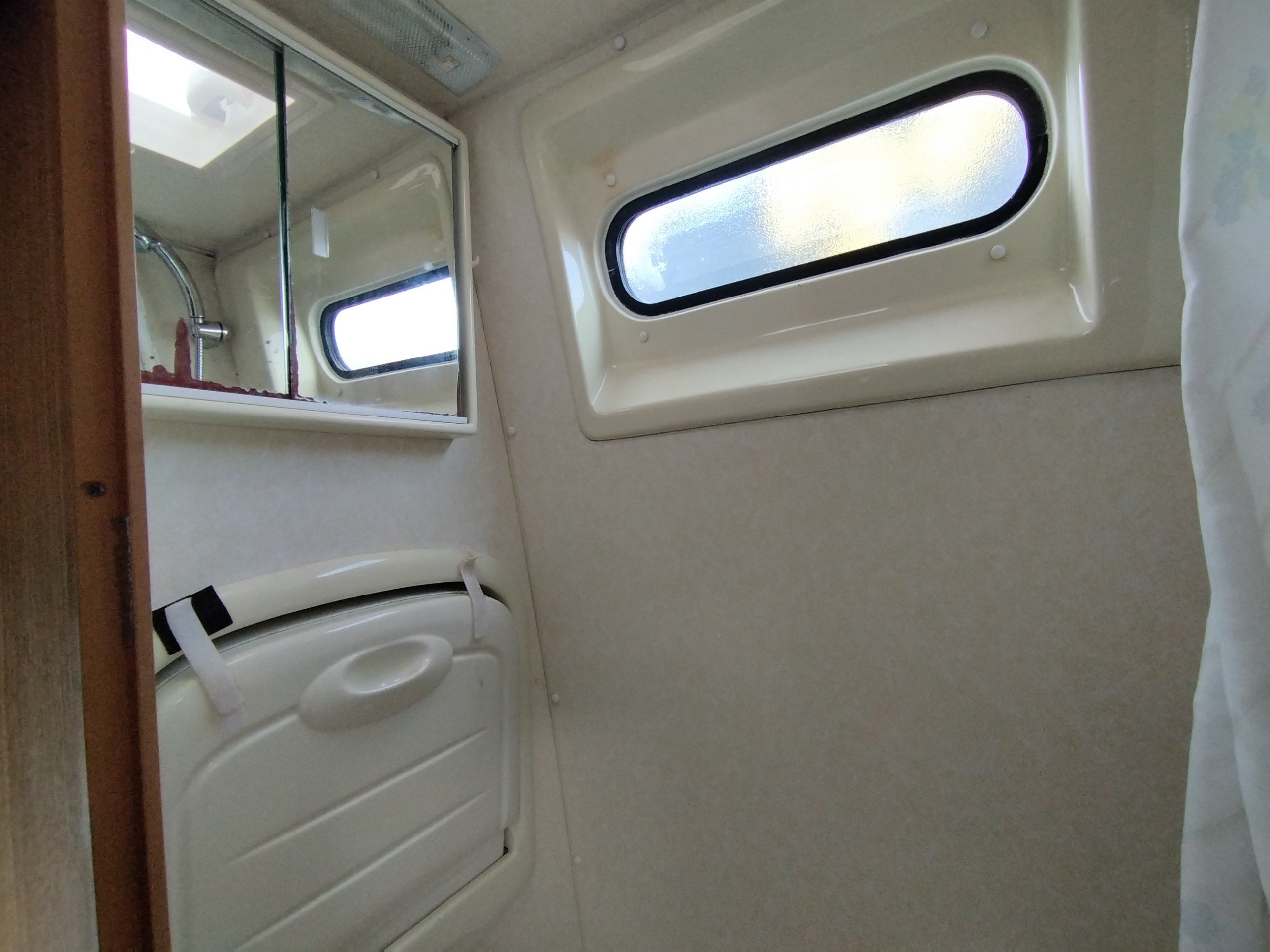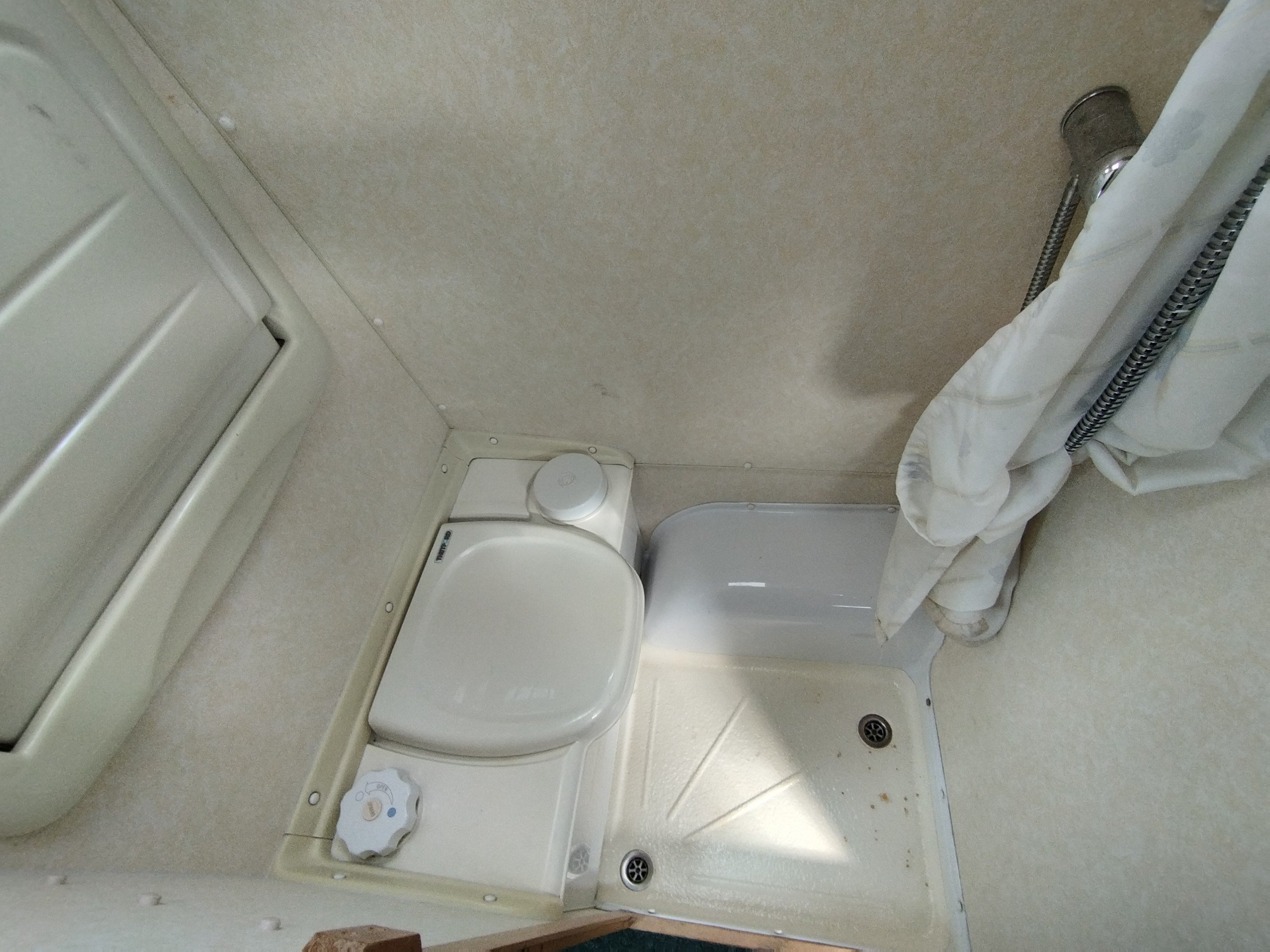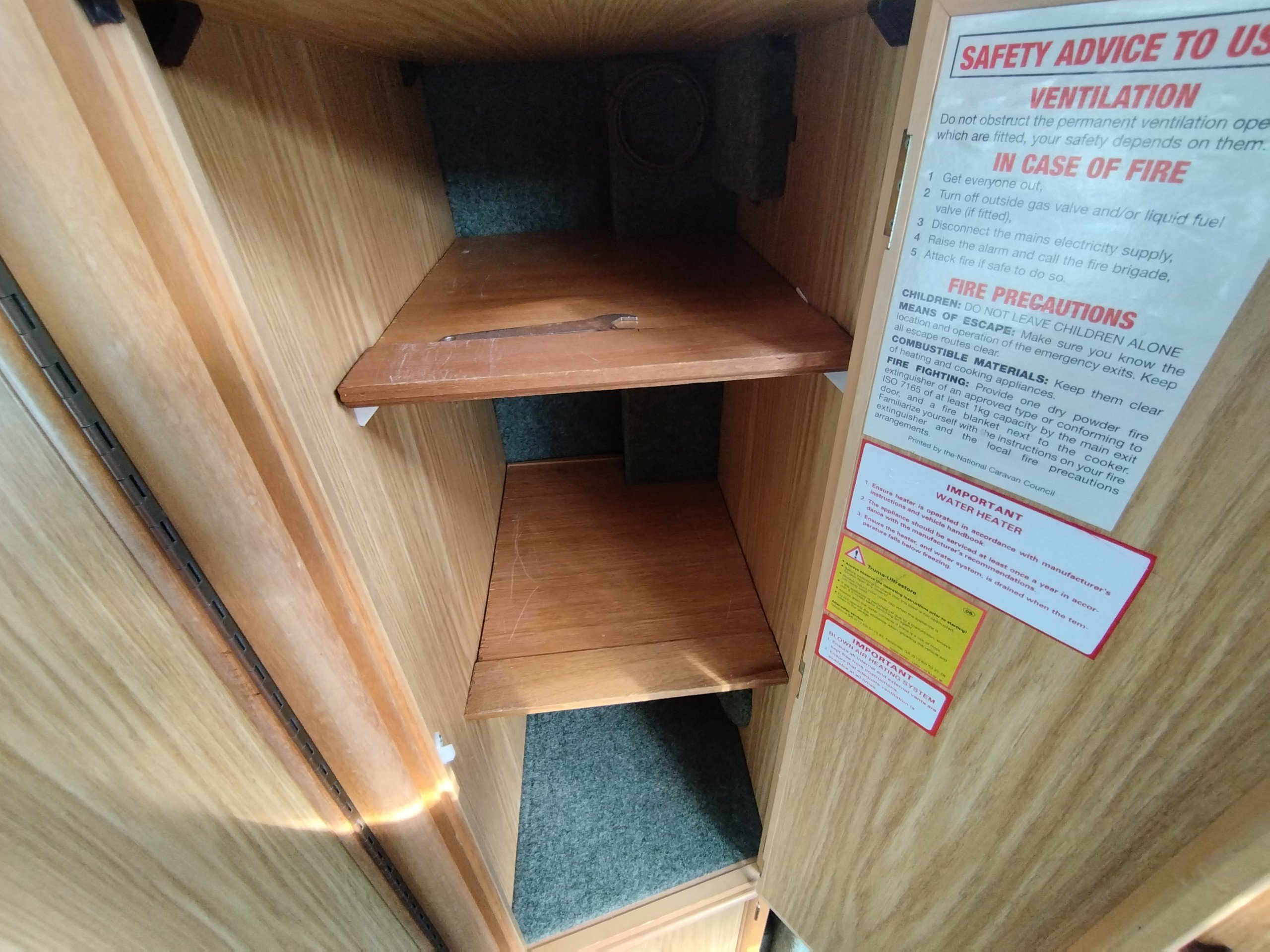 The washroom is opposite and has a shower, electric flushing toilet, drop down handbasin, washroom cabinet with vanity mirror. To the front of this is the gas locker at the bottom then above is the wardrobe as well as drop for you to place your TV onto should wish to use one.