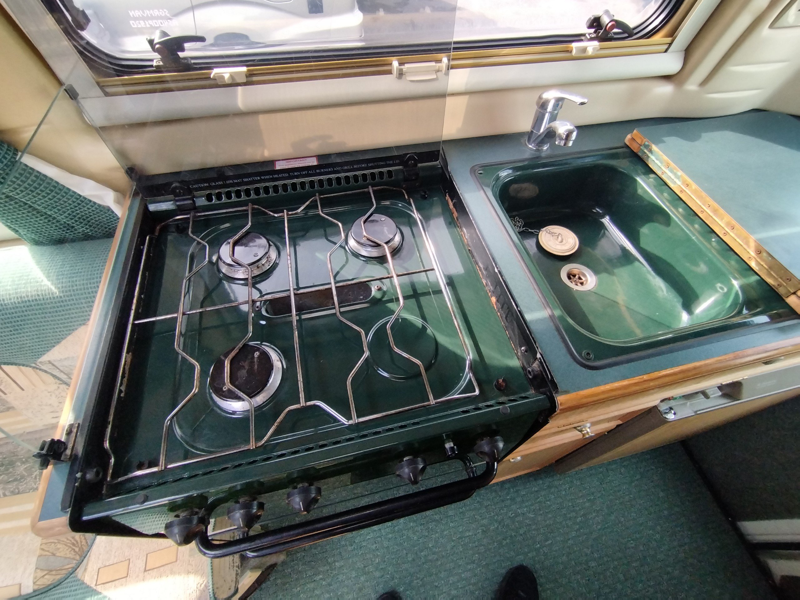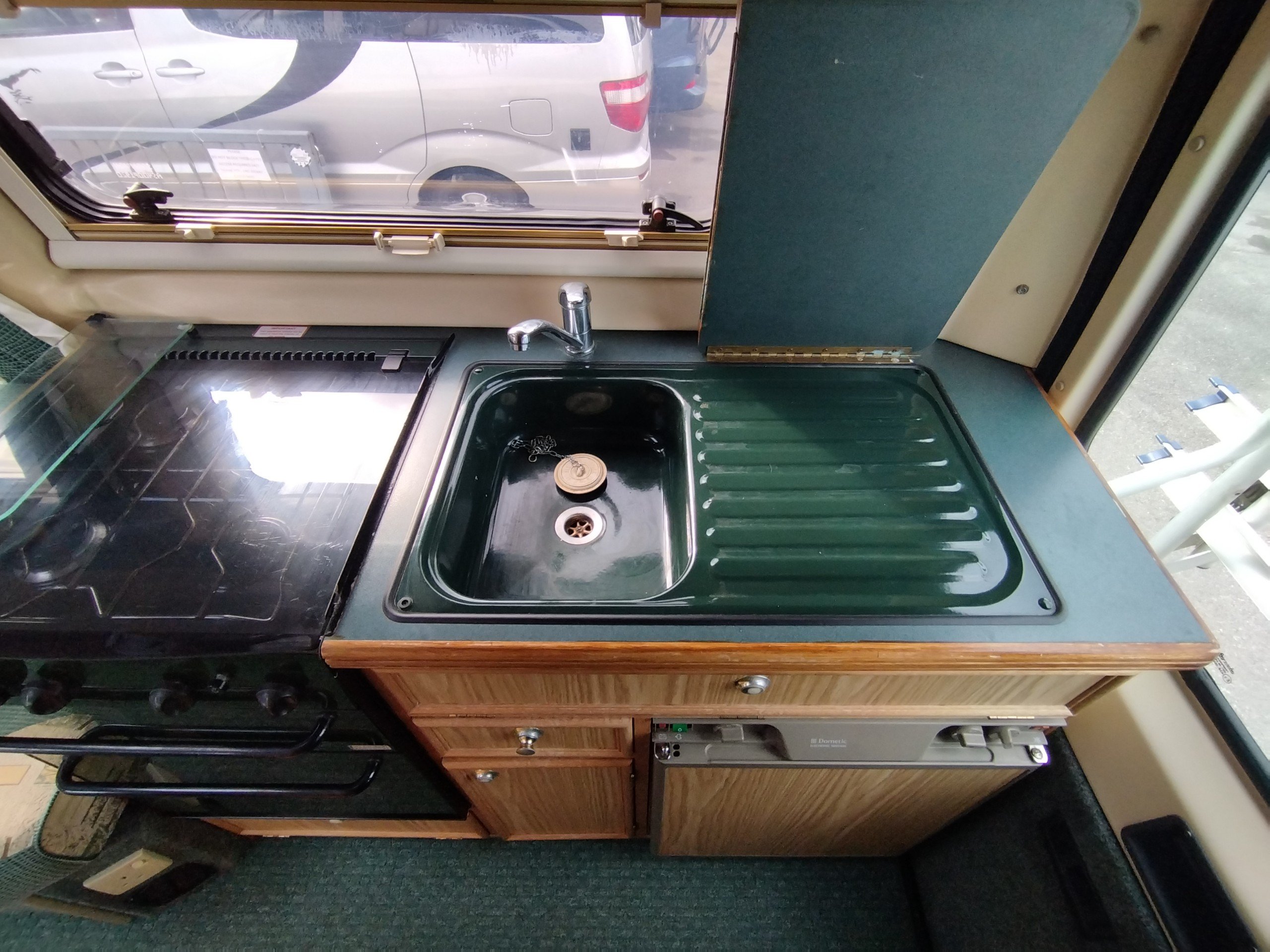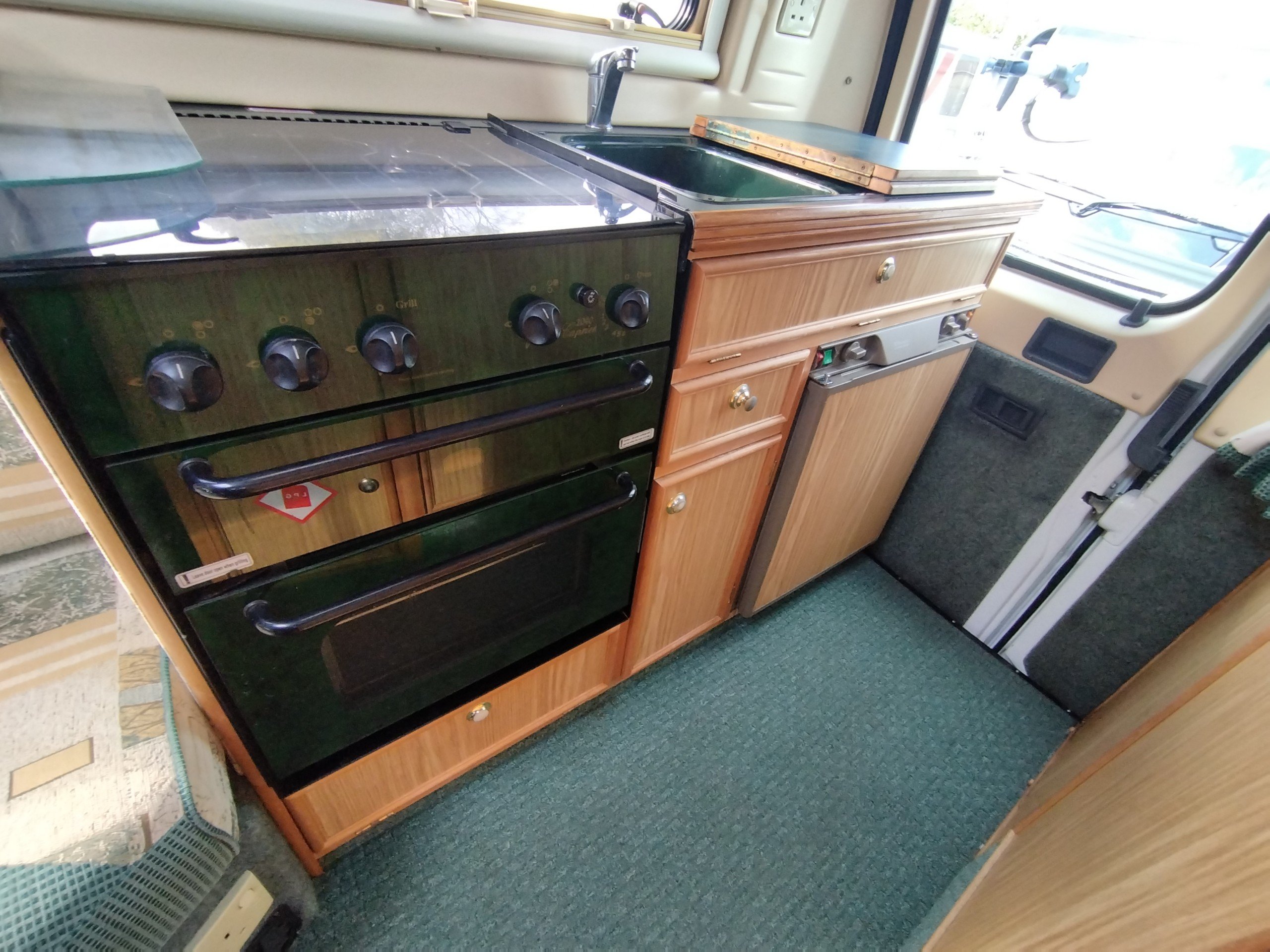 The layout is rear kitchen/washroom. The kitchen has everything you would get from a bigger van with a full cooker which consists of a 4 burner gas hob, separate oven and grill, 3 way fridge with freezer compartment, sink with built in drainer/chopping board. There is storage for the groceries also.