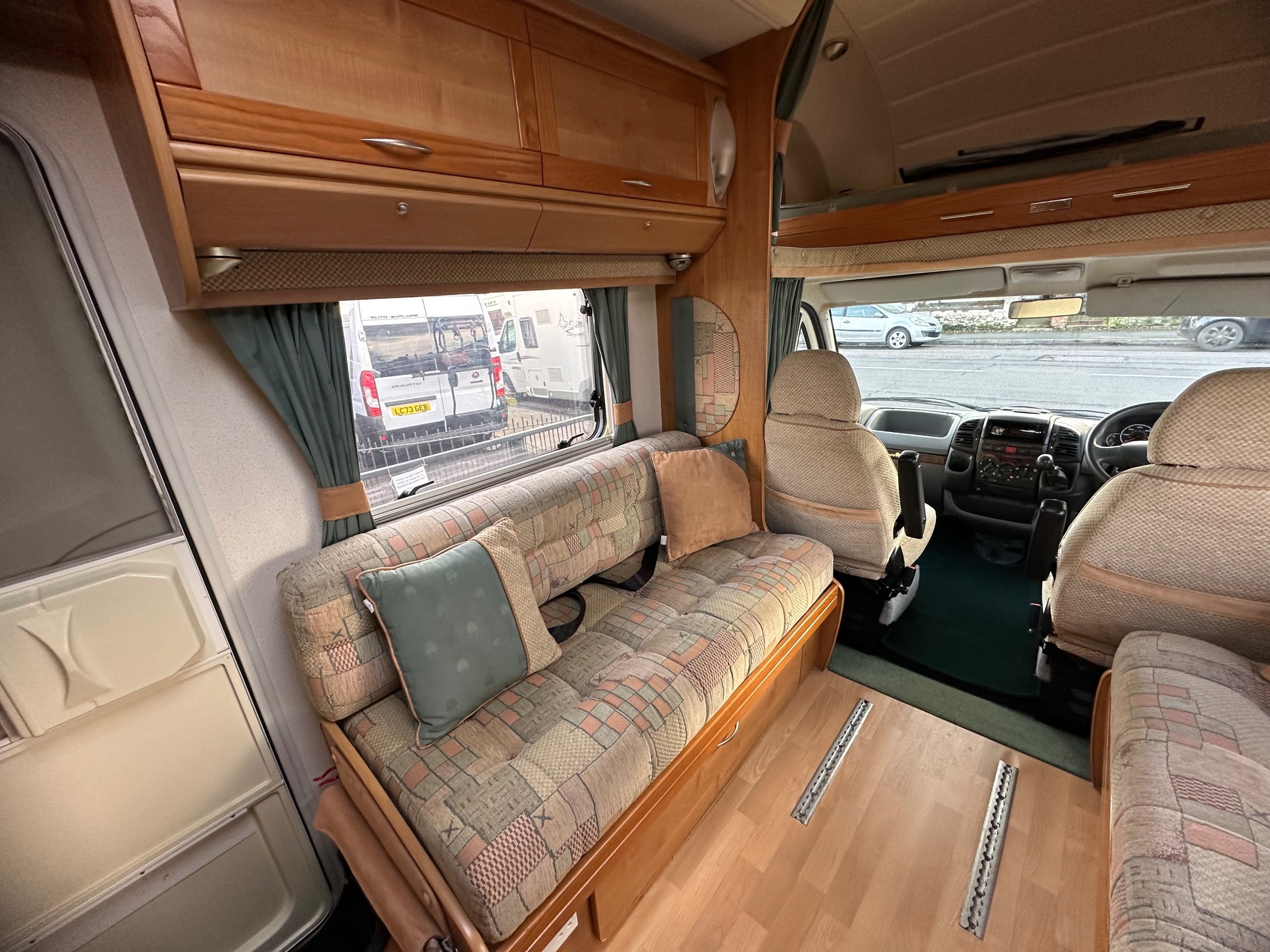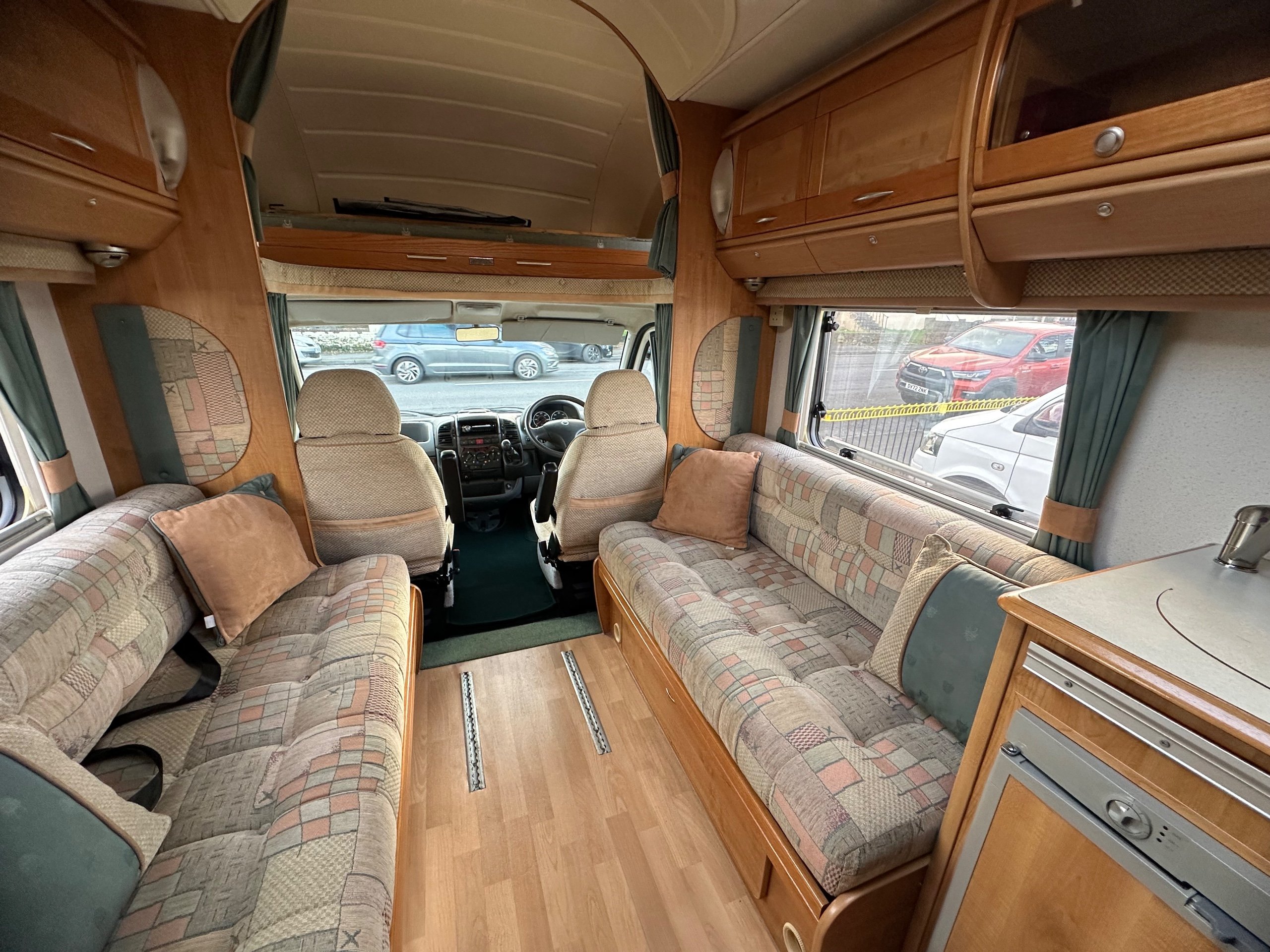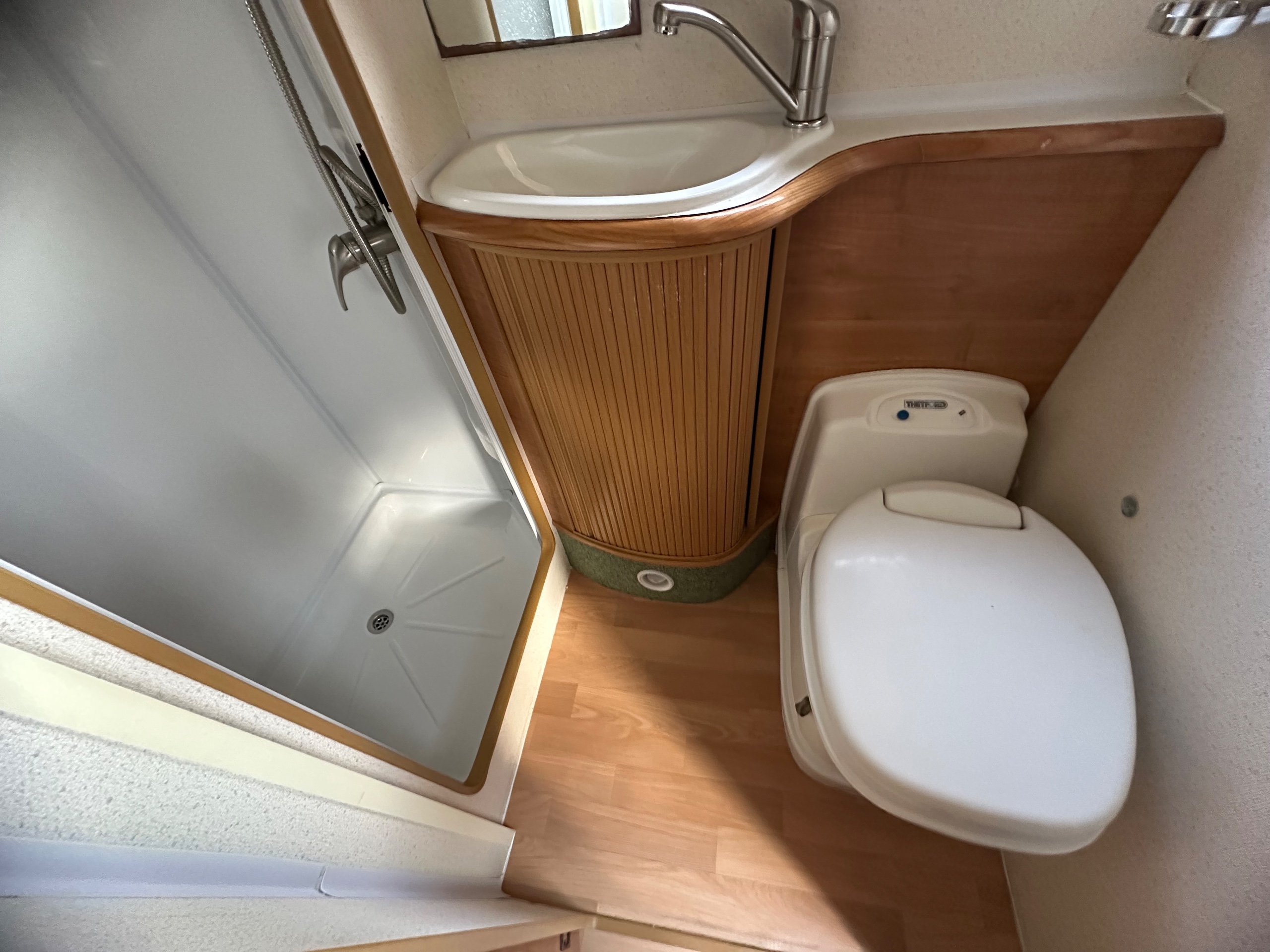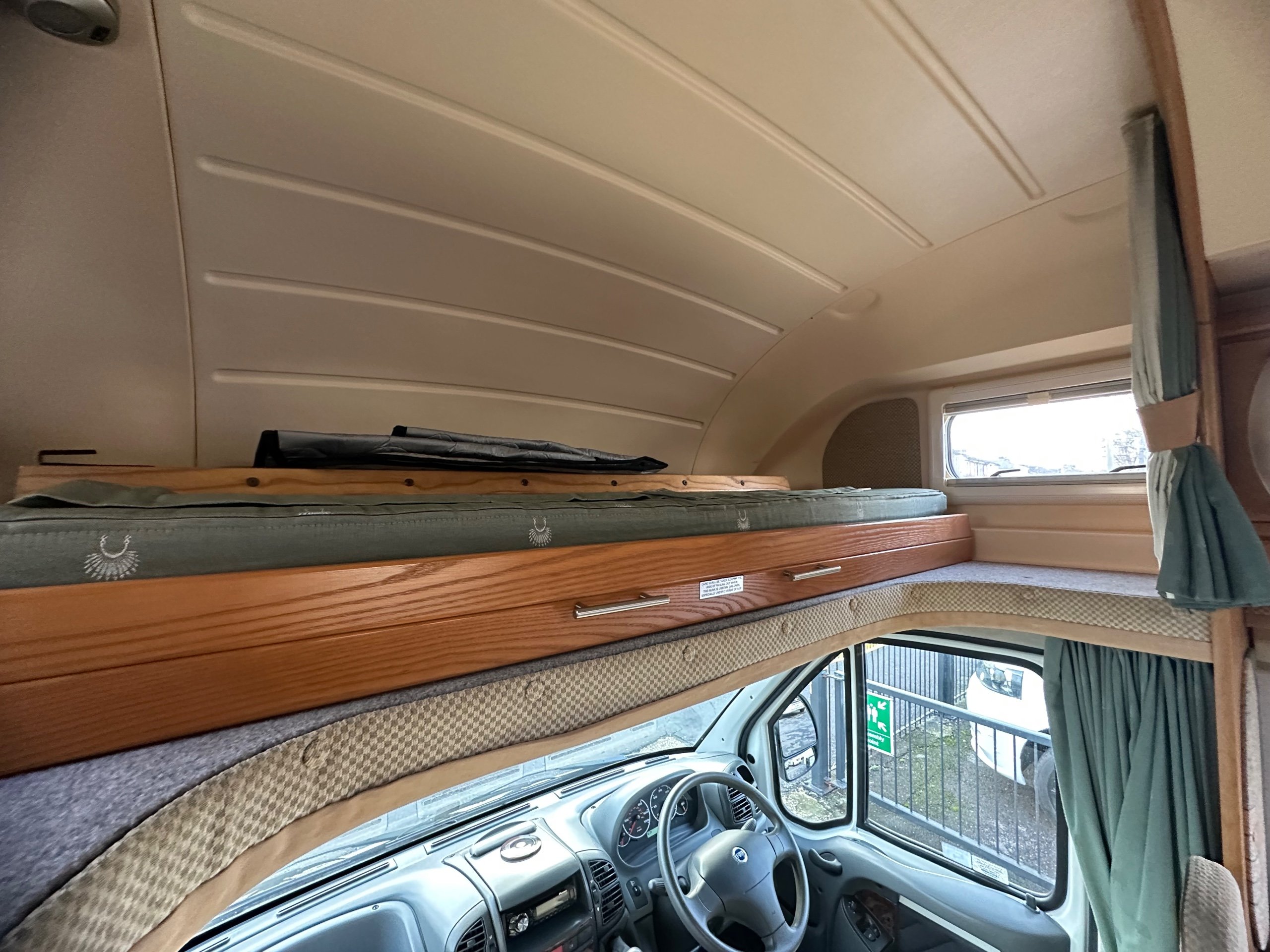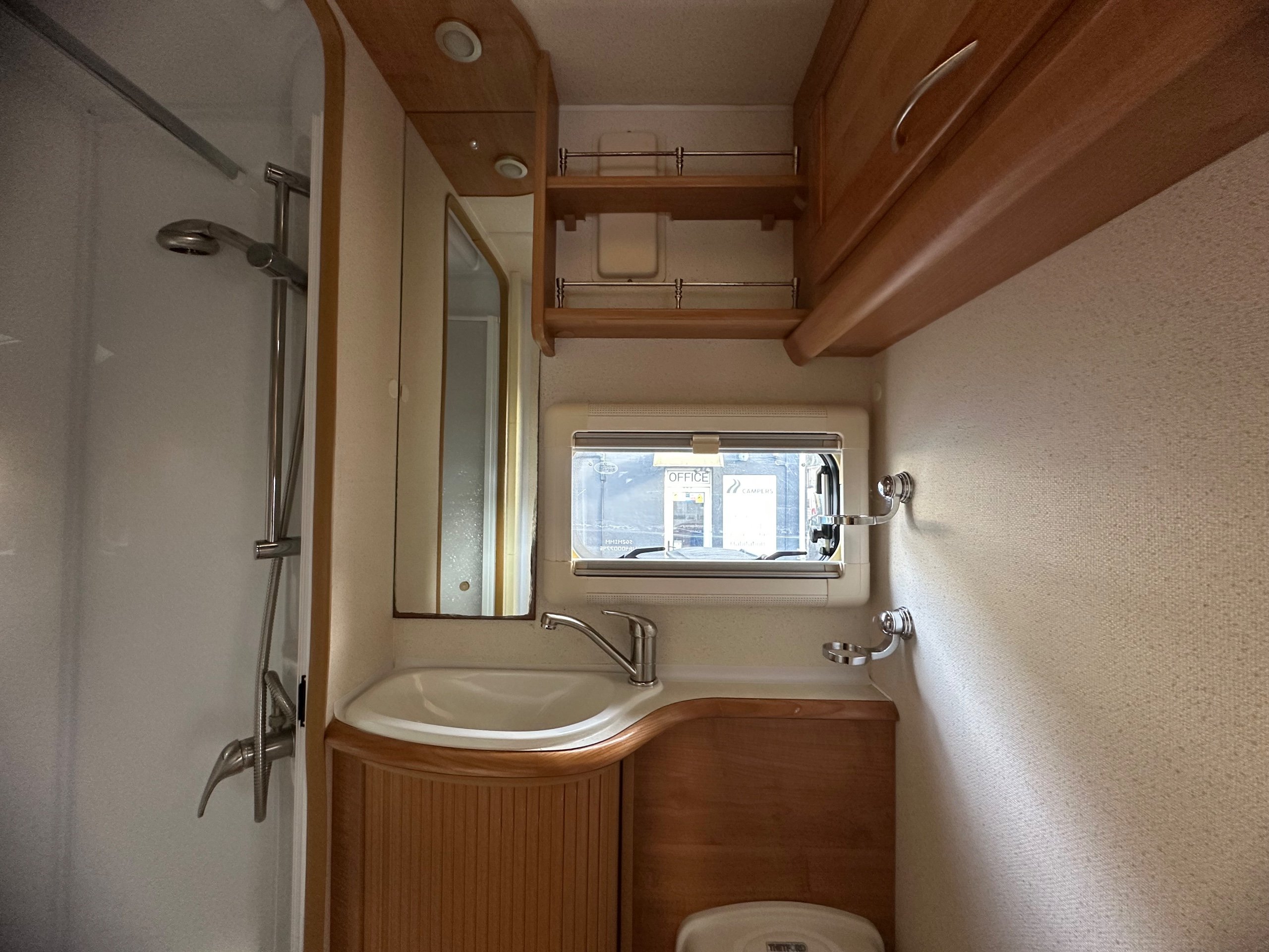 Opposite is the washroom which has a toilet, separate shower,hand basin and some storage for toiletries. to the front of the motorhome is more wrap around storage and 2 side settees. Above the cab is another large double bed.