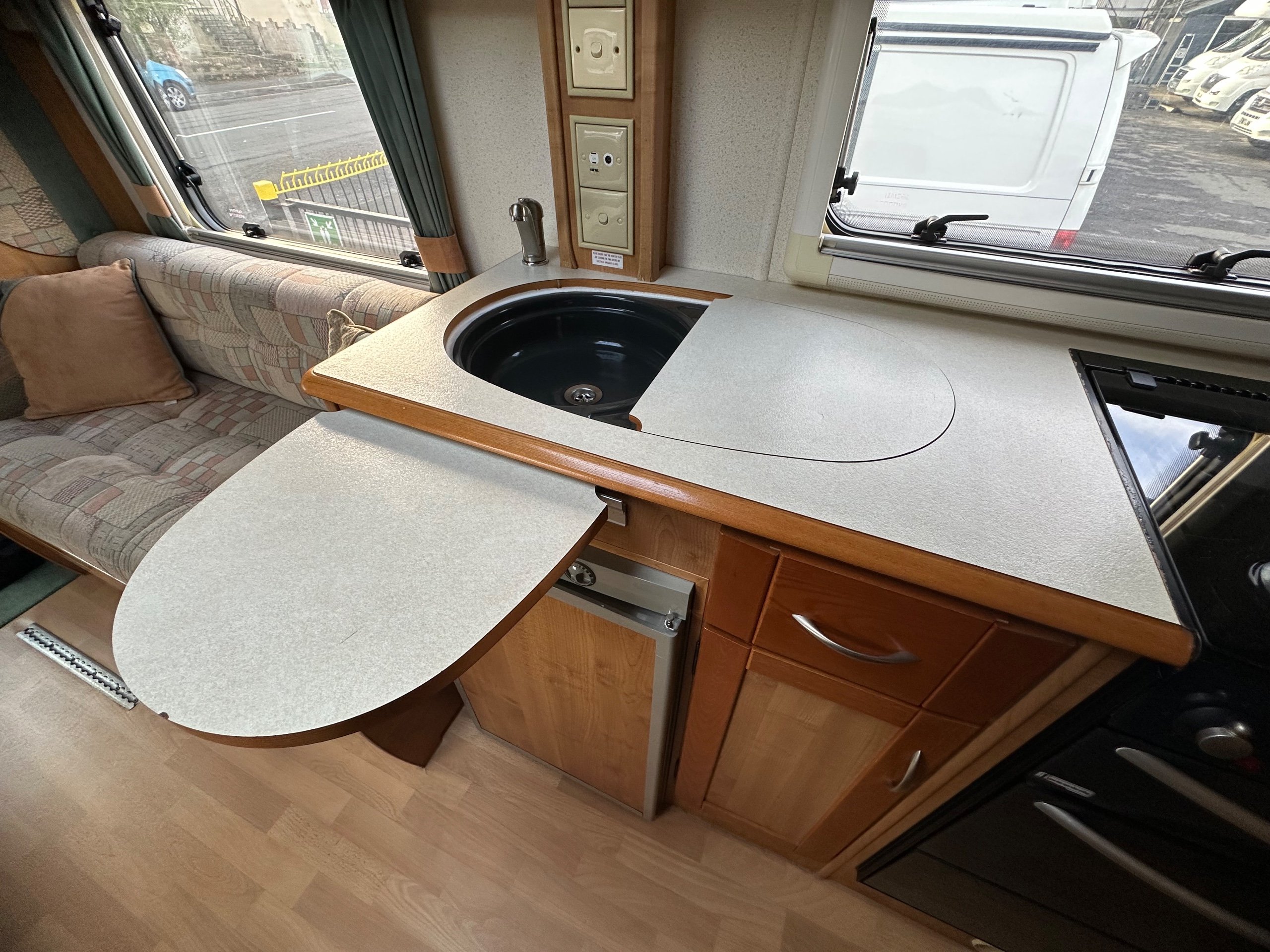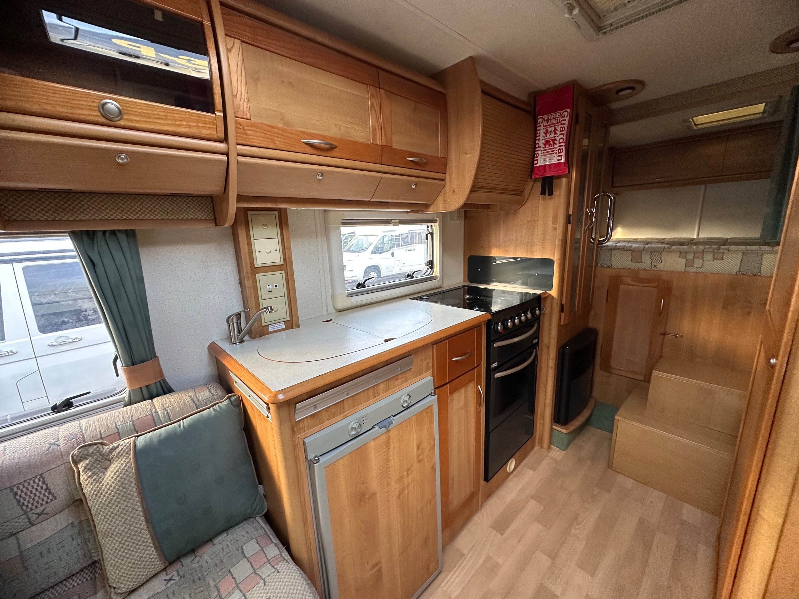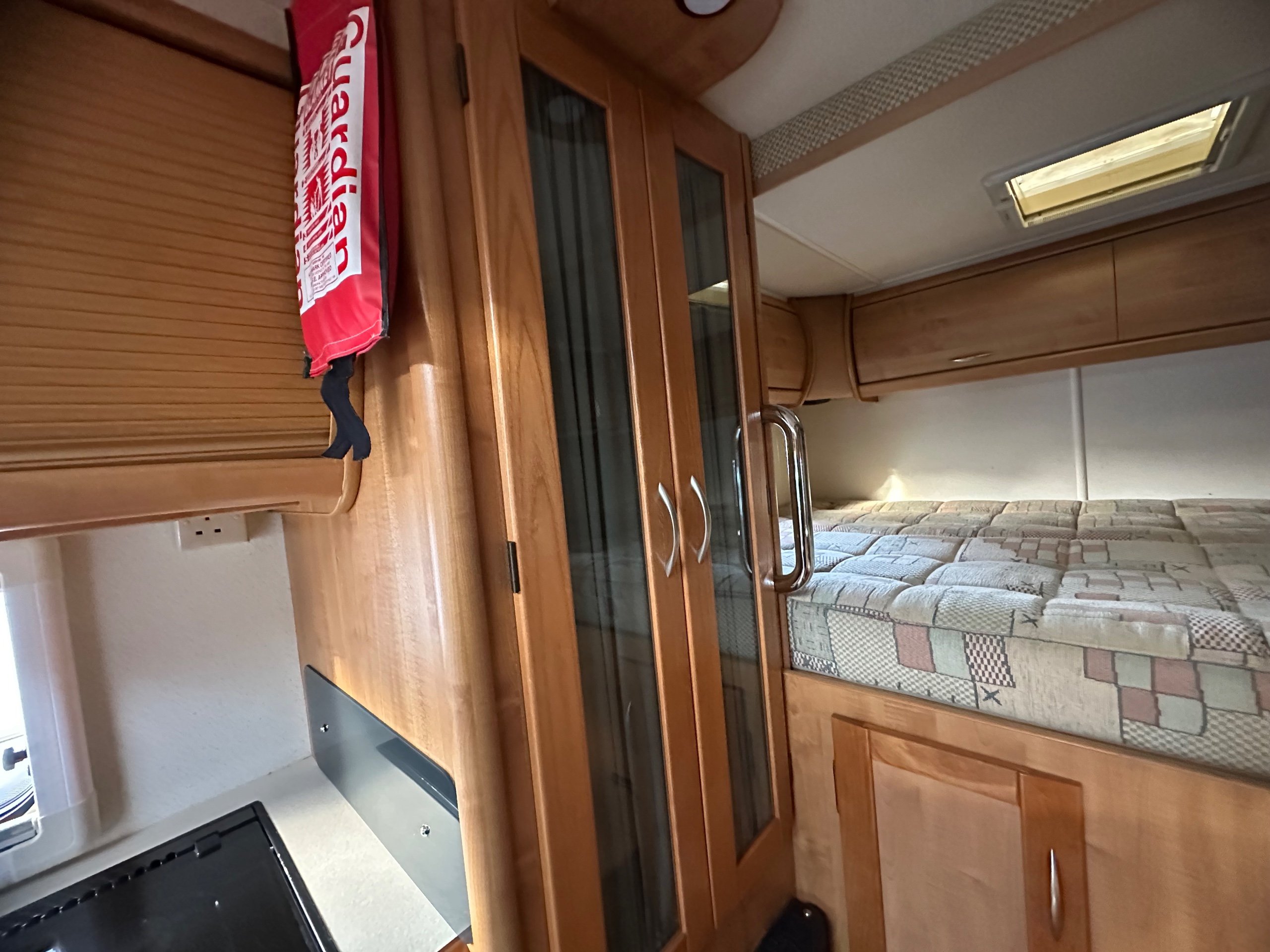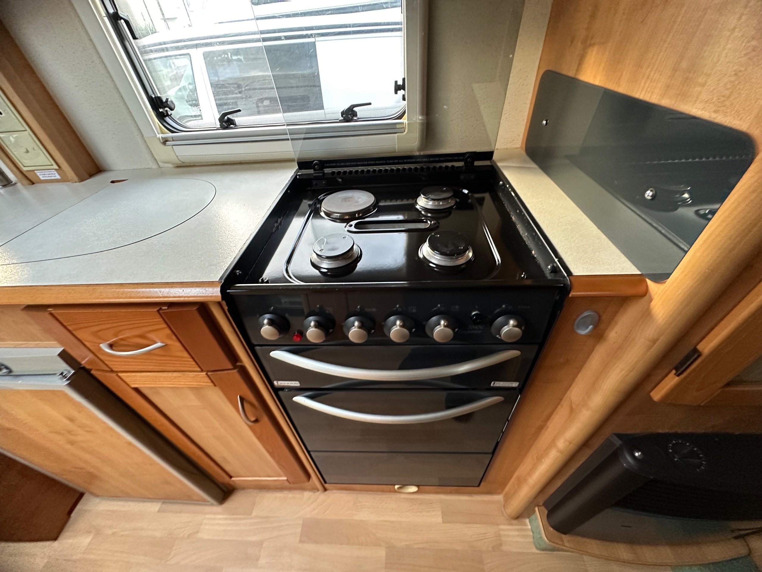 Centrally the kitchen is to the offside the wardrobe next to the bed the kitchen consists of Full cooker, sink with drainer, 3 way fridge and plenty of storage for the groceries.