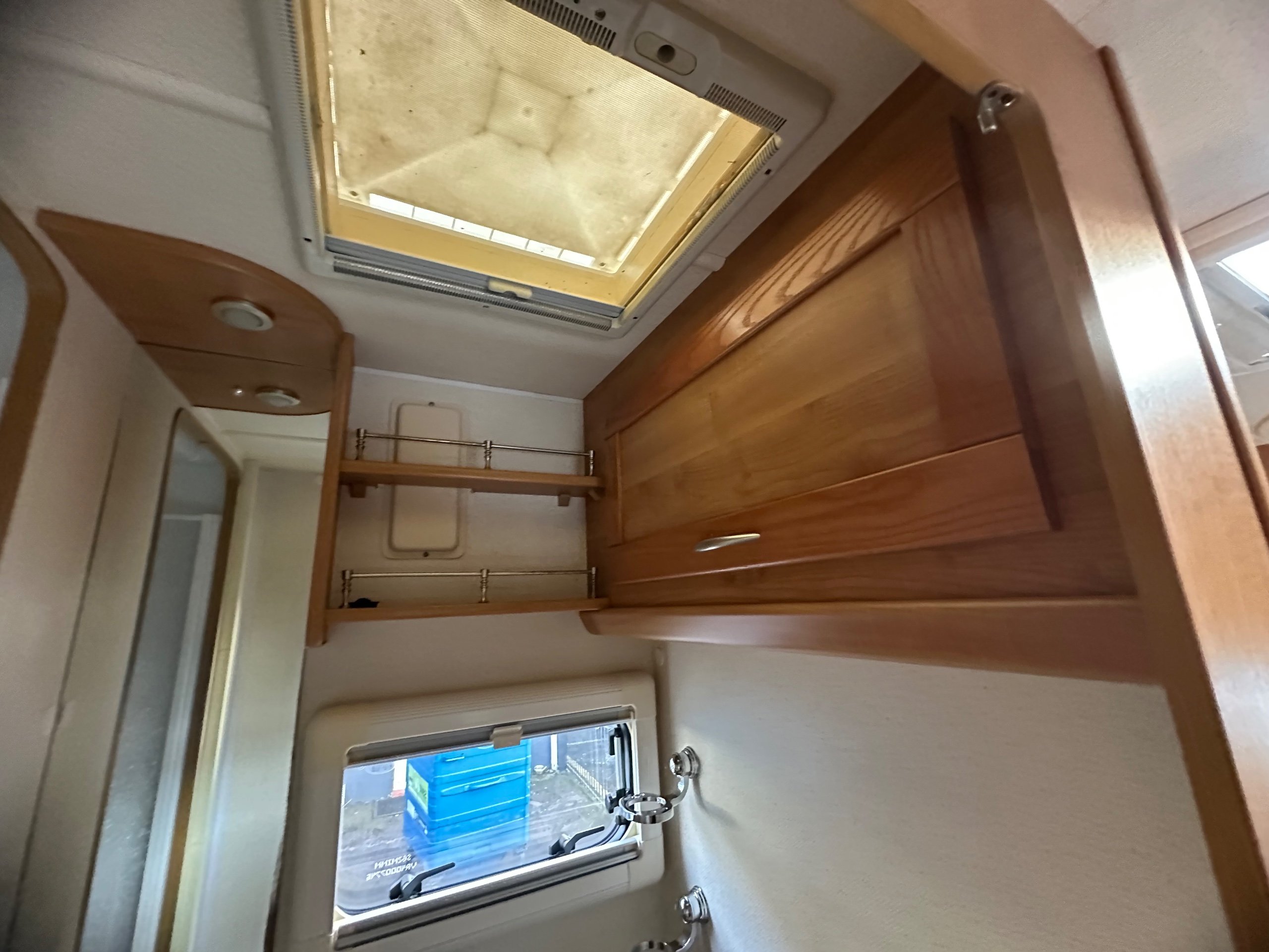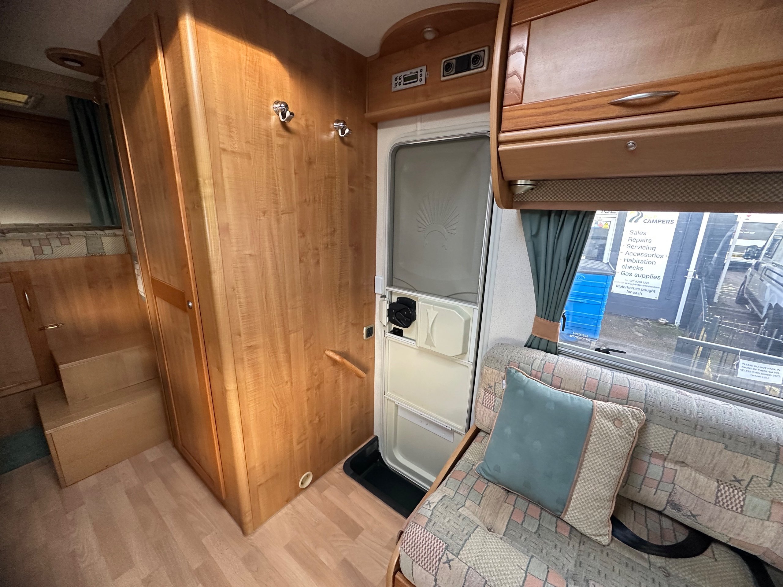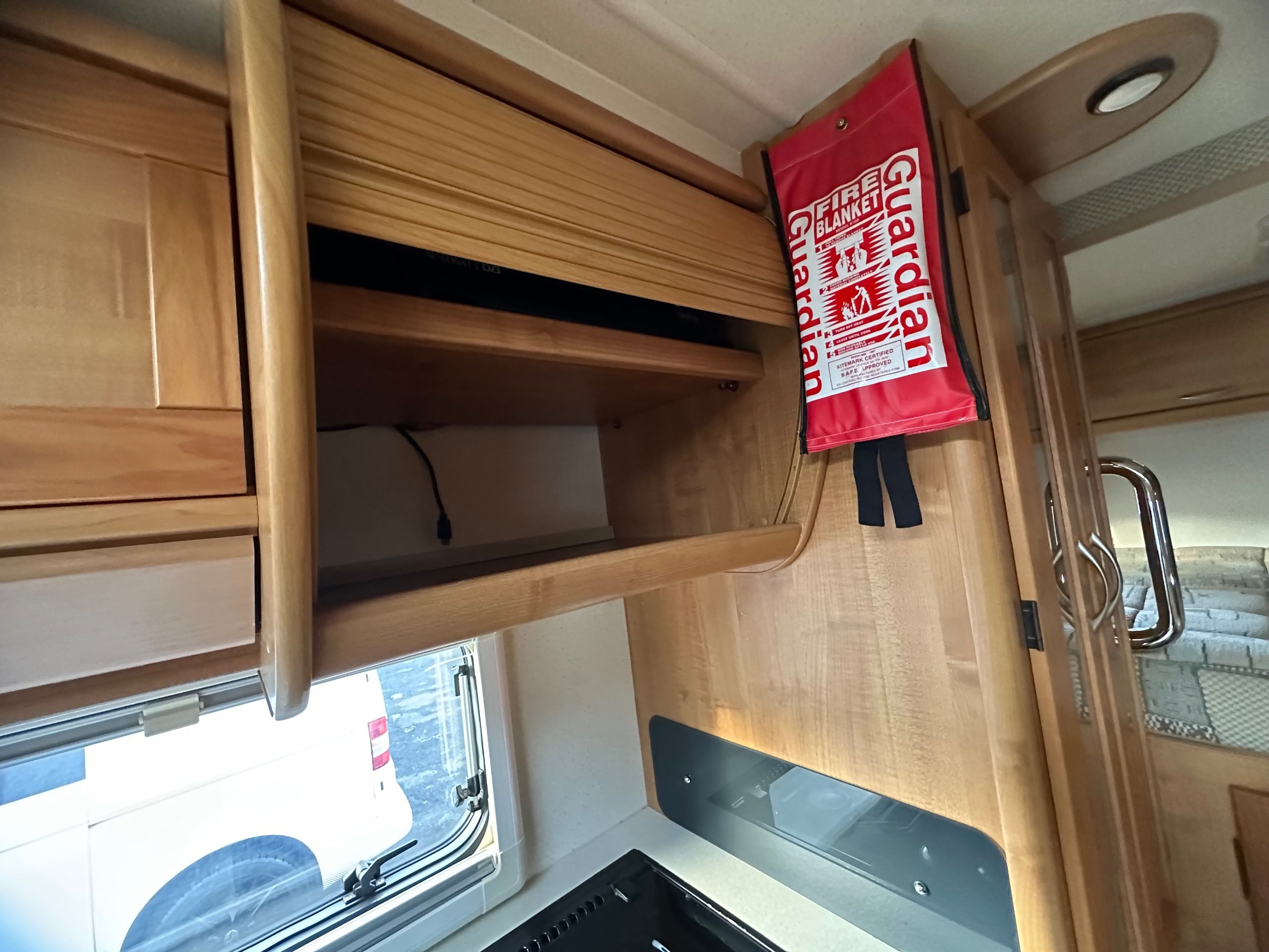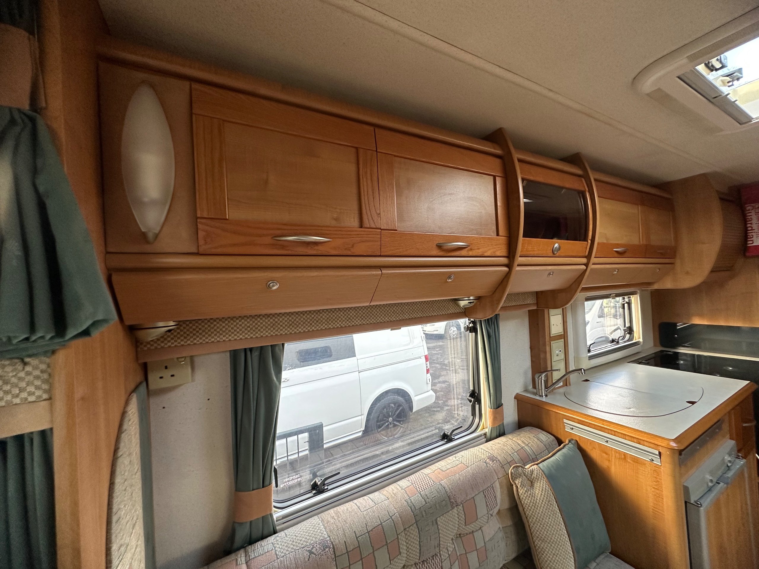 Centrally the kitchen is to the offside the wardrobe next to the bed the kitchen consists of Full cooker, sink with drainer, 3 way fridge and plenty of storage for the groceries.