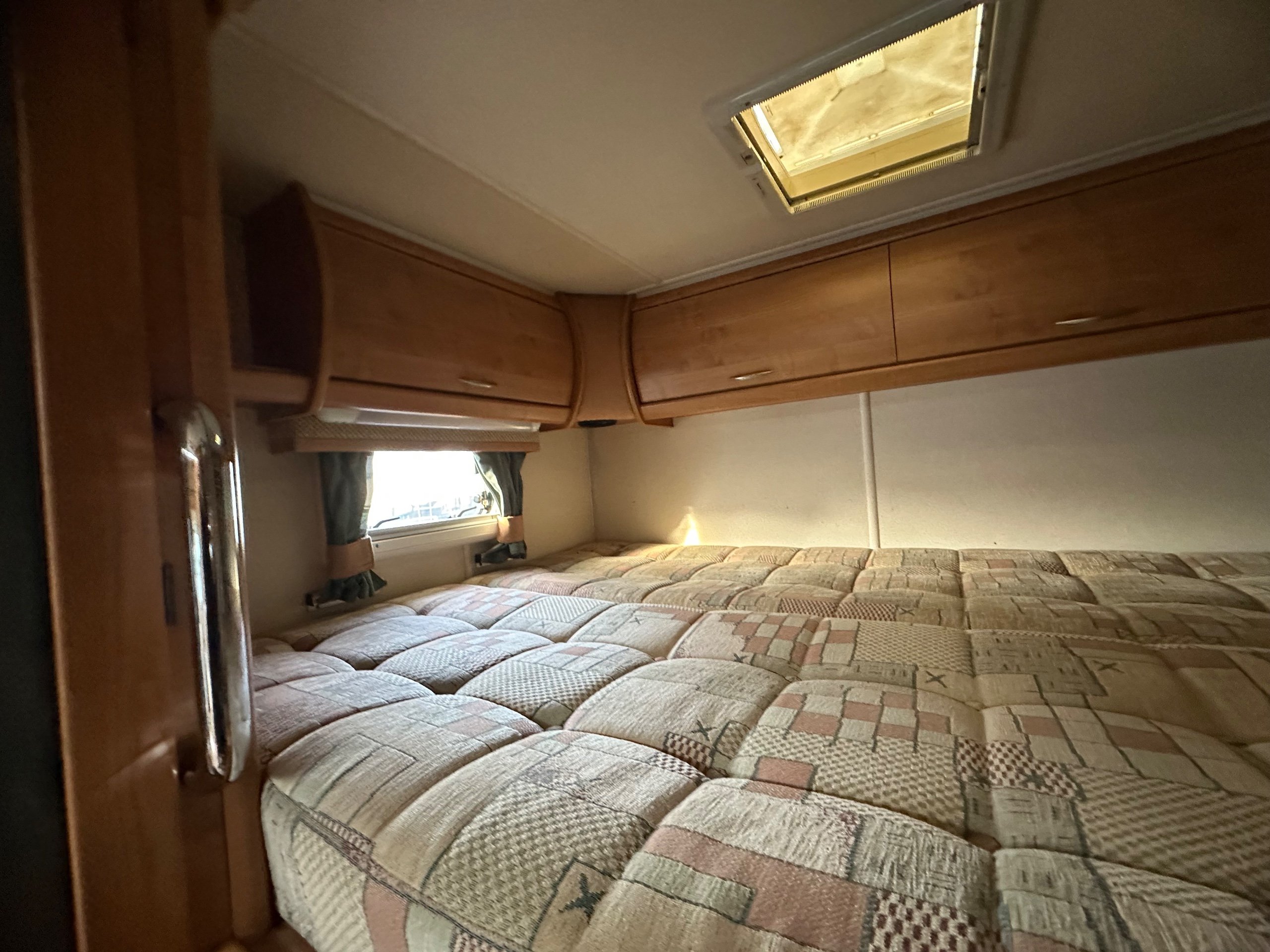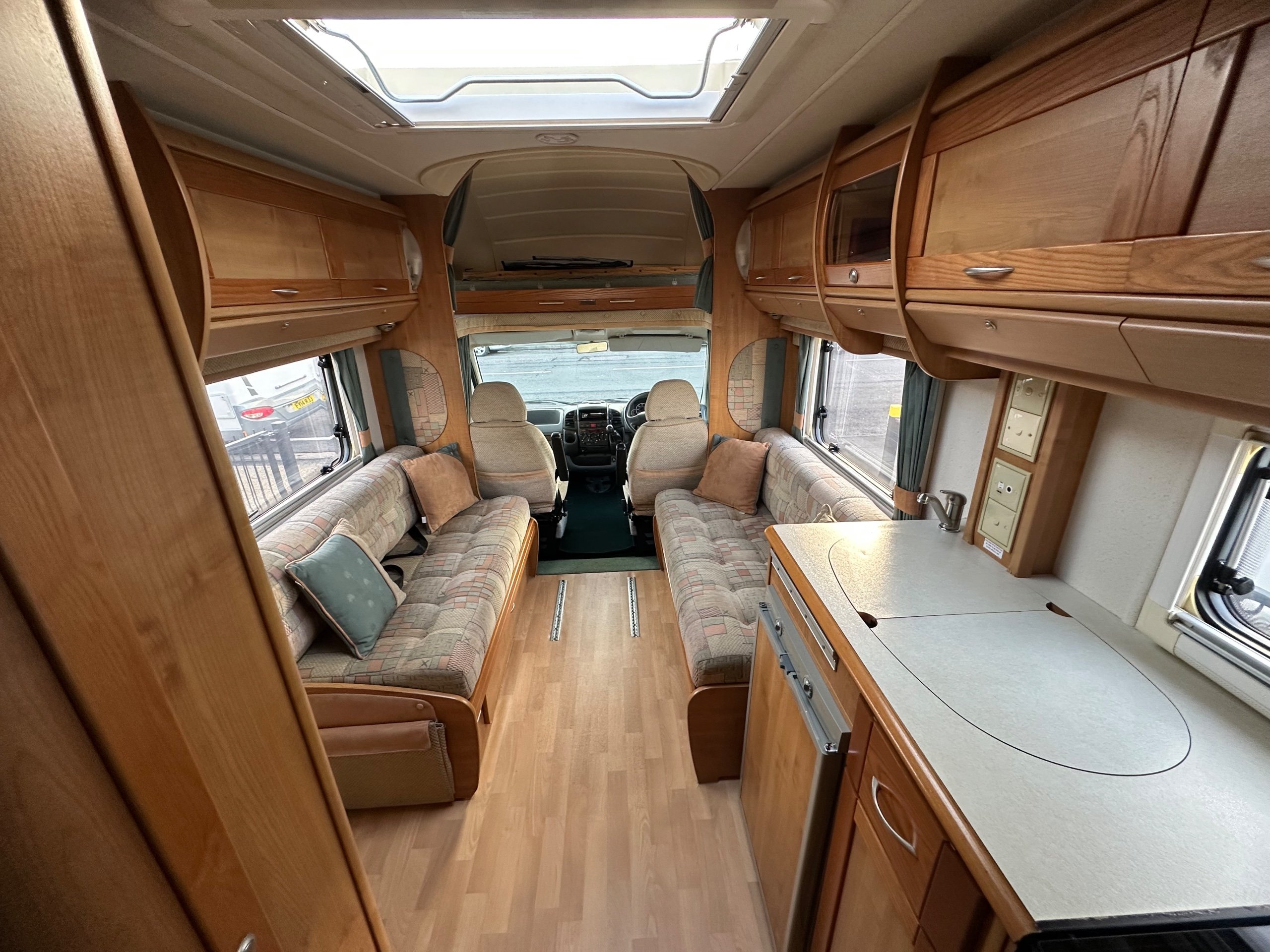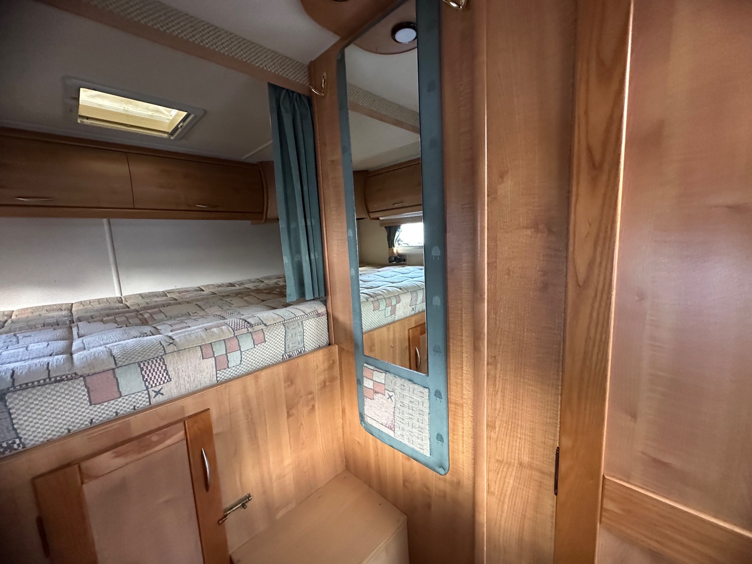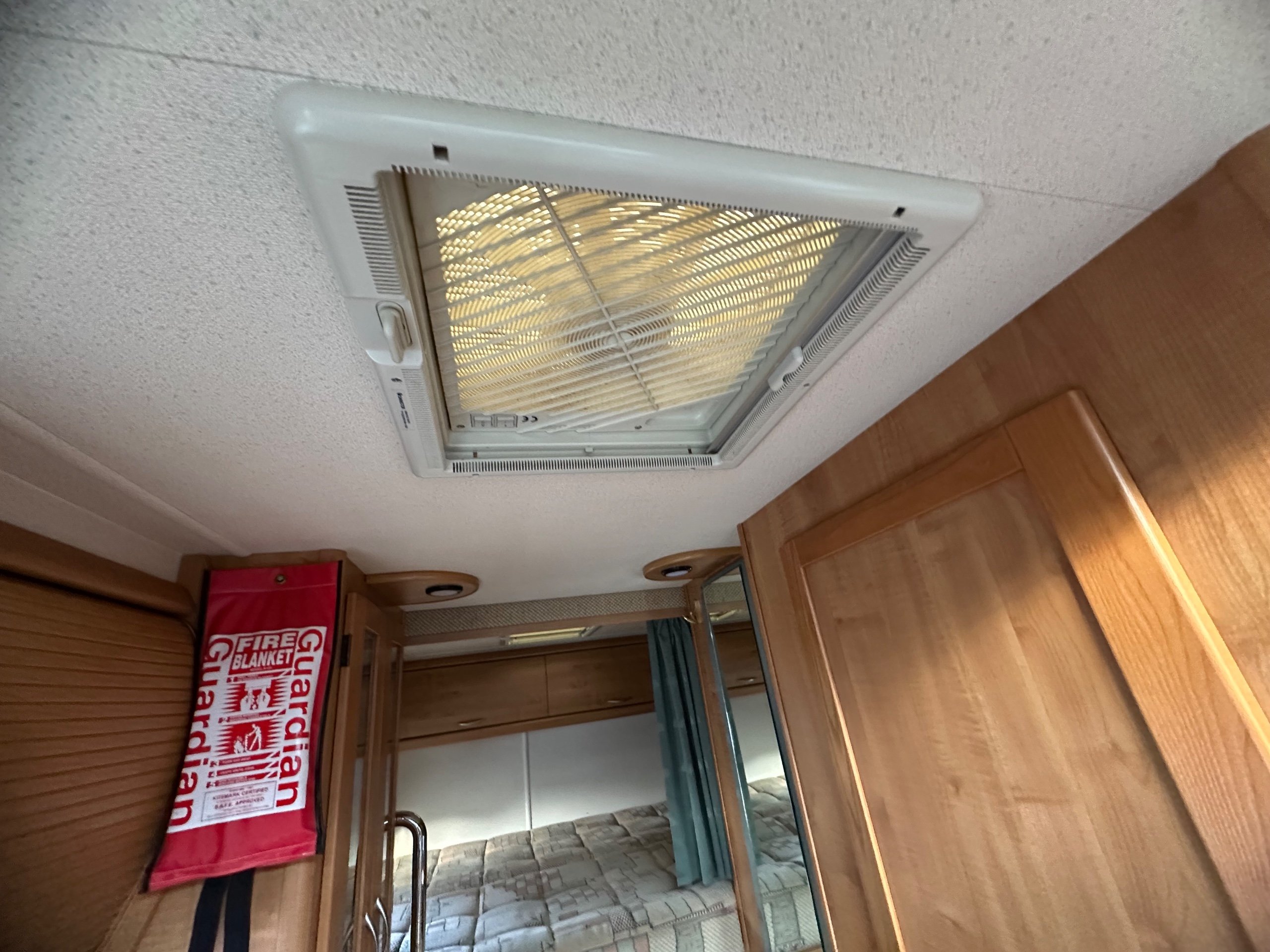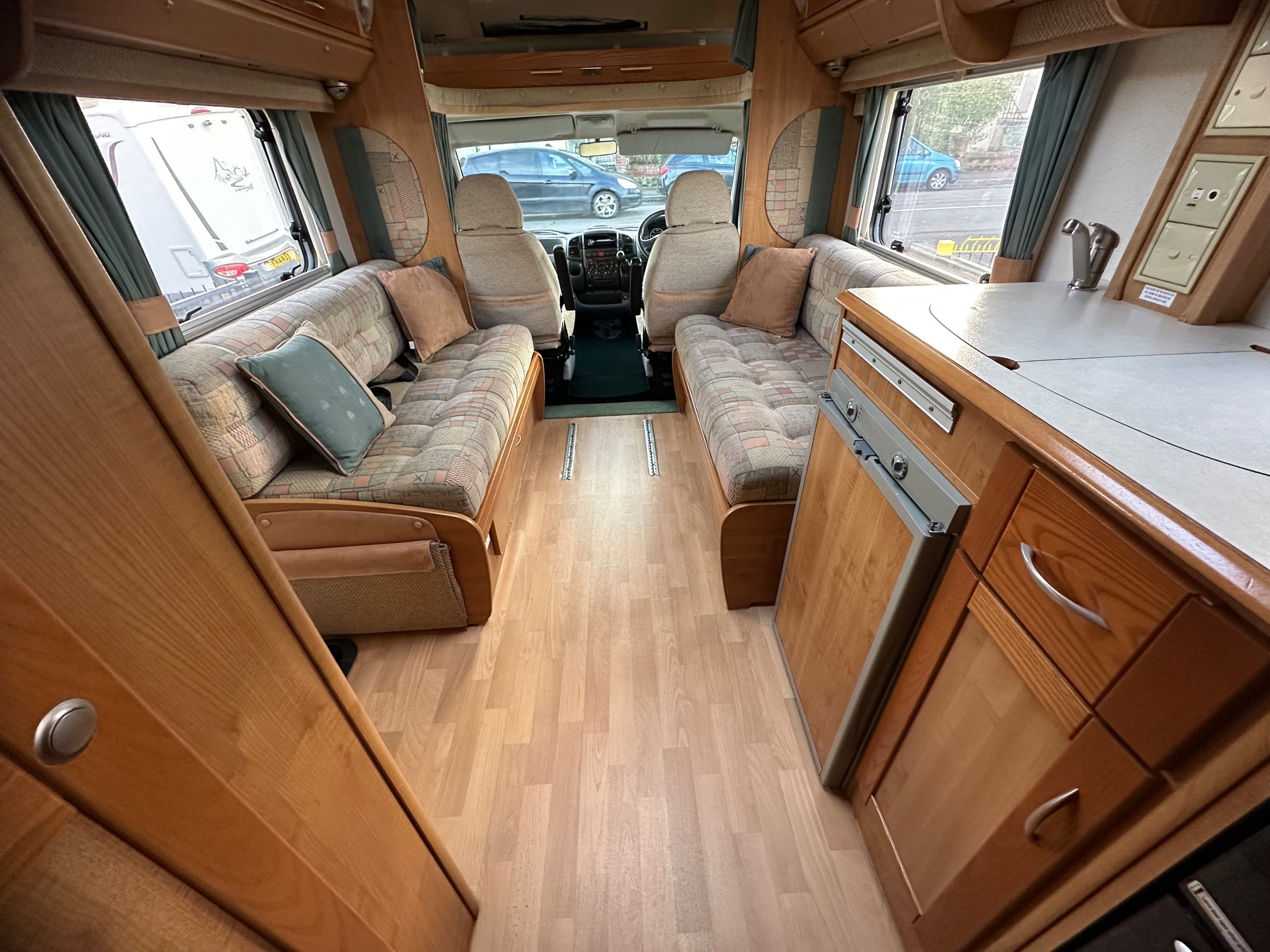 Centrally the kitchen is to the offside the wardrobe next to the bed the kitchen consists of Full cooker, sink with drainer, 3 way fridge and plenty of storage for the groceries.