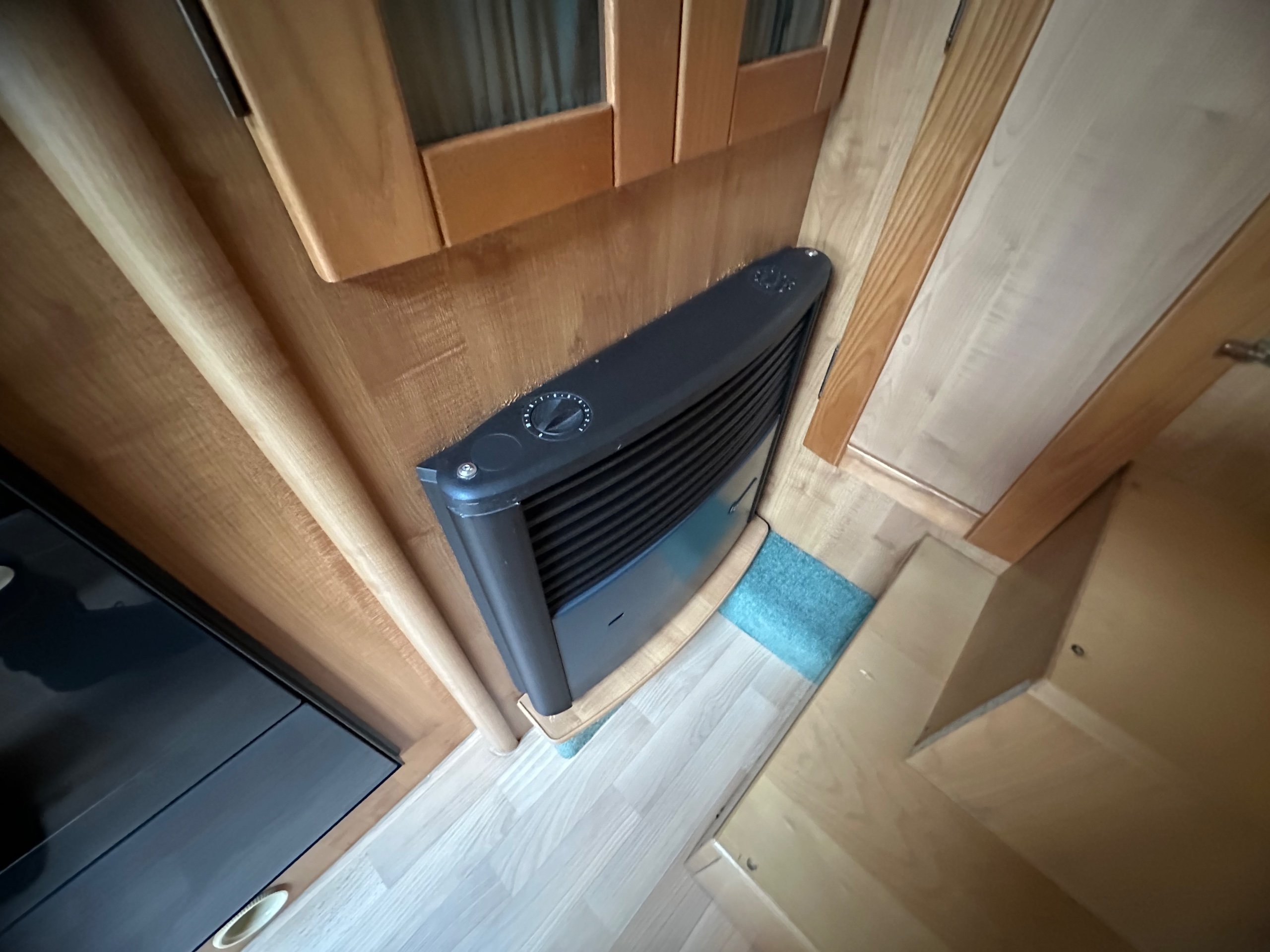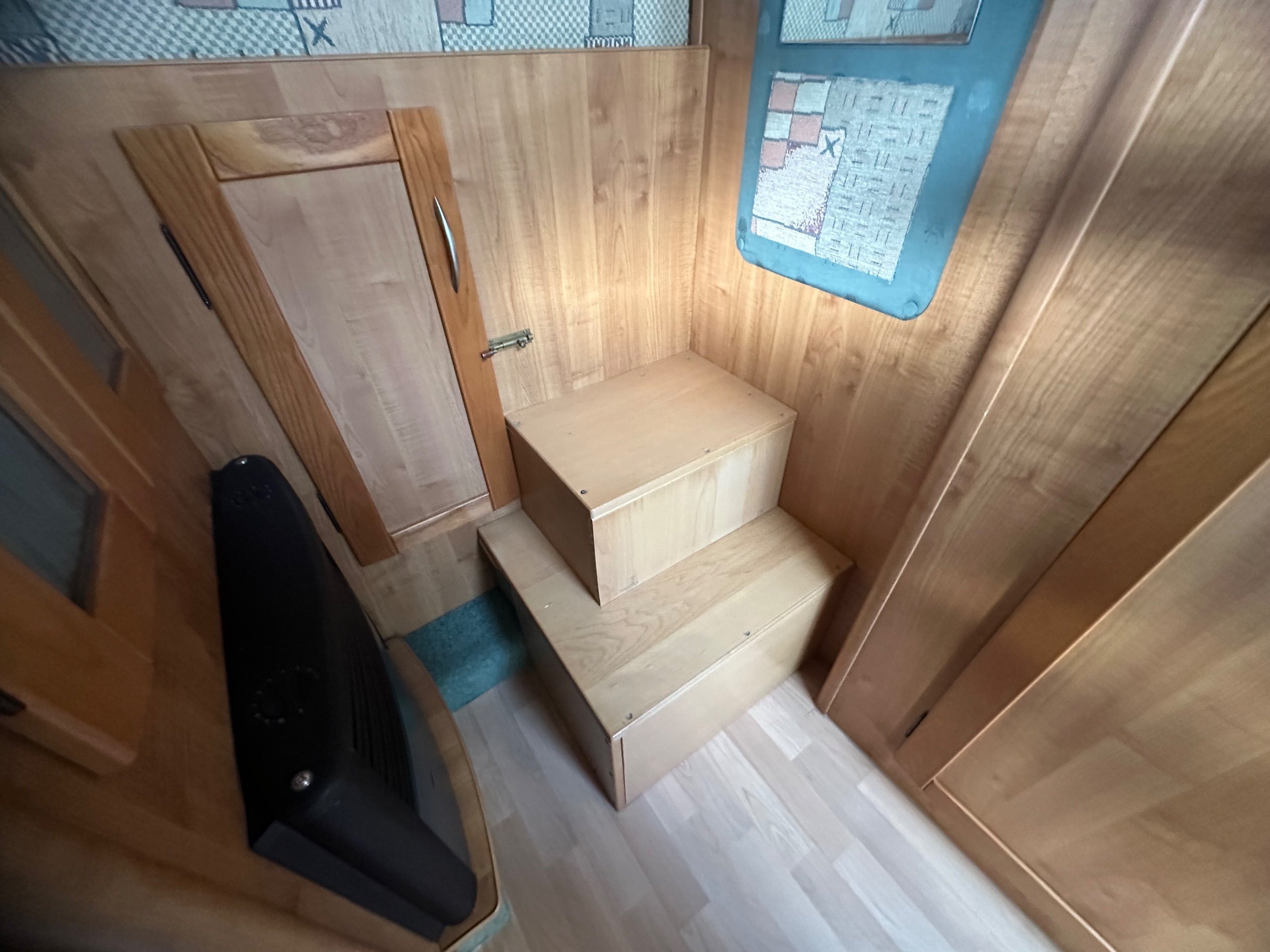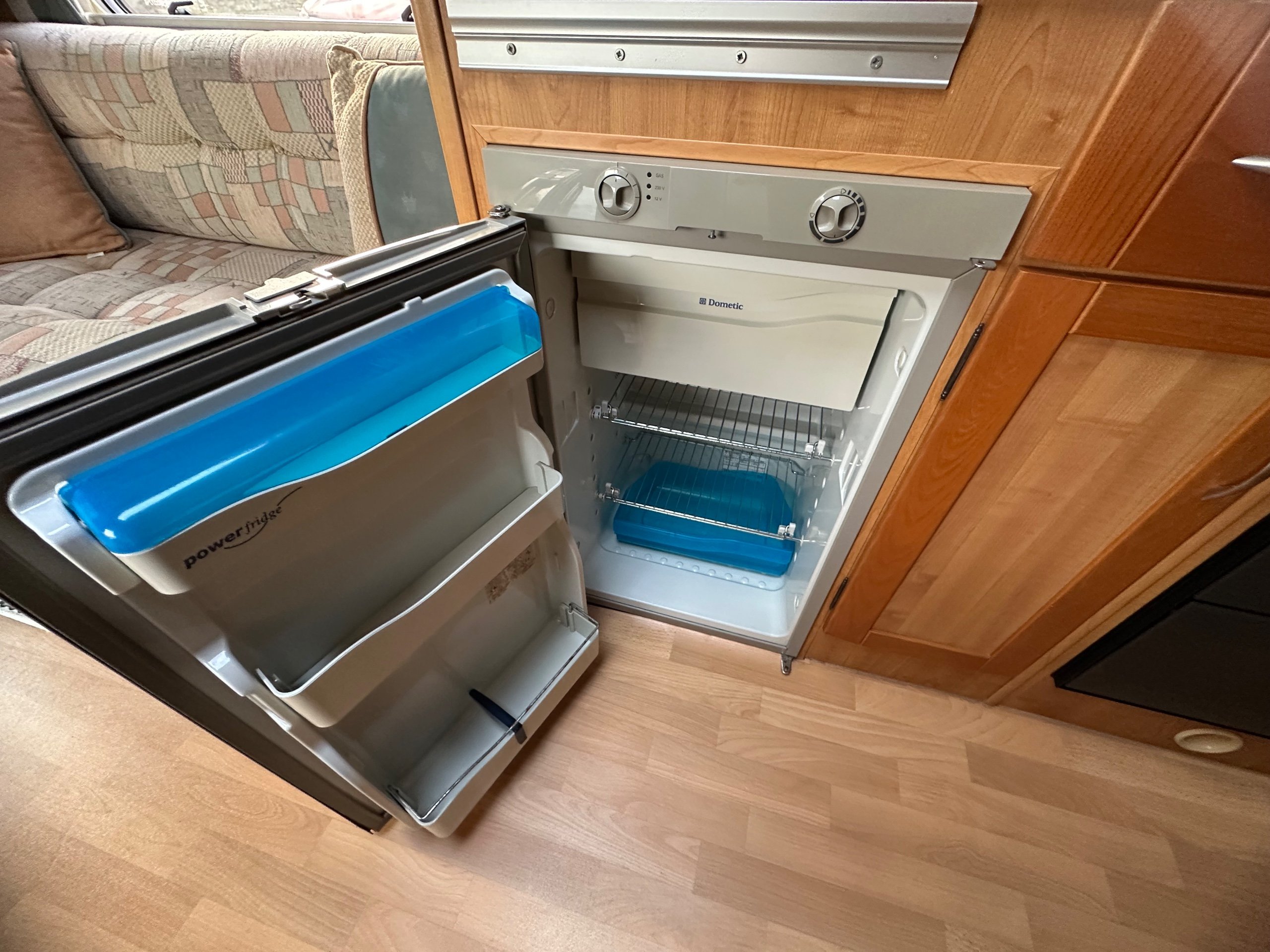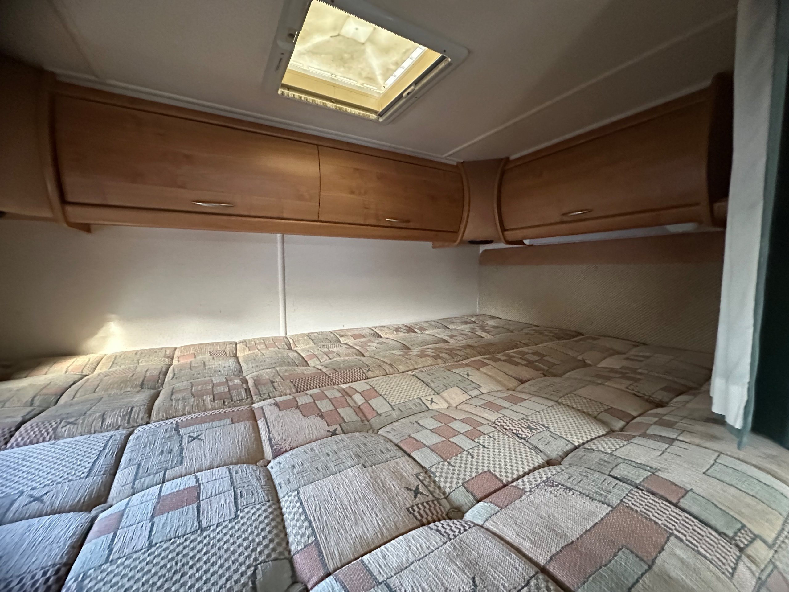 Centrally the kitchen is to the offside the wardrobe next to the bed the kitchen consists of Full cooker, sink with drainer, 3 way fridge and plenty of storage for the groceries.