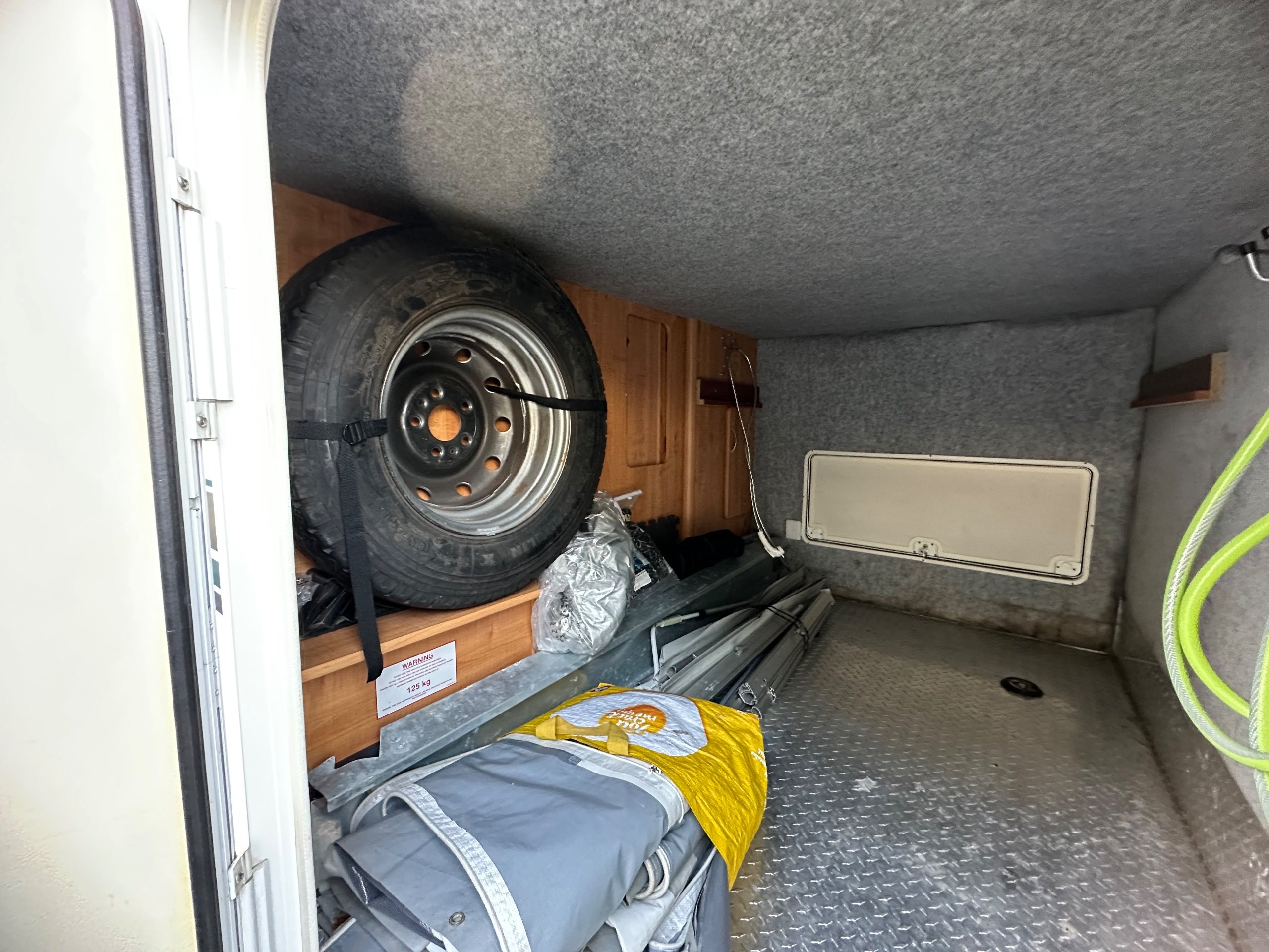 The layout of this motorhome is large rear gargage with double bed at just over half height with wrap around cupboards for your books etc.