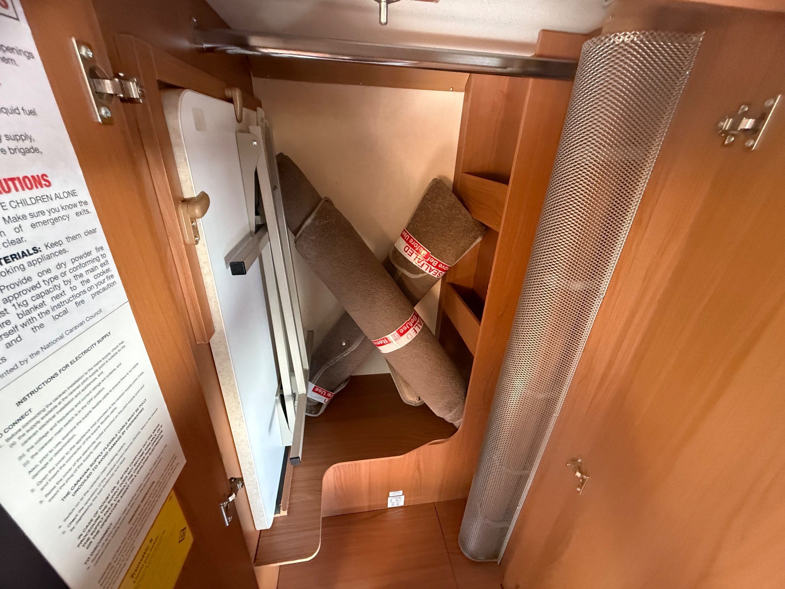 There is a decent sized wardrobe with space heater below and up front is all lounge. The lounge is made up of 2 side bench settee that can be slept in as two singles or made into a double bed. This area is light and airy and with front seats swiveled around will be great place to have friends over.