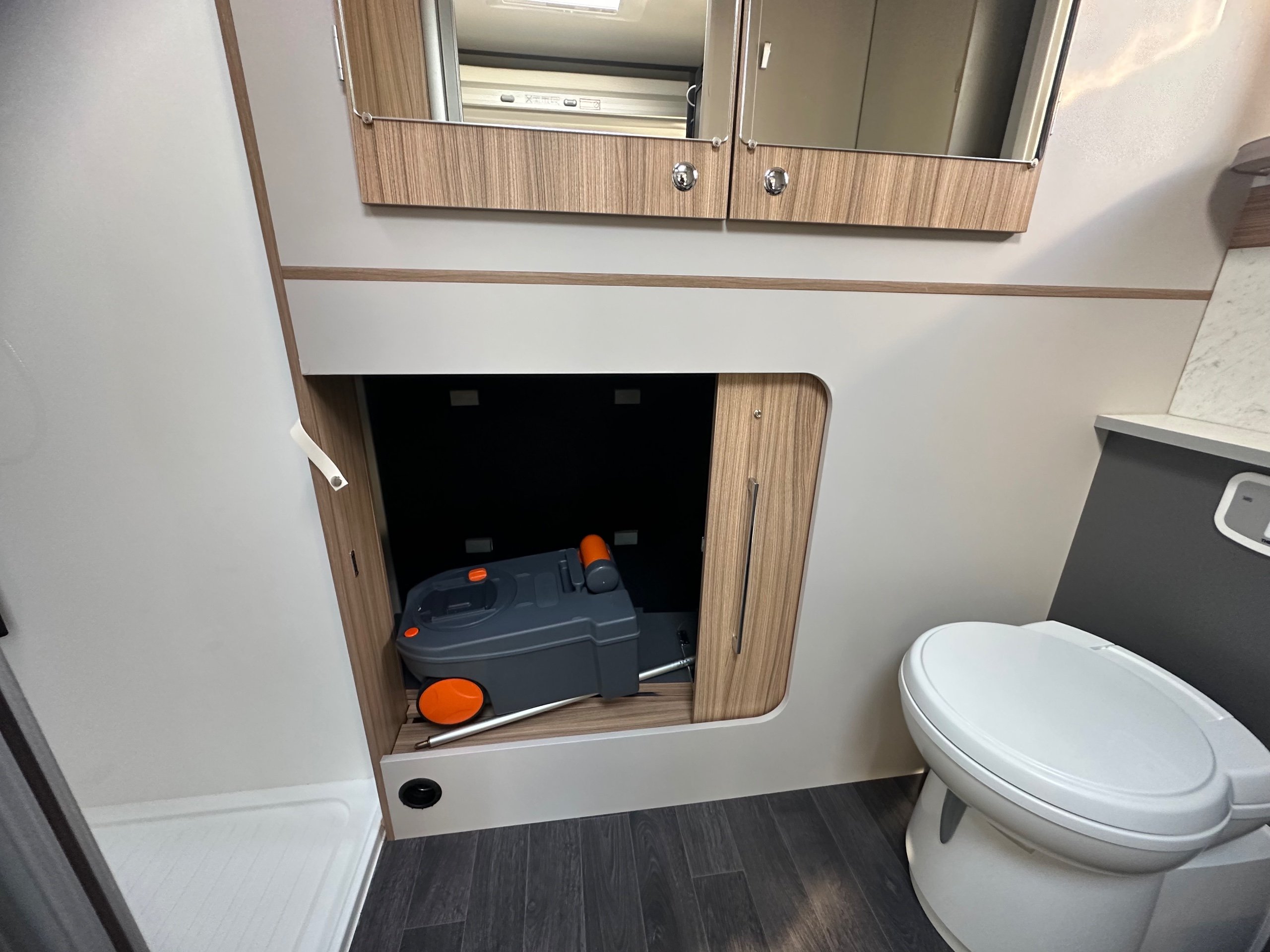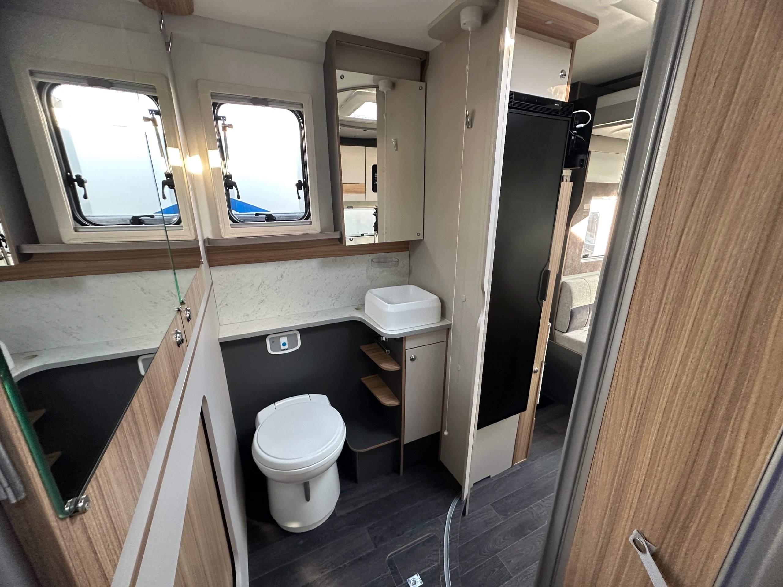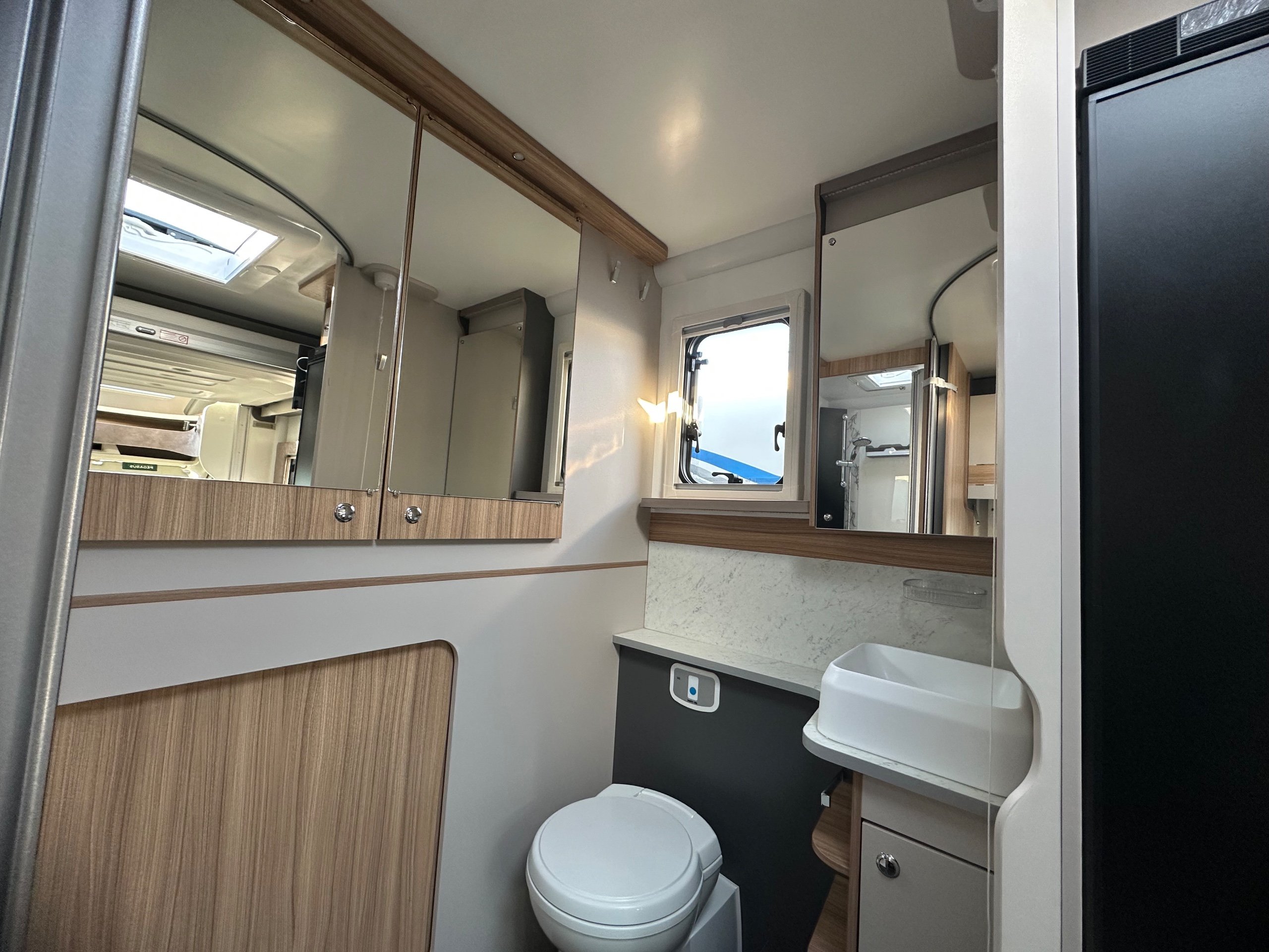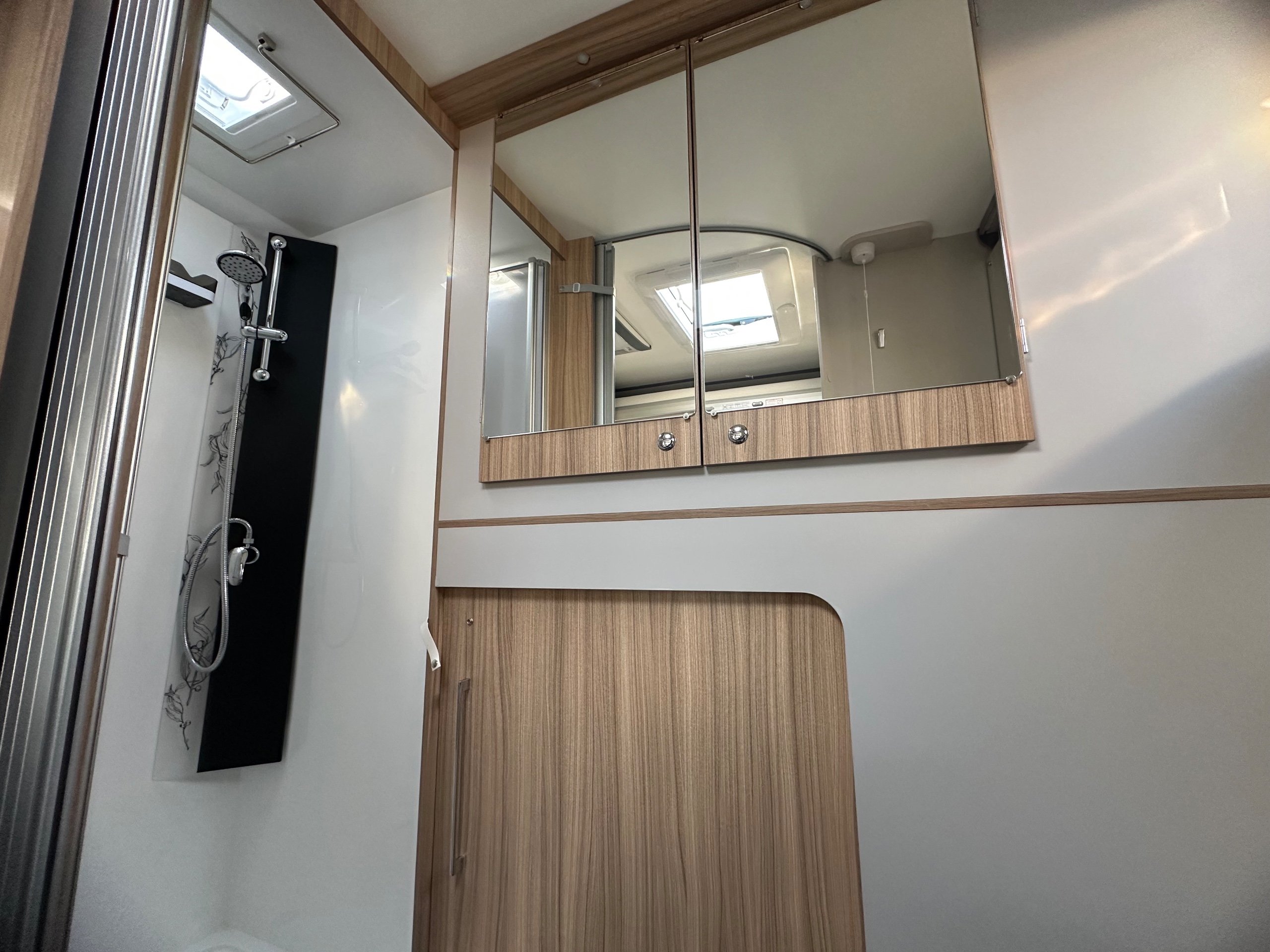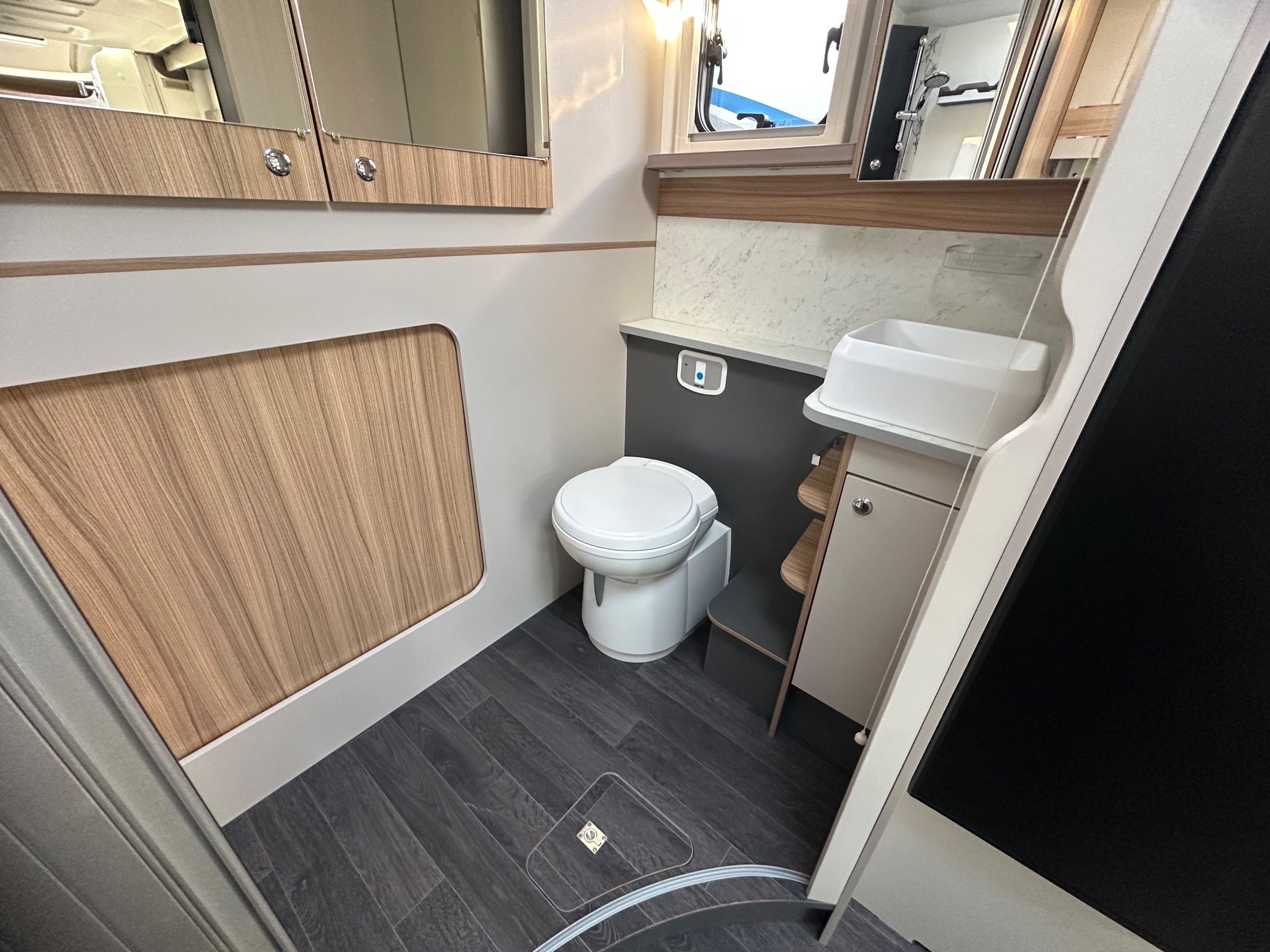 The washroom is generous size considering the size of the motorhome. There is a toilet with ample knee room, a shower the same size as a single shower in an ensuite with fold around shower screens, vanity mirror, toileries storage, corner handbasin and window for great ventilation.