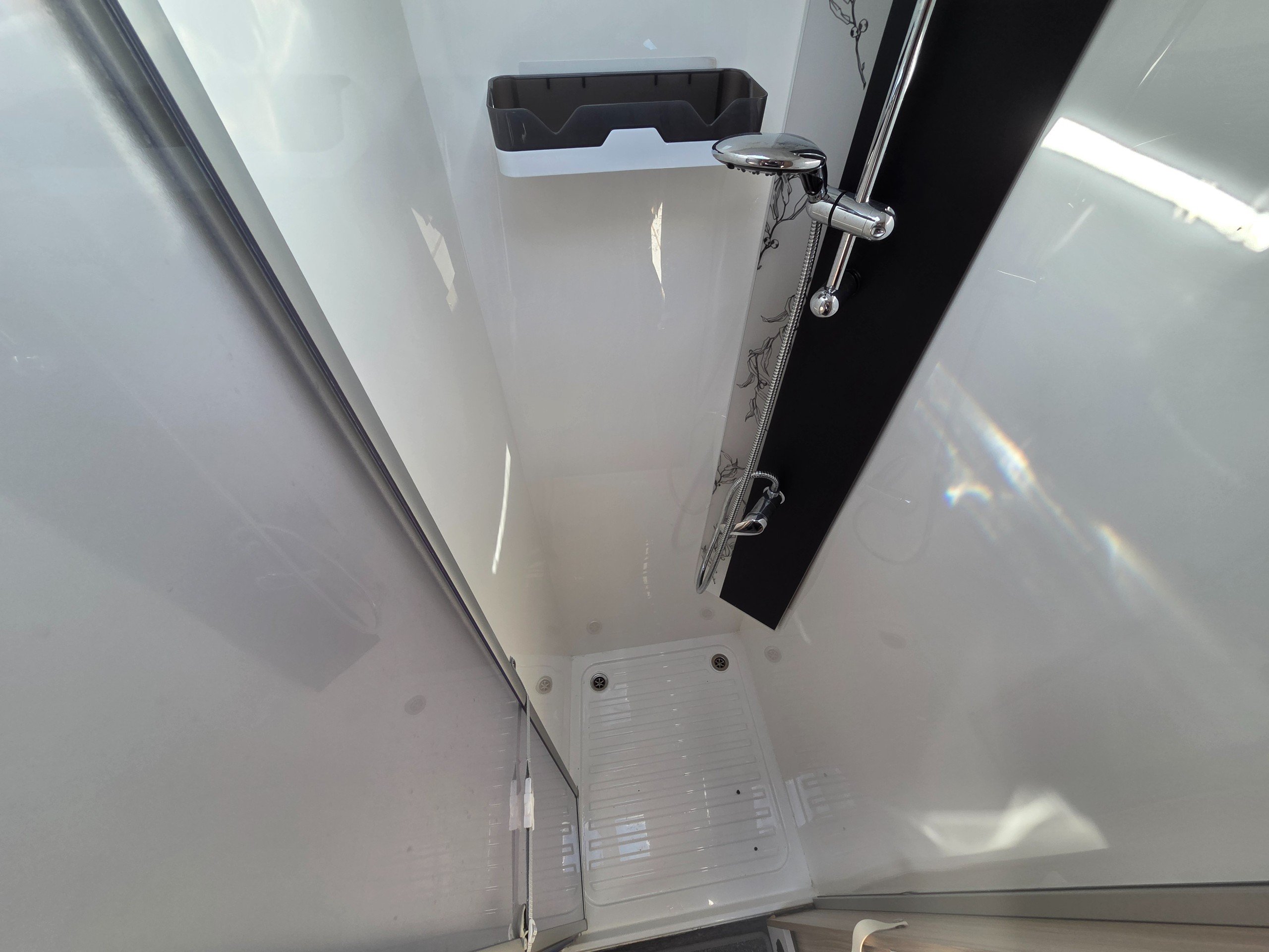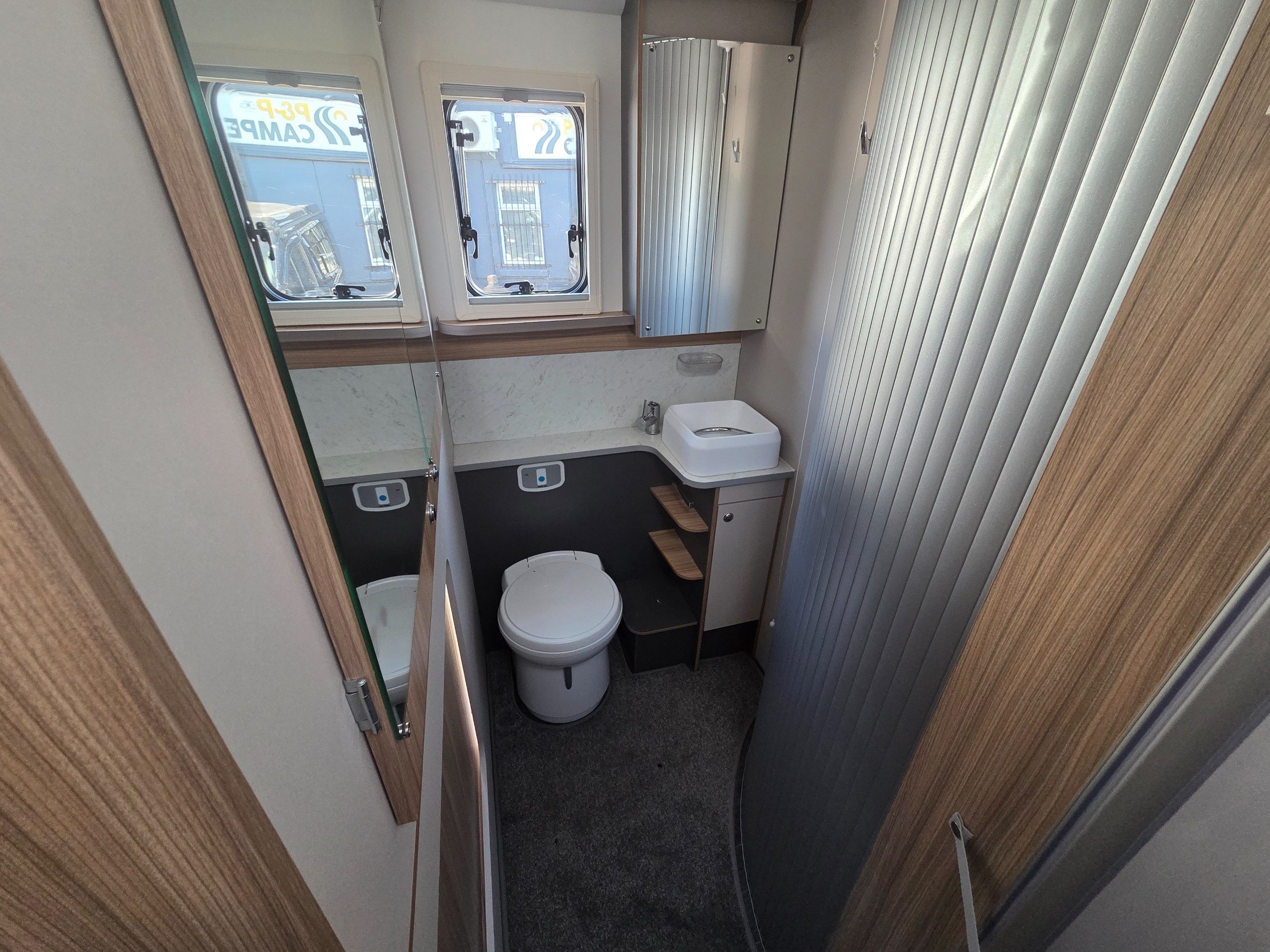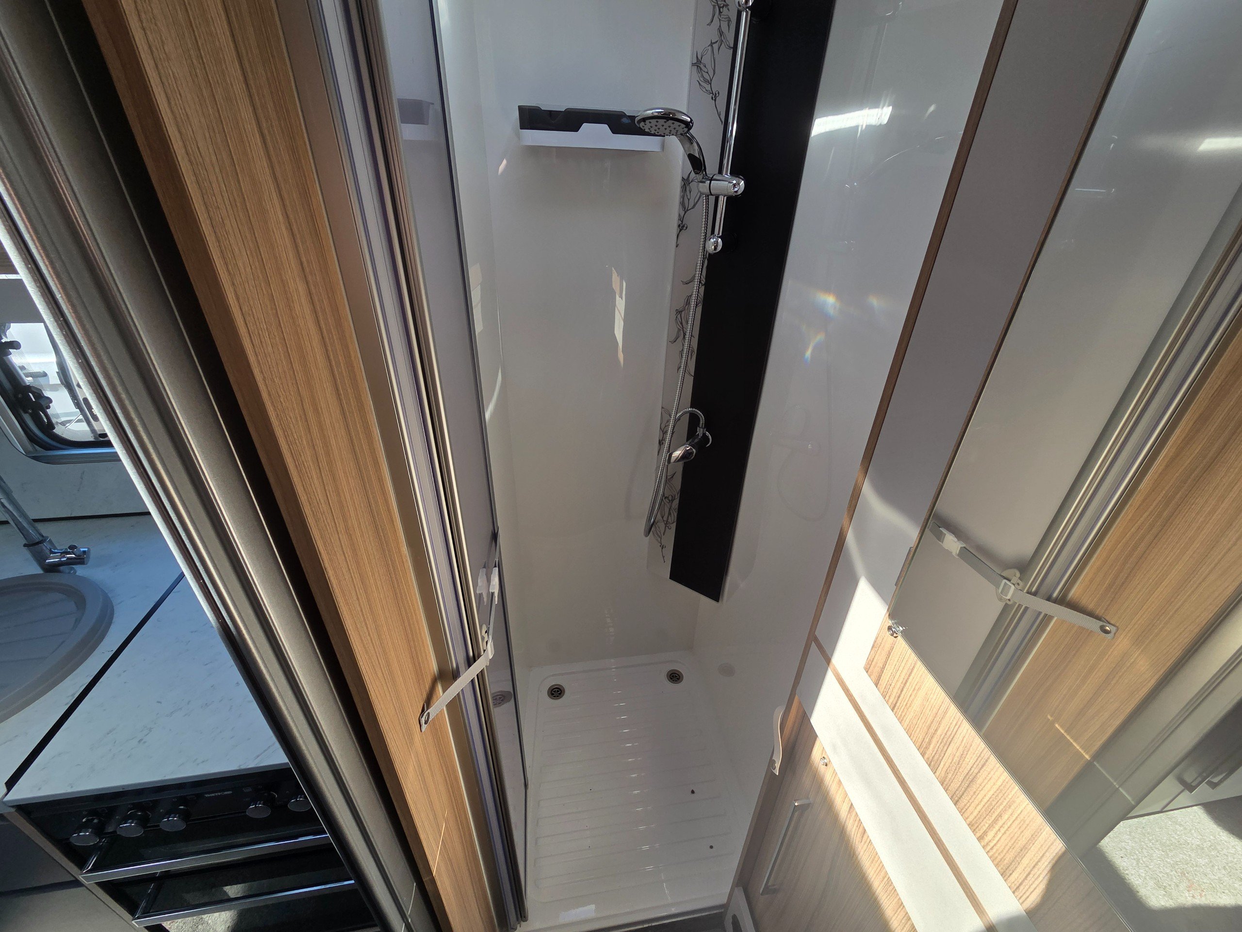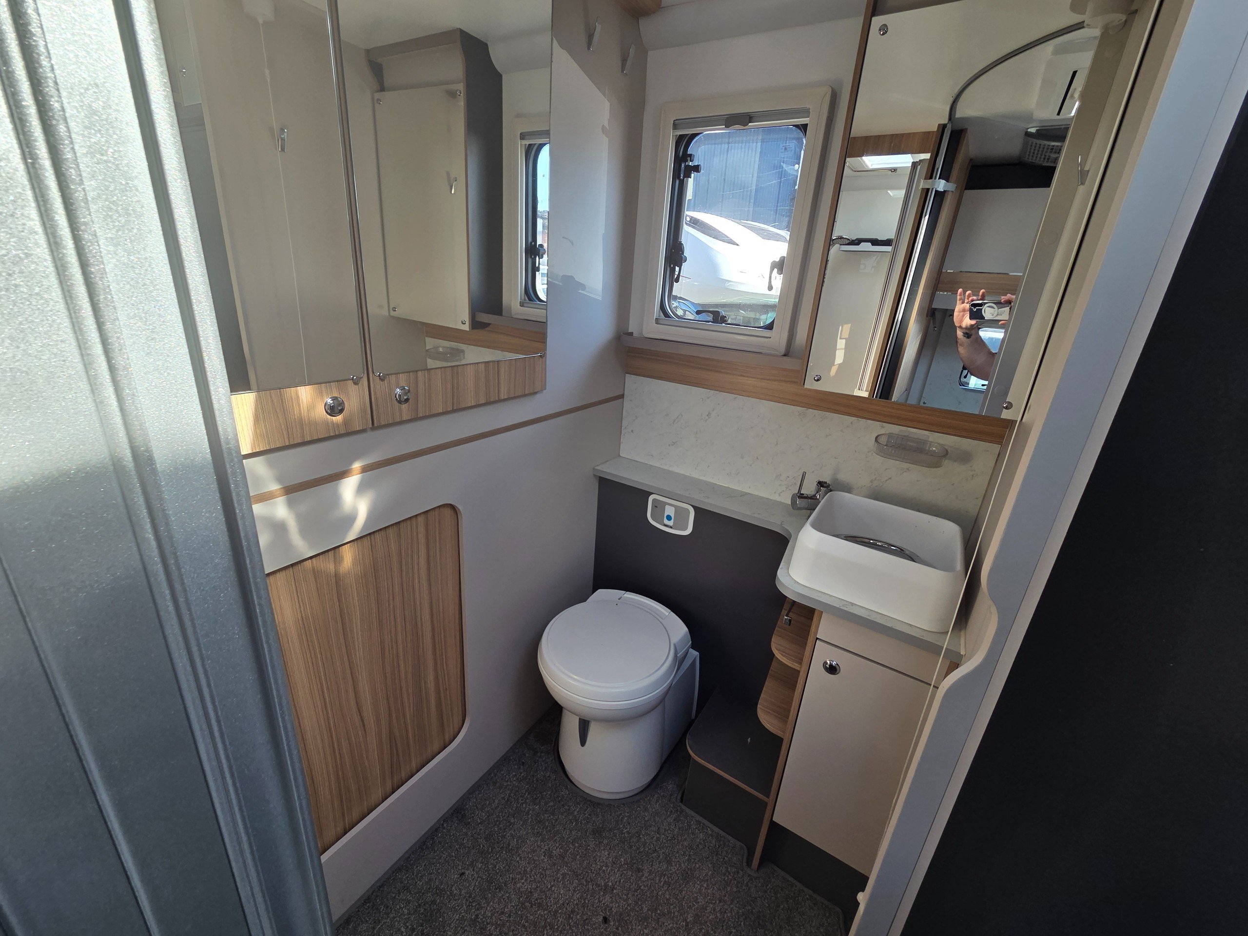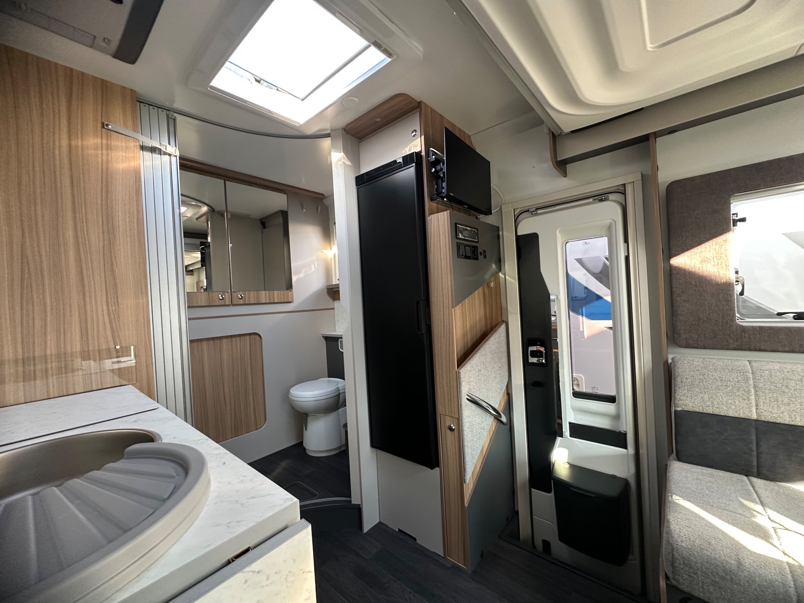 The washroom is generous size considering the size of the motorhome. There is a toilet with ample knee room, a shower the same size as a single shower in an ensuite with fold around shower screens, vanity mirror, toileries storage, corner handbasin and window for great ventilation.