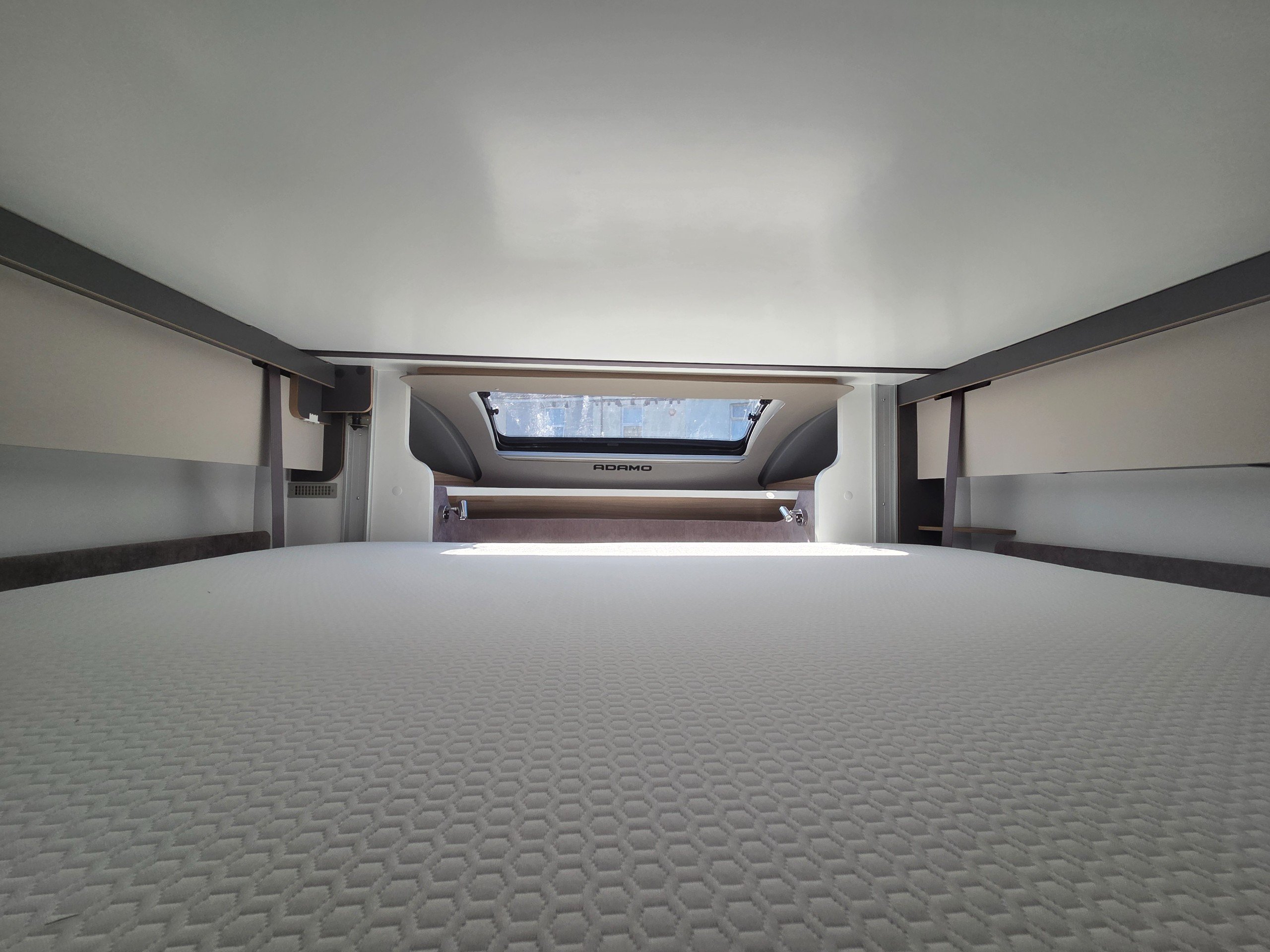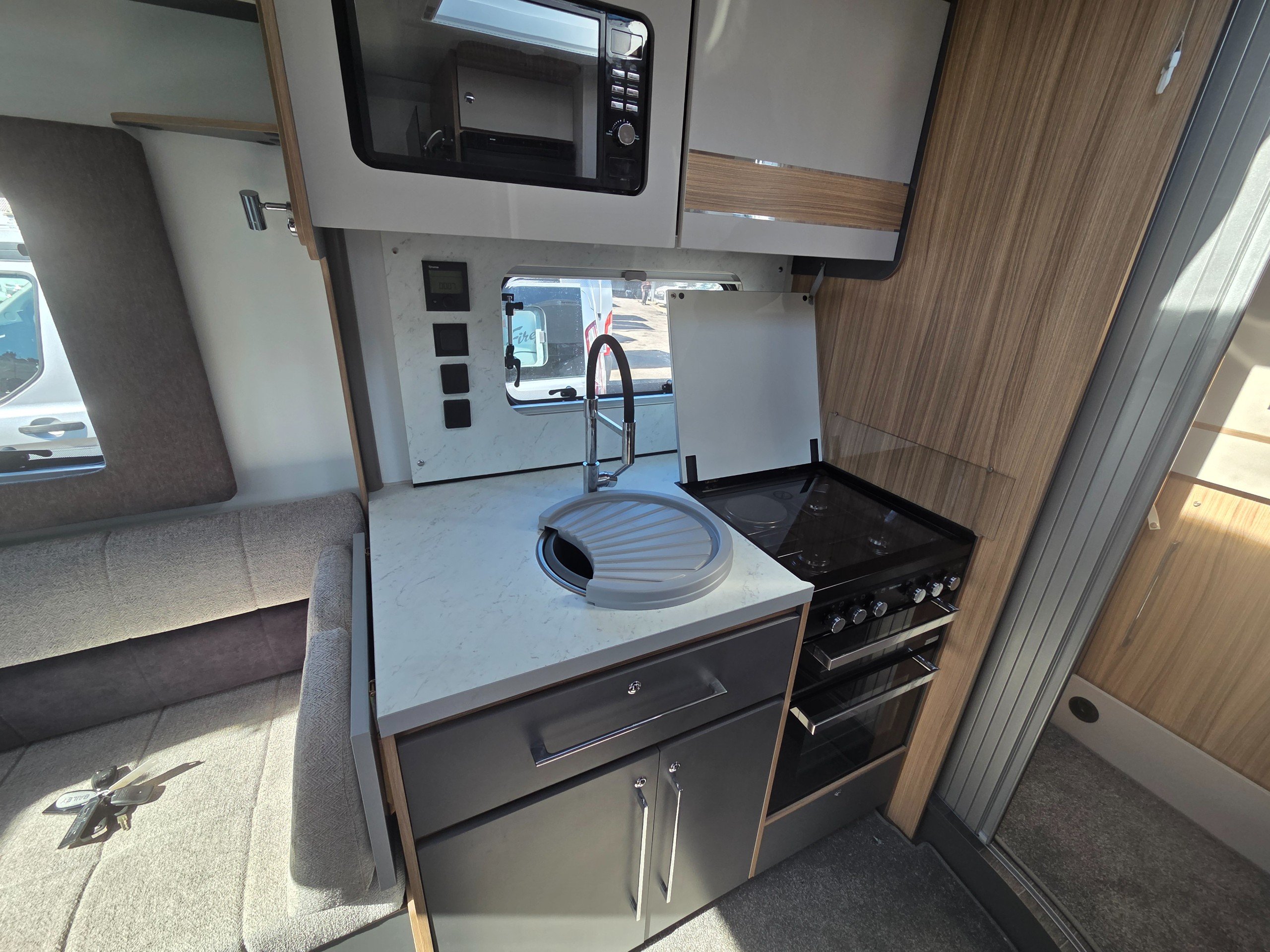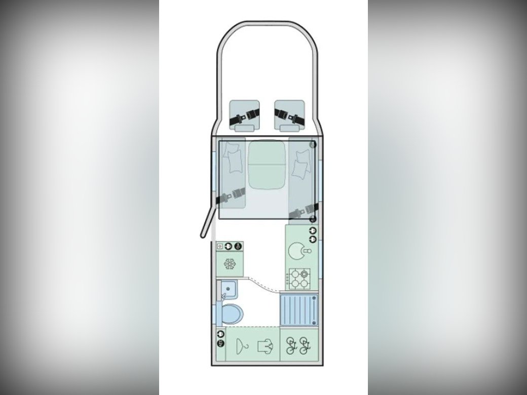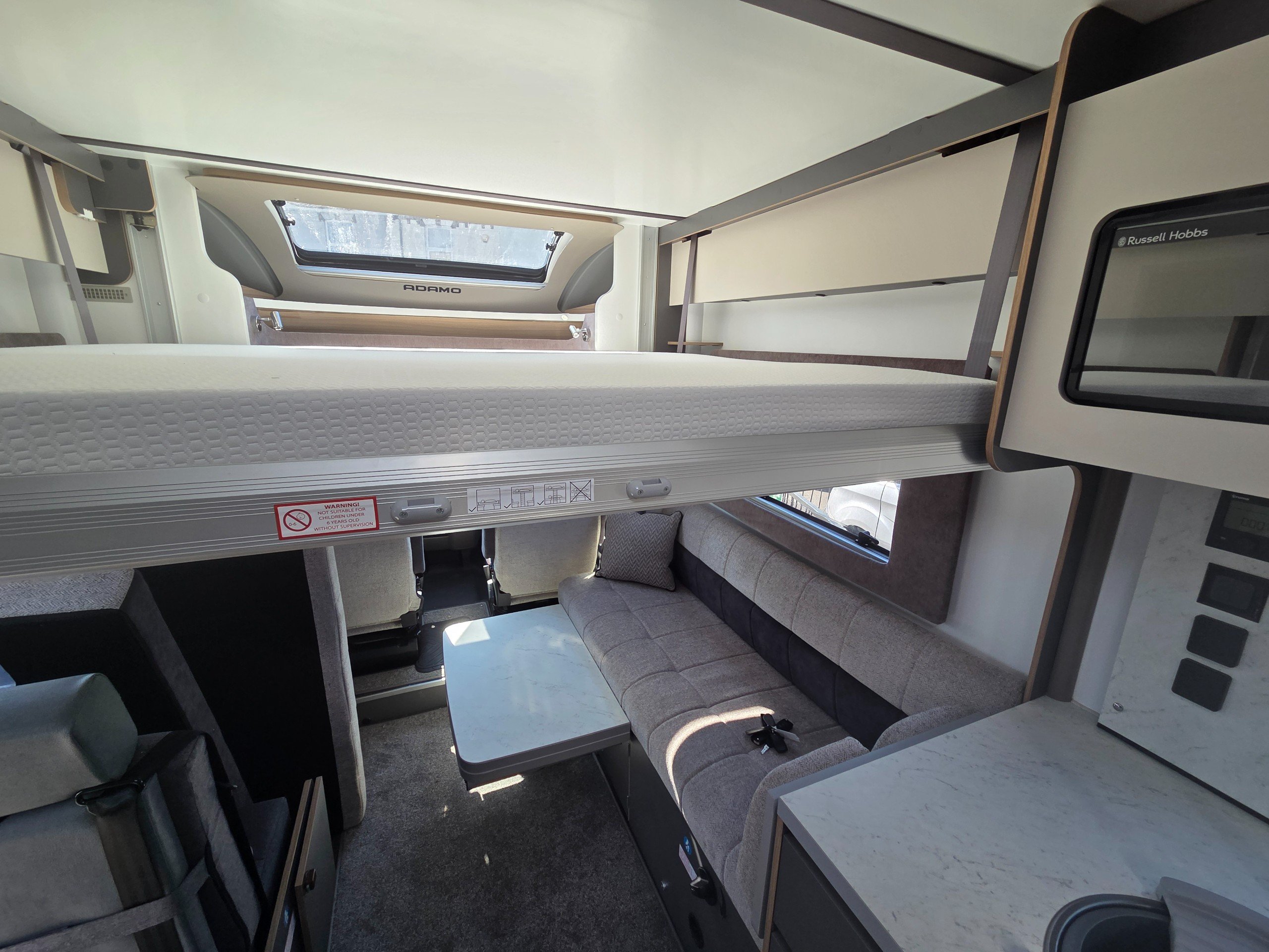 The lounge sits forward of the kitchen and is made up of 2 side settees and both cab front seats that swivel around, this really opens up the lounge and becomes a very sociable space to spend time. Under the settees are 2 hidden seats for travelling with 3 point seatbelts so you have 4 berth and 4 belts. The lounge turns into a double bed to make the 3rd and 4th berth and in the ceiling overhead there is an electric drop down bed this makes the 1st and 2nd berth accessed via a ladder when using the van as a 4 berth or can come waist height when using as a 2 berth.