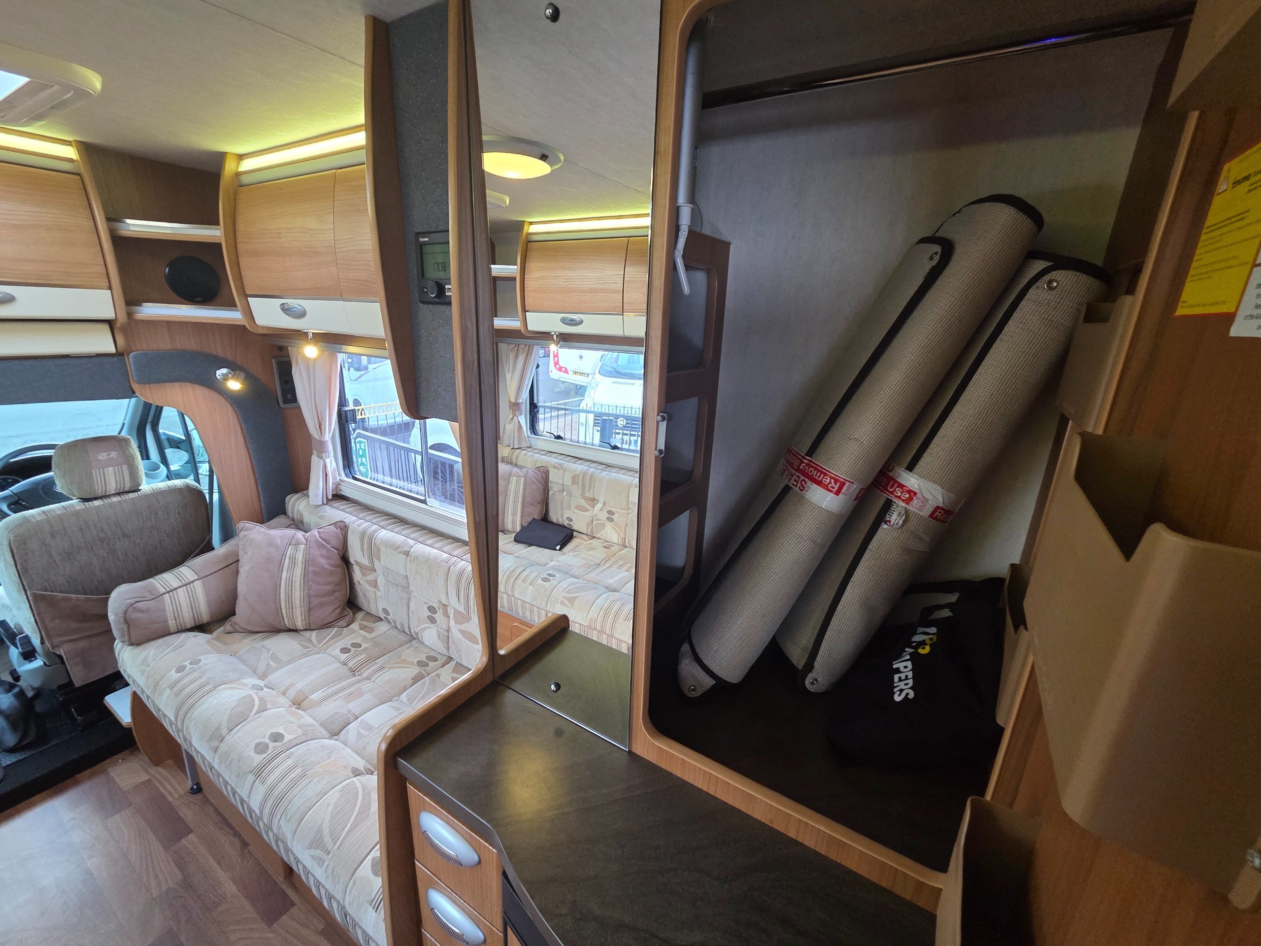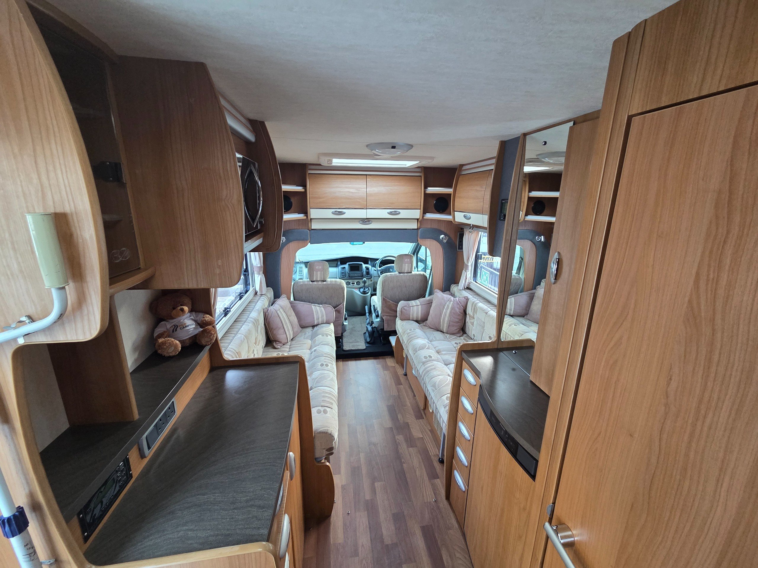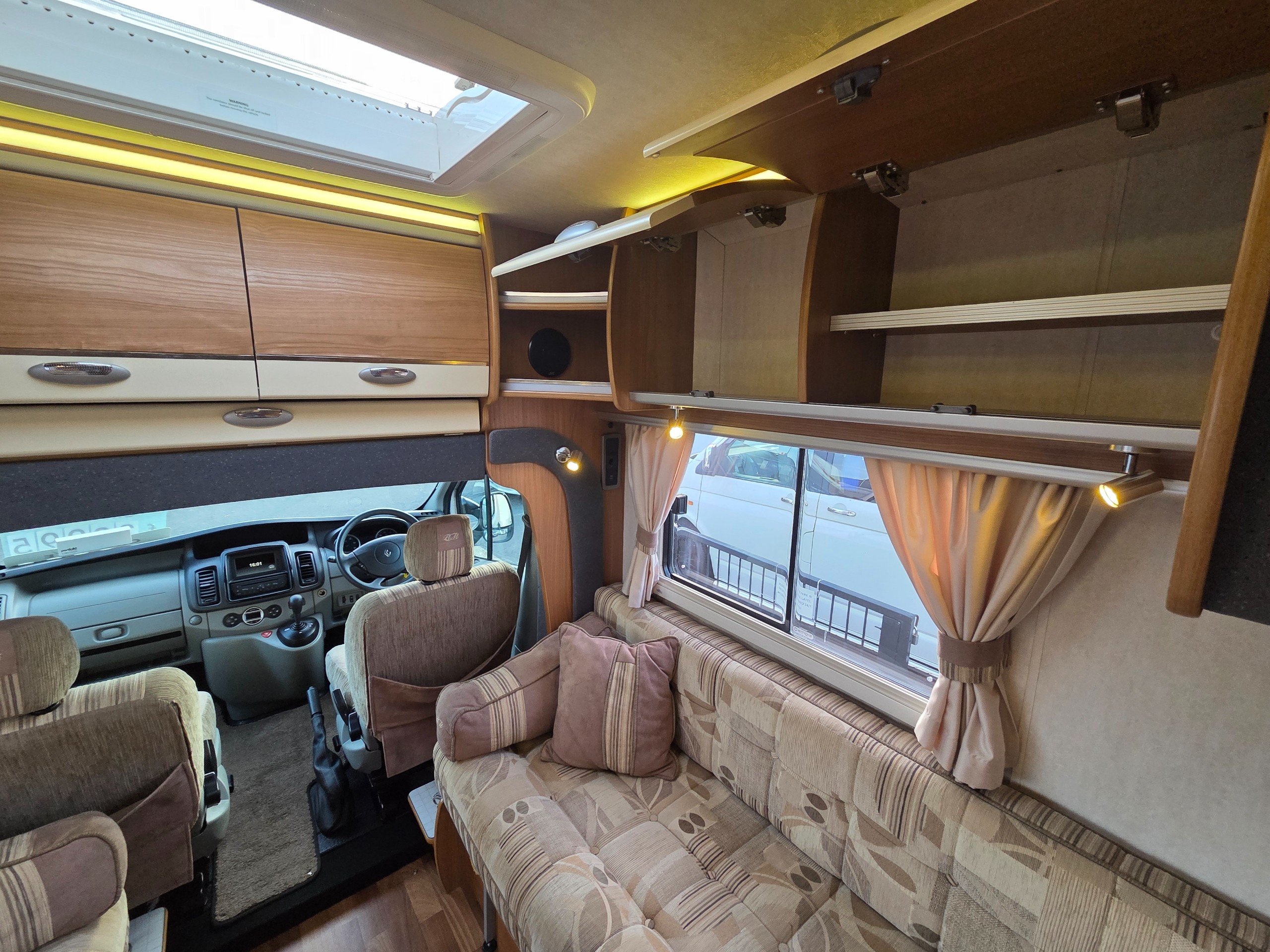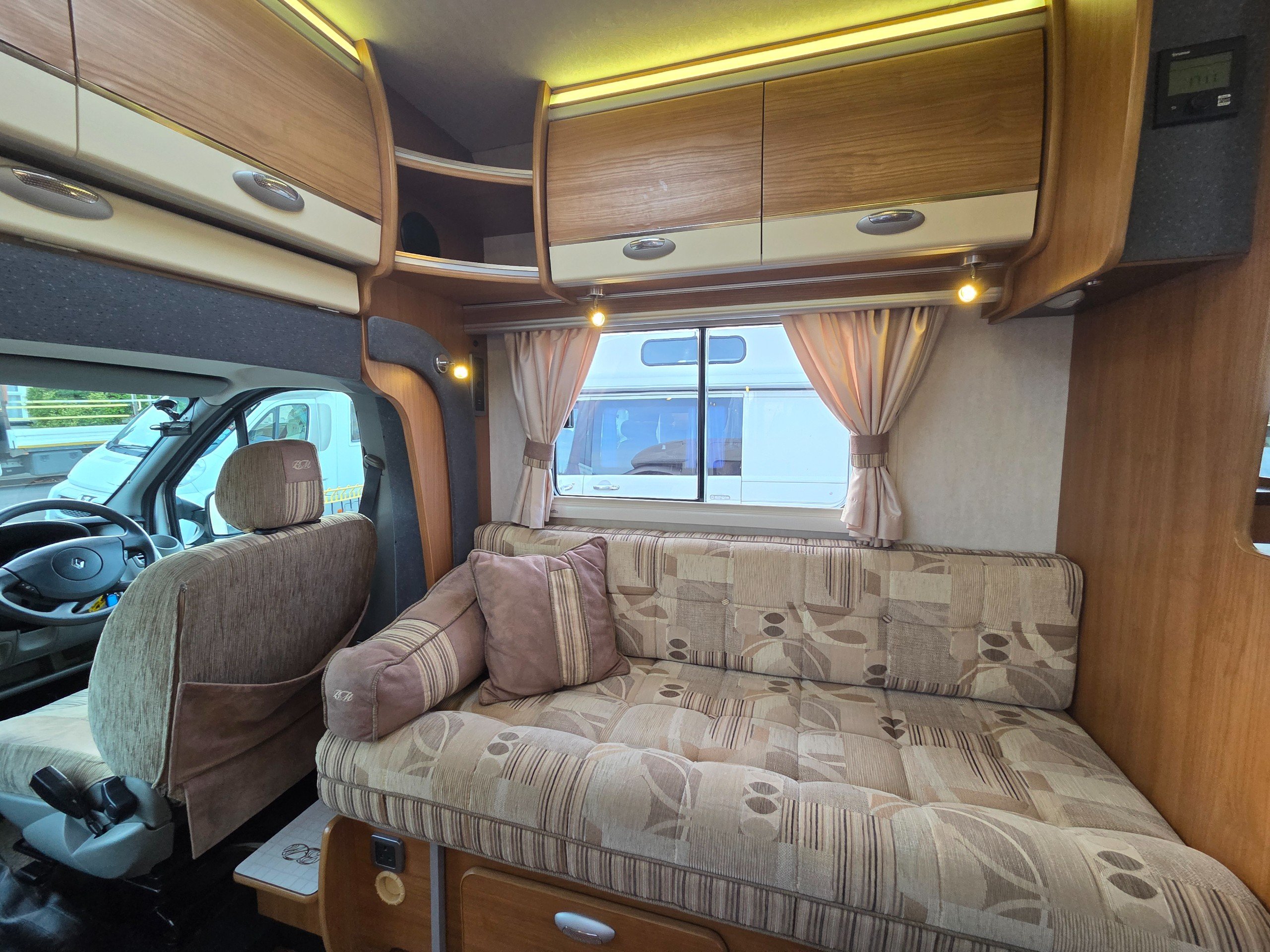 The lounge is to the front of the motorhome this is made up by way of 2 side bench settees these make into 2 single beds or a very large double. You will find storage over head in the wrap around storage cupboards and over the cab in the larger locker. There is even a space for the stand alone table over the cab that has its own cupboard.