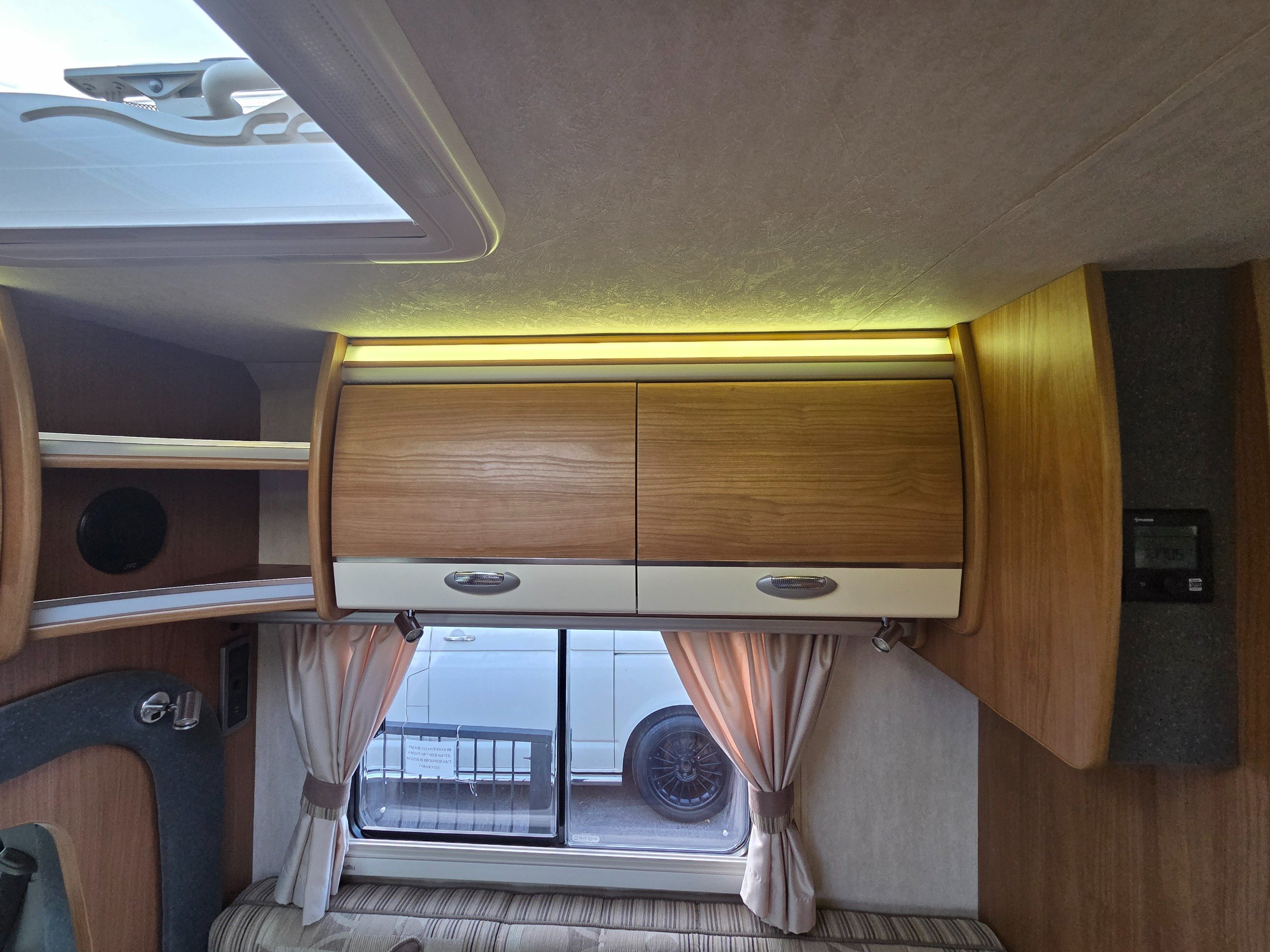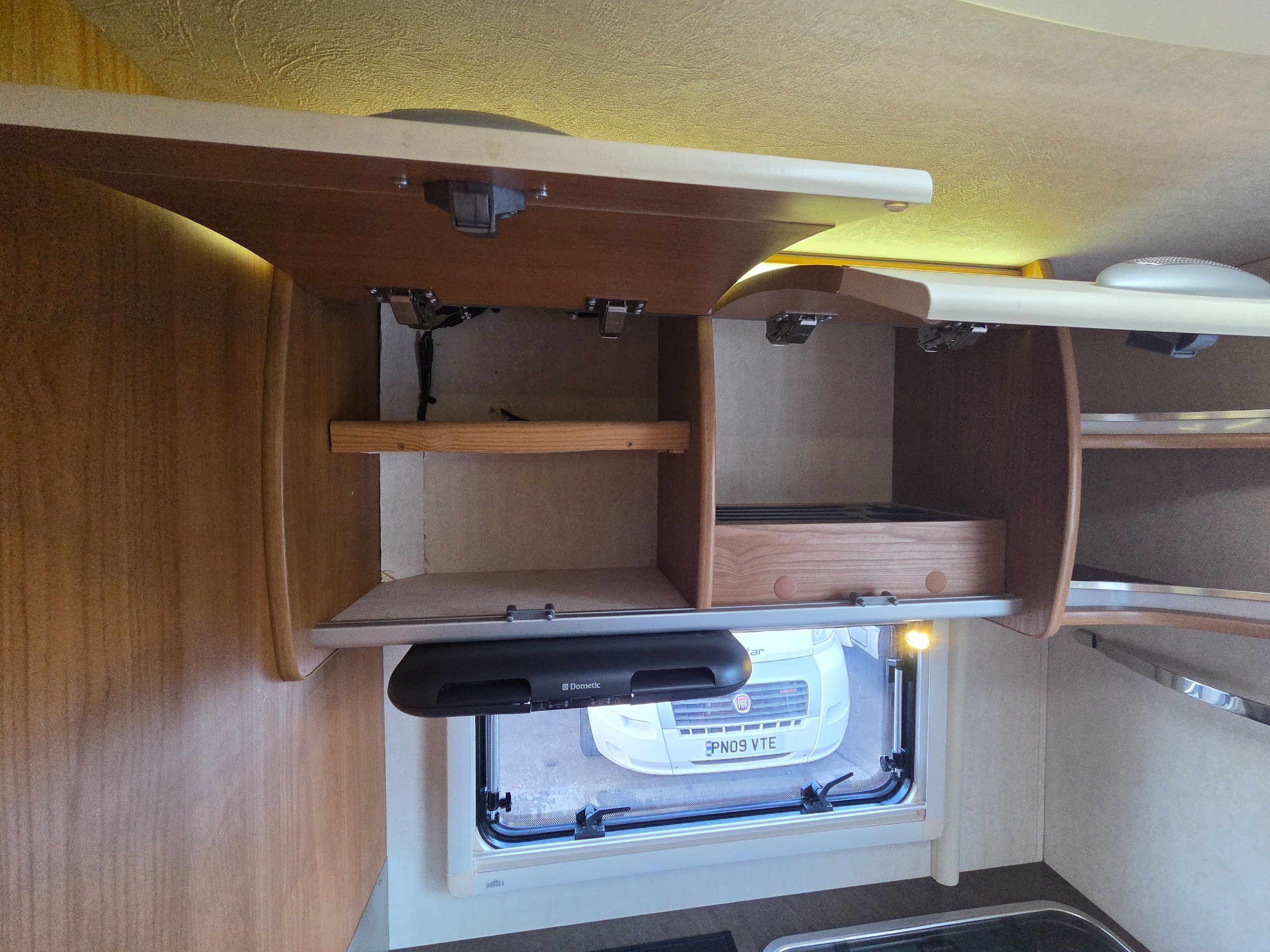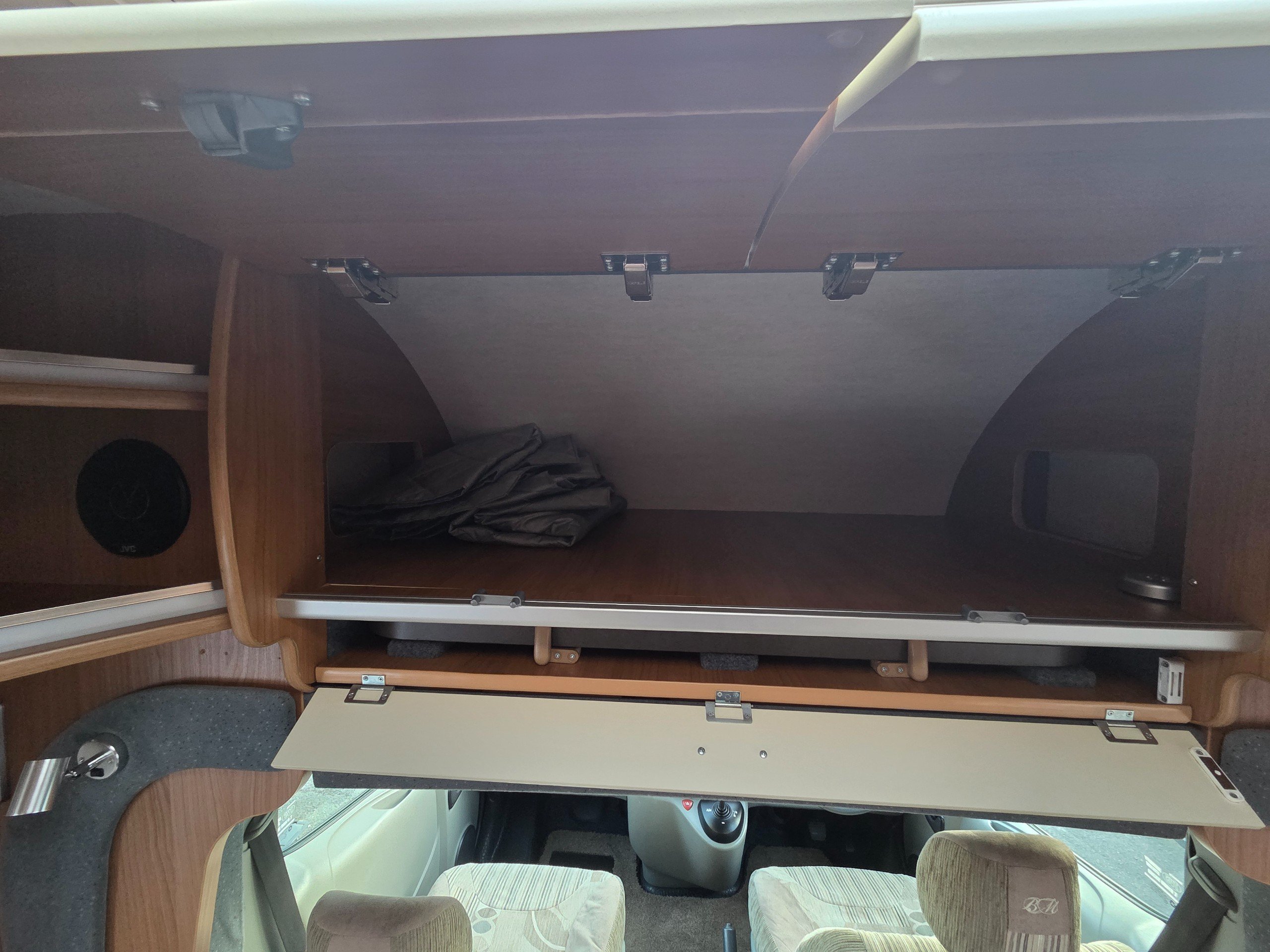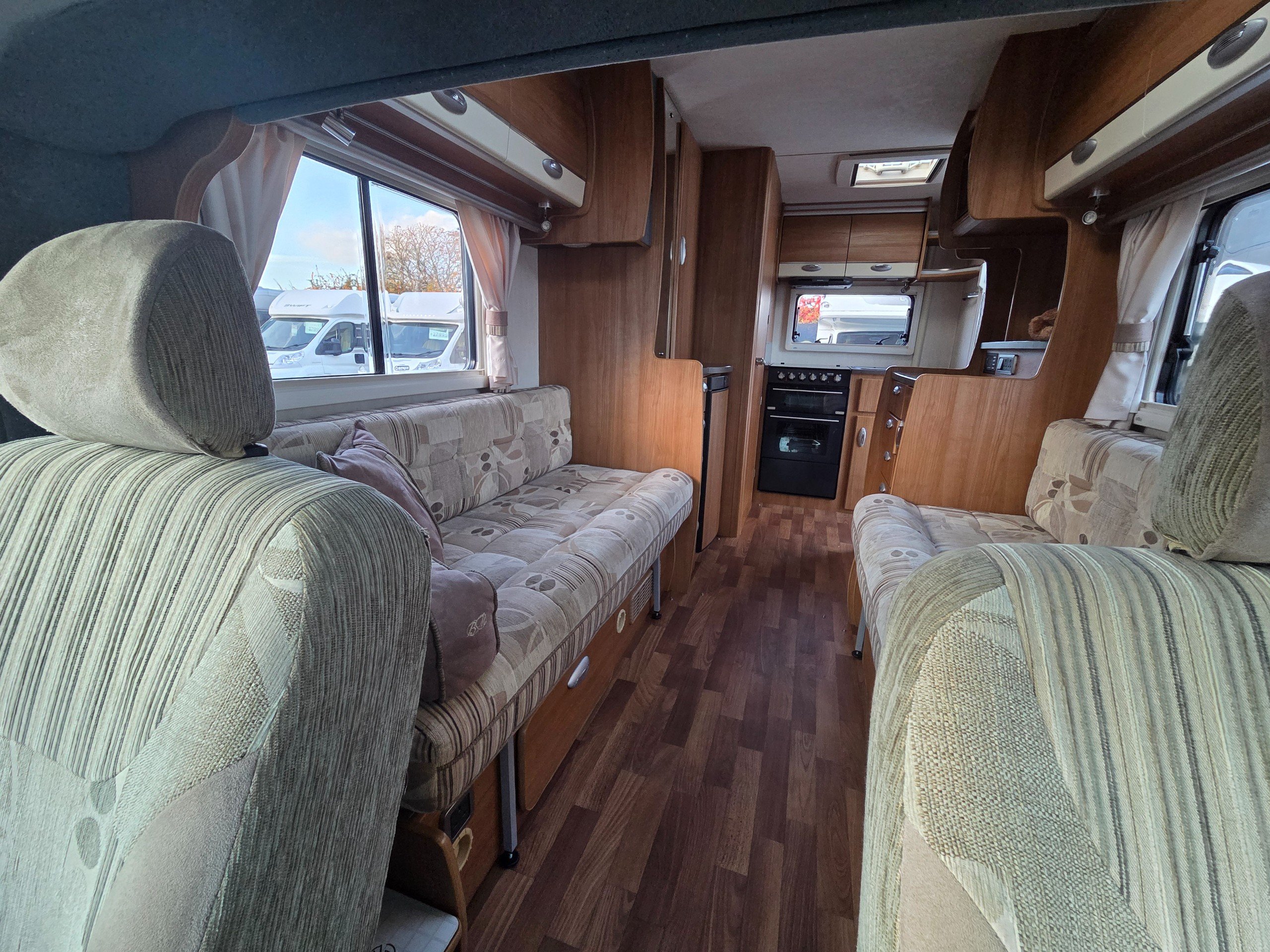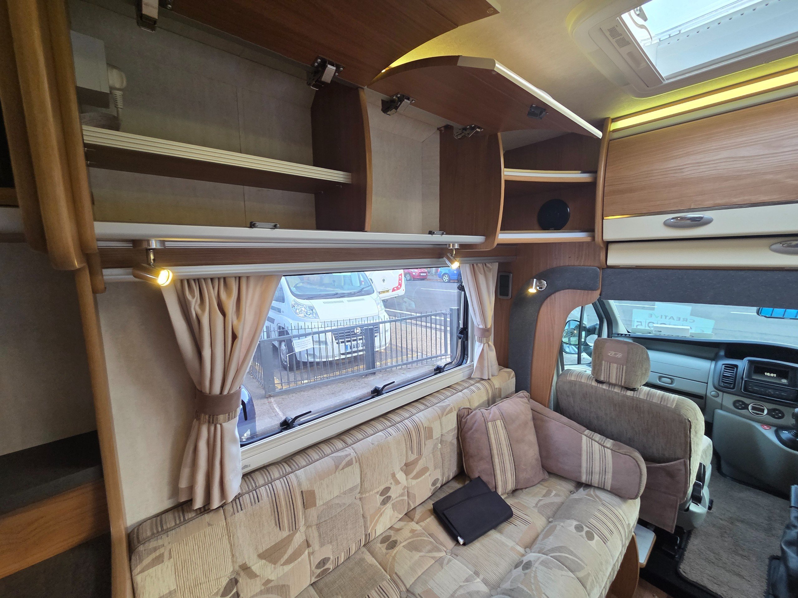 The lounge is to the front of the motorhome this is made up by way of 2 side bench settees these make into 2 single beds or a very large double. You will find storage over head in the wrap around storage cupboards and over the cab in the larger locker. There is even a space for the stand alone table over the cab that has its own cupboard.