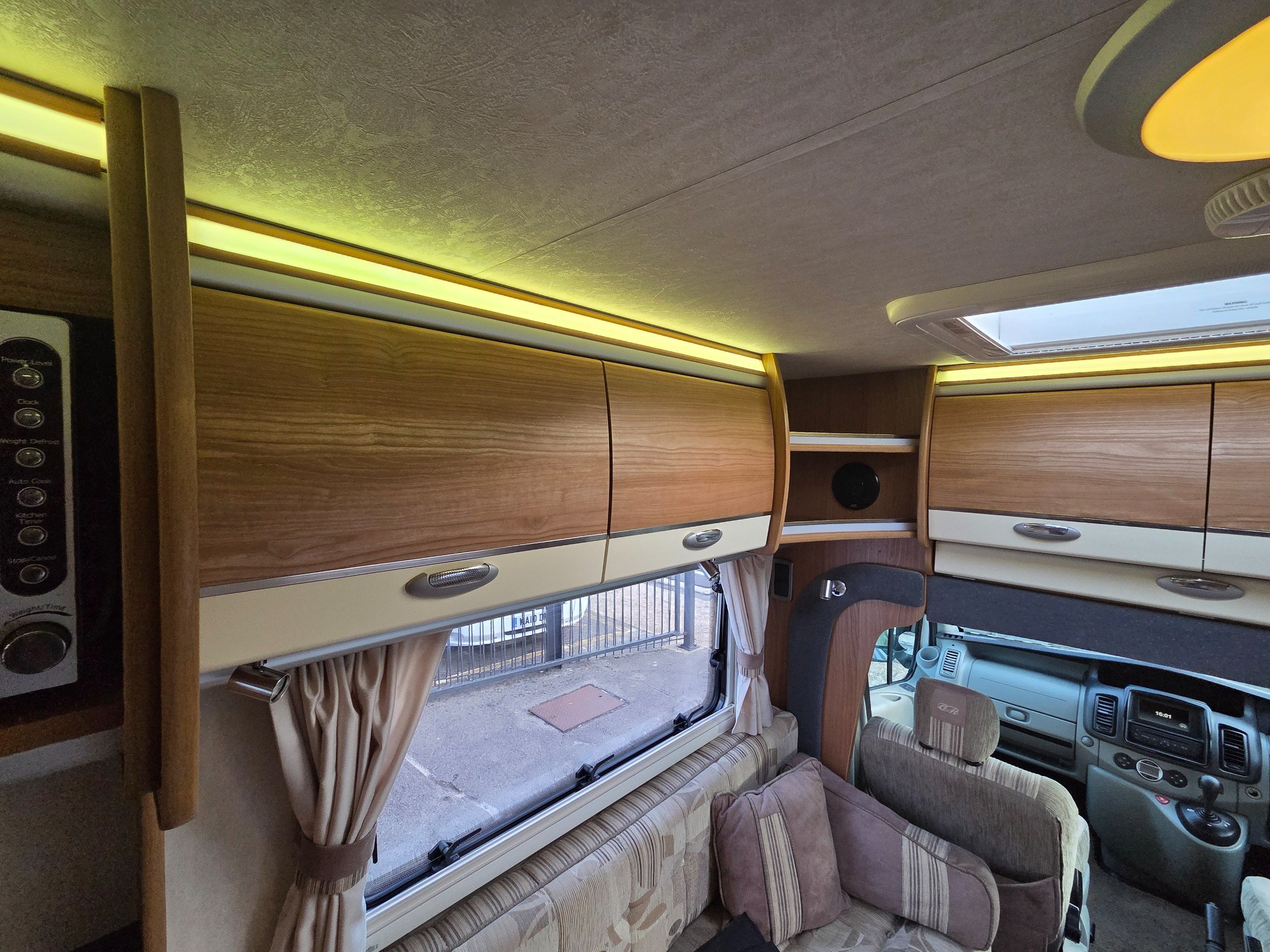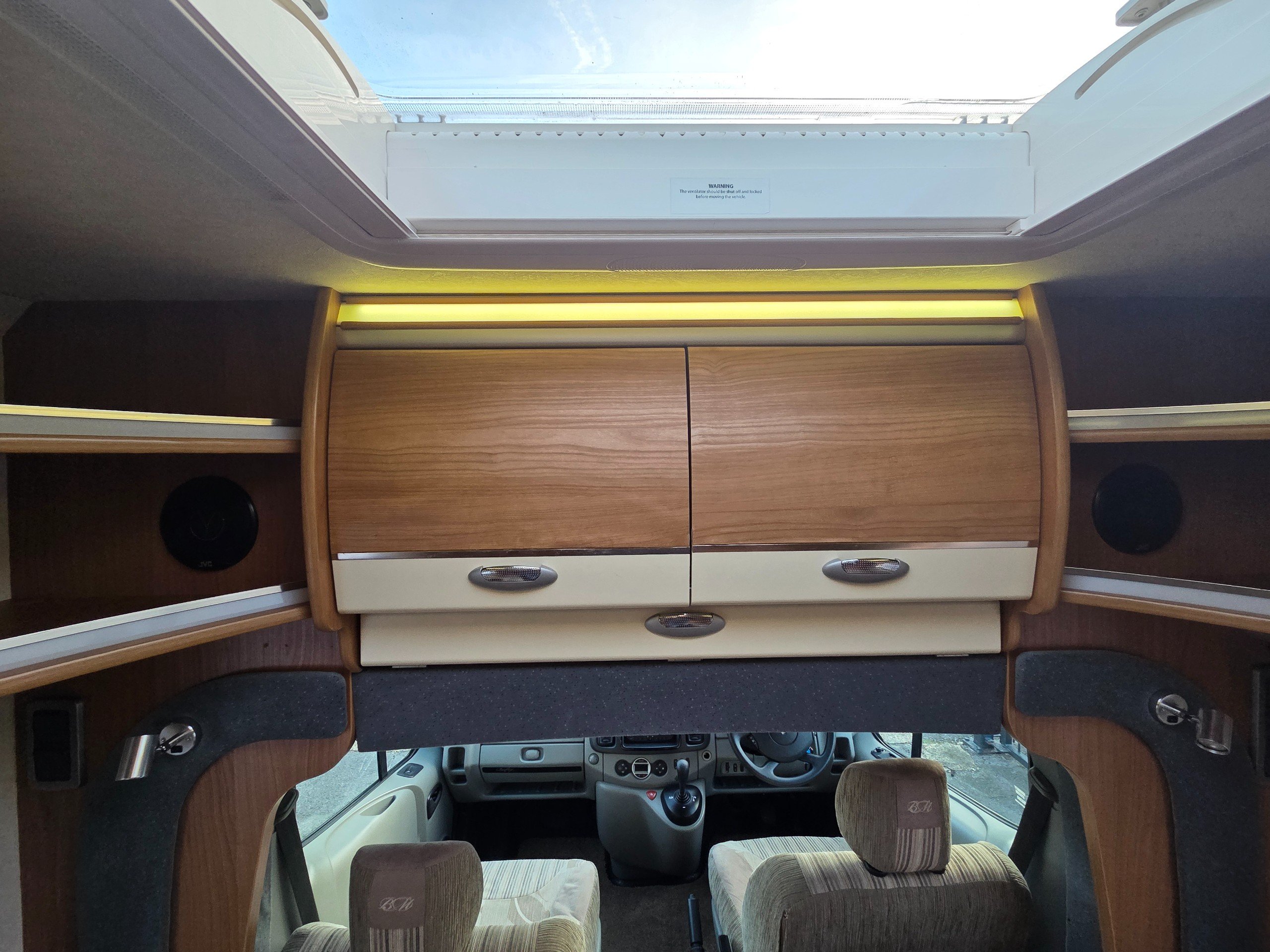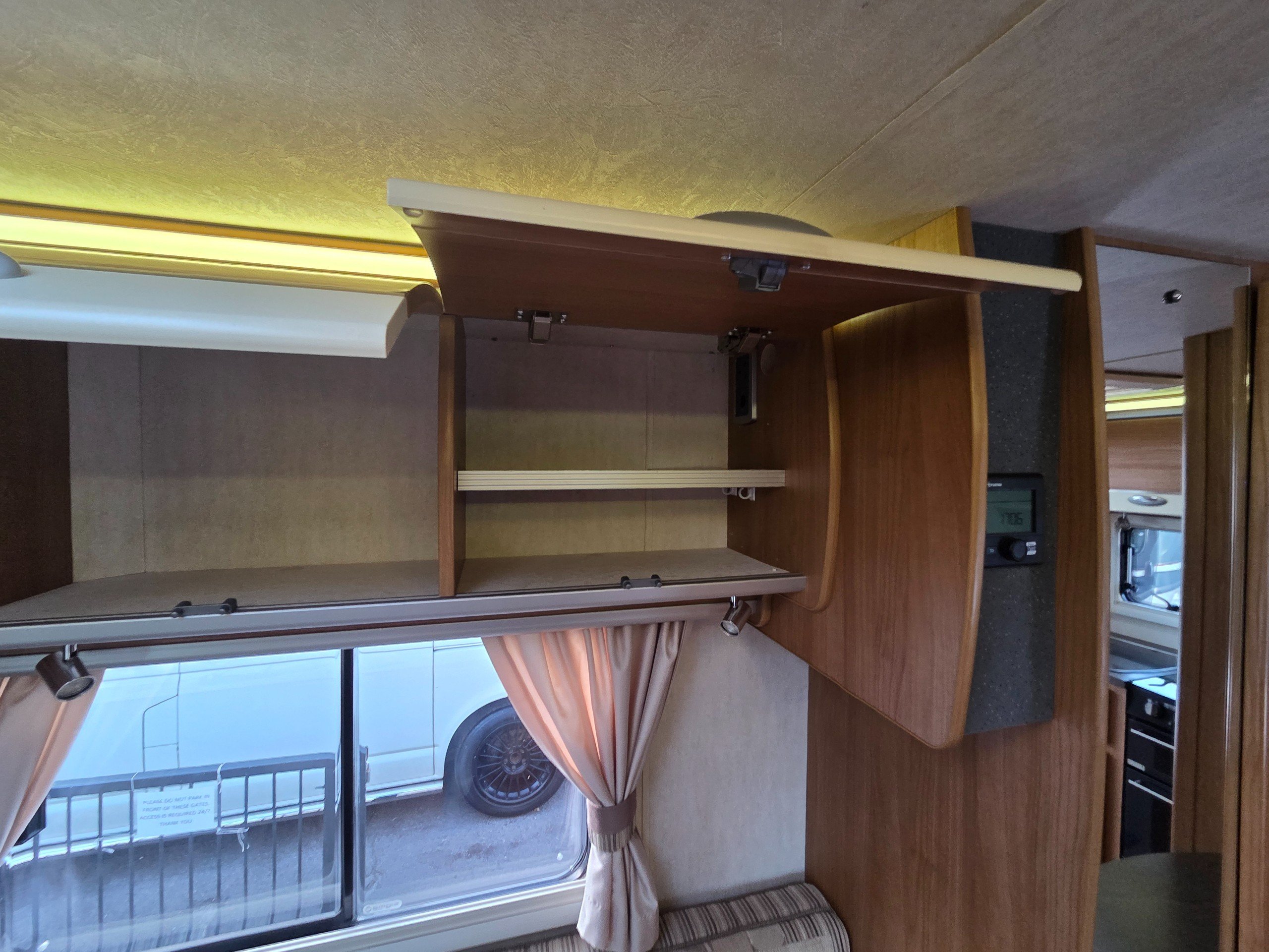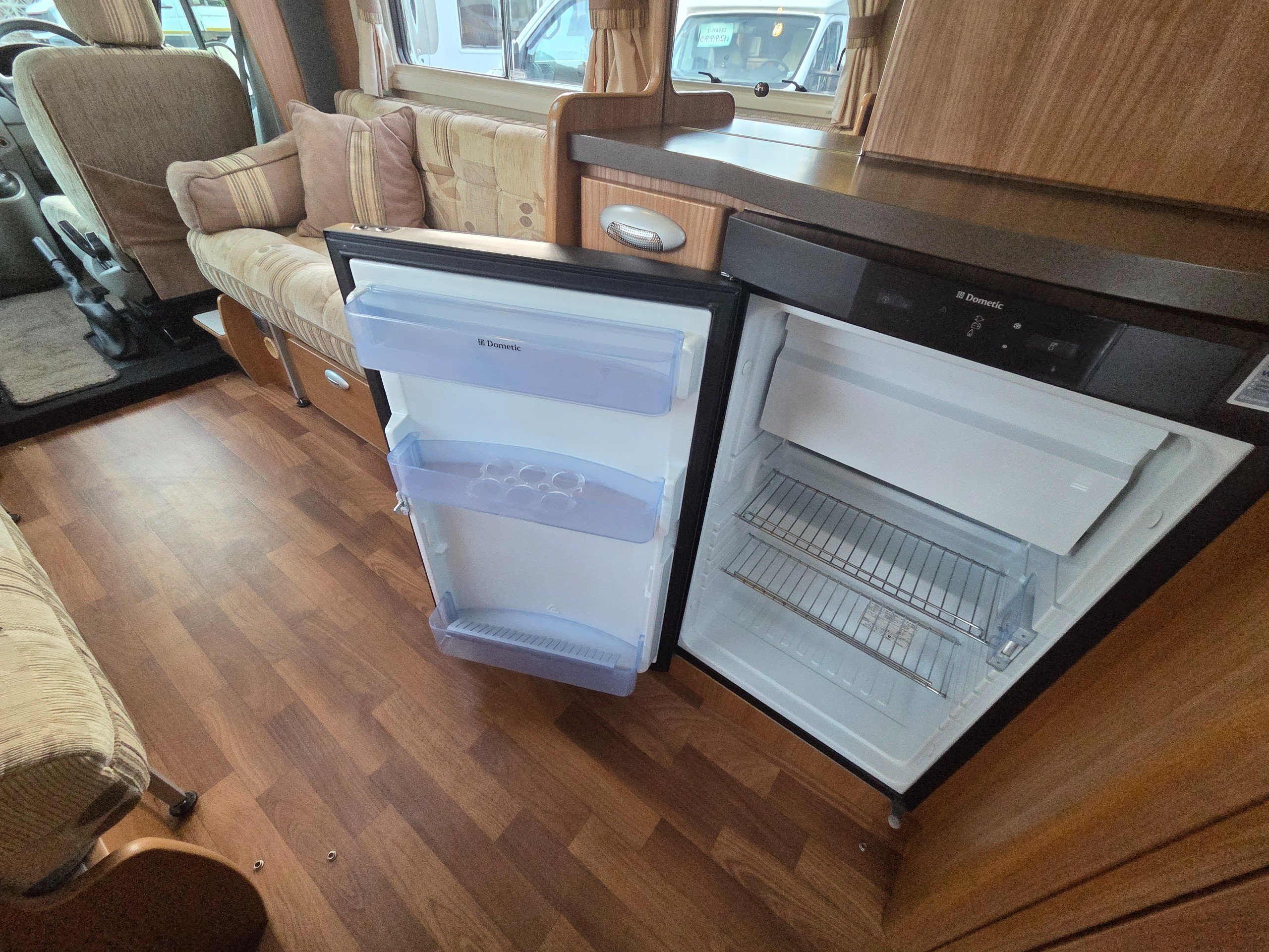 The lounge is to the front of the motorhome this is made up by way of 2 side bench settees these make into 2 single beds or a very large double. You will find storage over head in the wrap around storage cupboards and over the cab in the larger locker. There is even a space for the stand alone table over the cab that has its own cupboard.