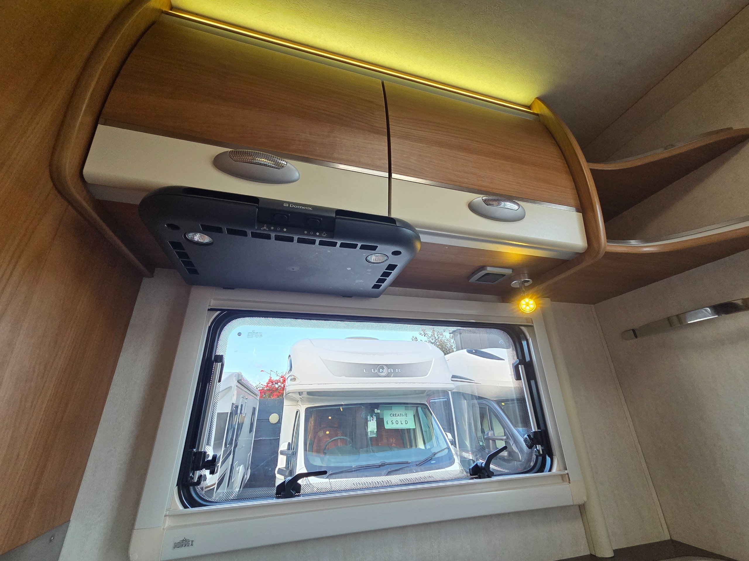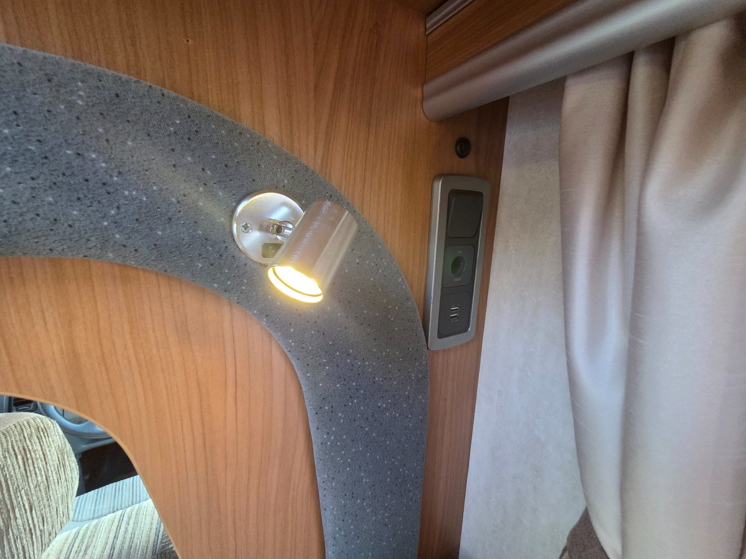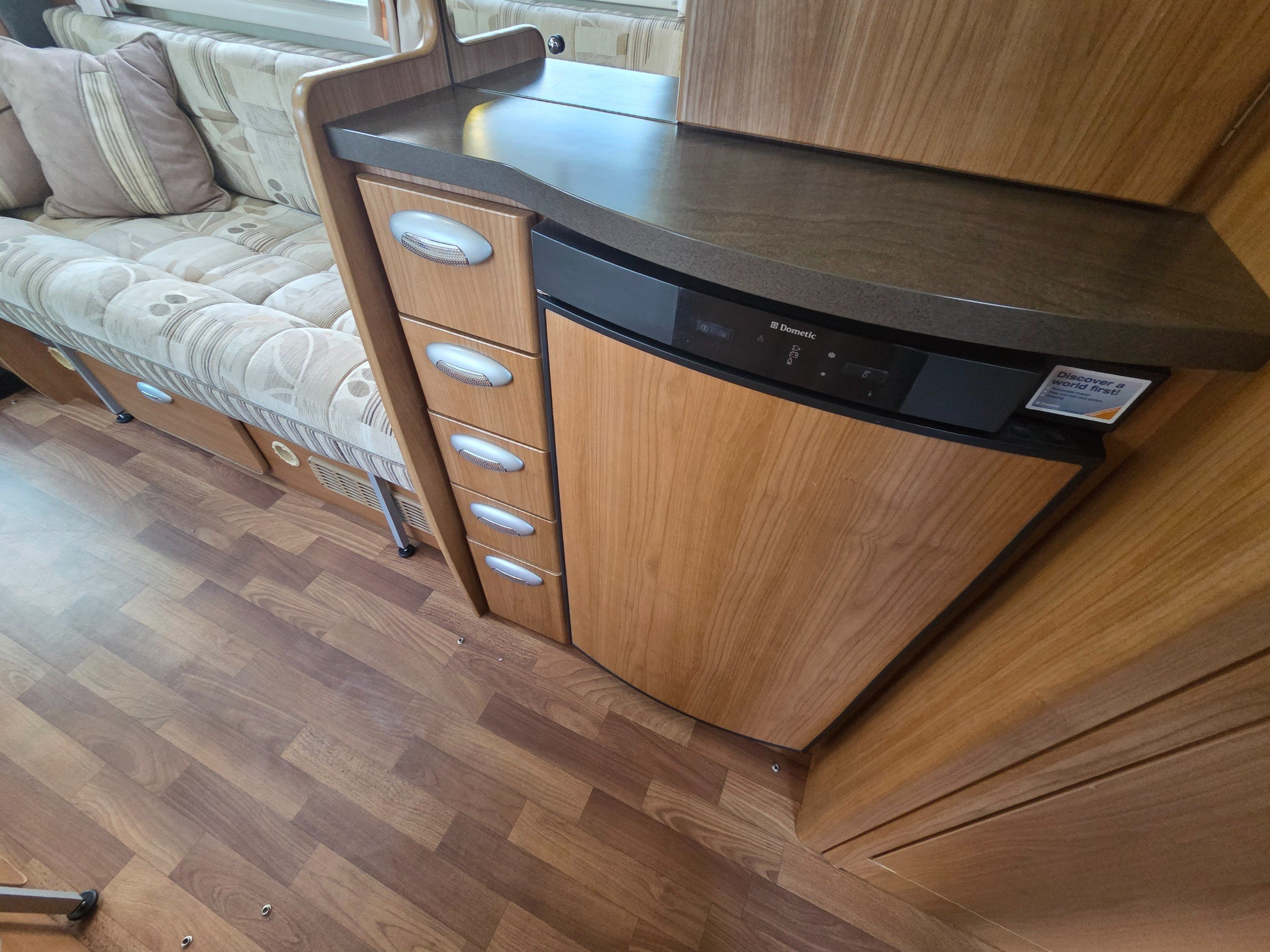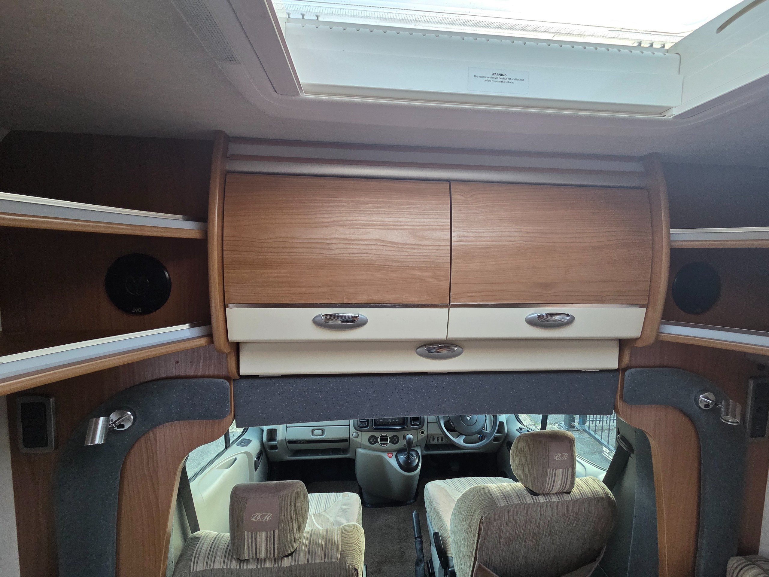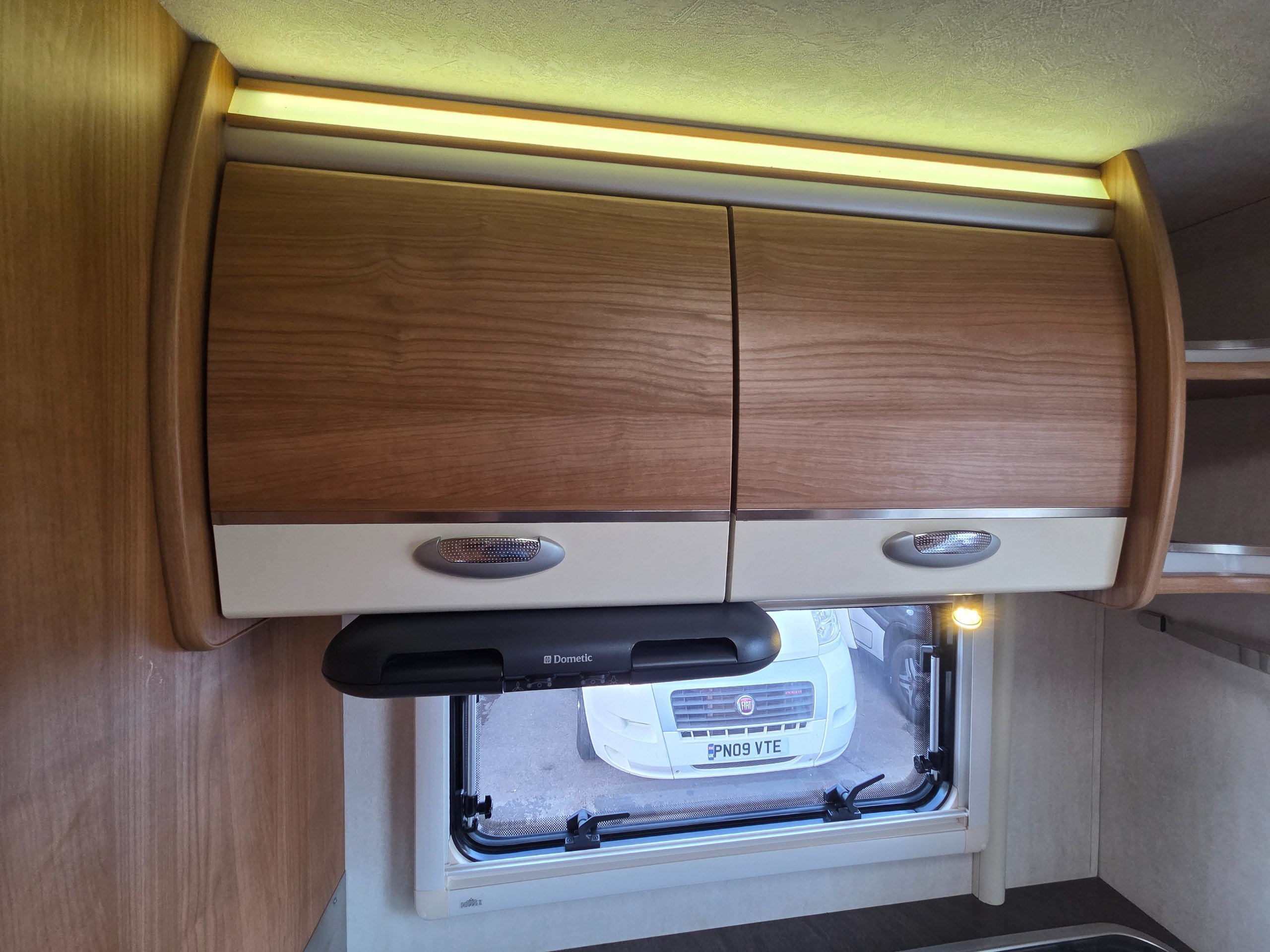 The lounge is to the front of the motorhome this is made up by way of 2 side bench settees these make into 2 single beds or a very large double. You will find storage over head in the wrap around storage cupboards and over the cab in the larger locker. There is even a space for the stand alone table over the cab that has its own cupboard.