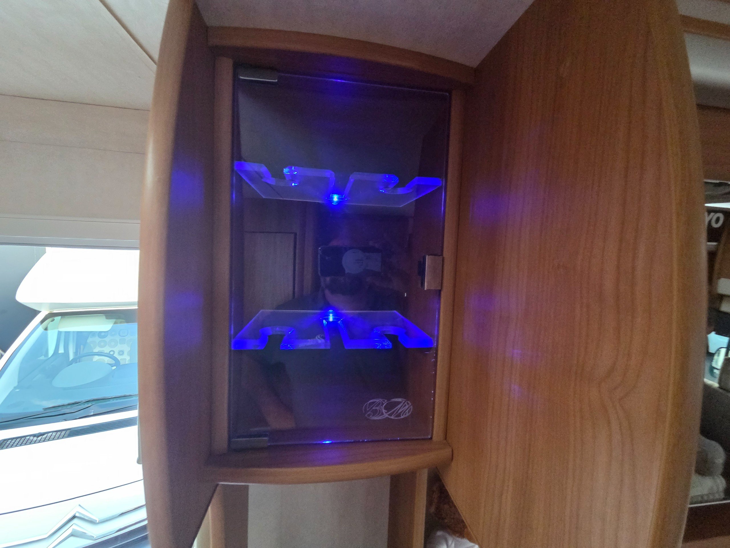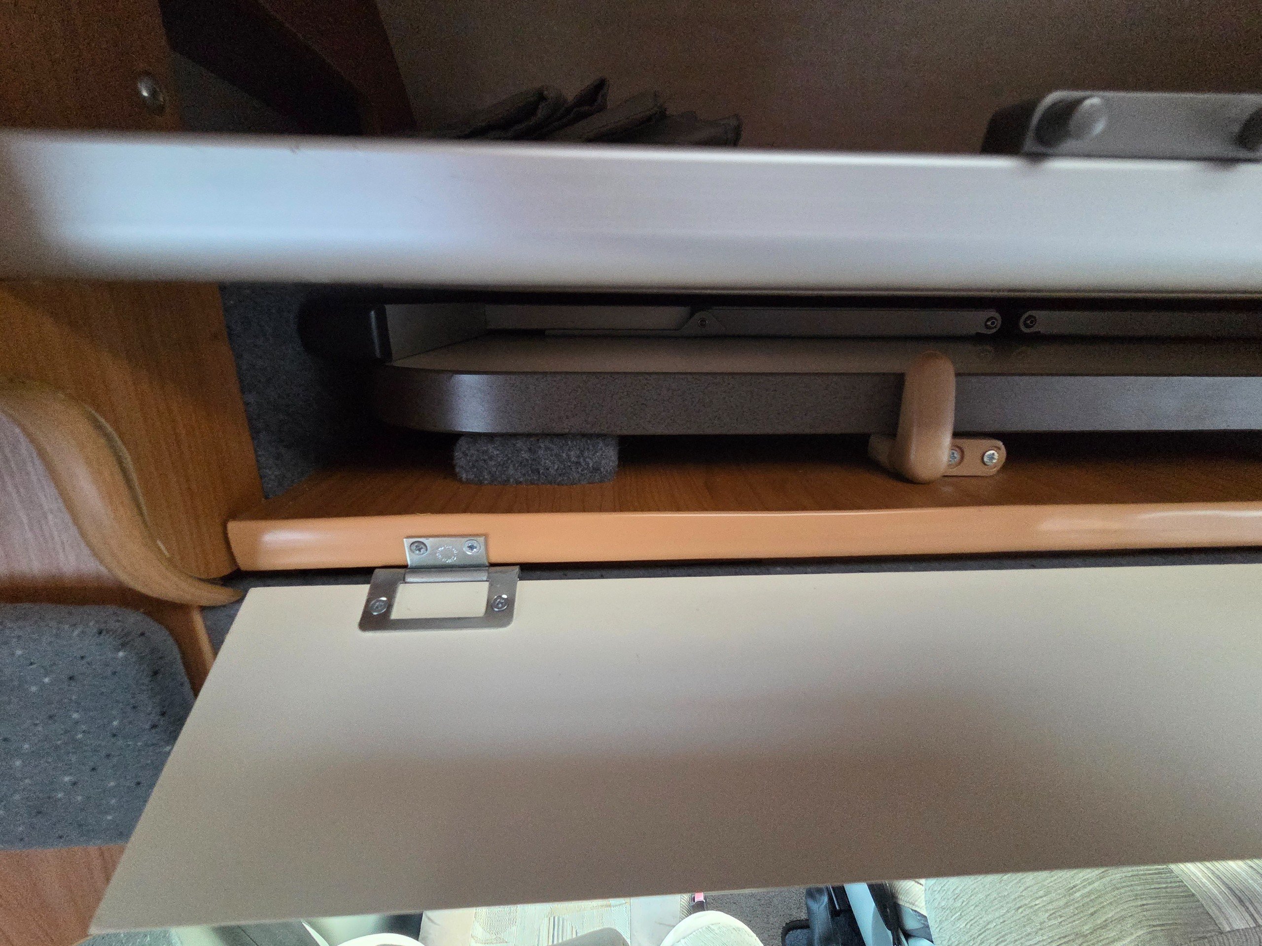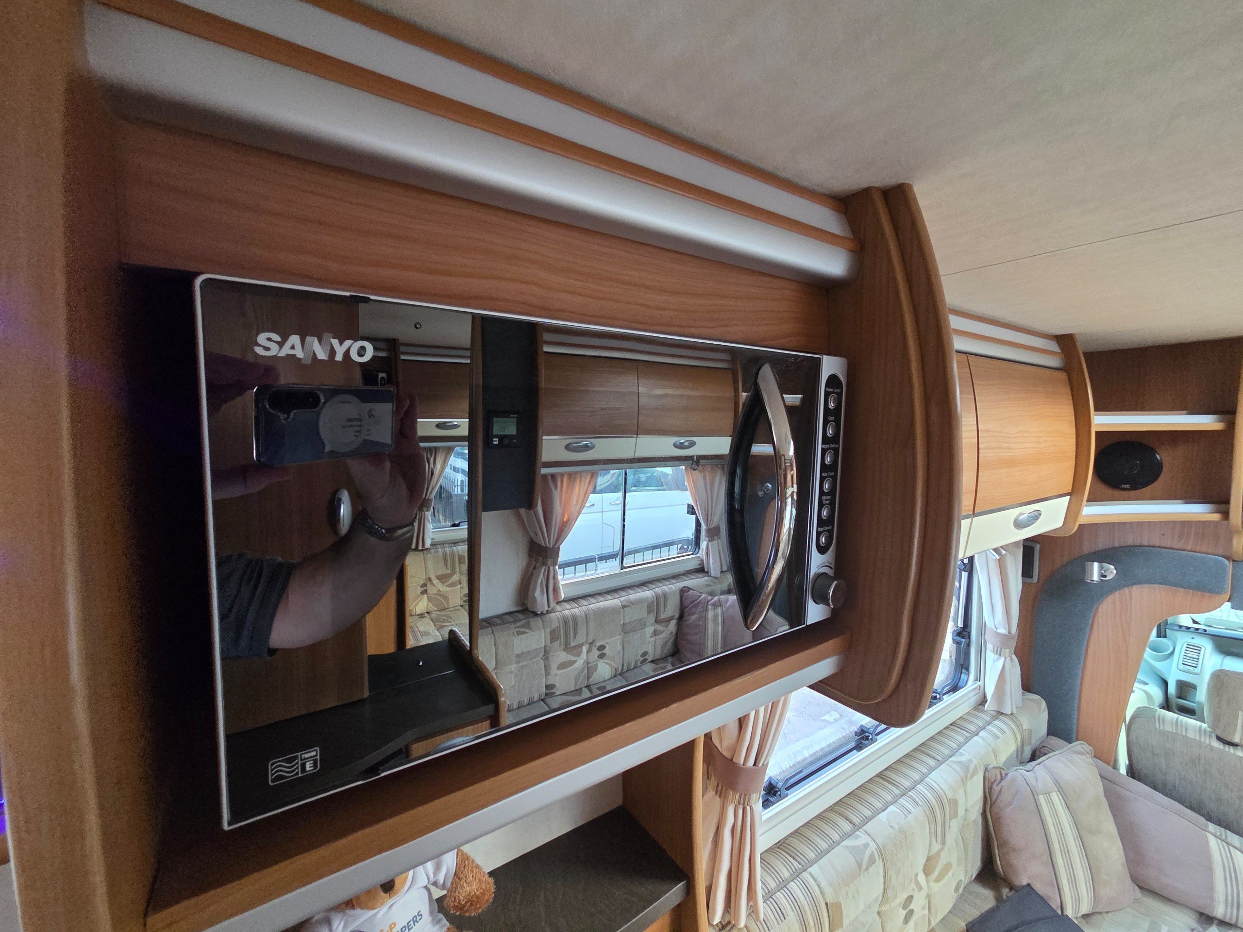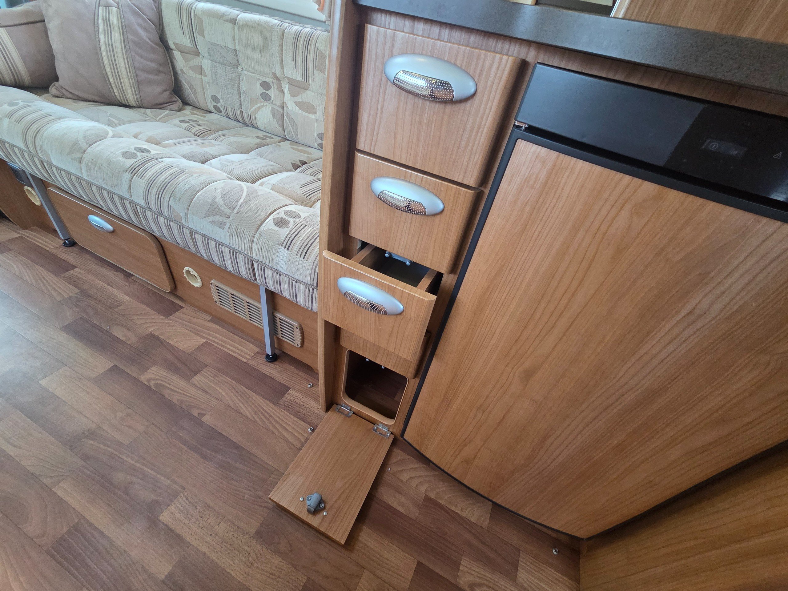 The lounge is to the front of the motorhome this is made up by way of 2 side bench settees these make into 2 single beds or a very large double. You will find storage over head in the wrap around storage cupboards and over the cab in the larger locker. There is even a space for the stand alone table over the cab that has its own cupboard.