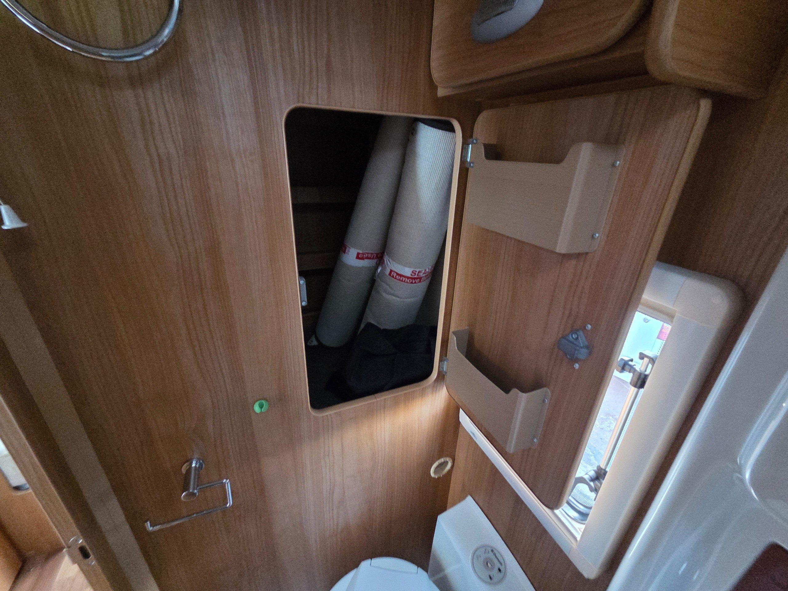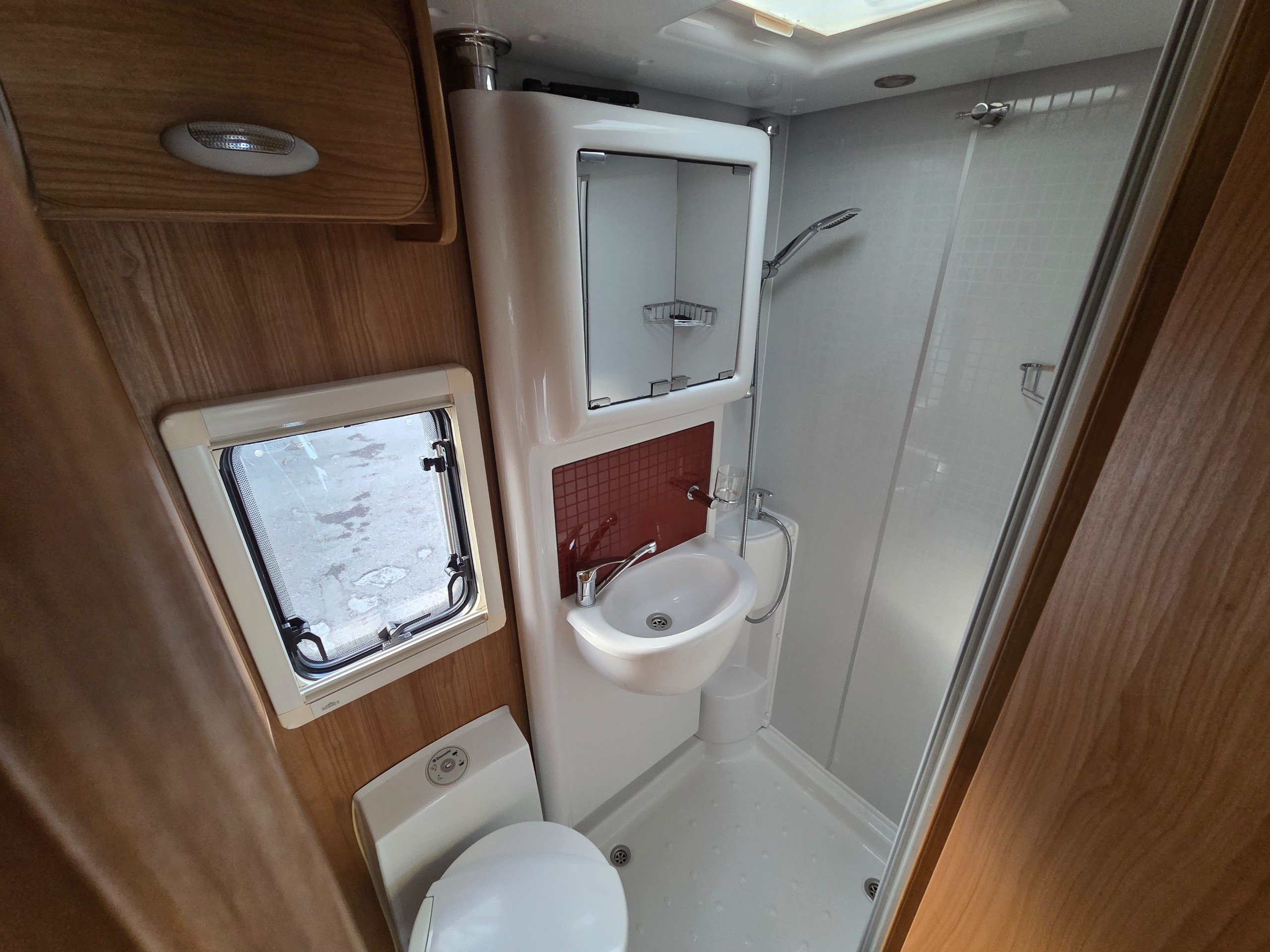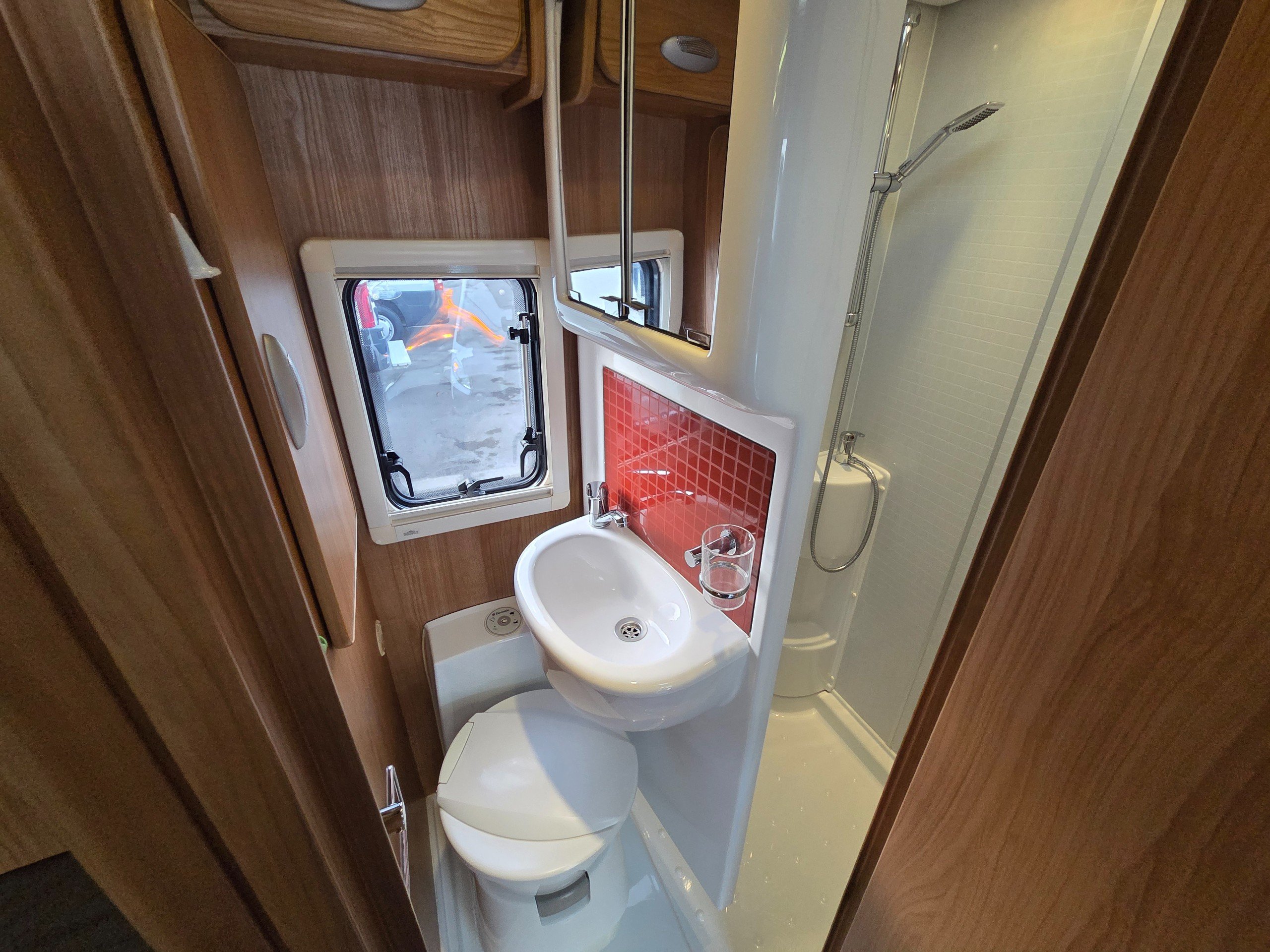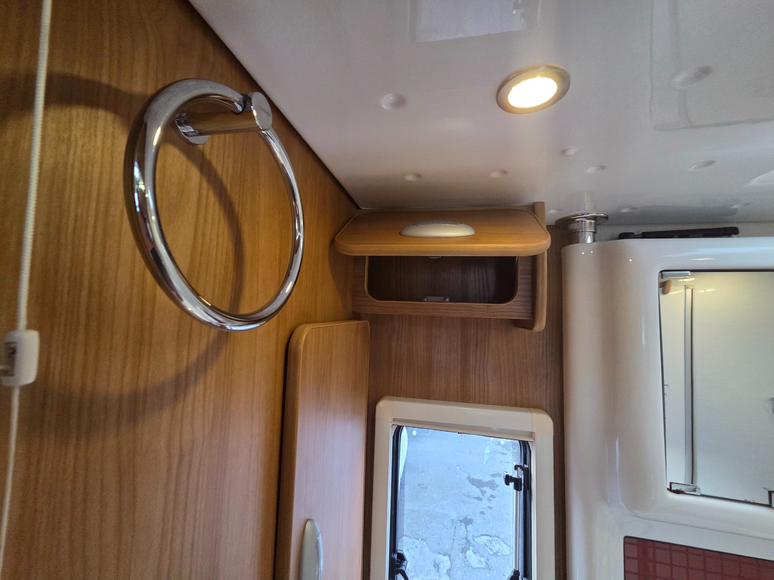 The washroom is a great size with a a swivel sink panel meaning the toilet doesn't get wet when using the shower and the shower tray is very large for a motorhome too. They have still managed to incorporate storage for the toiletries and vanity mirror, rooflight and window for great ventilation. electric flushing swivel toilet and towel holder.