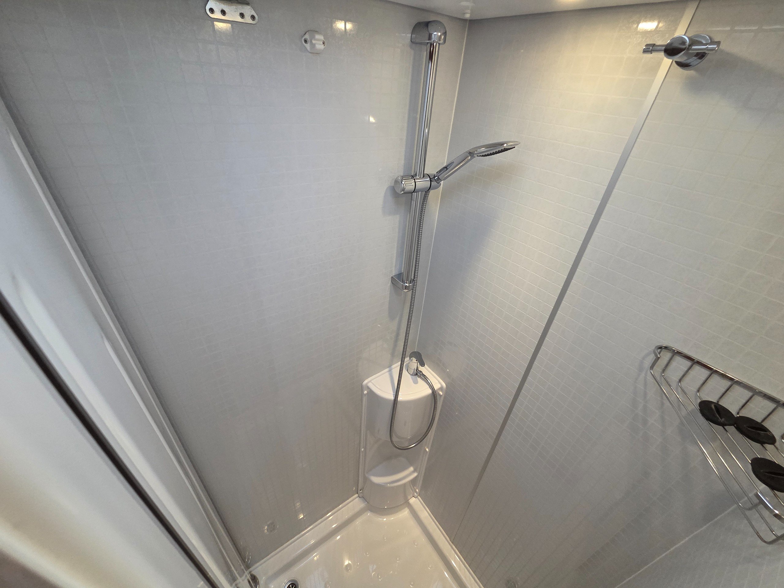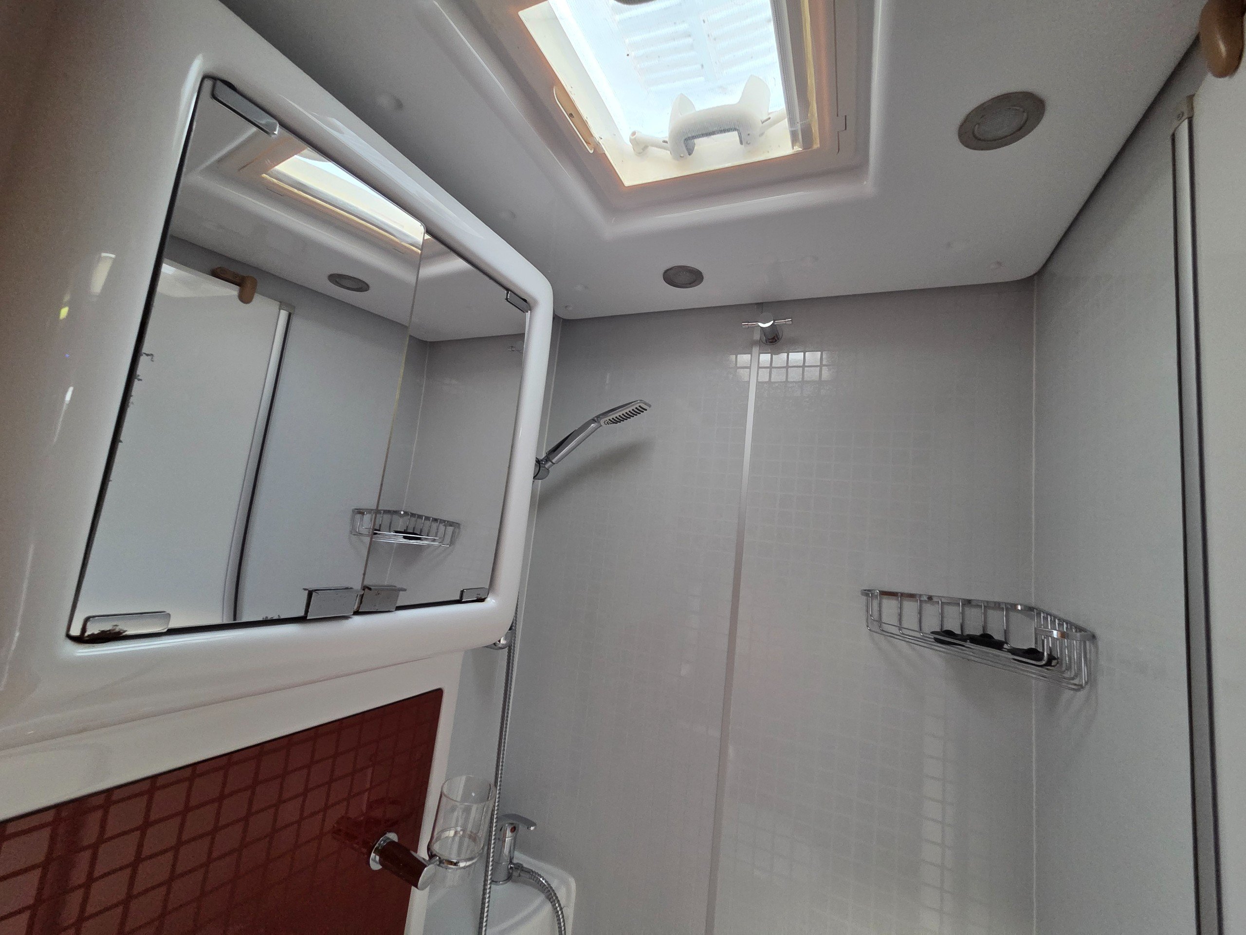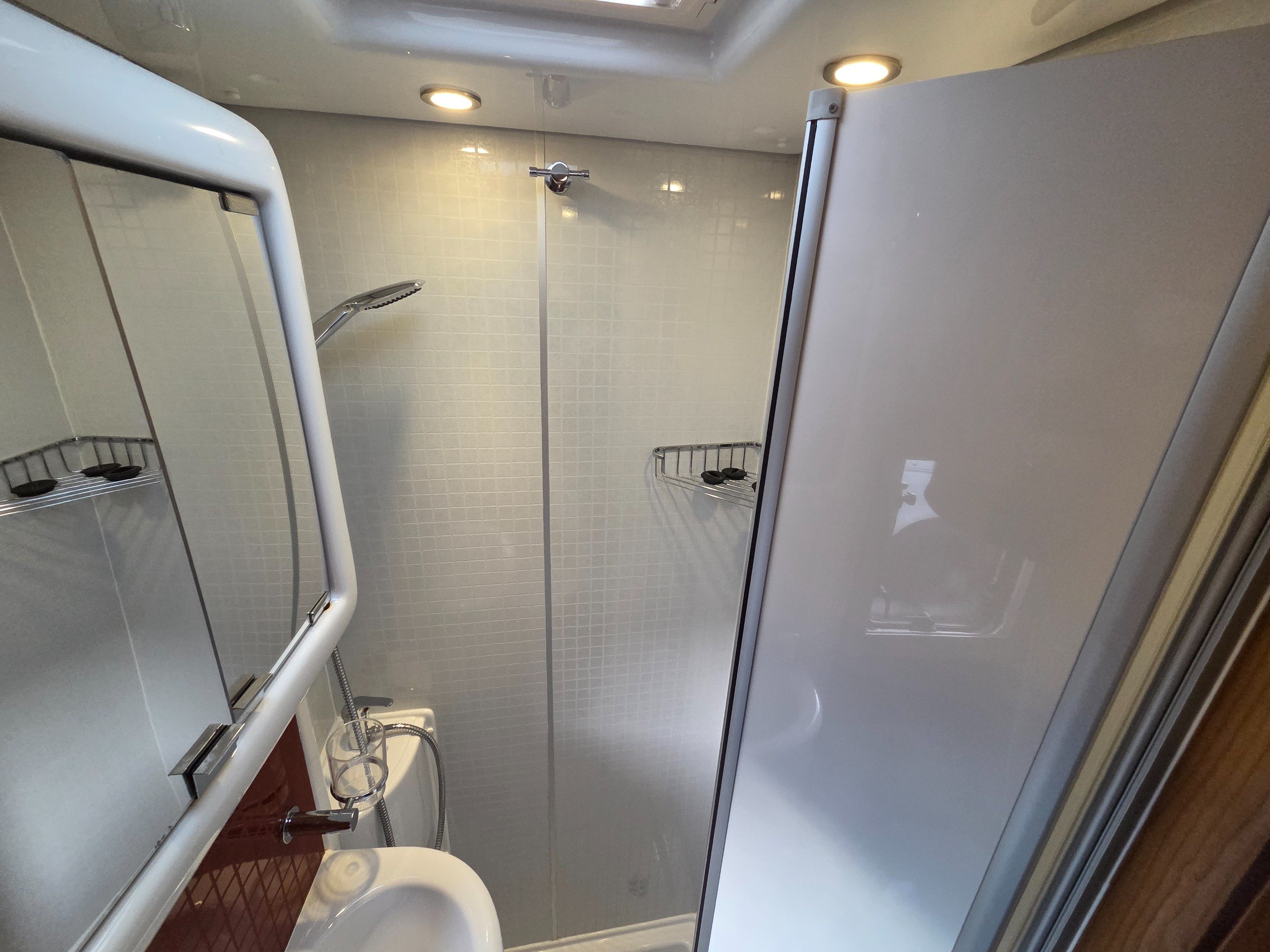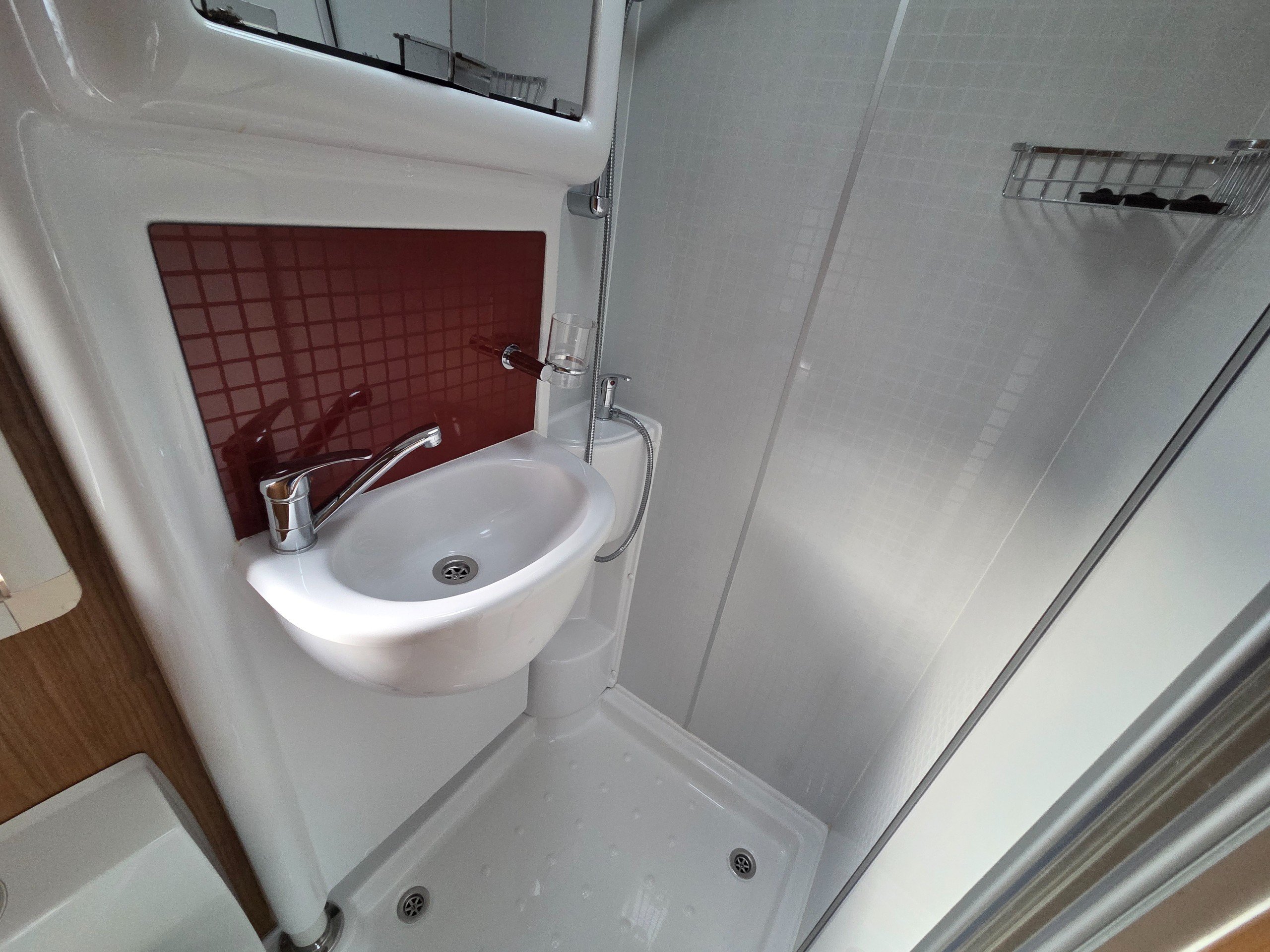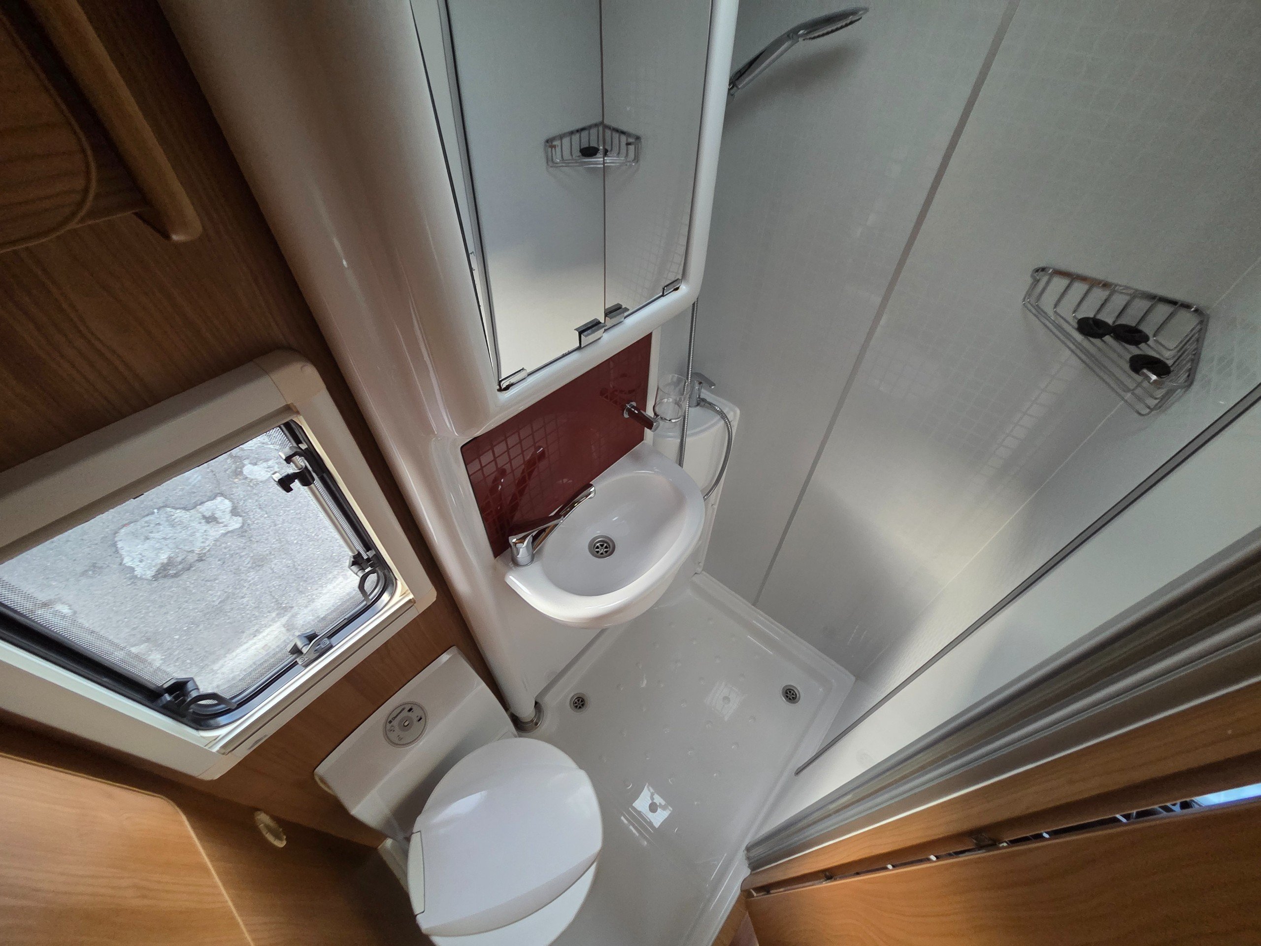 The washroom is a great size with a a swivel sink panel meaning the toilet doesn't get wet when using the shower and the shower tray is very large for a motorhome too. They have still managed to incorporate storage for the toiletries and vanity mirror, rooflight and window for great ventilation. electric flushing swivel toilet and towel holder.