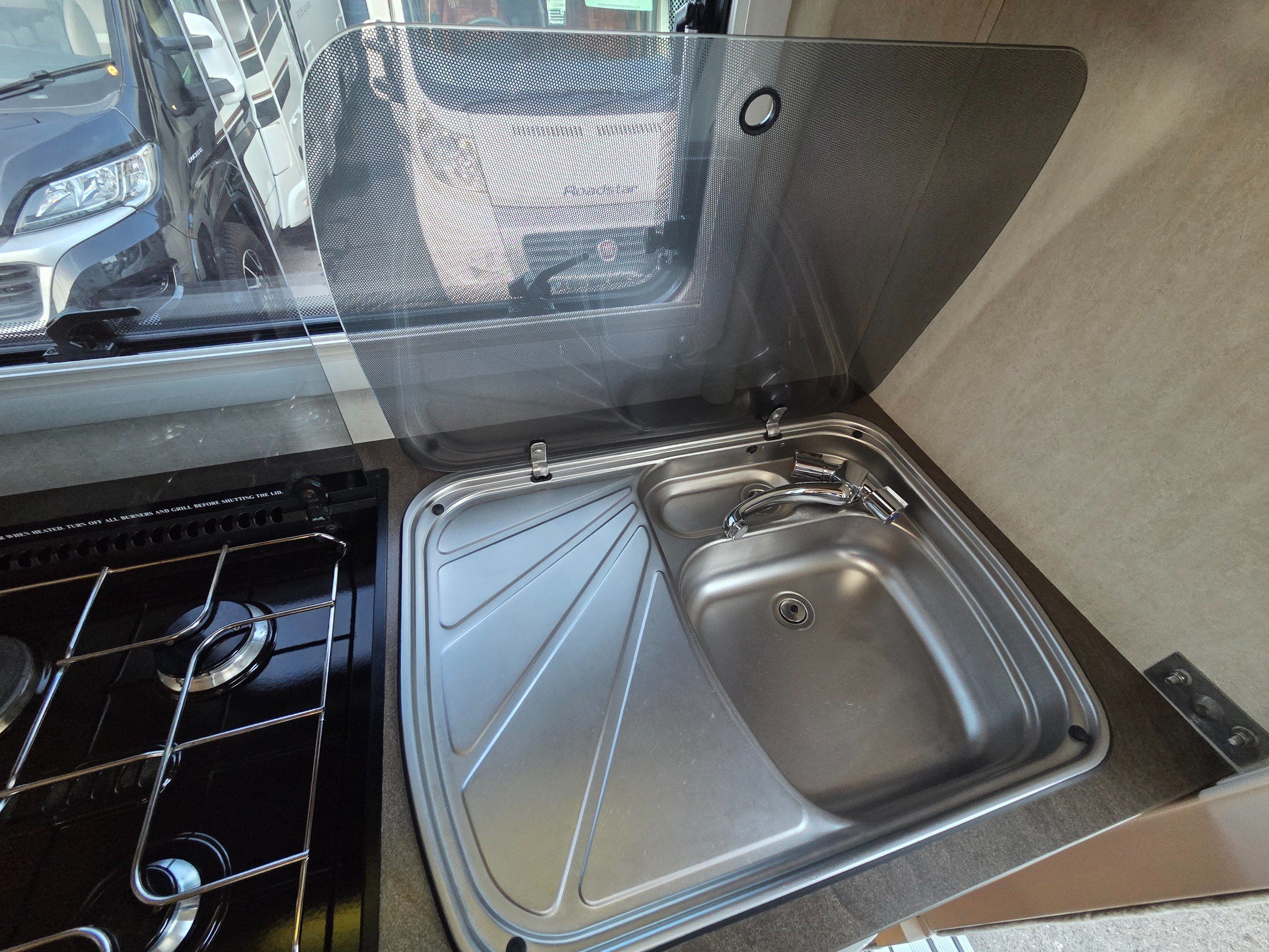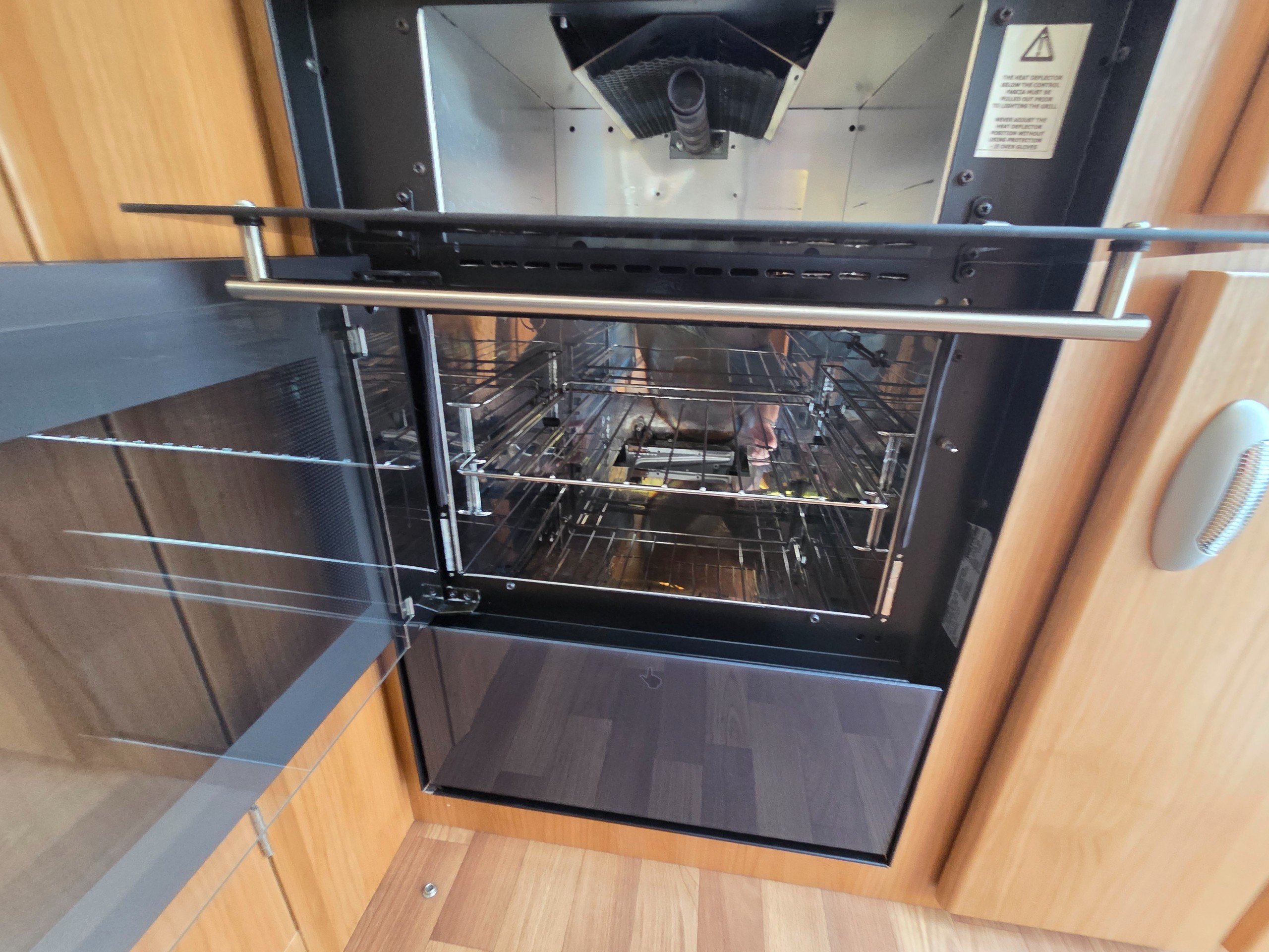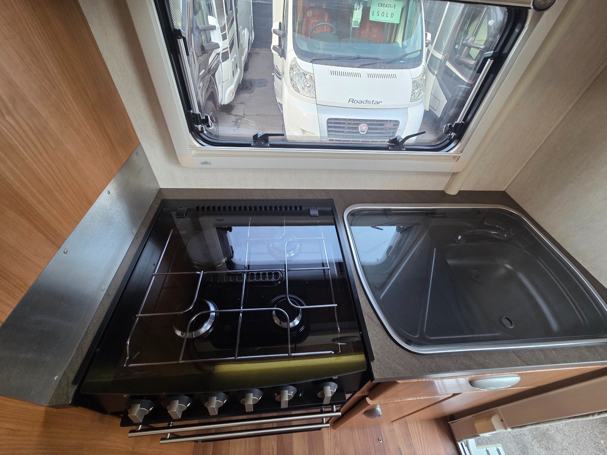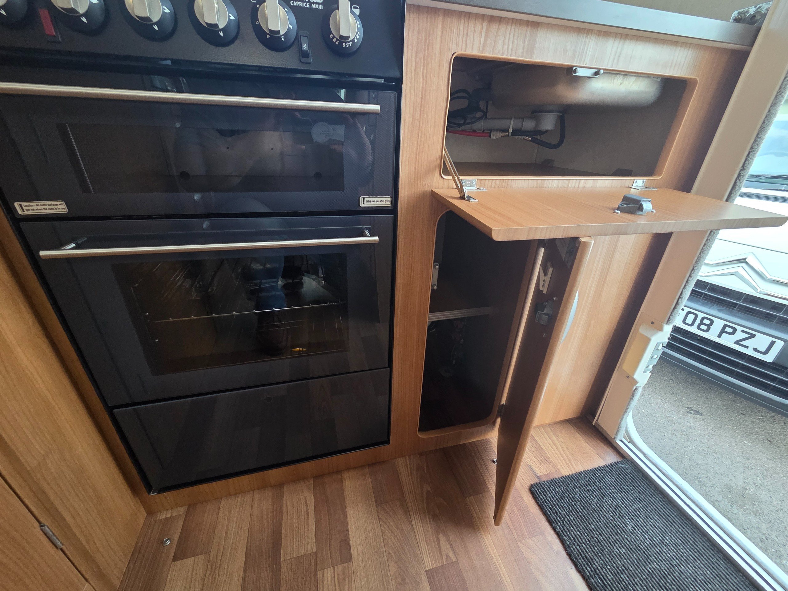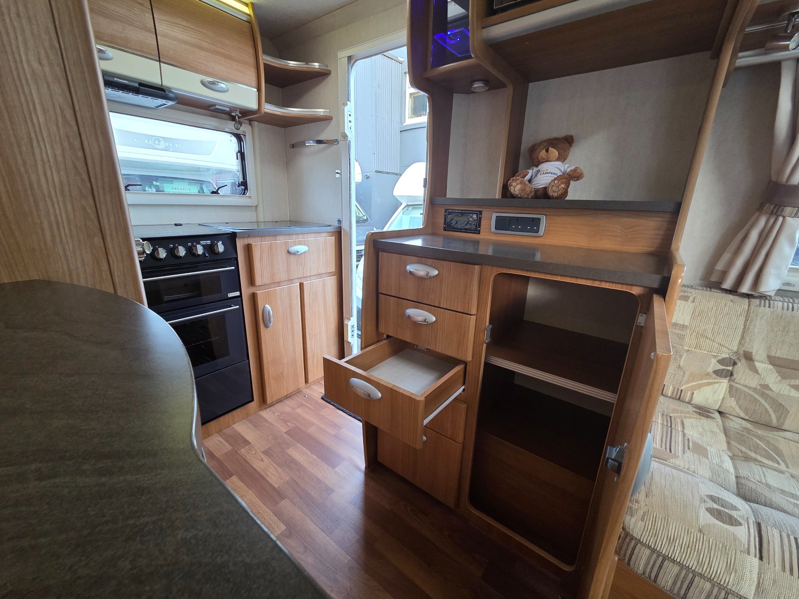 The rear kitchen has a 3 way fridge with freezer compartment, sink with glass lid and built in drainer, full cooker consisting of 3 gas burner hob, 1 electric hob, separate oven and grill, extractor fan over the cooker, microwave, ample storage for the groceries and space on the side for an air fryer with 2 mains sockets available too, cocktail cabinet and storage drawers and extra work surface below the microwave for plating up etc.