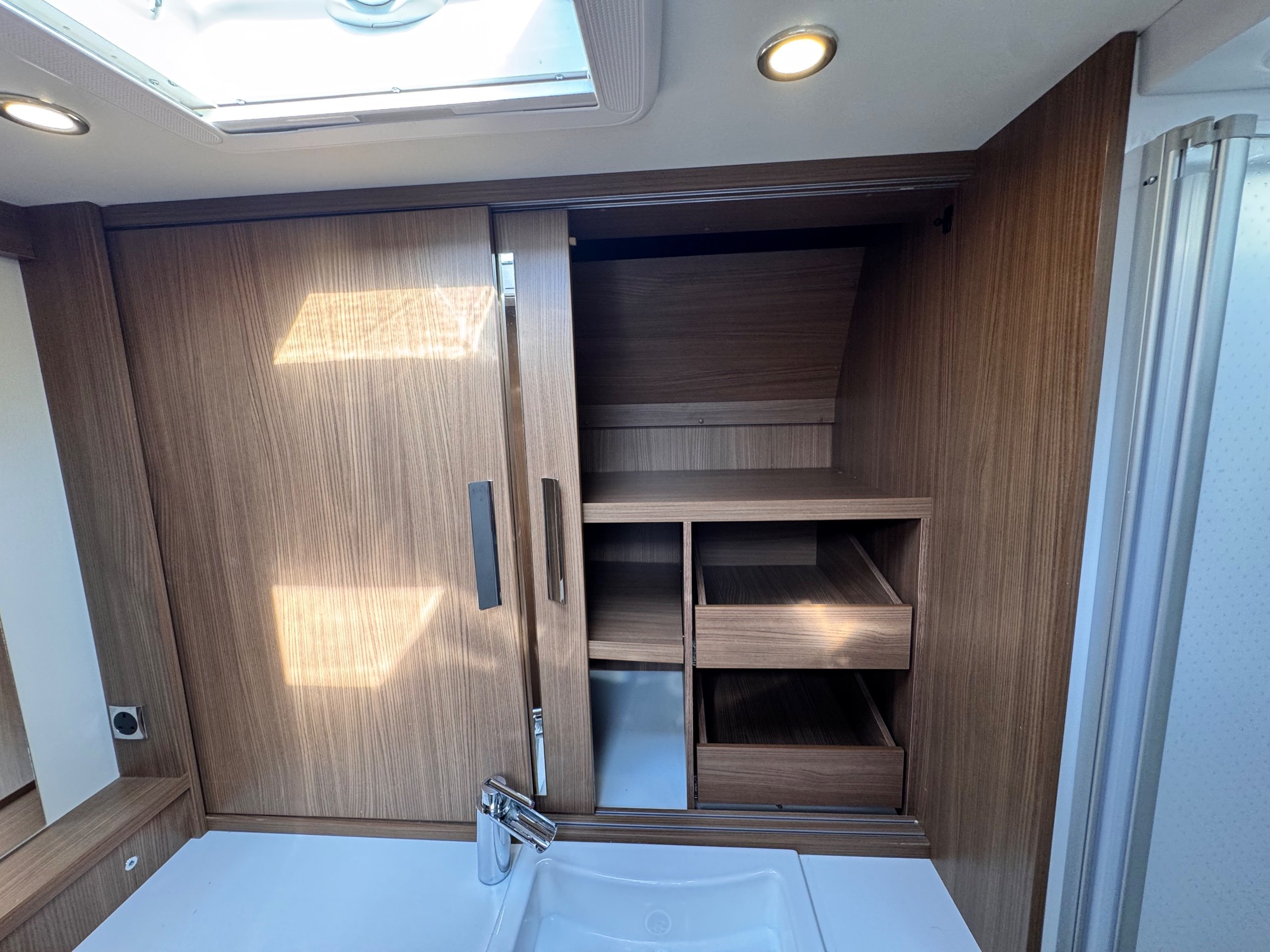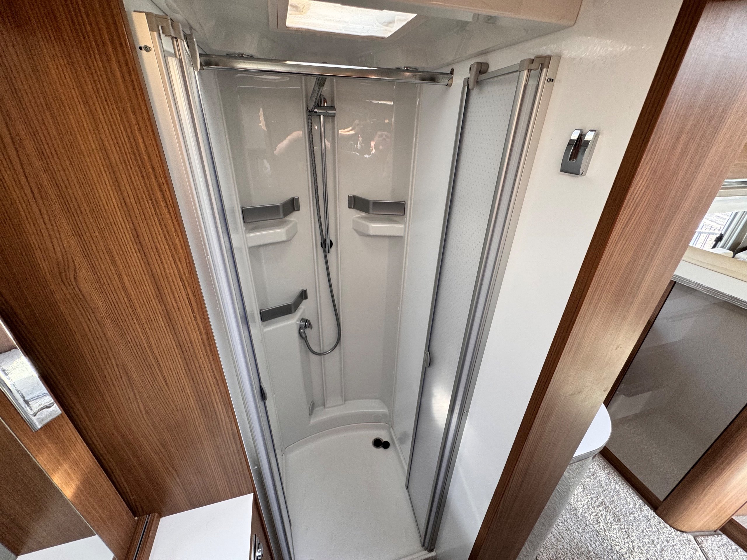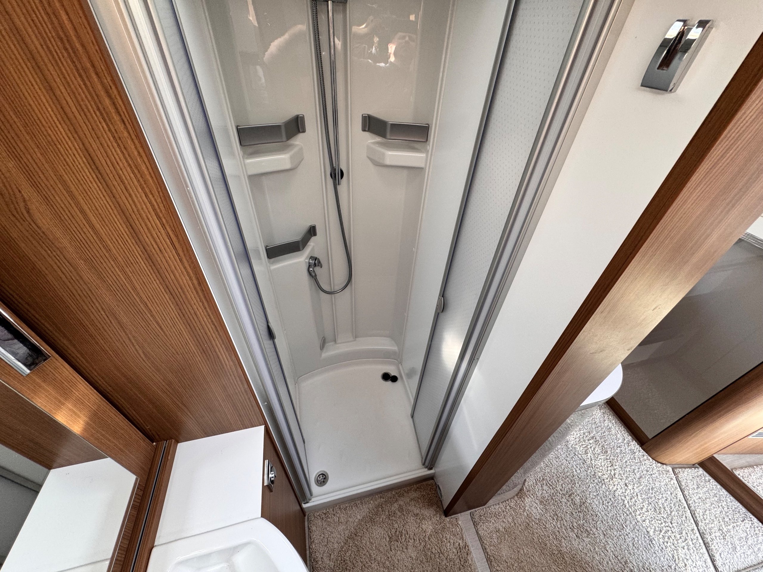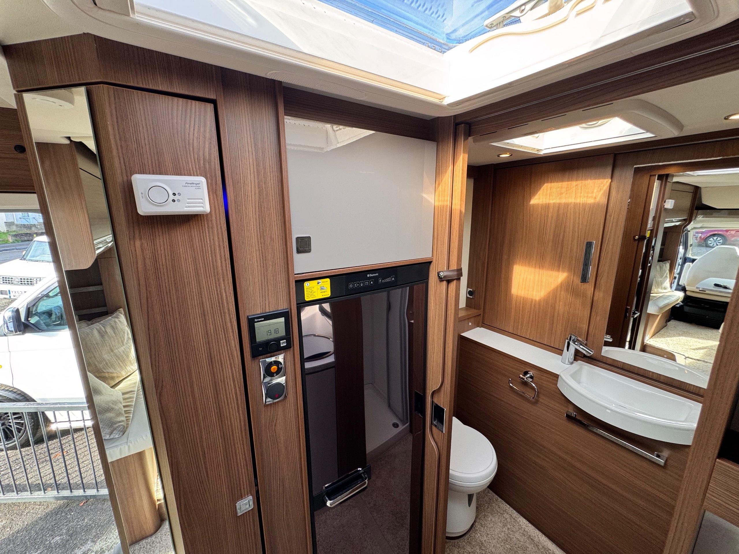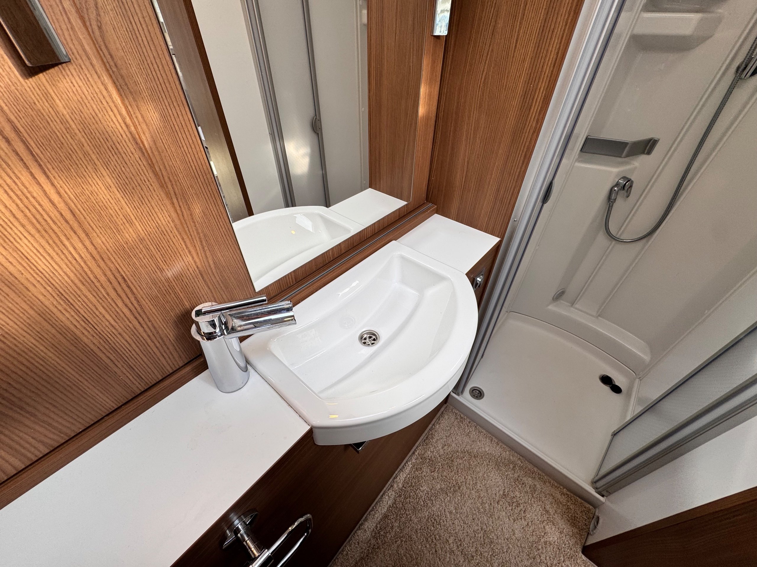 The general layout of this particular model is great for many different people, with its huge lounge area it really makes for a comfortable place to be. The massive electric drop down bed allows you to effortlessly make up 2 berth in seconds at the touch of a button (literally). The kitchen area is equally impressive with its large 3 burner hob (with ignition), Smev oven/grill, hot and cold tap/sink, extra large Dometic 3-way fridge/freezer with Automatic function, bright LED lighting throughout, and more storage space than you could ever need. The bathroom is situated to the rear of the vehicle and gives you a huge amount of space to get around comfortably. You will also notice the full size mirrow, sliding doors into the large wardrobe and the fully seperate shower.