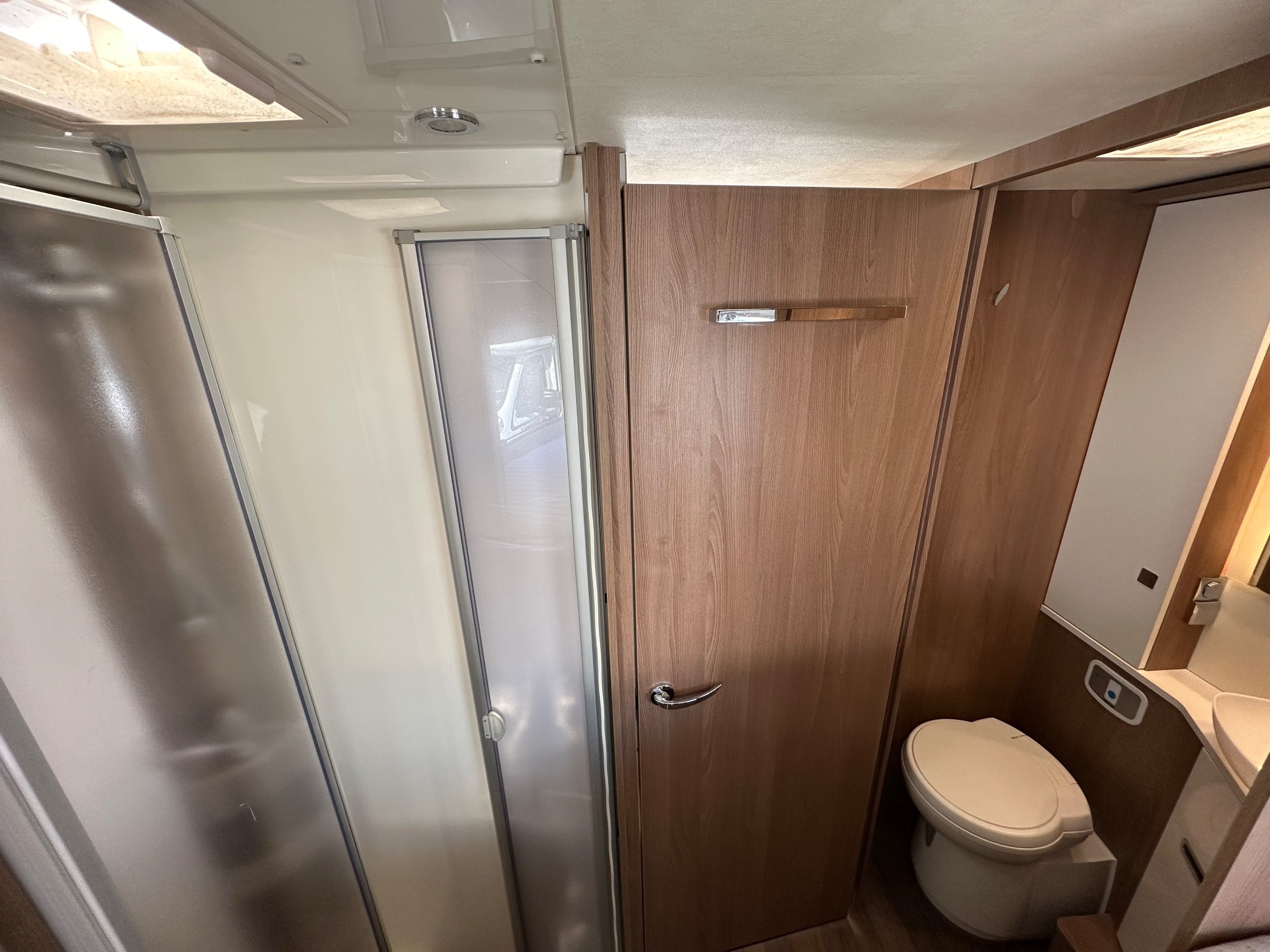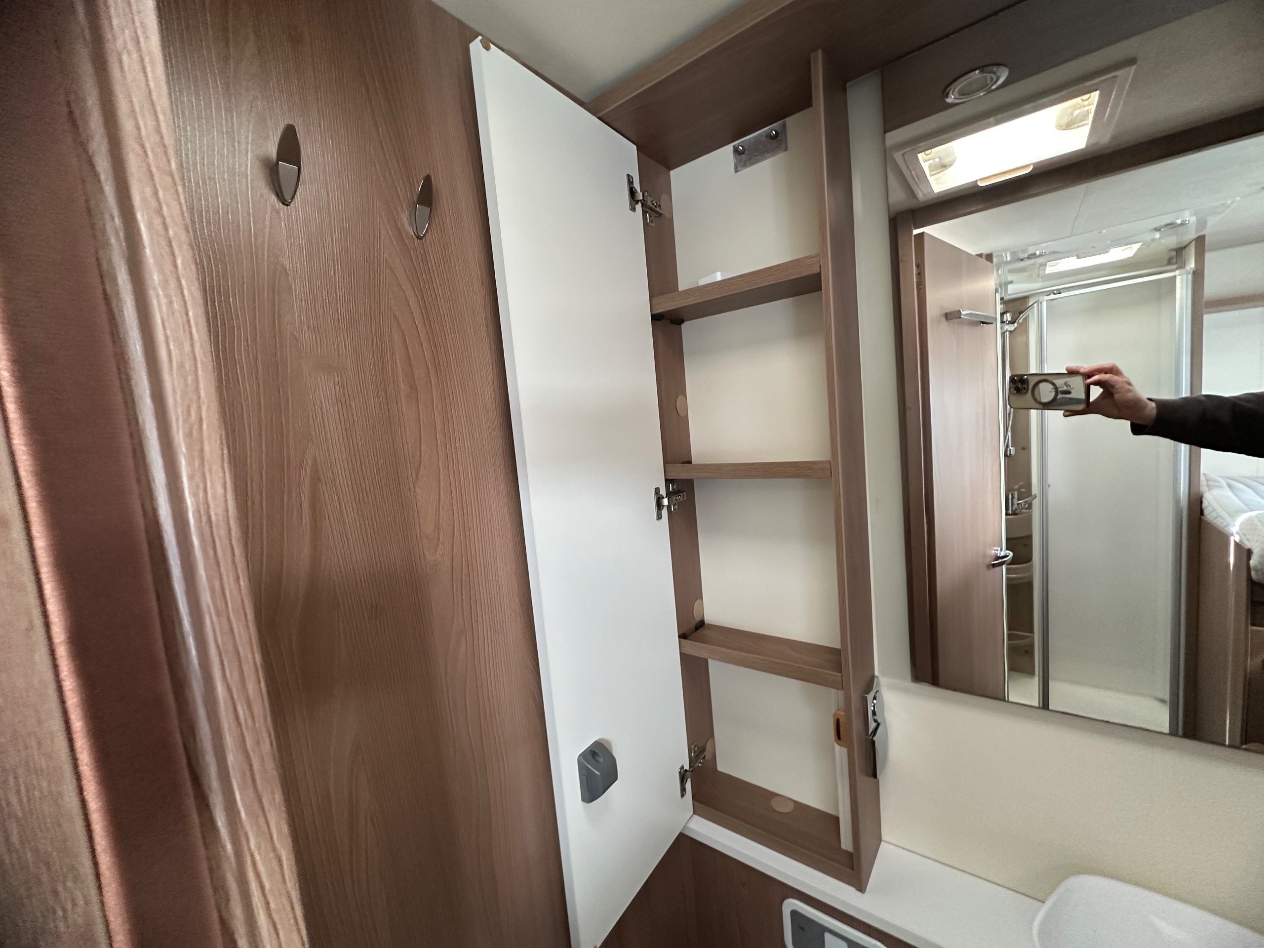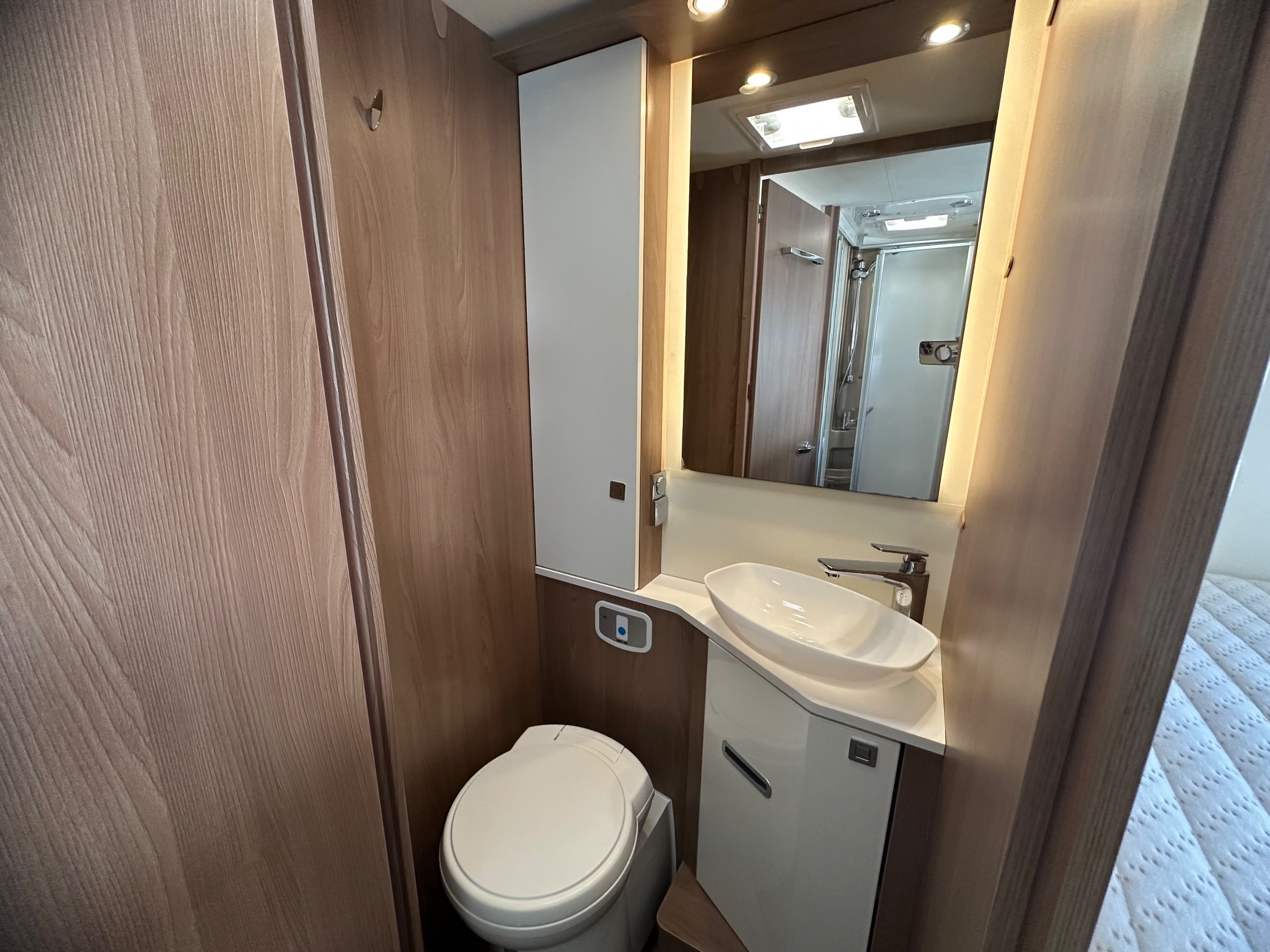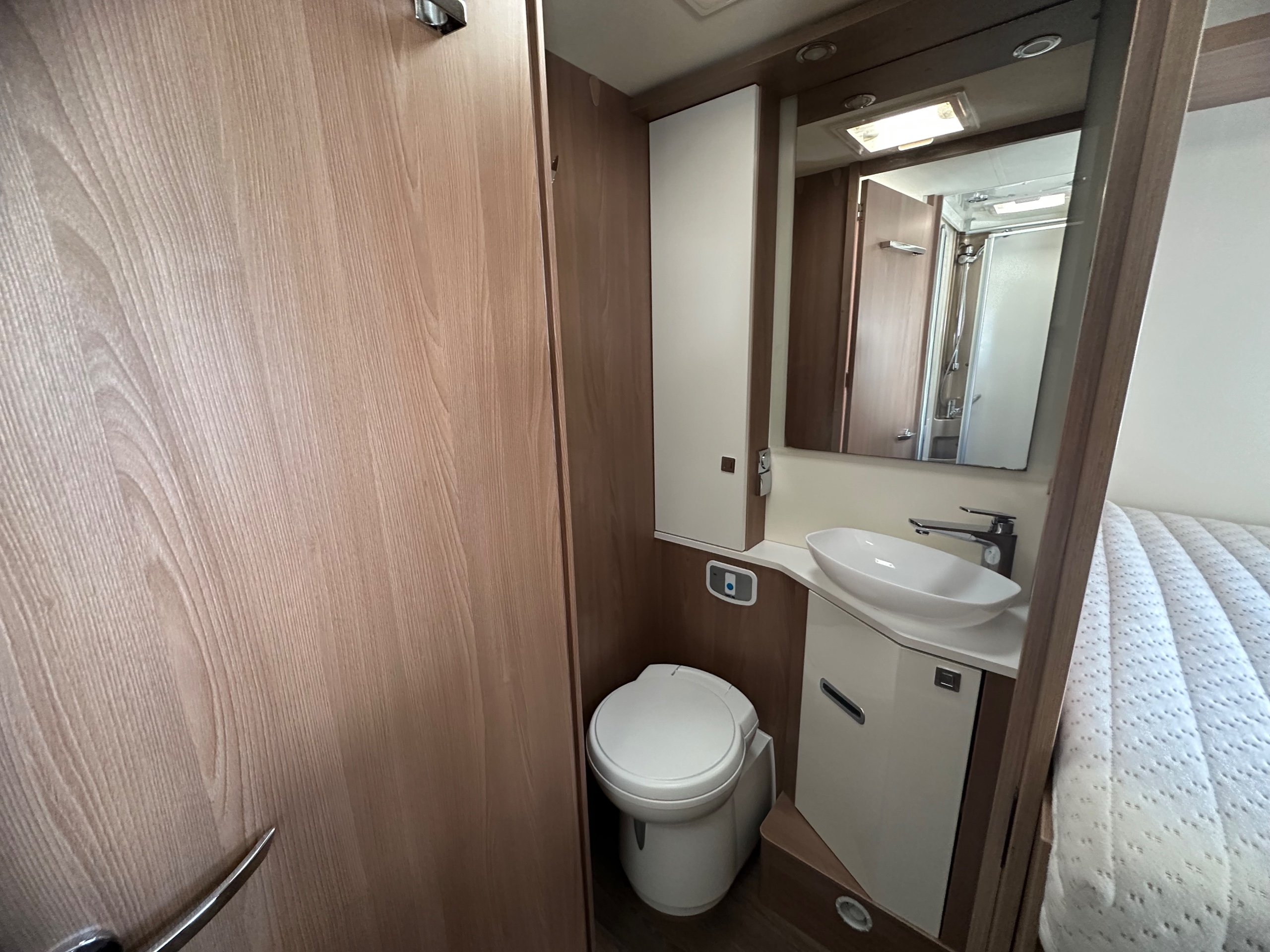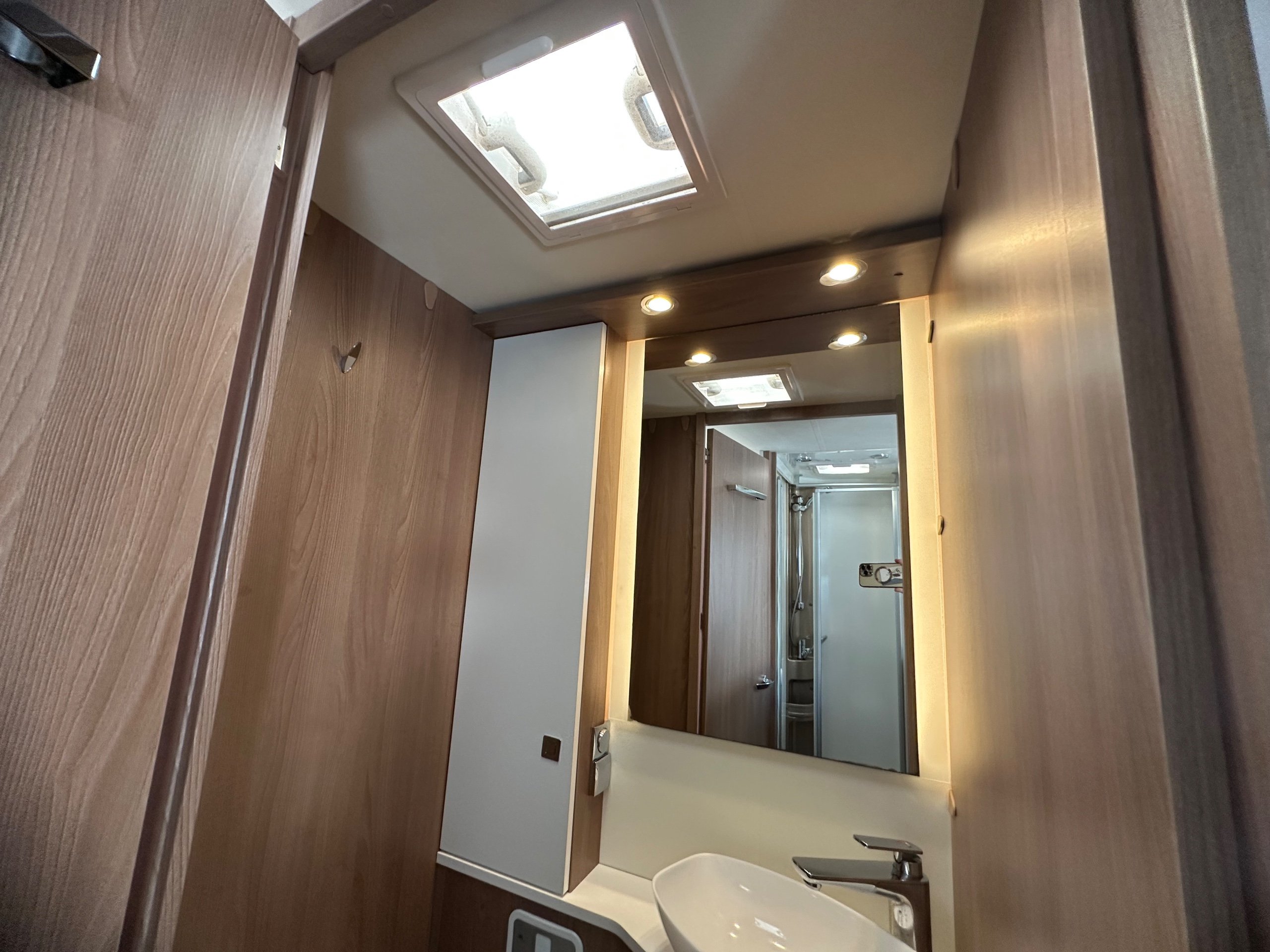 The washroom is to the foot of the bed with the shower being to the near side this has a shower tray plinth so you actually get to use some of this area as general walk way when not in use which is genius. The shower itself has a shower screen and riser as well a place to hang your coat or wetsuit when needed along with a rooflight got great ventilation. Opposite is the electric flushing toilet which also has the hand basin, vanity mirror, low and high toiletries storage and again a roof light for extra ventialation with the toilet door closed the washroom becomes an ensuite to the bedroom a nice touch for privacy.