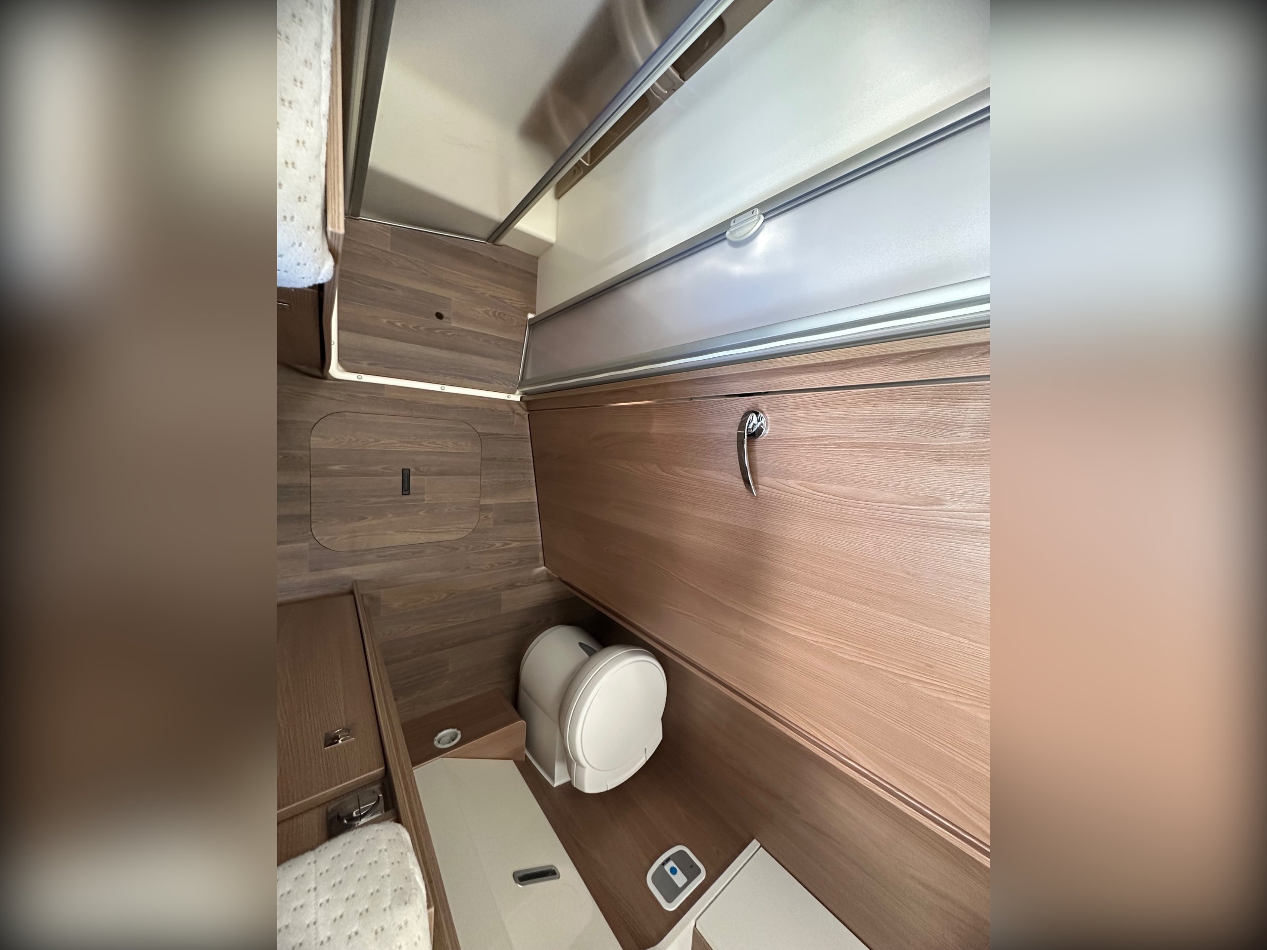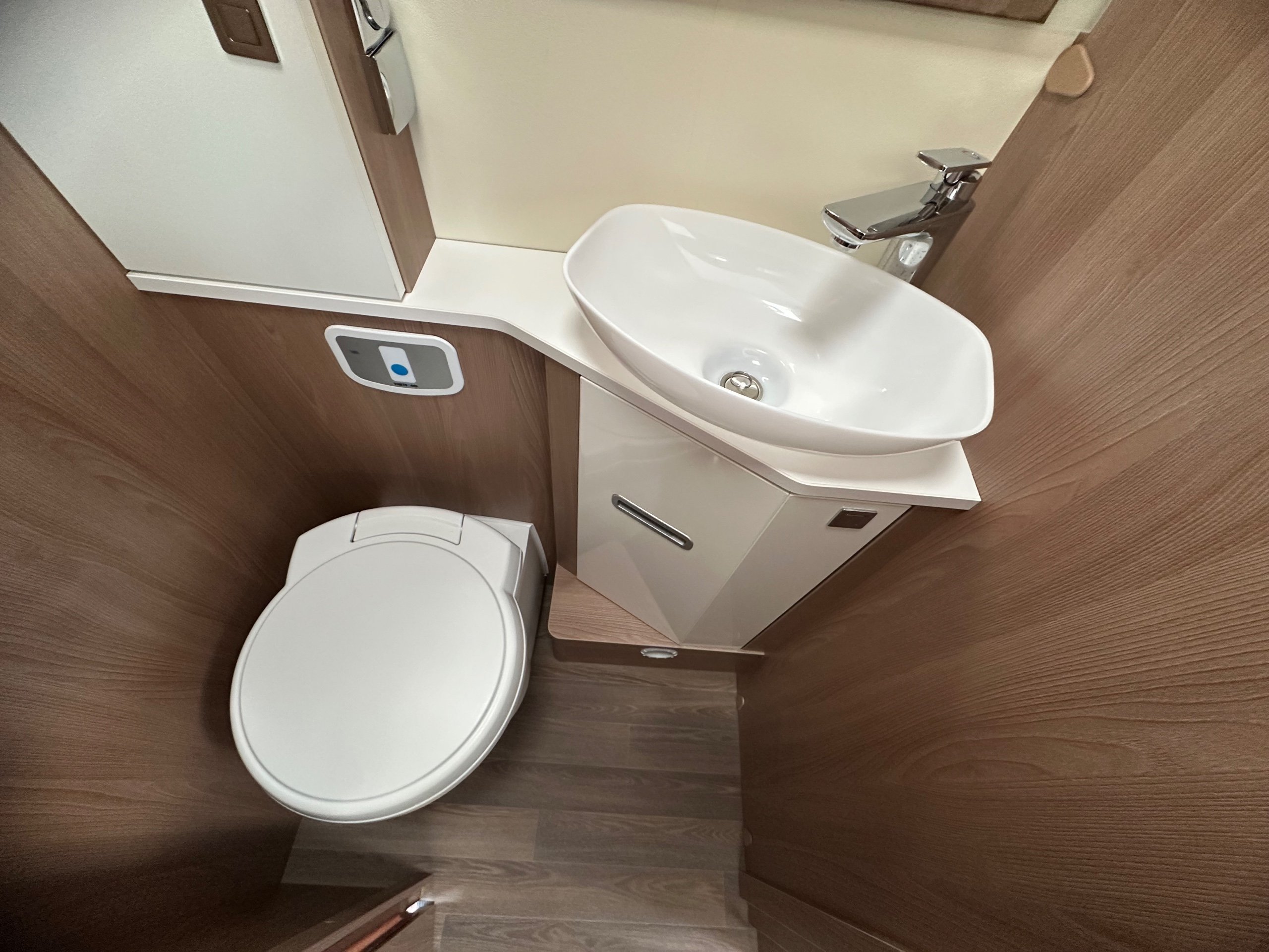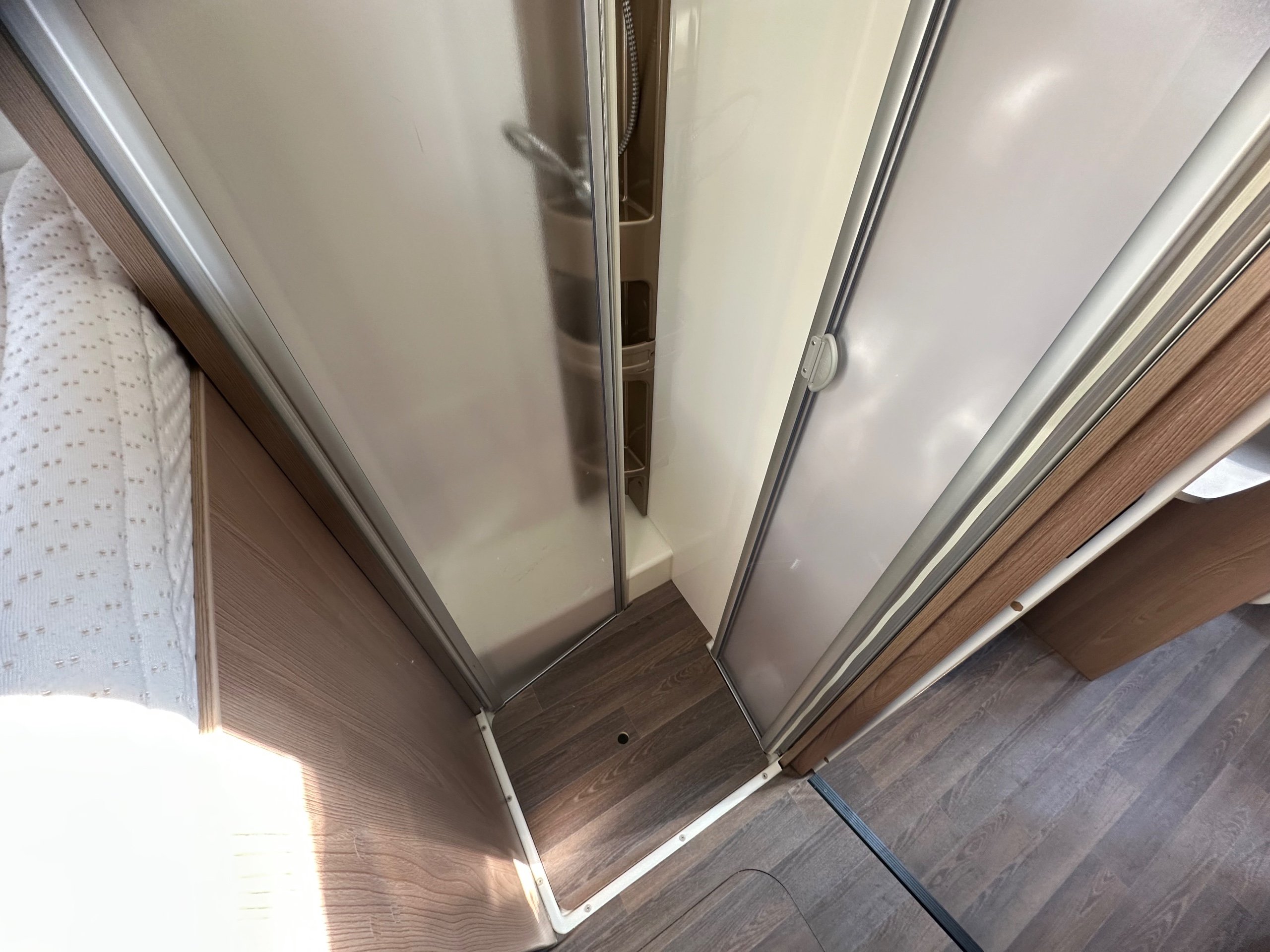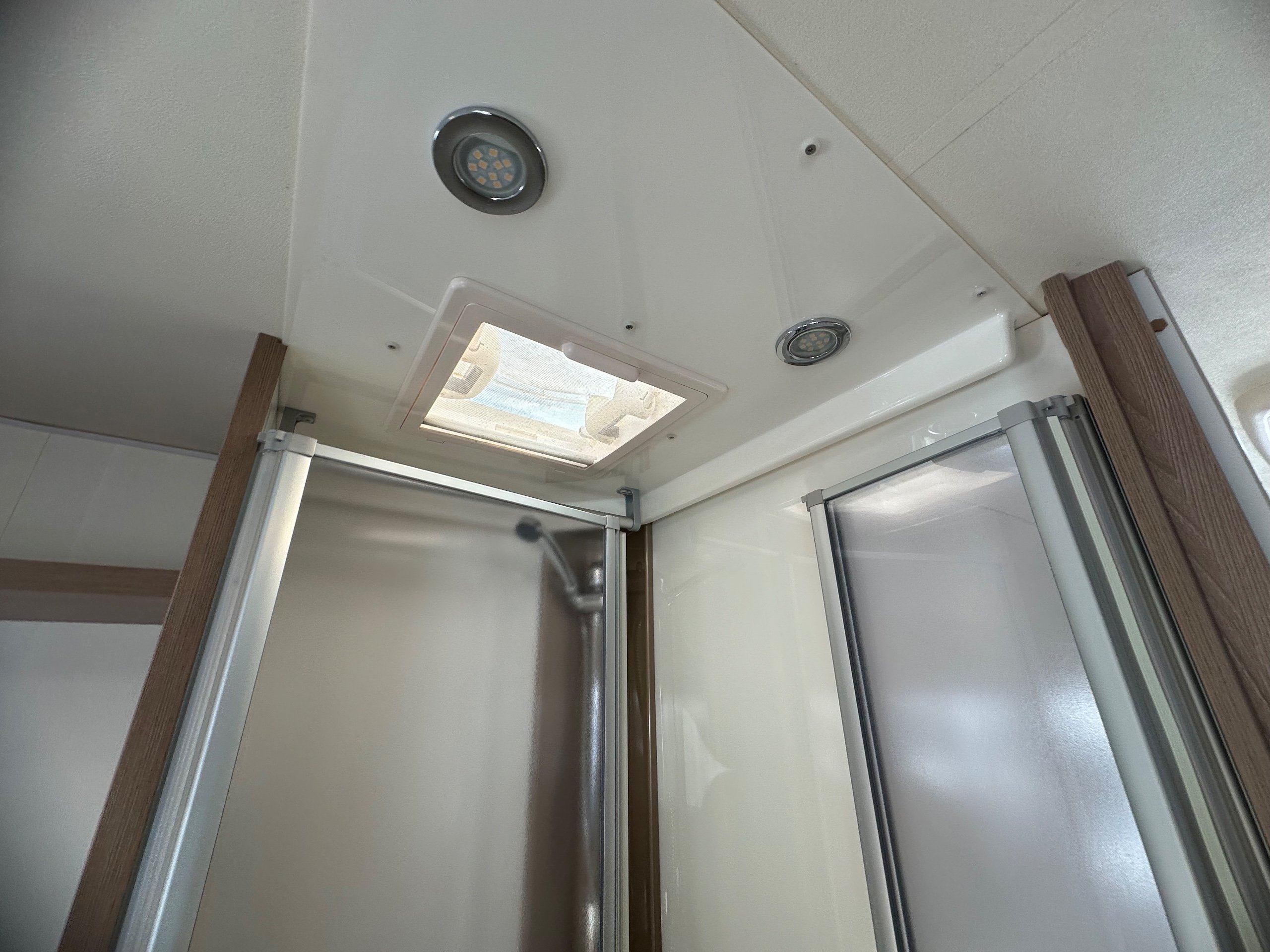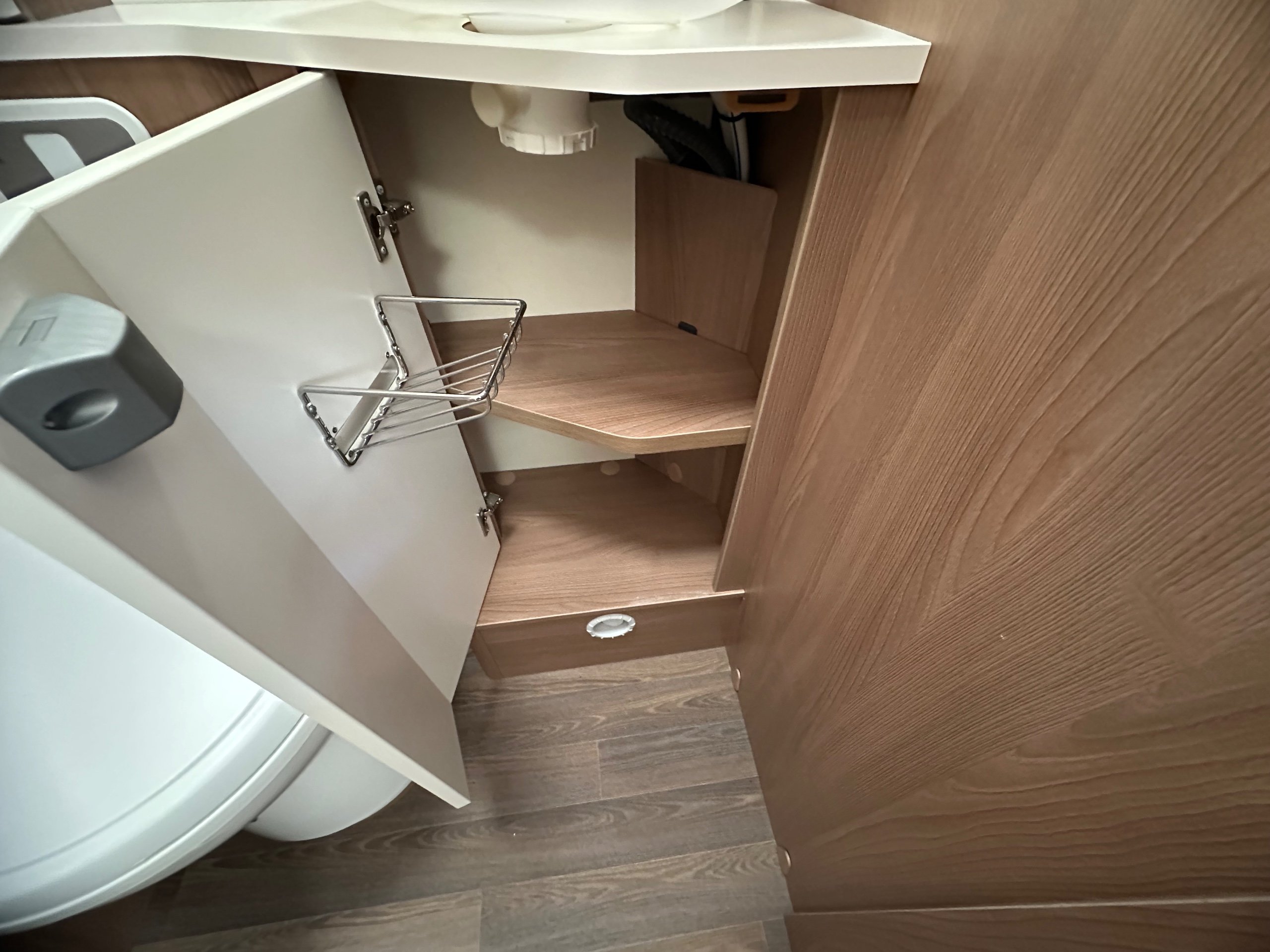 The washroom is to the foot of the bed with the shower being to the near side this has a shower tray plinth so you actually get to use some of this area as general walk way when not in use which is genius. The shower itself has a shower screen and riser as well a place to hang your coat or wetsuit when needed along with a rooflight got great ventilation. Opposite is the electric flushing toilet which also has the hand basin, vanity mirror, low and high toiletries storage and again a roof light for extra ventialation with the toilet door closed the washroom becomes an ensuite to the bedroom a nice touch for privacy.