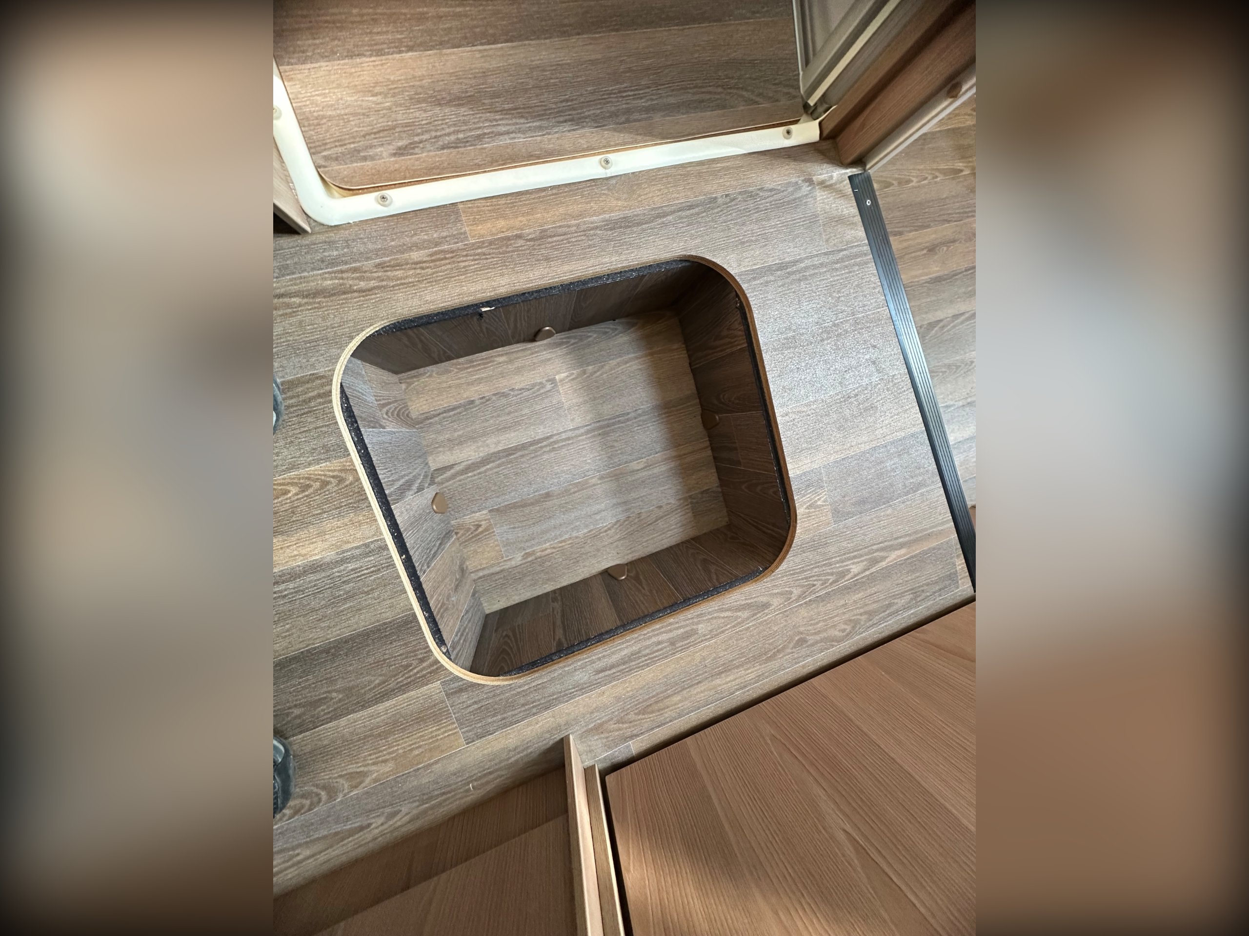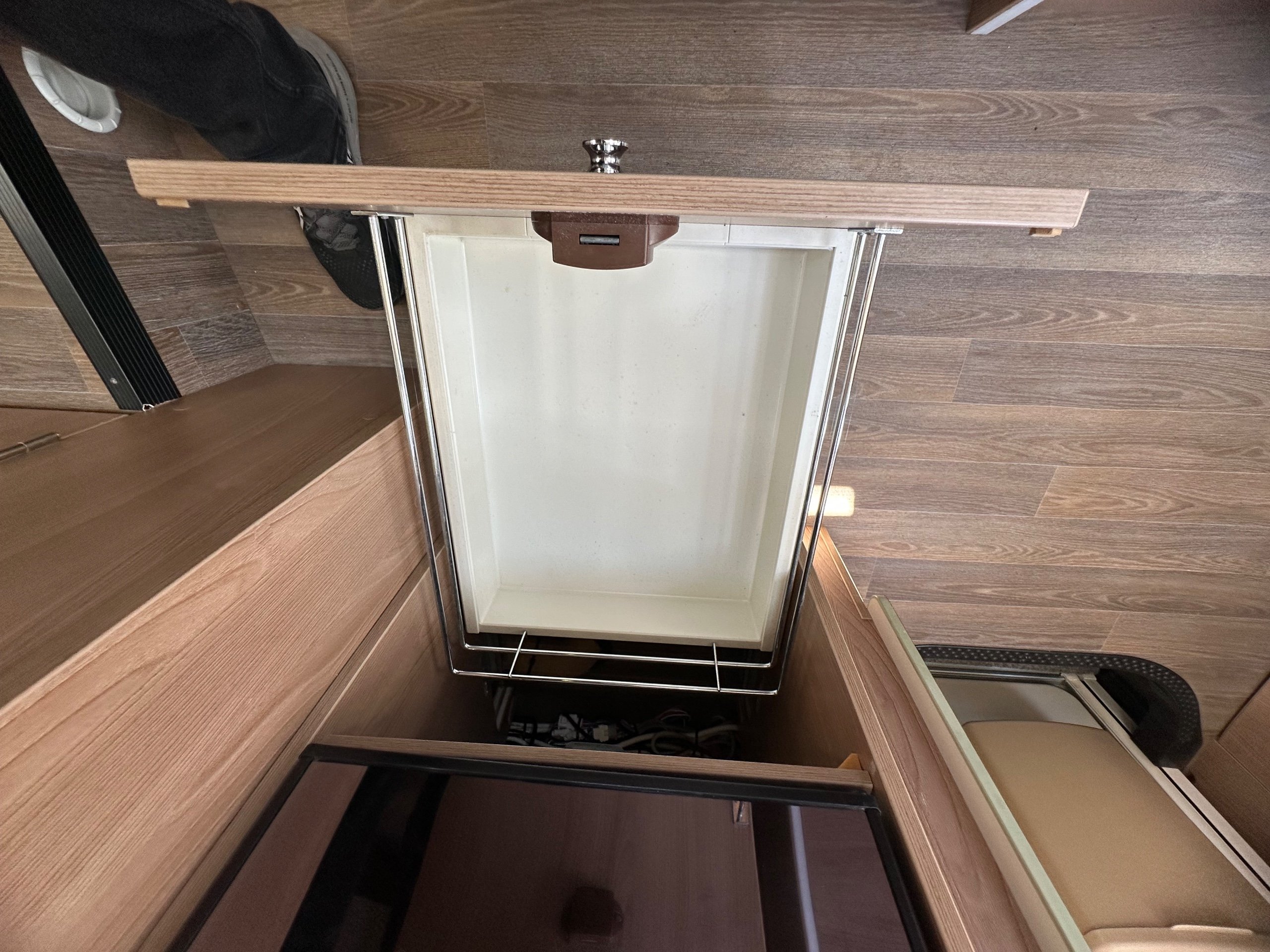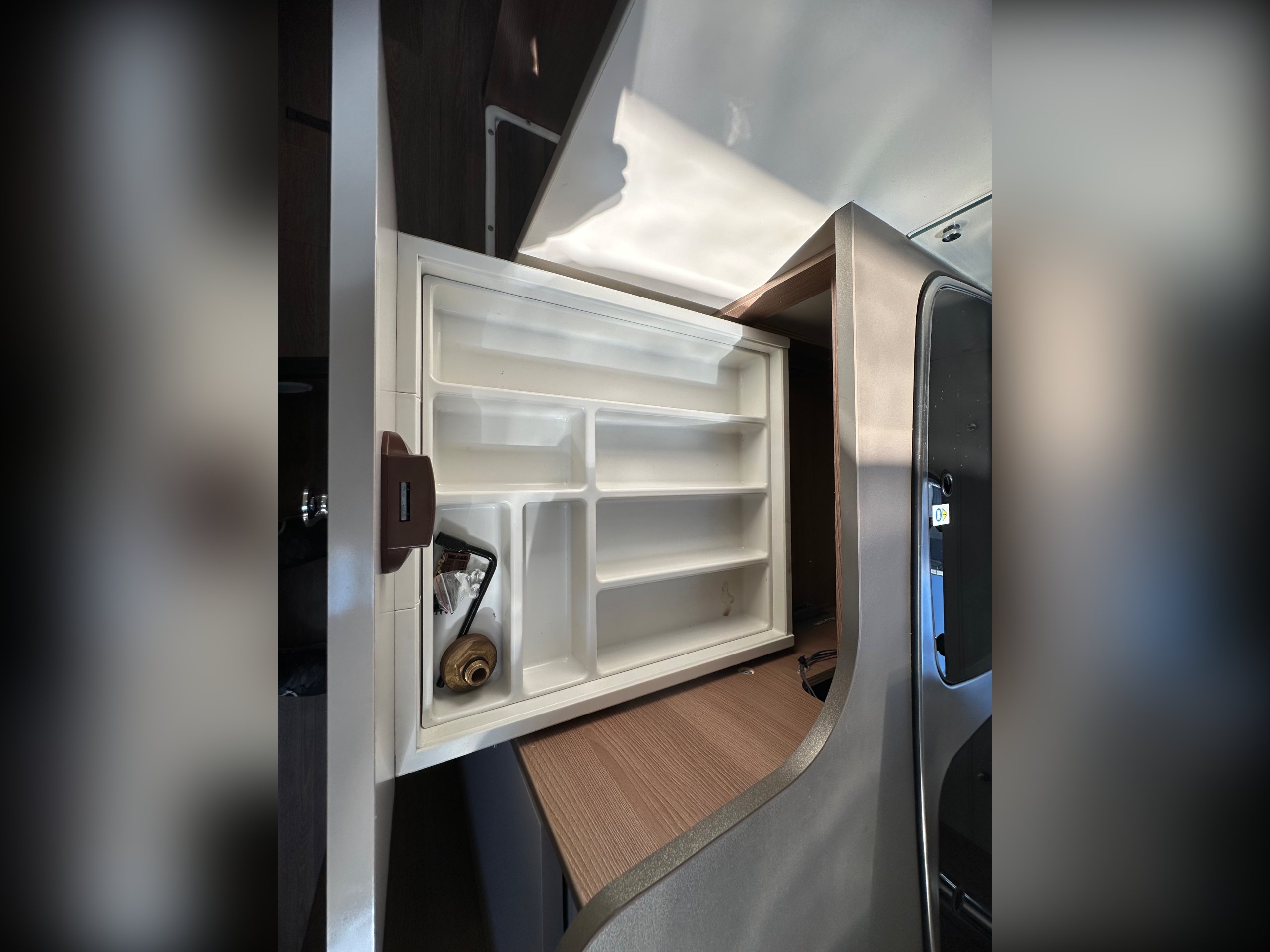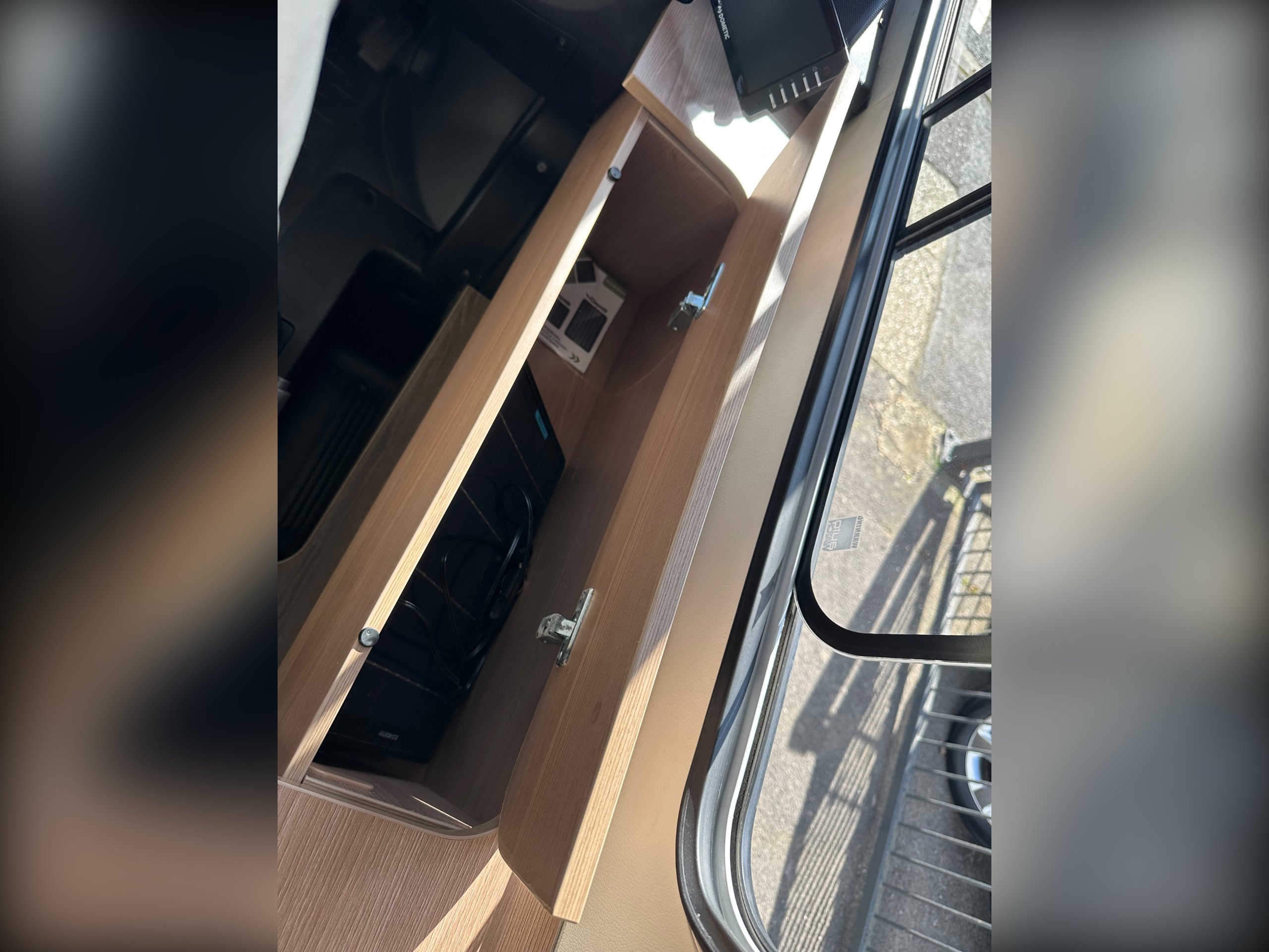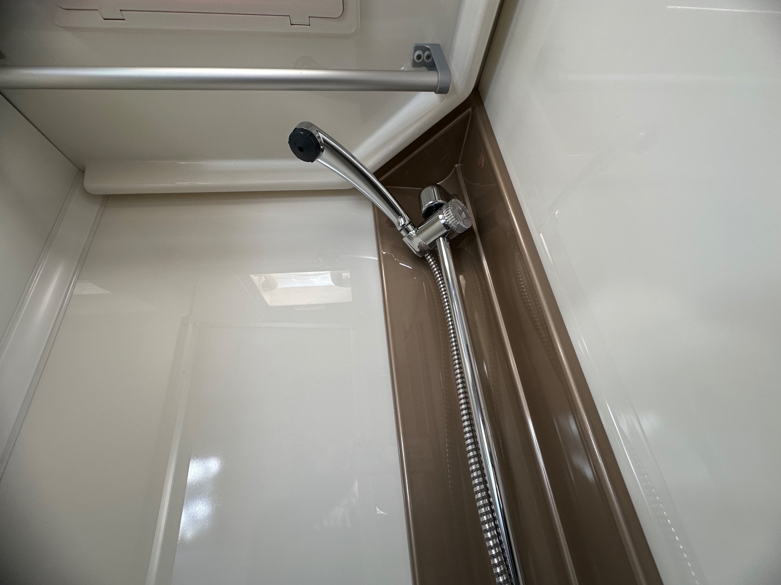 The washroom is to the foot of the bed with the shower being to the near side this has a shower tray plinth so you actually get to use some of this area as general walk way when not in use which is genius. The shower itself has a shower screen and riser as well a place to hang your coat or wetsuit when needed along with a rooflight got great ventilation. Opposite is the electric flushing toilet which also has the hand basin, vanity mirror, low and high toiletries storage and again a roof light for extra ventialation with the toilet door closed the washroom becomes an ensuite to the bedroom a nice touch for privacy.