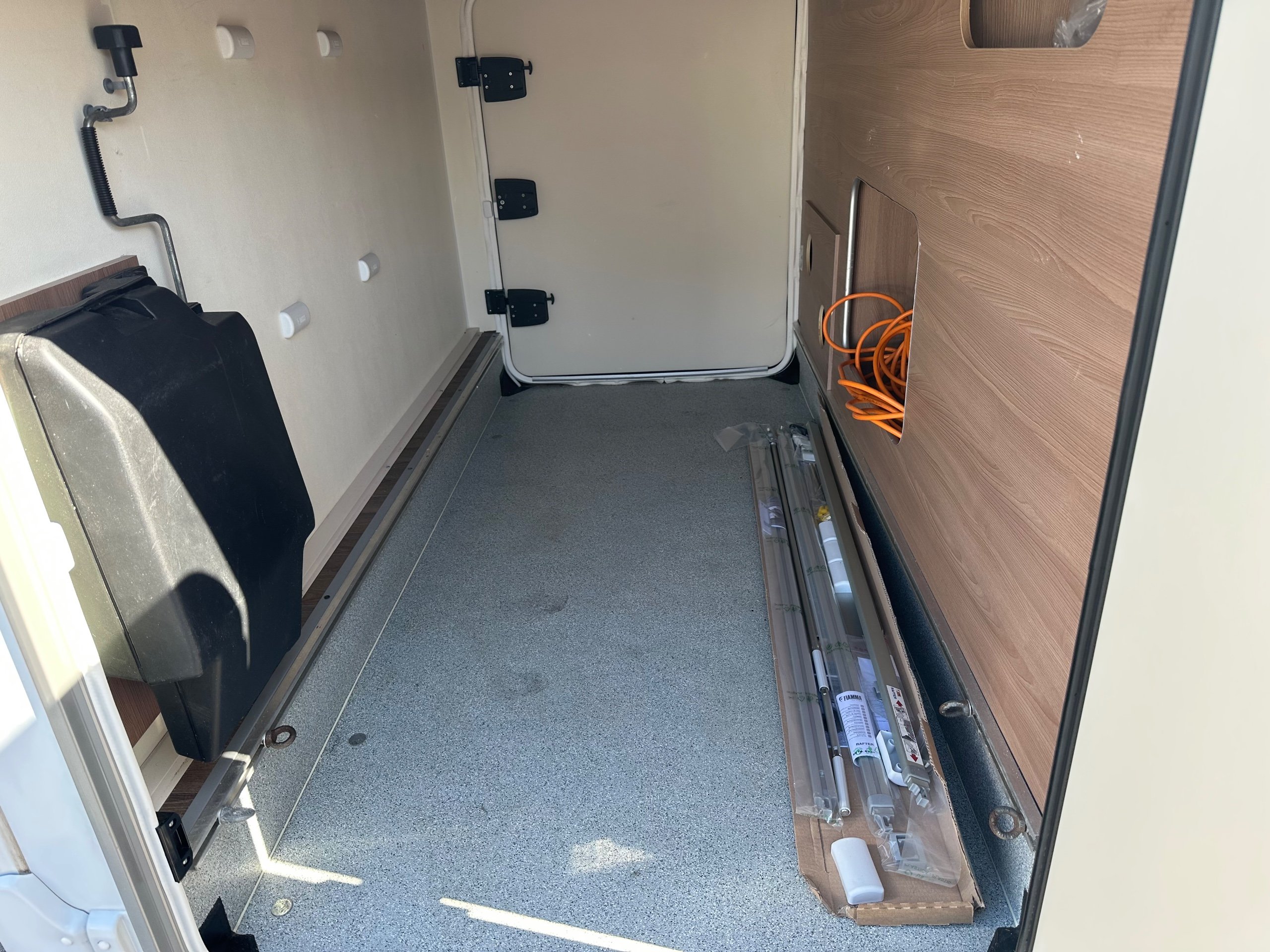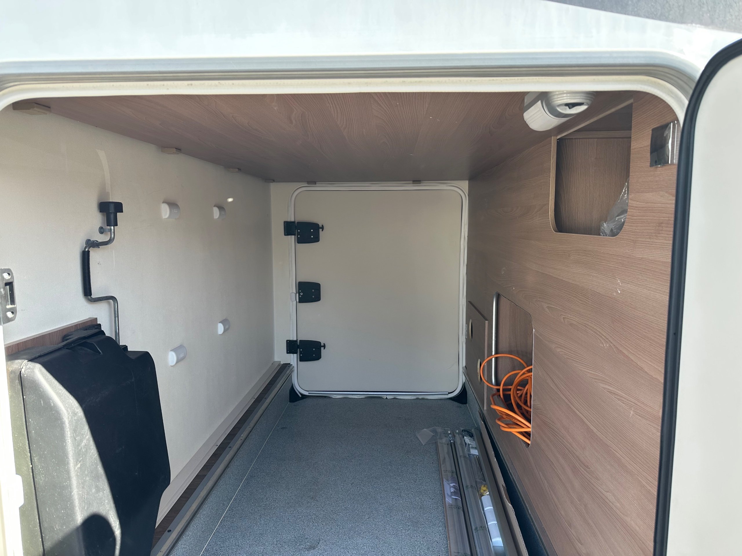 The large garage has access from both sides via a large garage doors that could take a scooter in size. There is space for all sorts of equipment back here with the tie hooks ready.