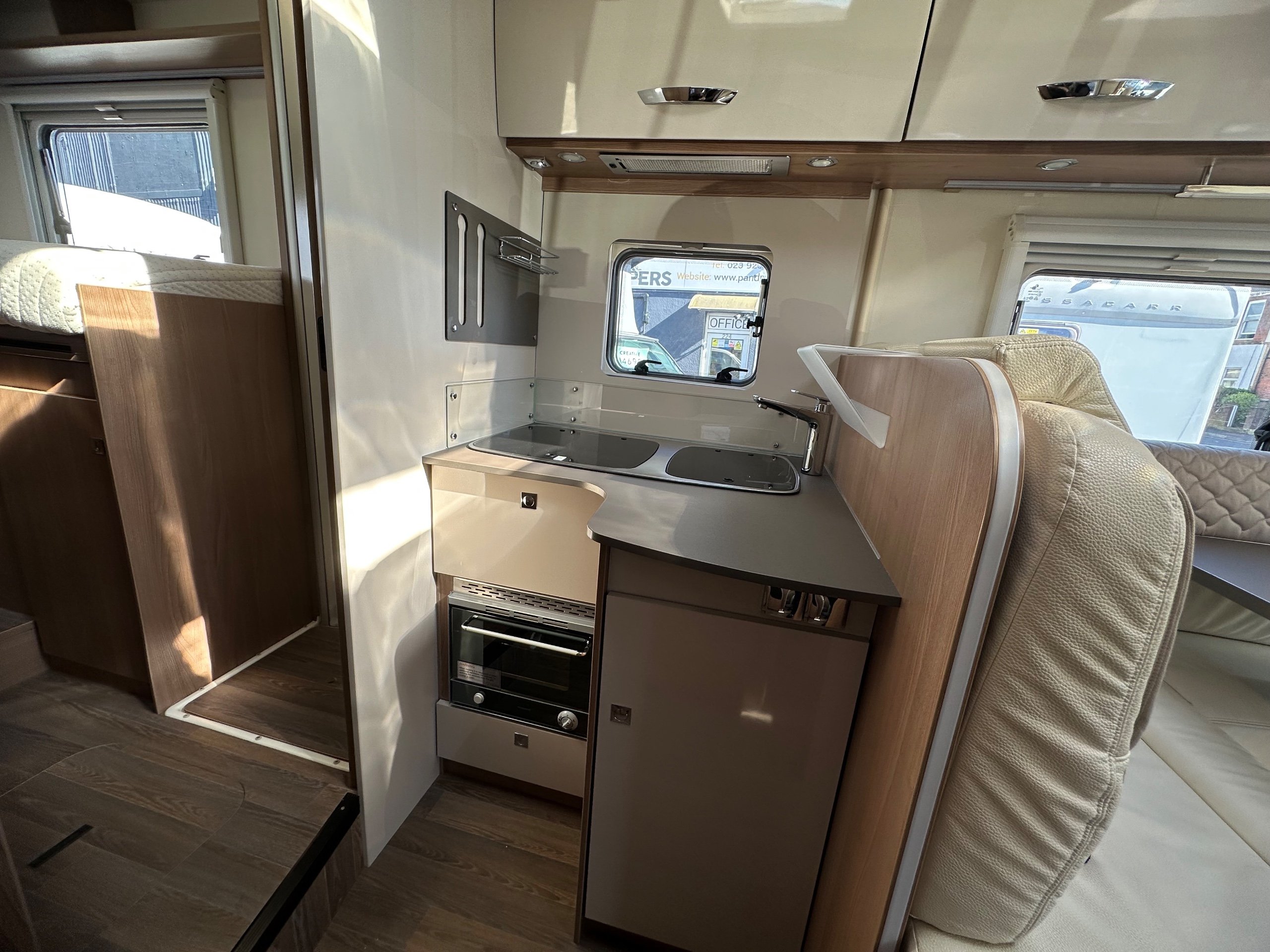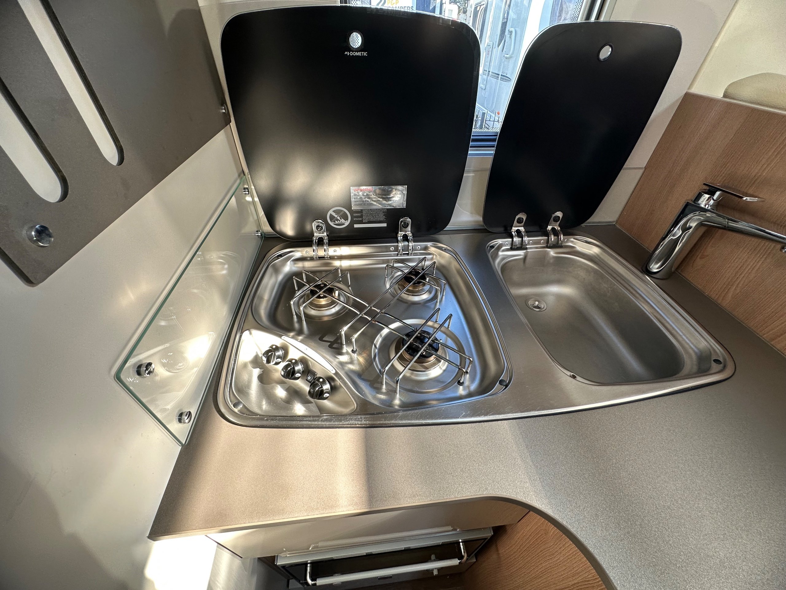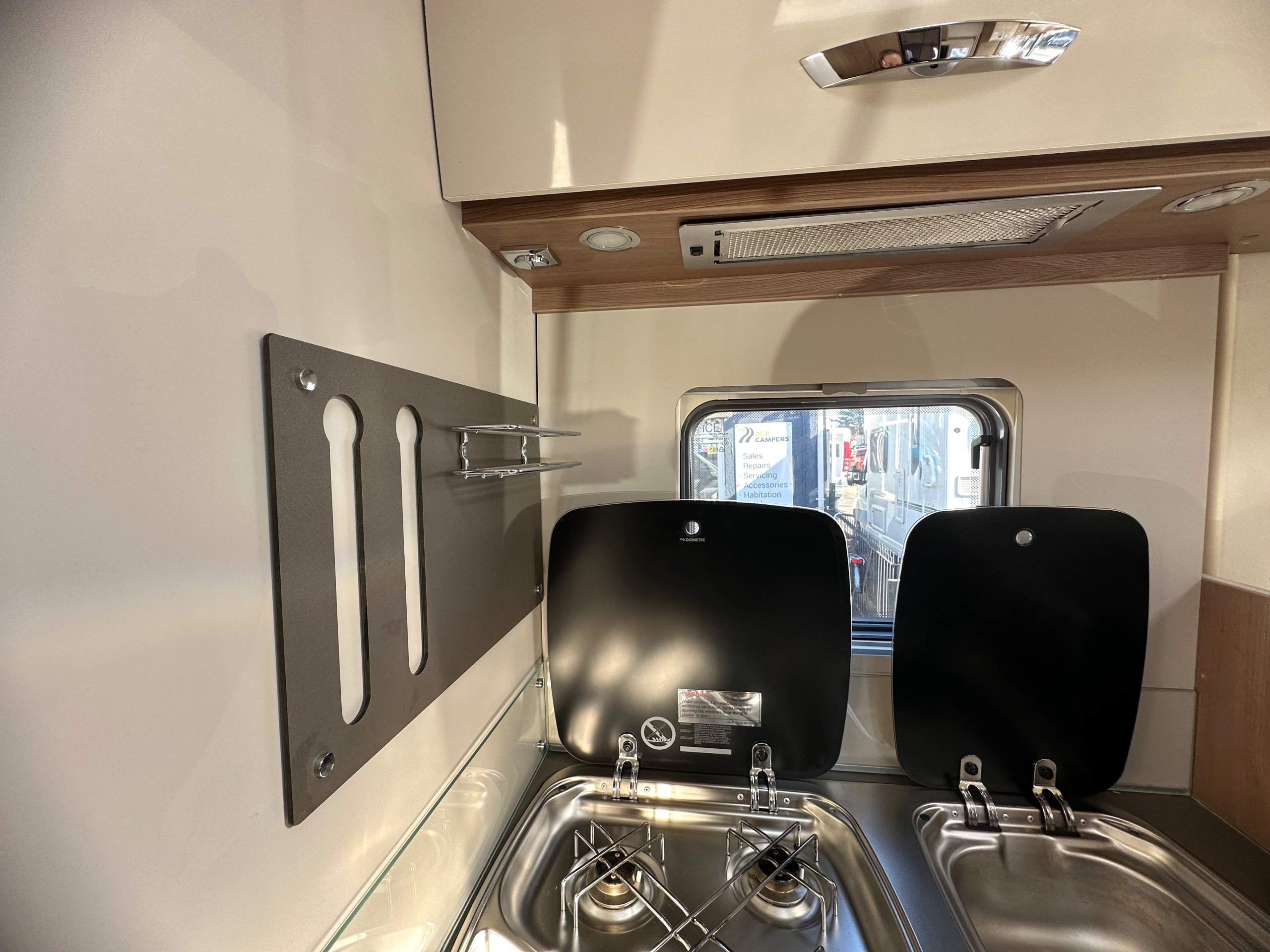 The kitchen is located centrally with a 3 way long slimline modern fridge with freezer compartment good sized door below. Opposite is the 3 burner hob with a glass lid and rectangle sink with glass lid, extractor fan, oven with built in grill, large storage cupboard below and overhead lockers up high there are power sockets for the kettle or air fryer etc when you are on the mains.