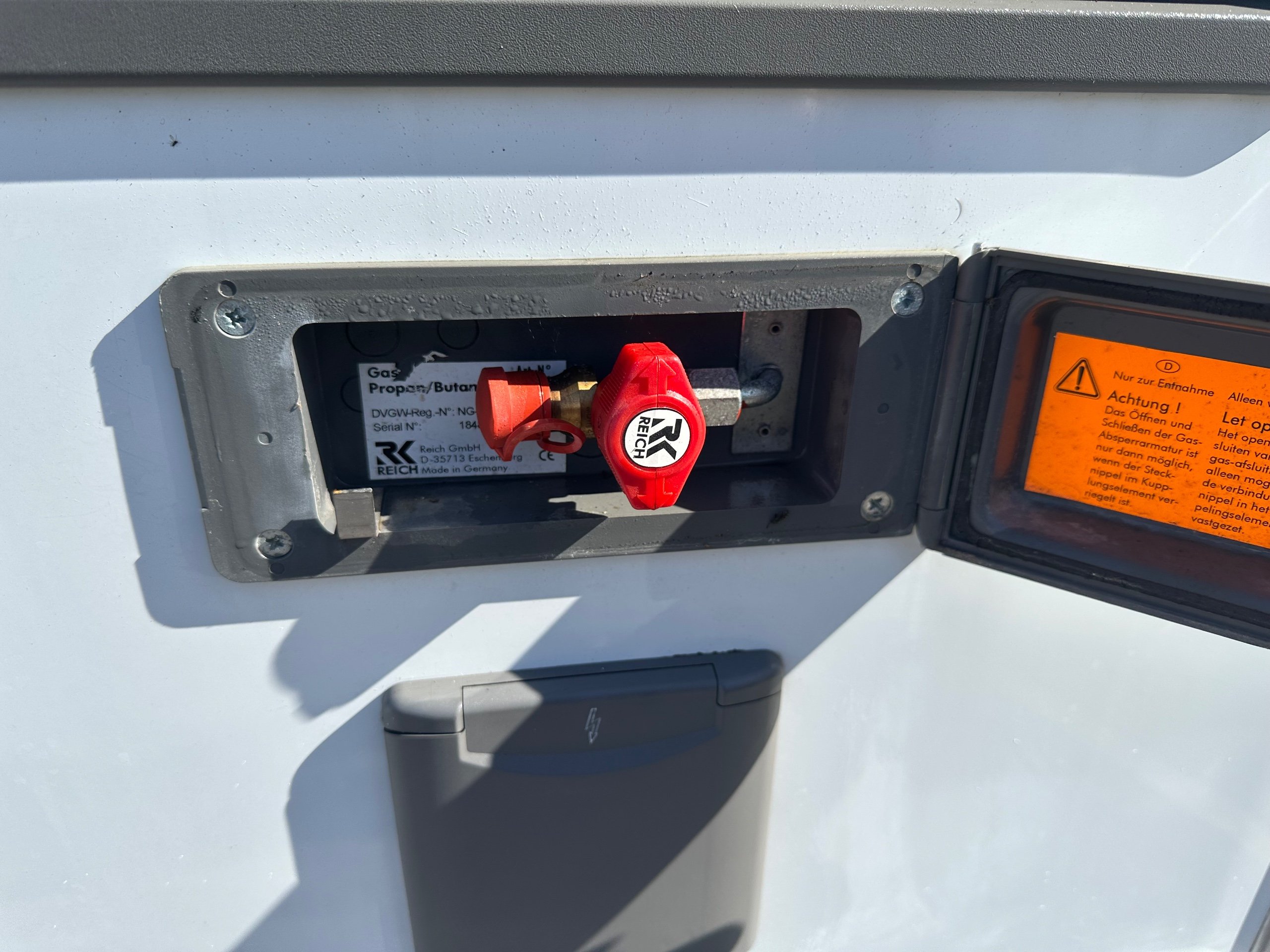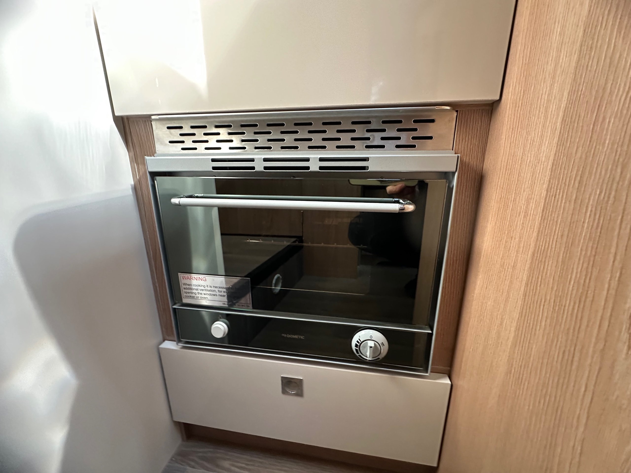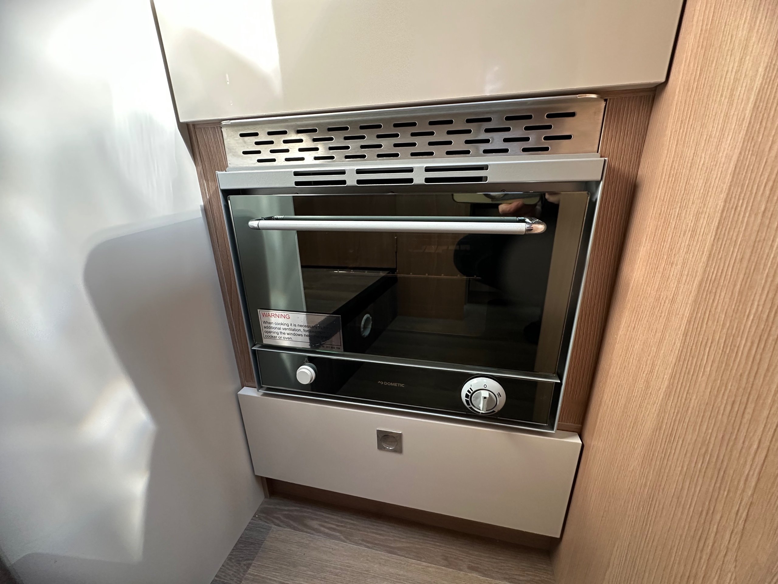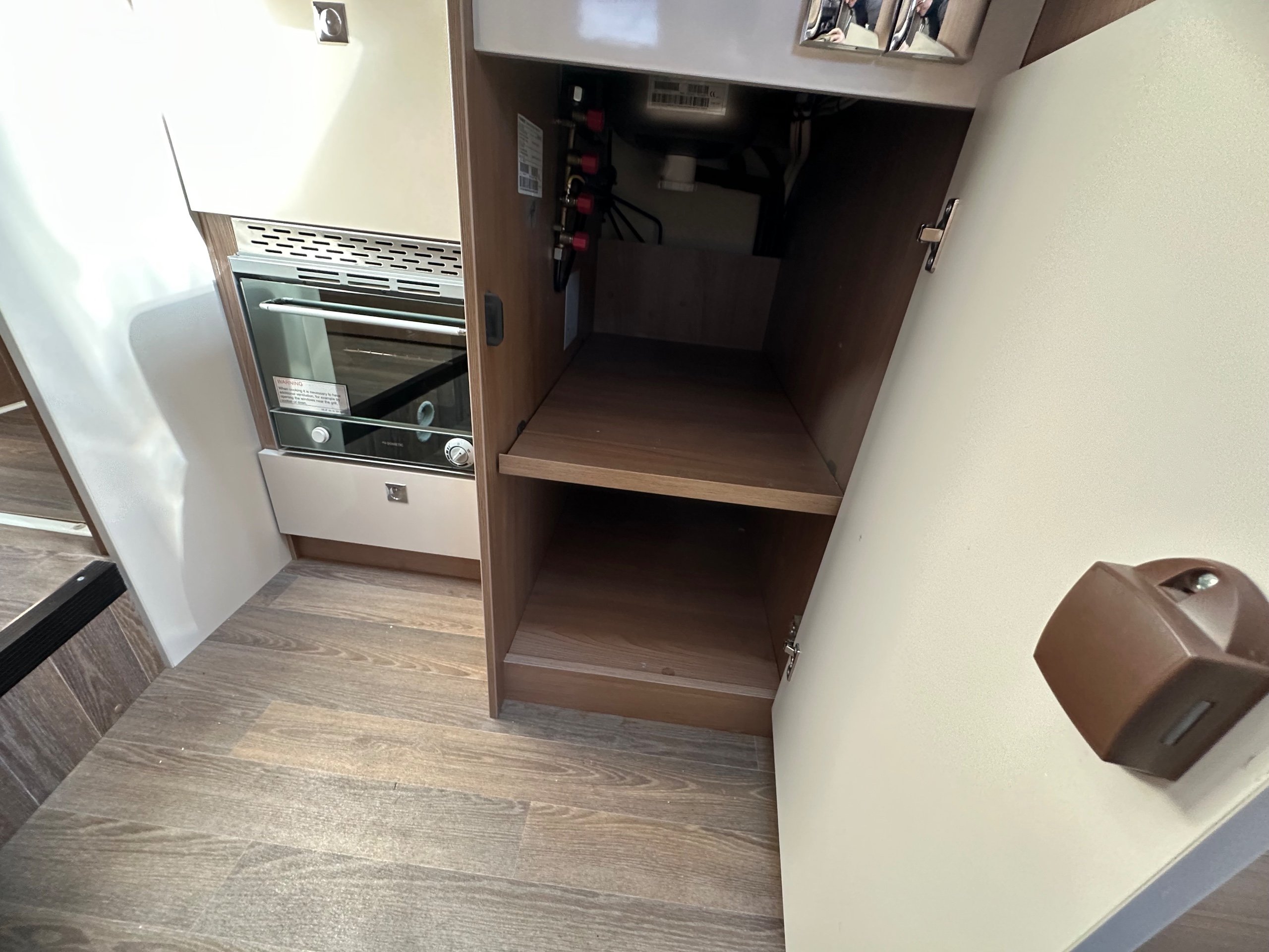 The kitchen is located centrally with a 3 way long slimline modern fridge with freezer compartment good sized door below. Opposite is the 3 burner hob with a glass lid and rectangle sink with glass lid, extractor fan, oven with built in grill, large storage cupboard below and overhead lockers up high there are power sockets for the kettle or air fryer etc when you are on the mains.
