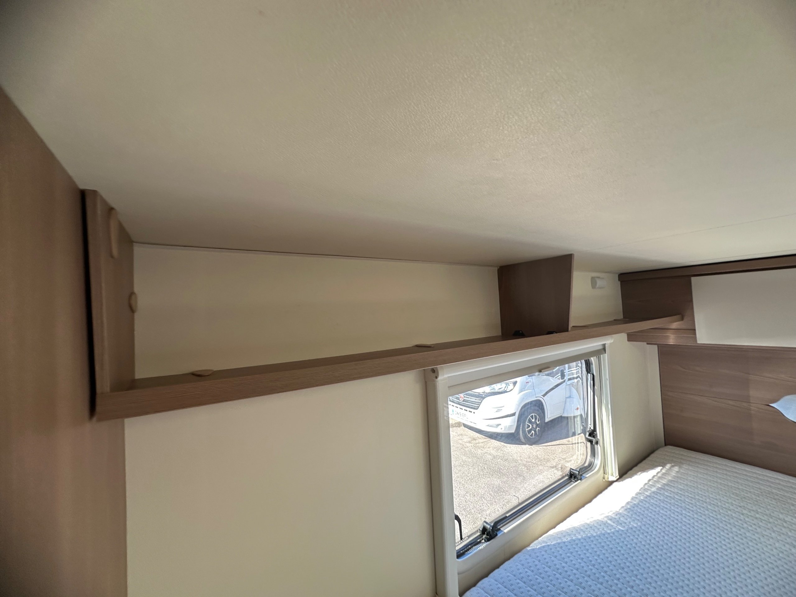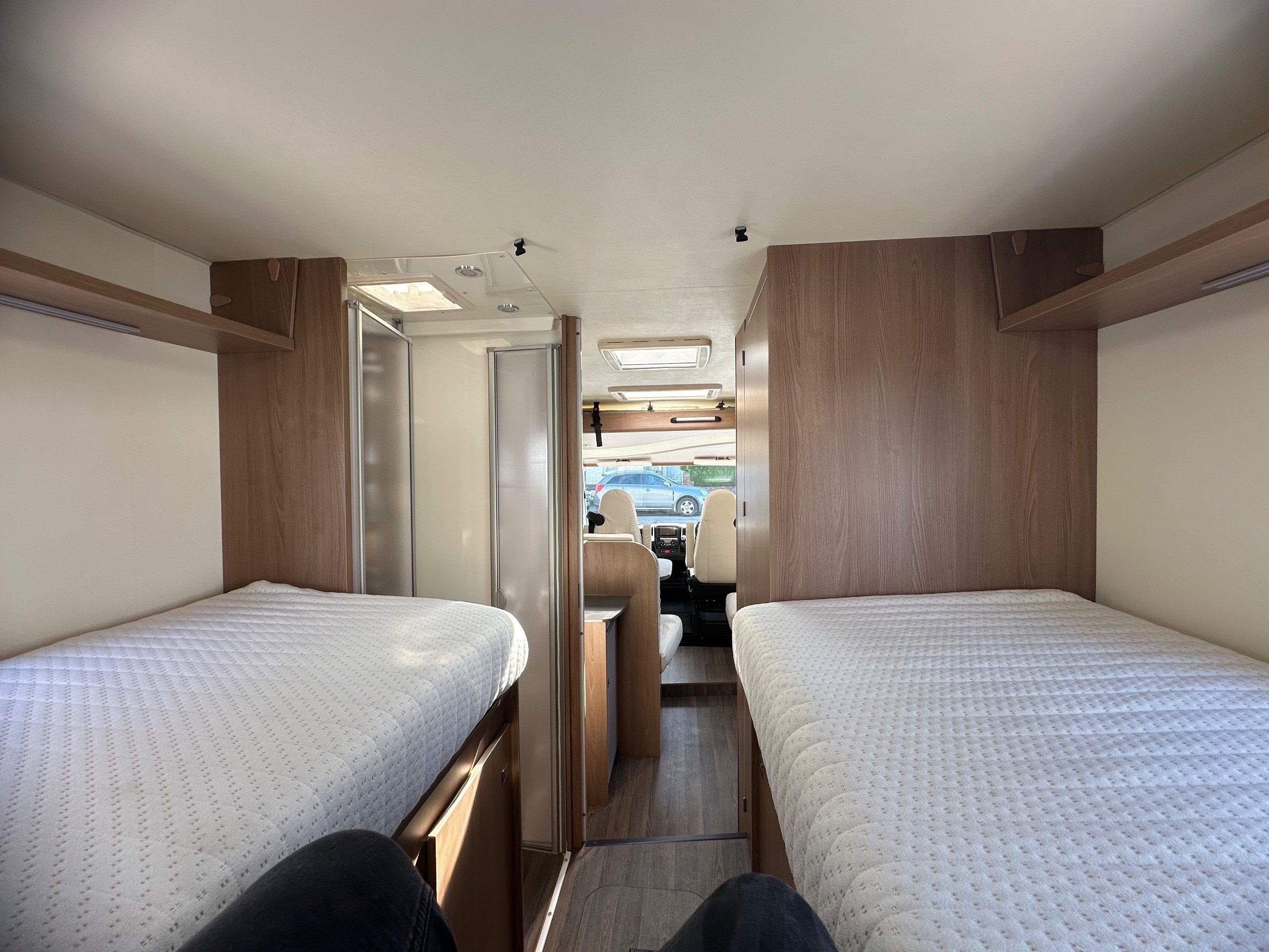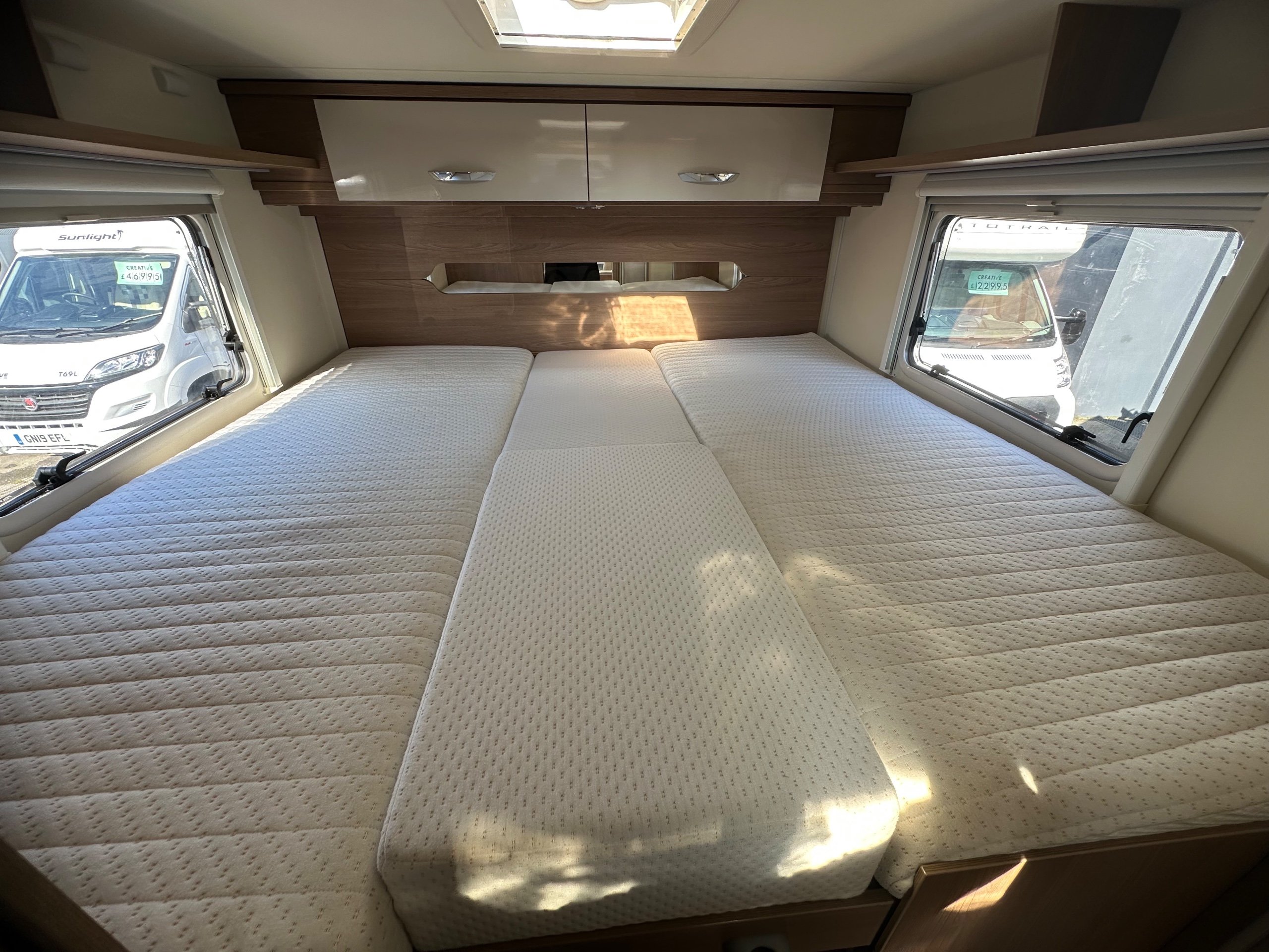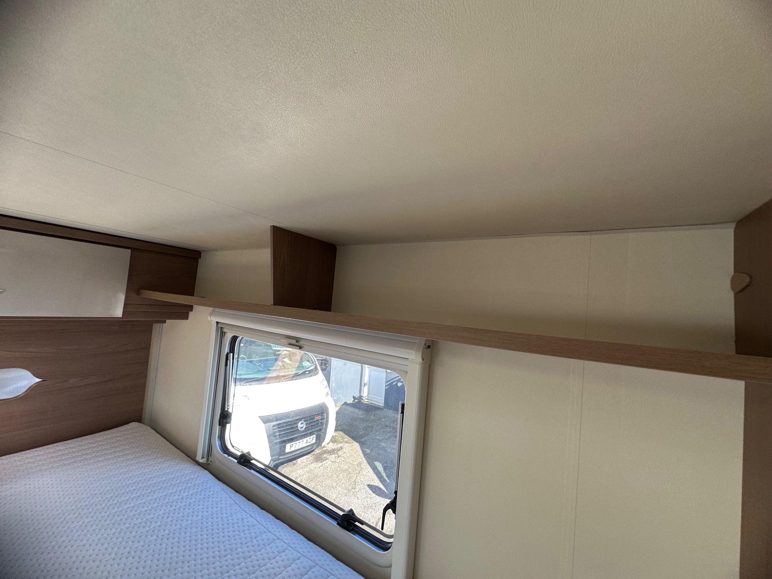 The bedroom above is capable of being 2 good size singles or with the infill in use this bed becomes a super large double. There are deep shelves above sides of the beds for popping your belongings on once you are at your destination. Along with 2 cupboards along the rear wall for books etc.