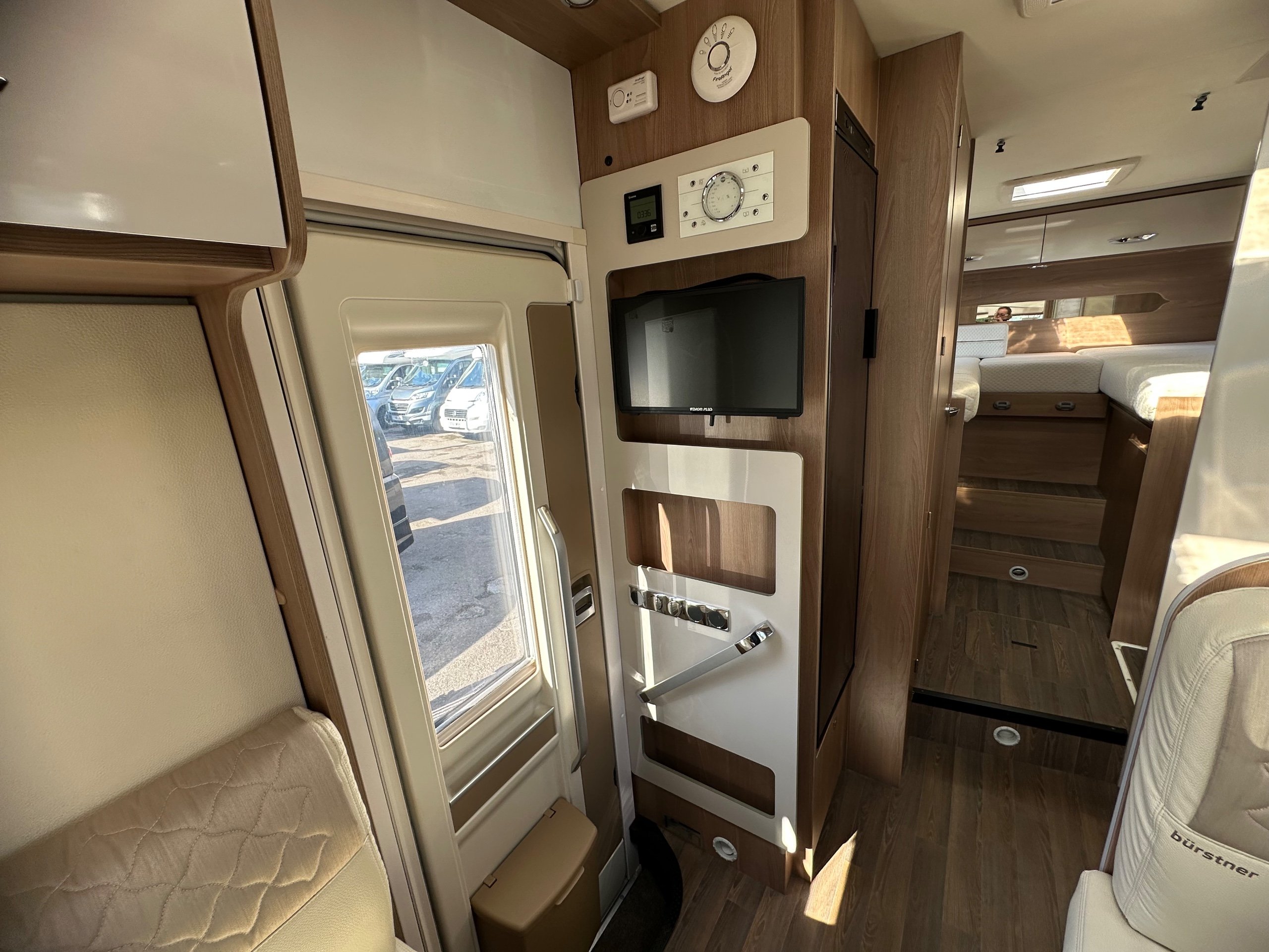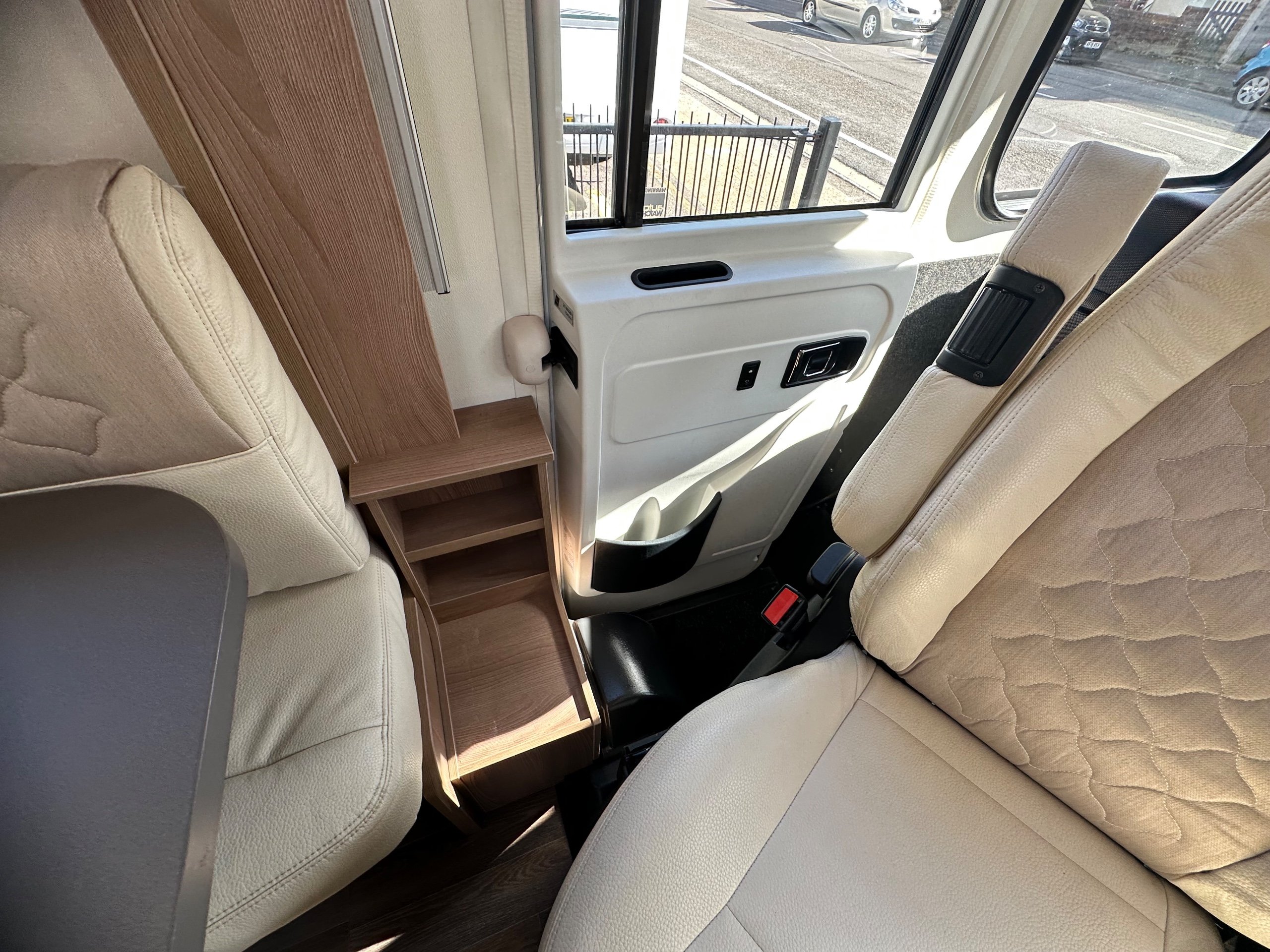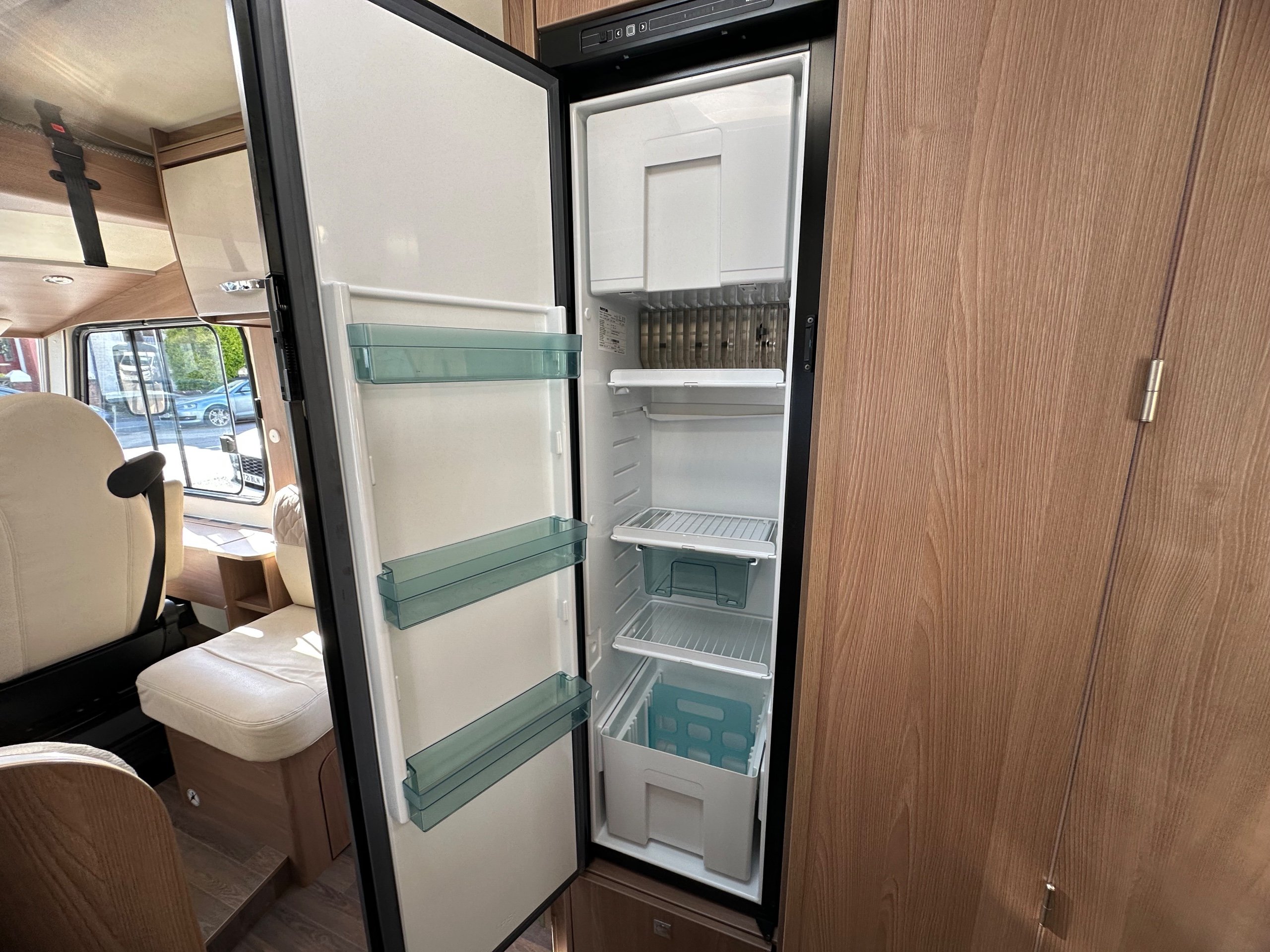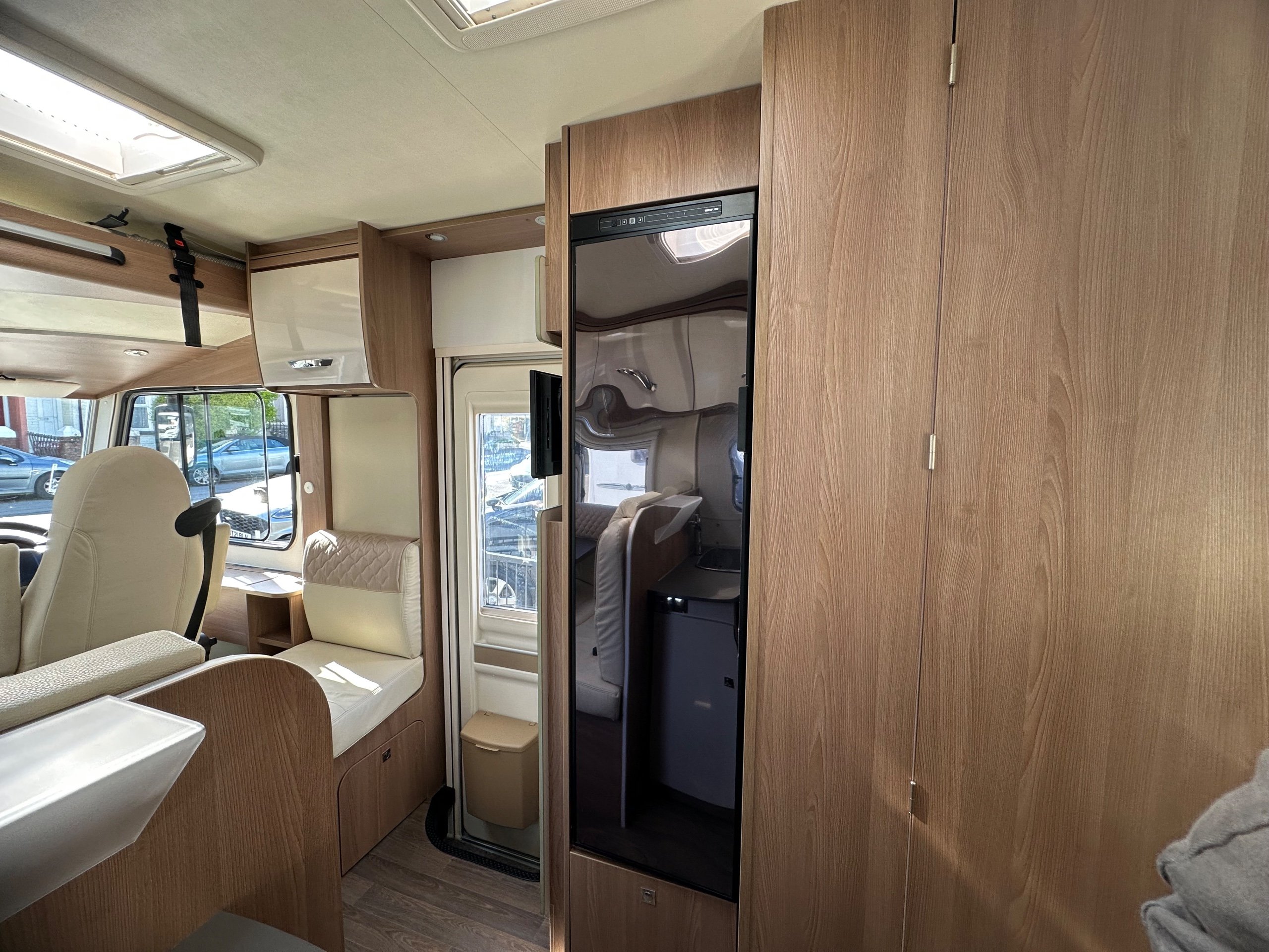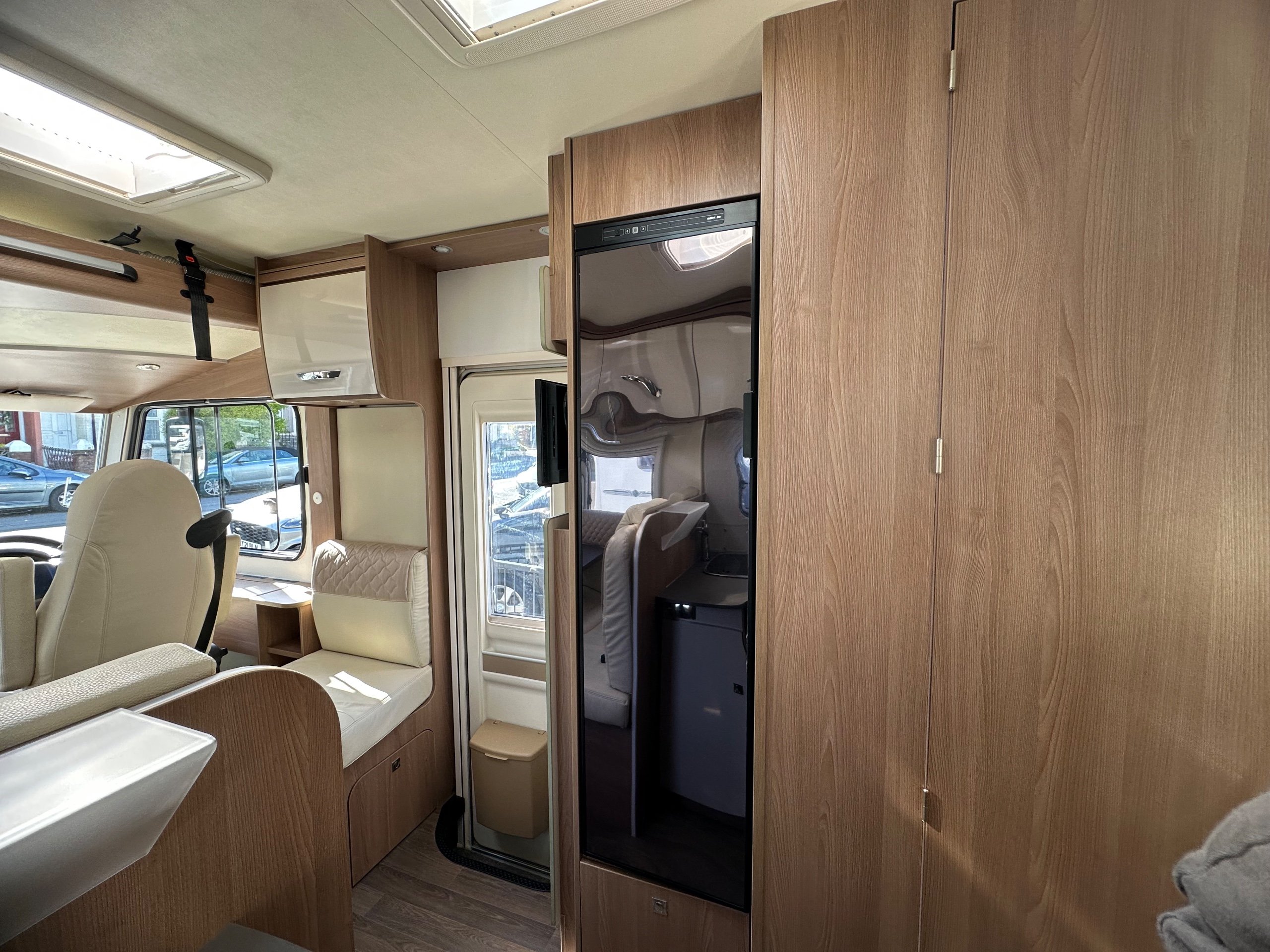 The bedroom above is capable of being 2 good size singles or with the infill in use this bed becomes a super large double. There are deep shelves above sides of the beds for popping your belongings on once you are at your destination. Along with 2 cupboards along the rear wall for books etc.