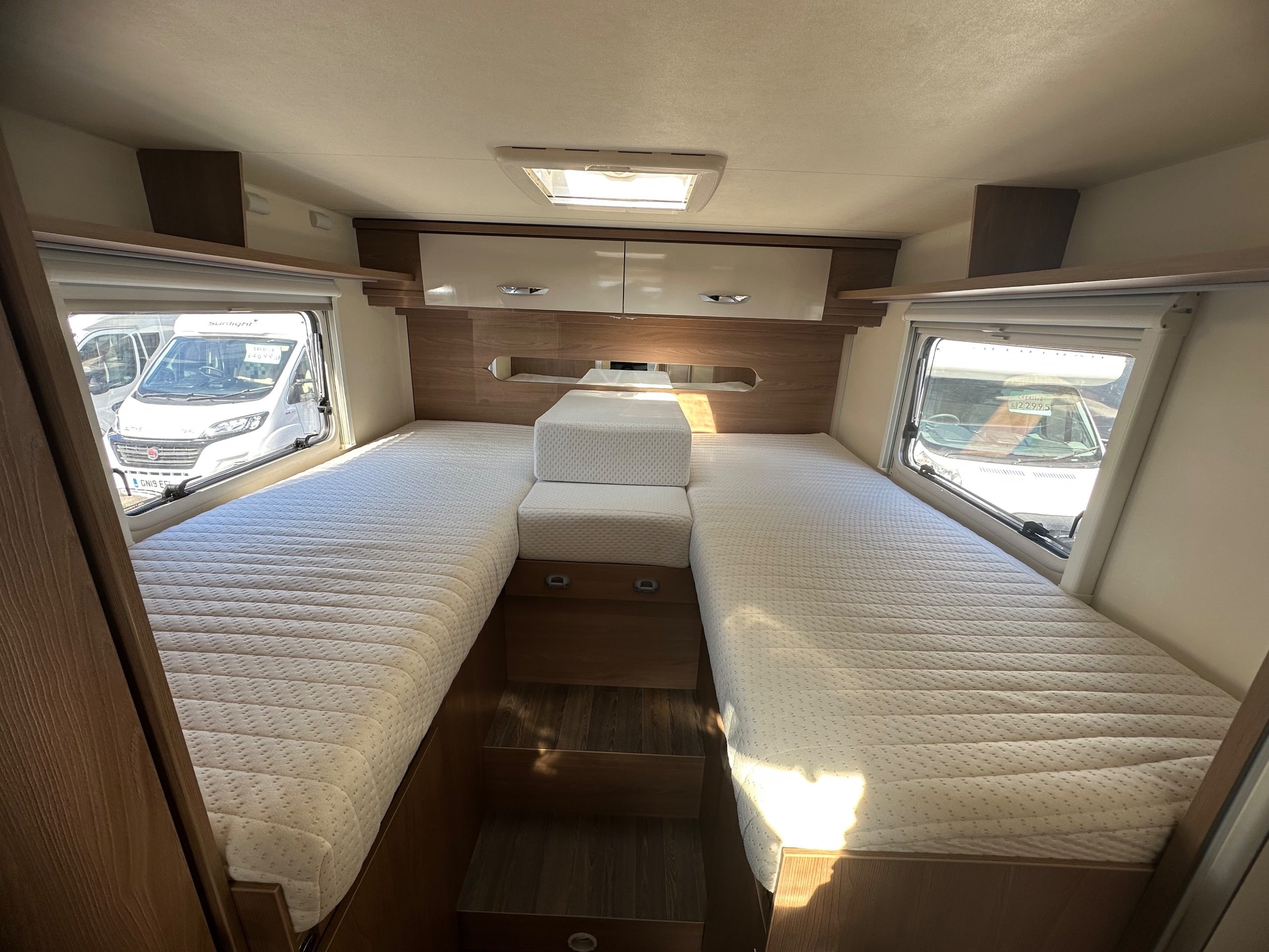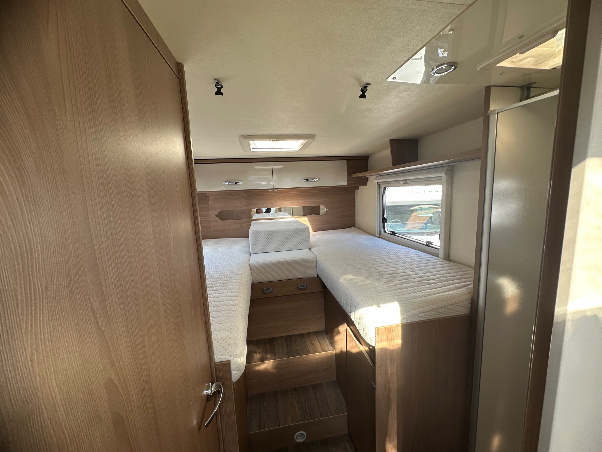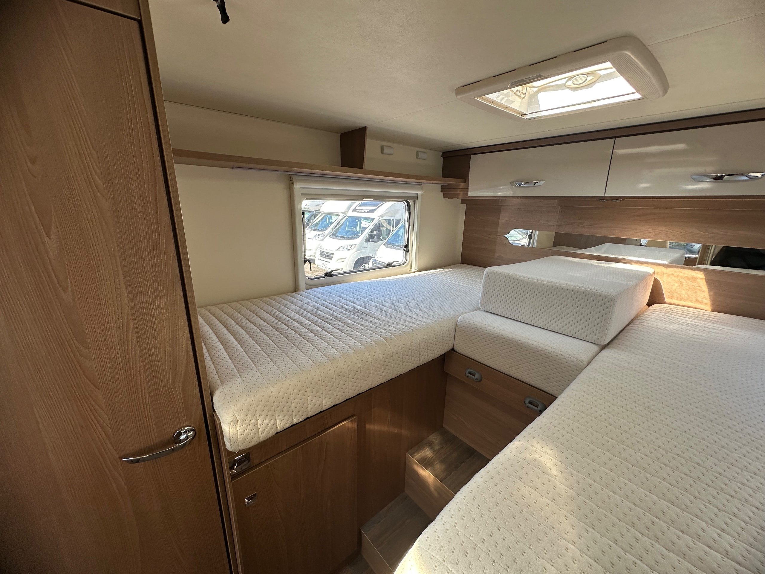 The layout of the motorhome is rear twin fixed singles with middle infill to make into a transverse should you wish with large garage below.