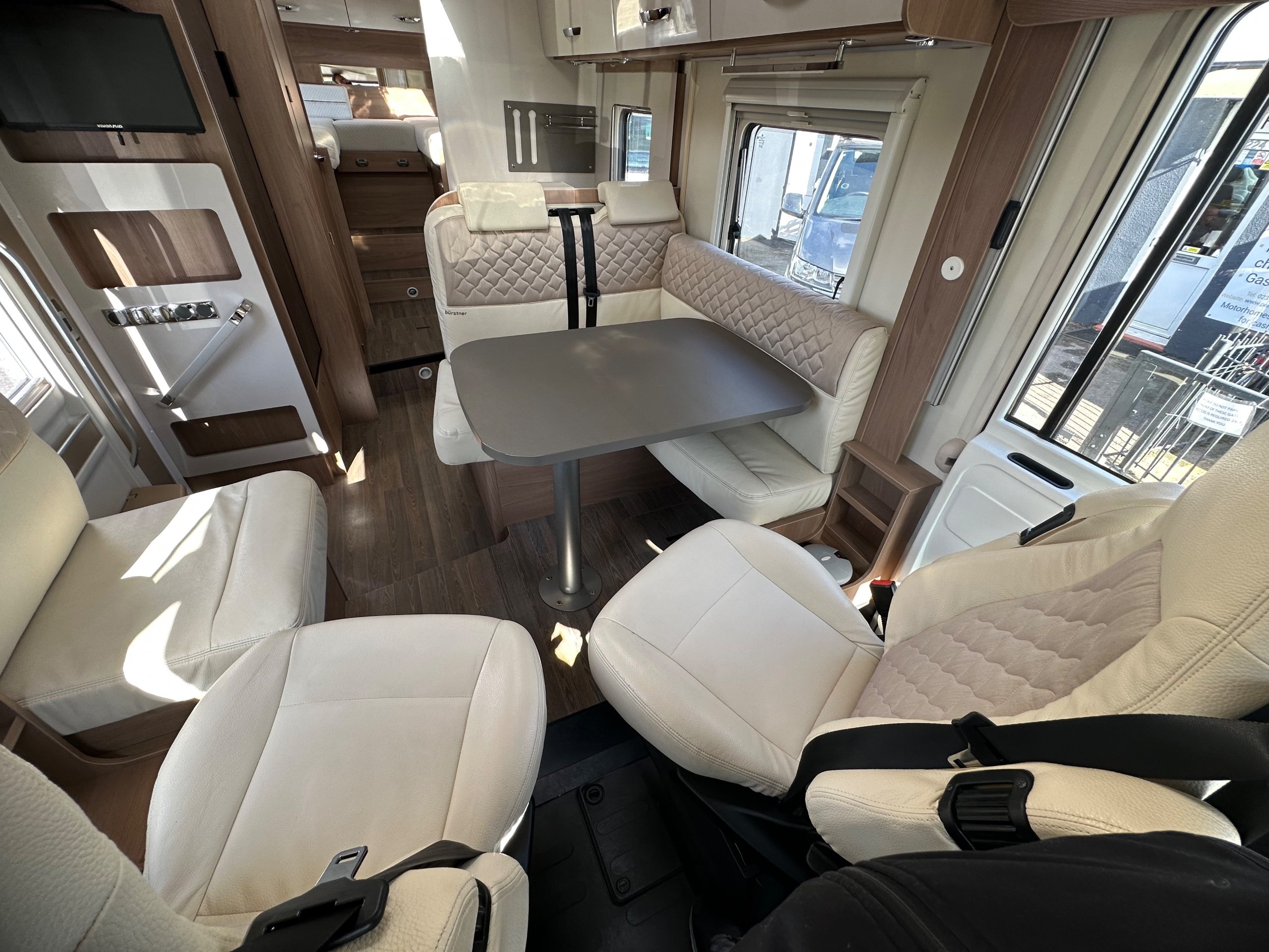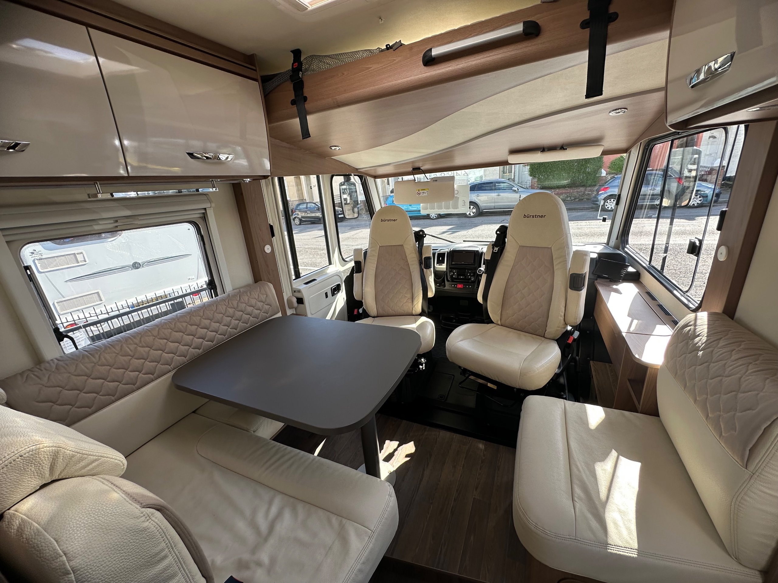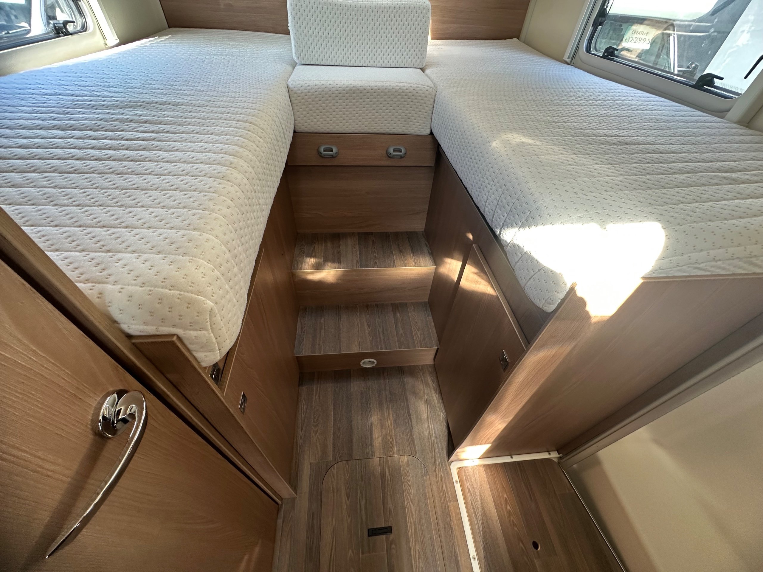 The layout of the motorhome is rear twin fixed singles with middle infill to make into a transverse should you wish with large garage below.