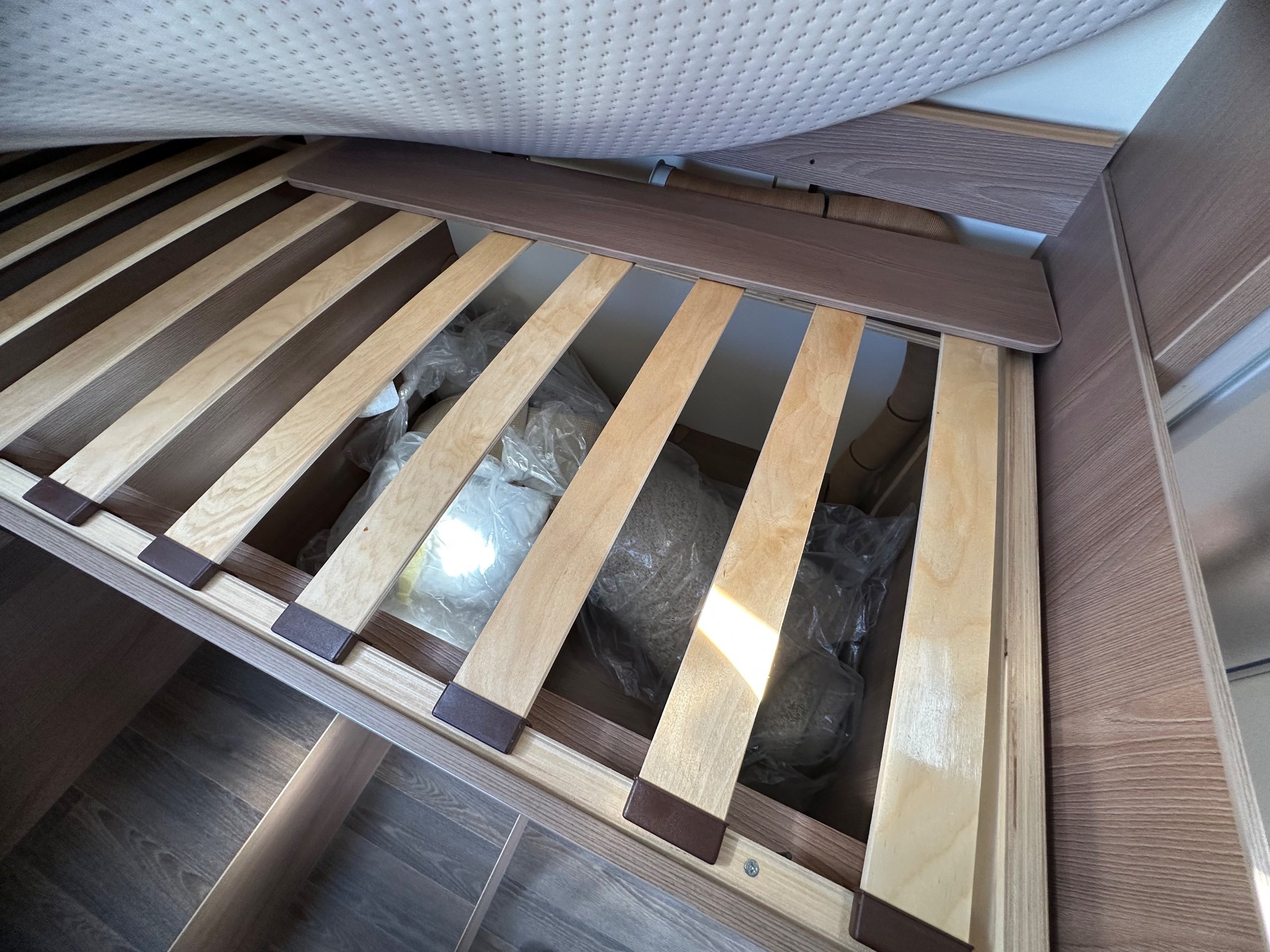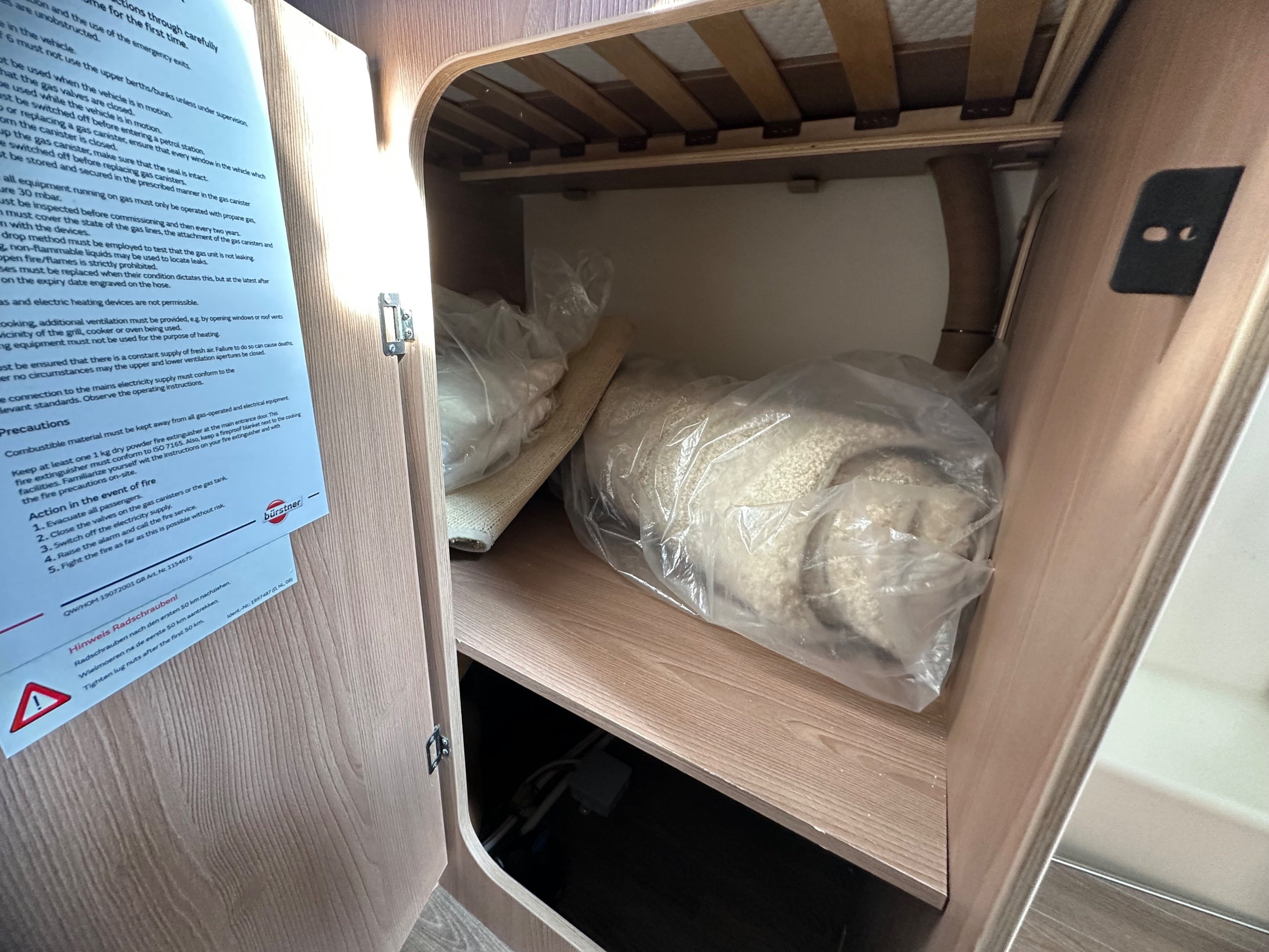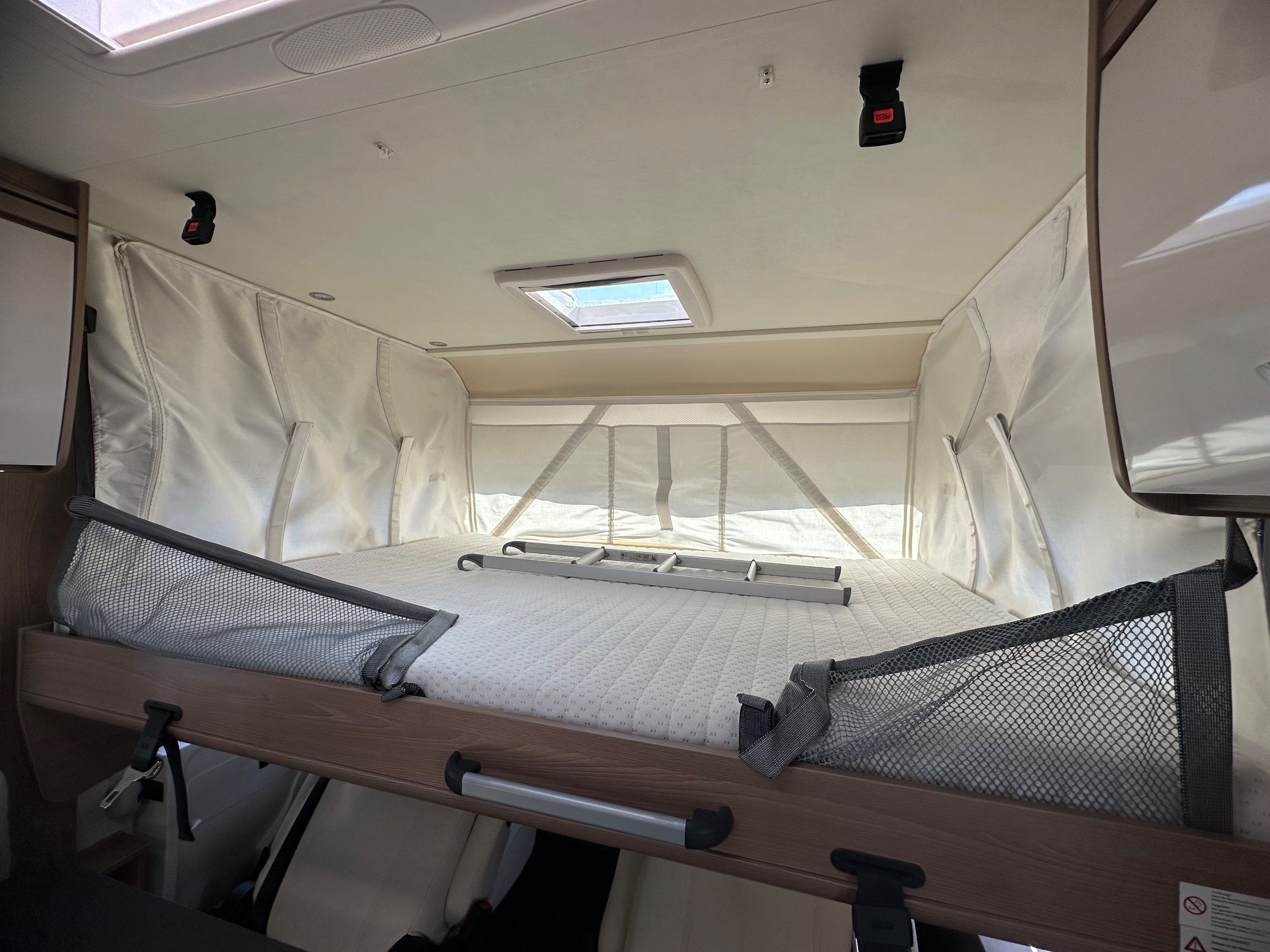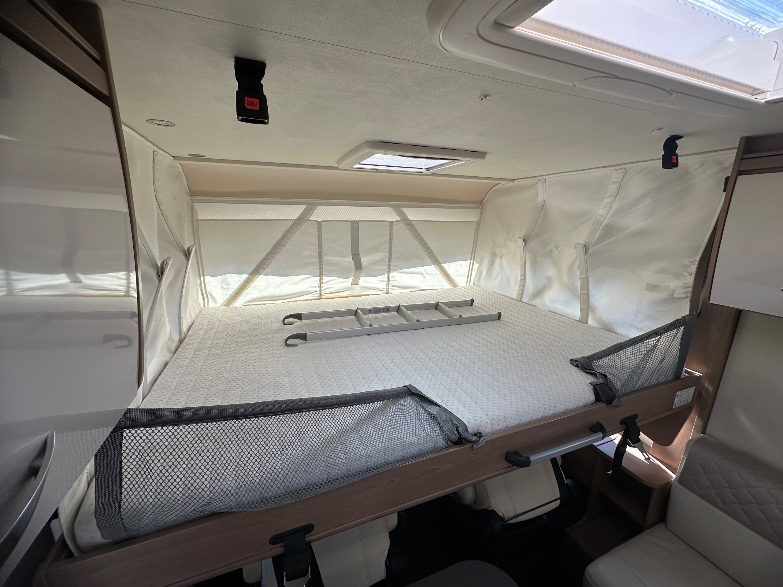 Over the cab is a large double that manually drops down and has the use of safty nets. There is a decent amount of head room so you could sit up in bed for a cuppa.