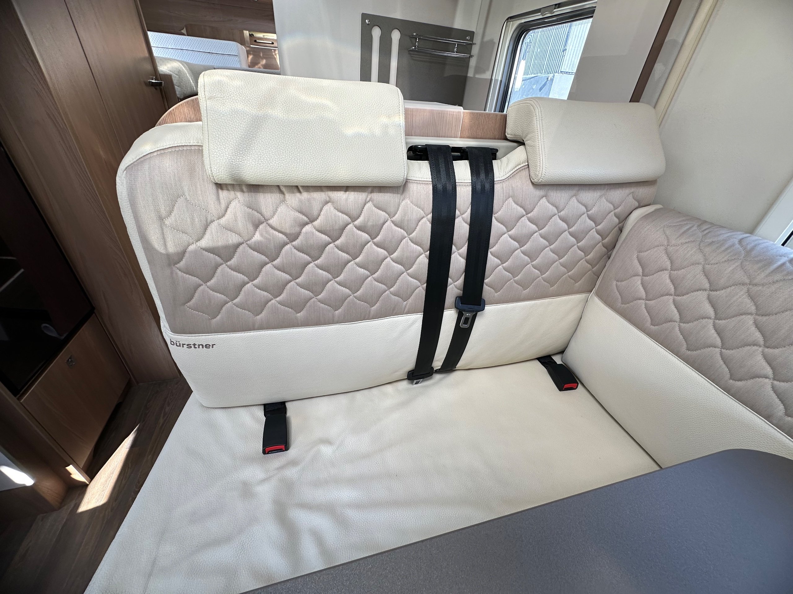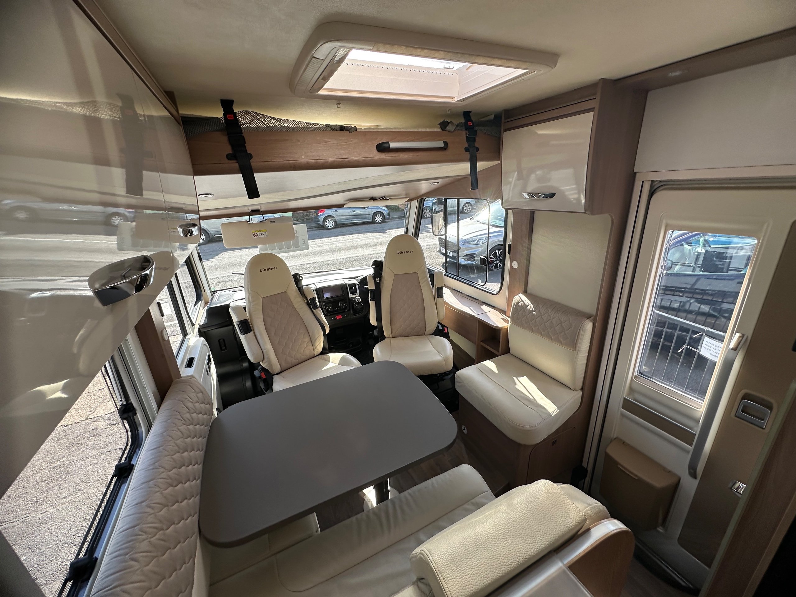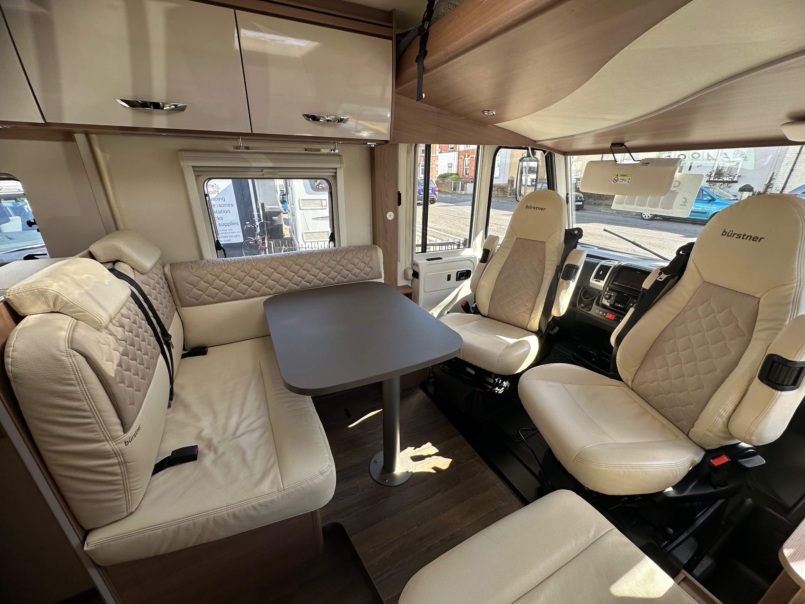 The lounge is up front, this is made up of a forward facing L shaped settee which houses 2 x 3 point seatbelts so 4 belts in total the front cab seats swiveled and a side single settee. This has over head lockers on both sides and is a really social space to be, great for having guests over or even just more space when its a rainy day.