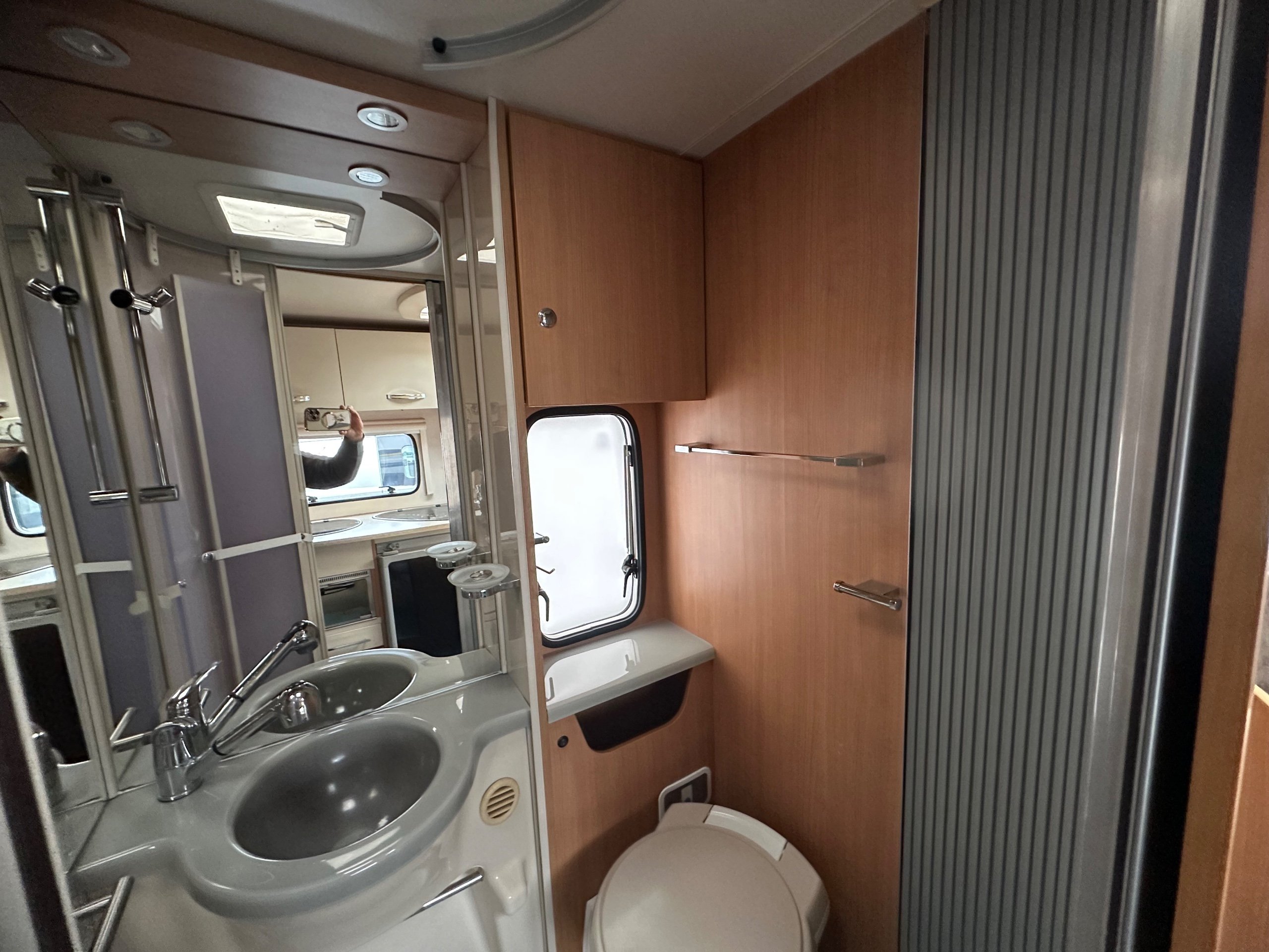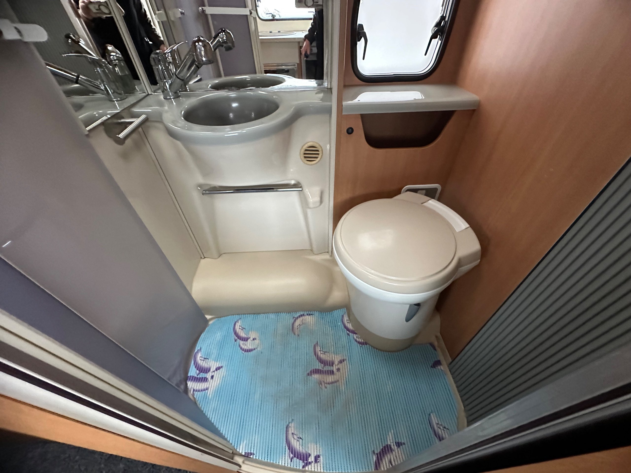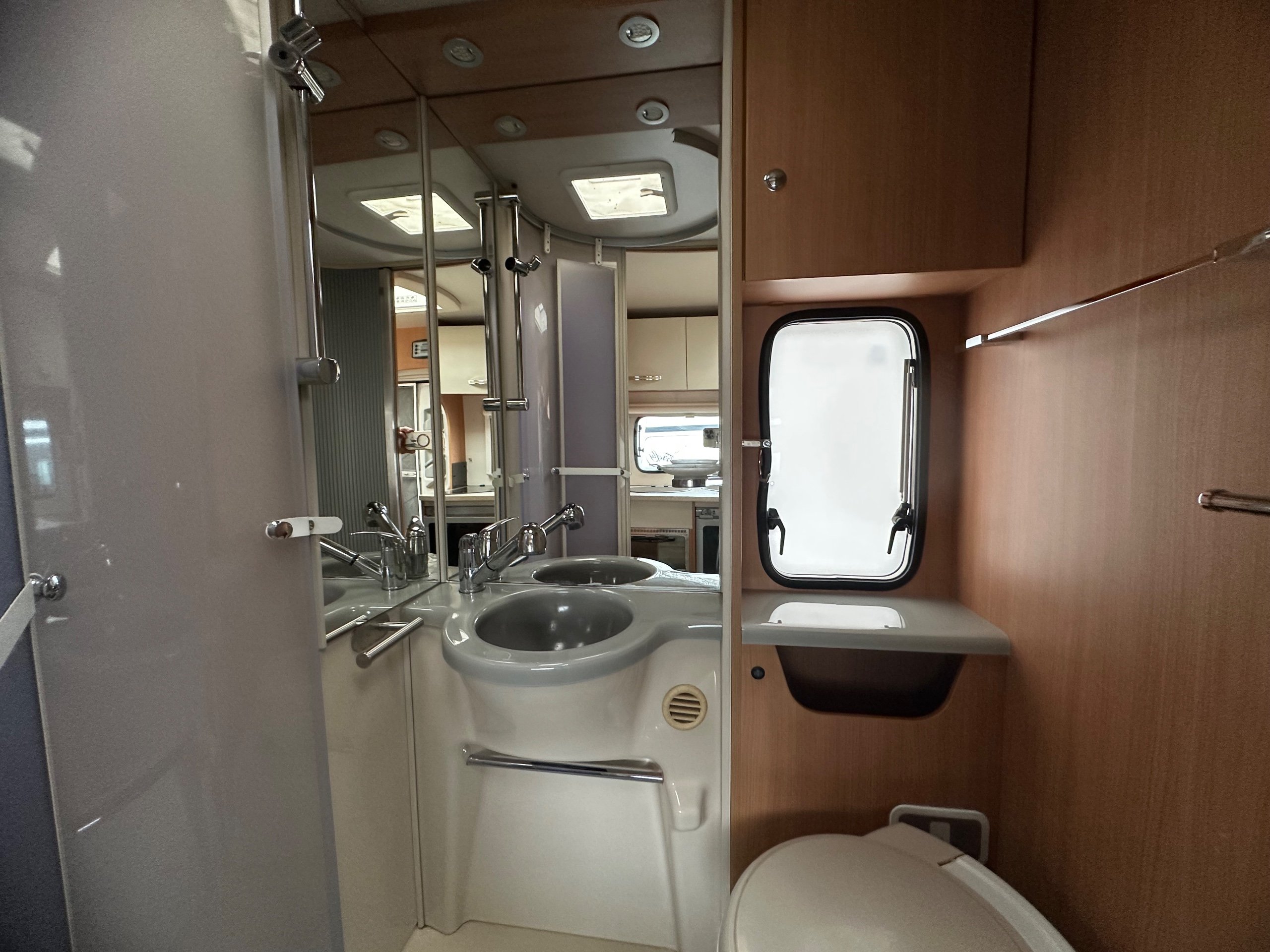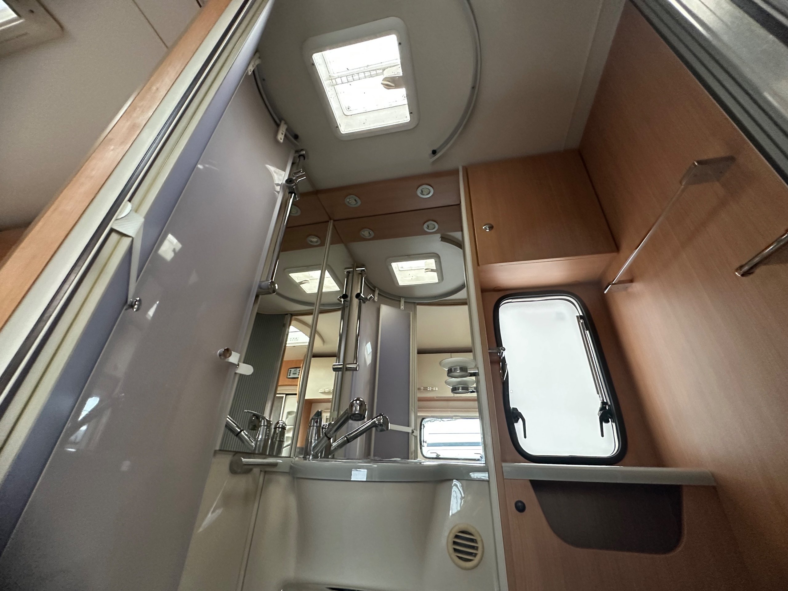 Opposite on the near side is the washroom this has a good size shower tray, built in hand basin, large vantity mirror, electric flushing toilet, storage for the toiletries and a window and skylight for good ventilation.