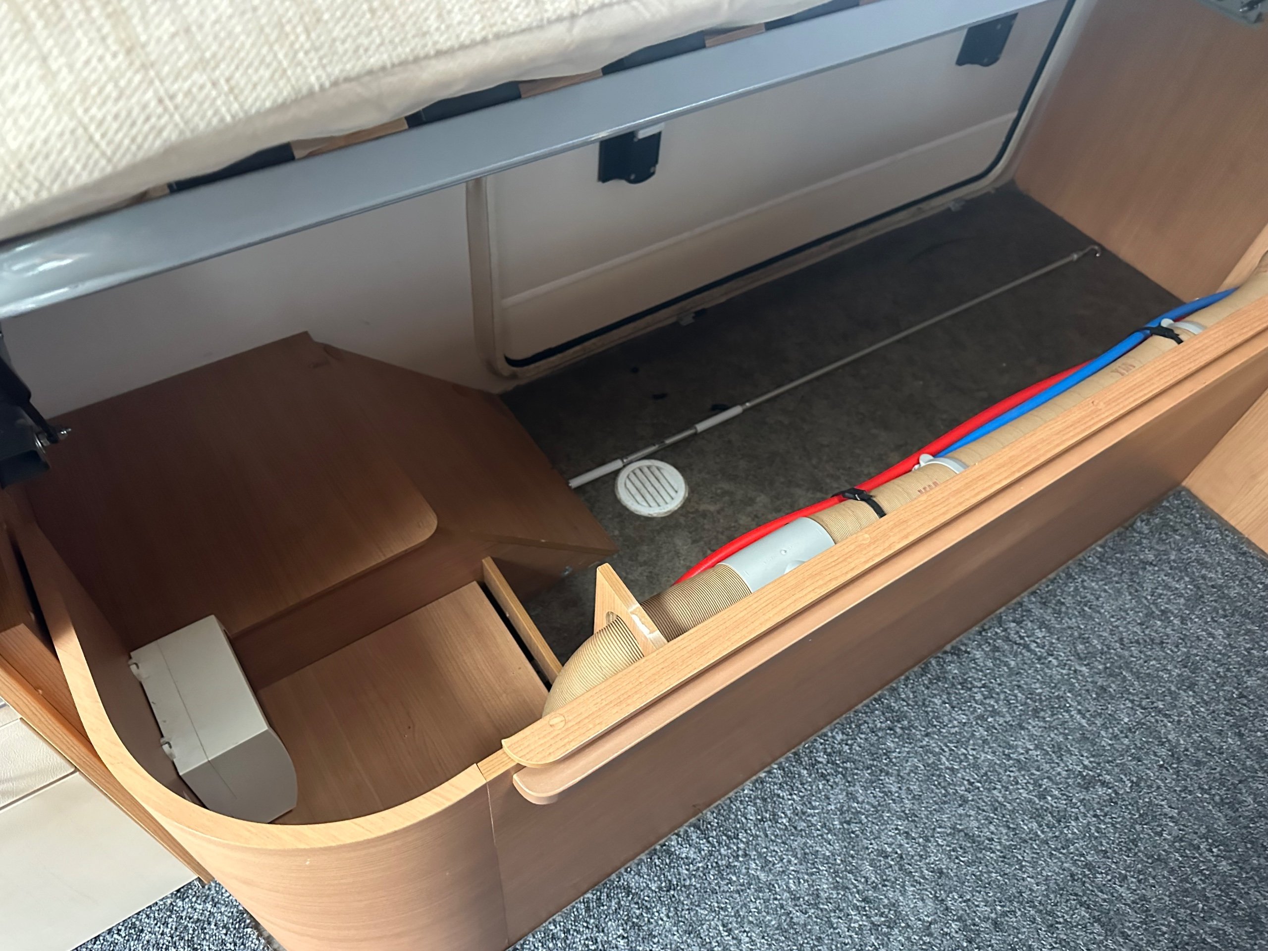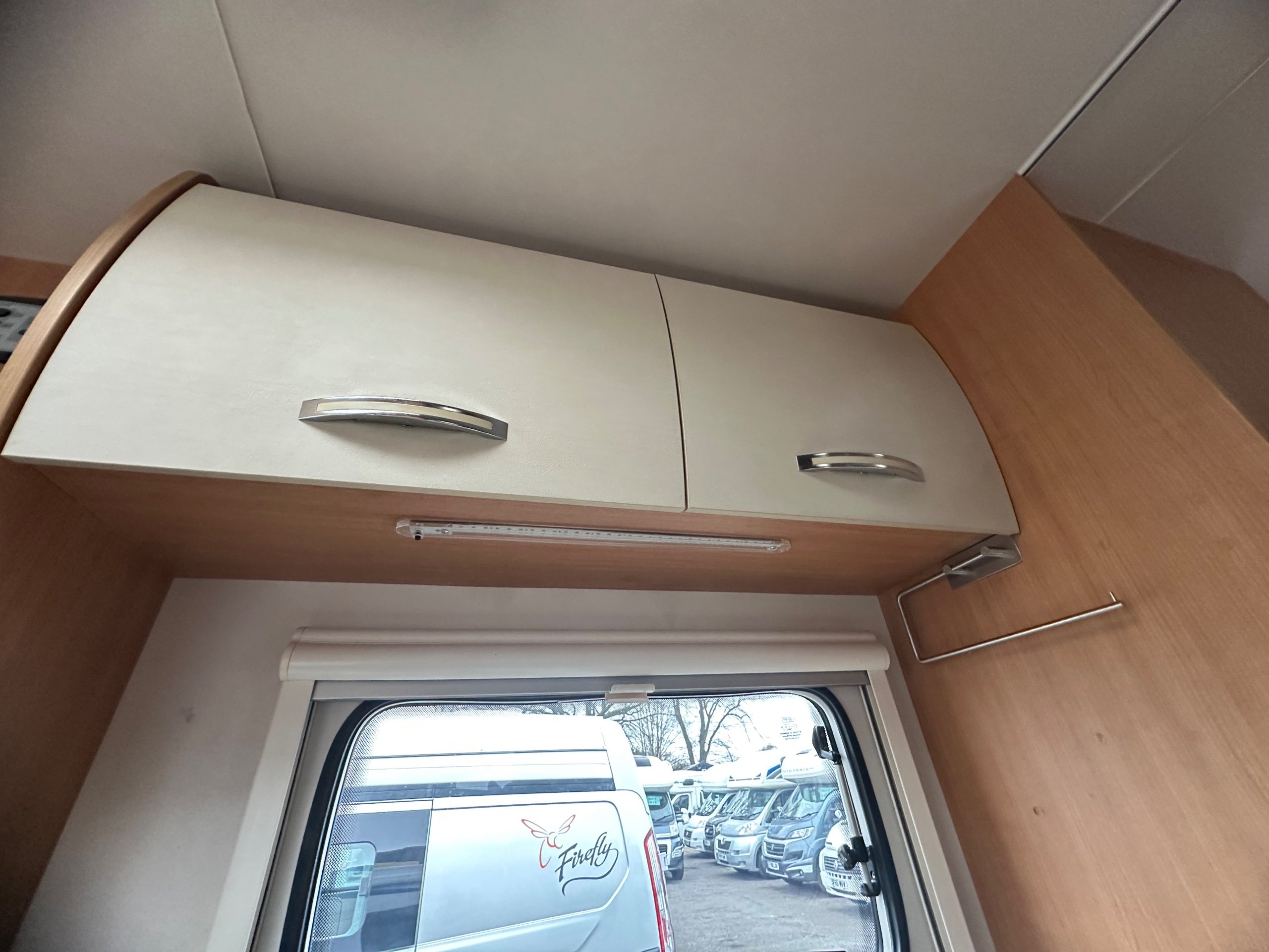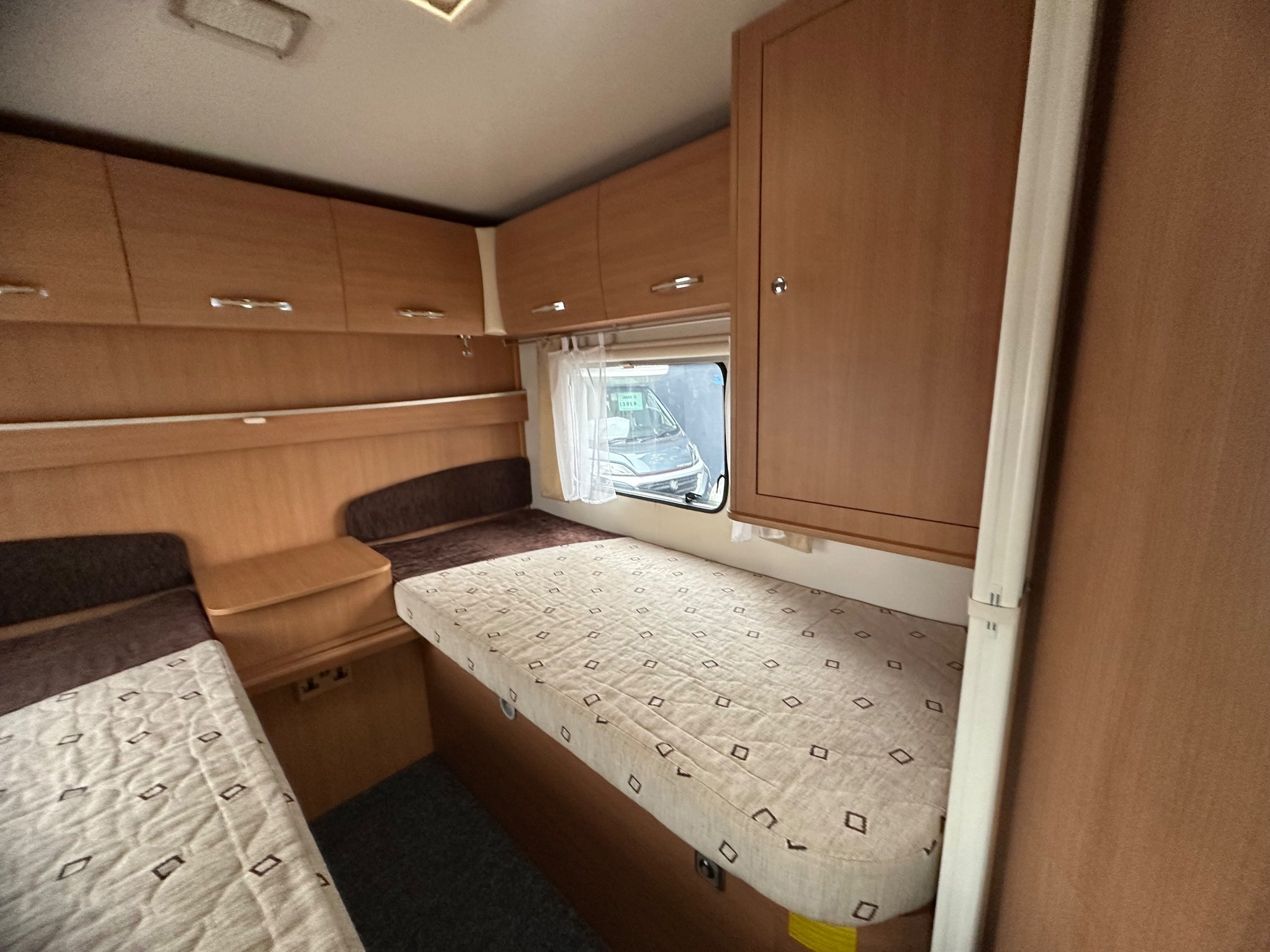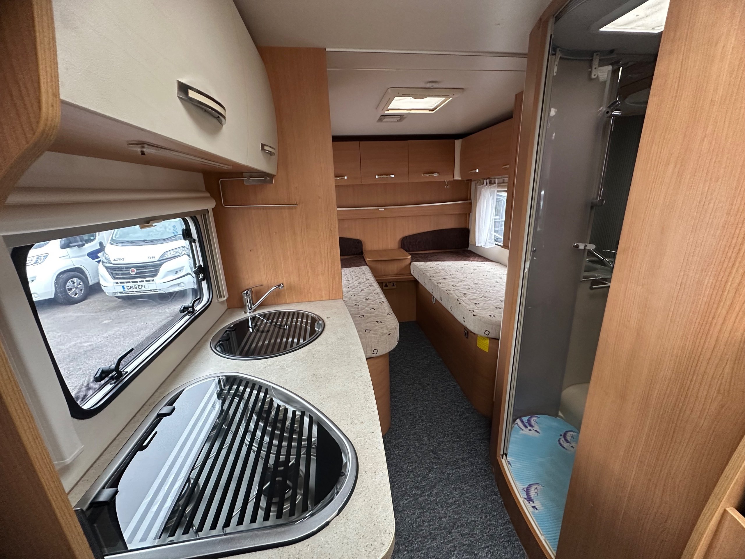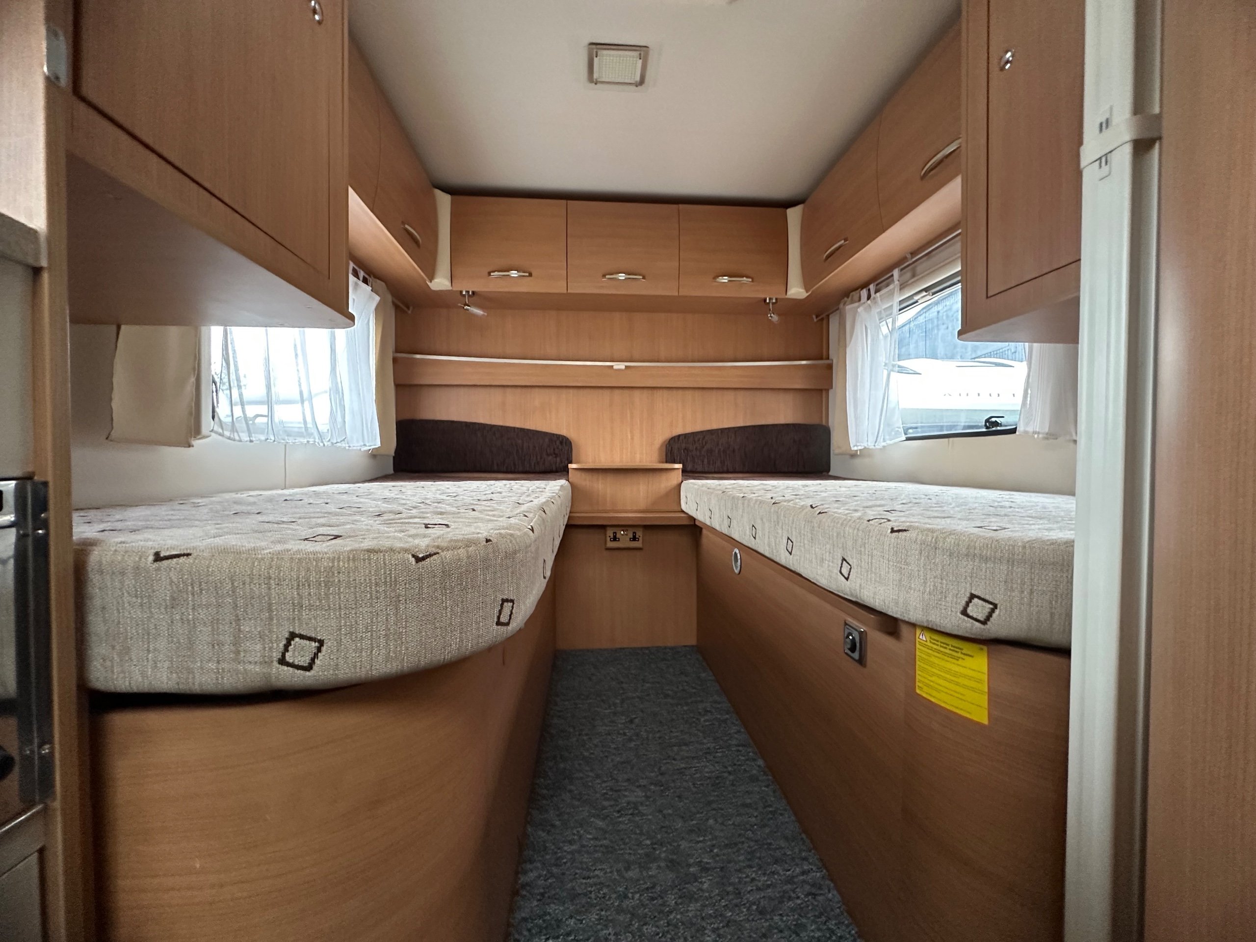 The rear twin fixed singles allow for the ease of access with a lift up storage below as well access from outside. There is wrap around over head cupboards around the beds and to the foot of each bed is a wardrobe each too. A light and airy place to be thanks to the large windows on both side there is pleny of natural light flooding in.