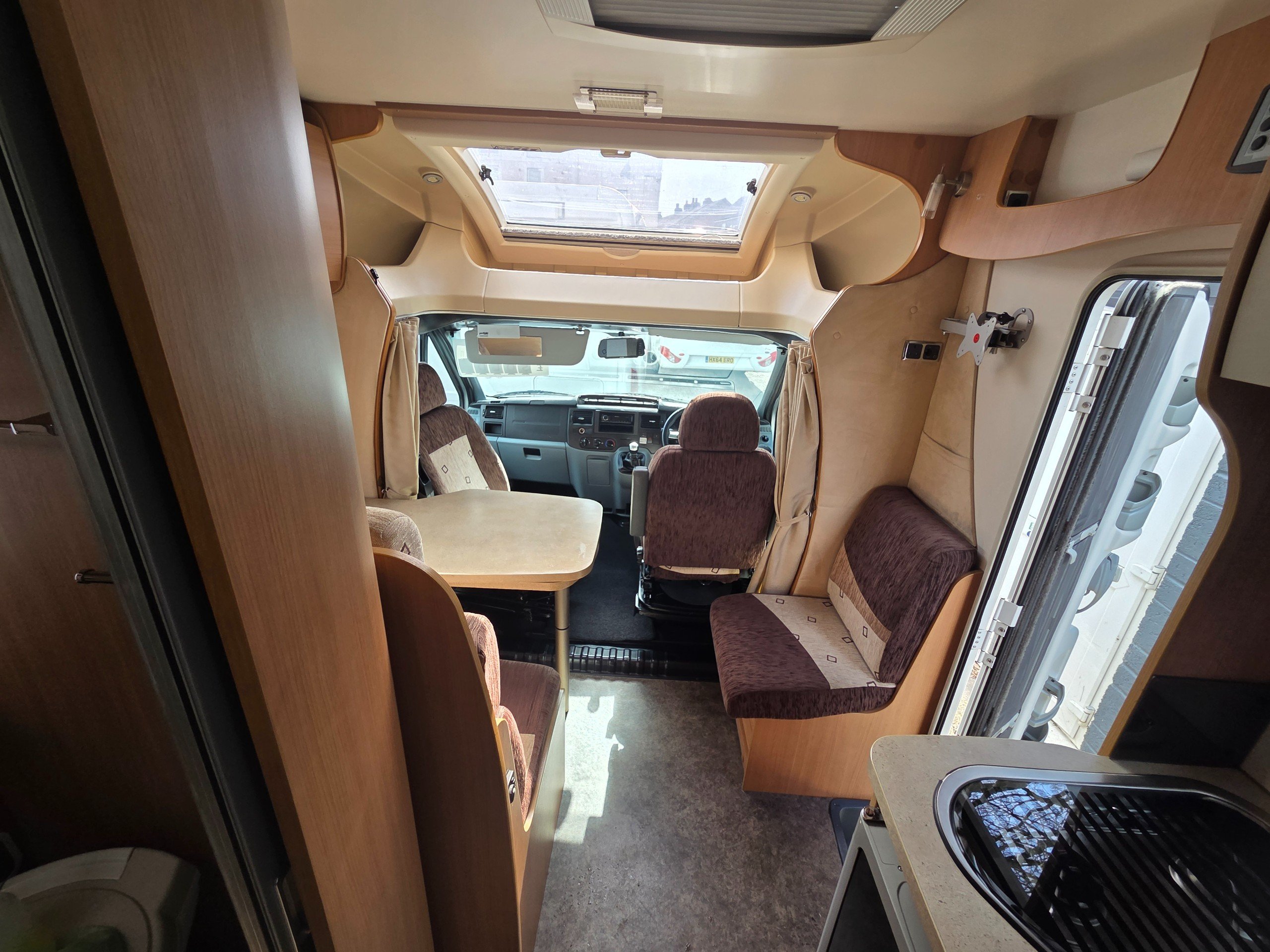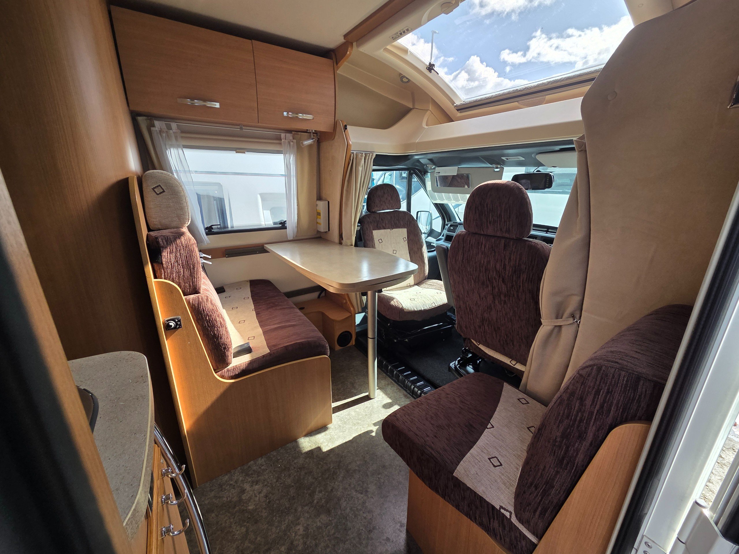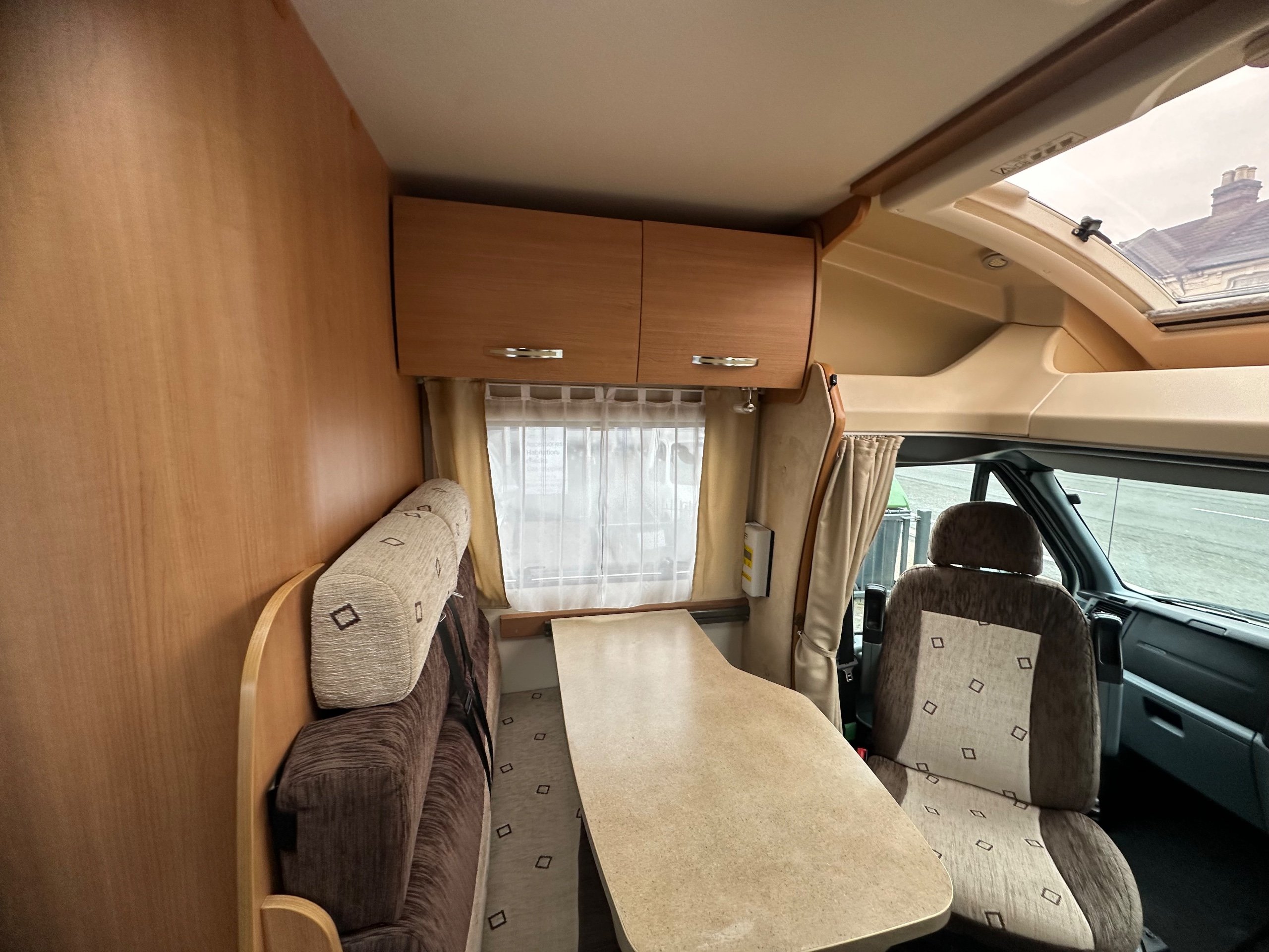 To the front is the lounge this is made up of a side single settee, forward facing dinnette which also houses 2 x 3 point seat belts and the cab seats swiveled around. The lounge also makes into a 3rd berth too. There is storage over head again as well as lovely skylight over the cab making it a bright place to be. There is space around the dining table with the extentsion spun out for 5 people great for having guests over.