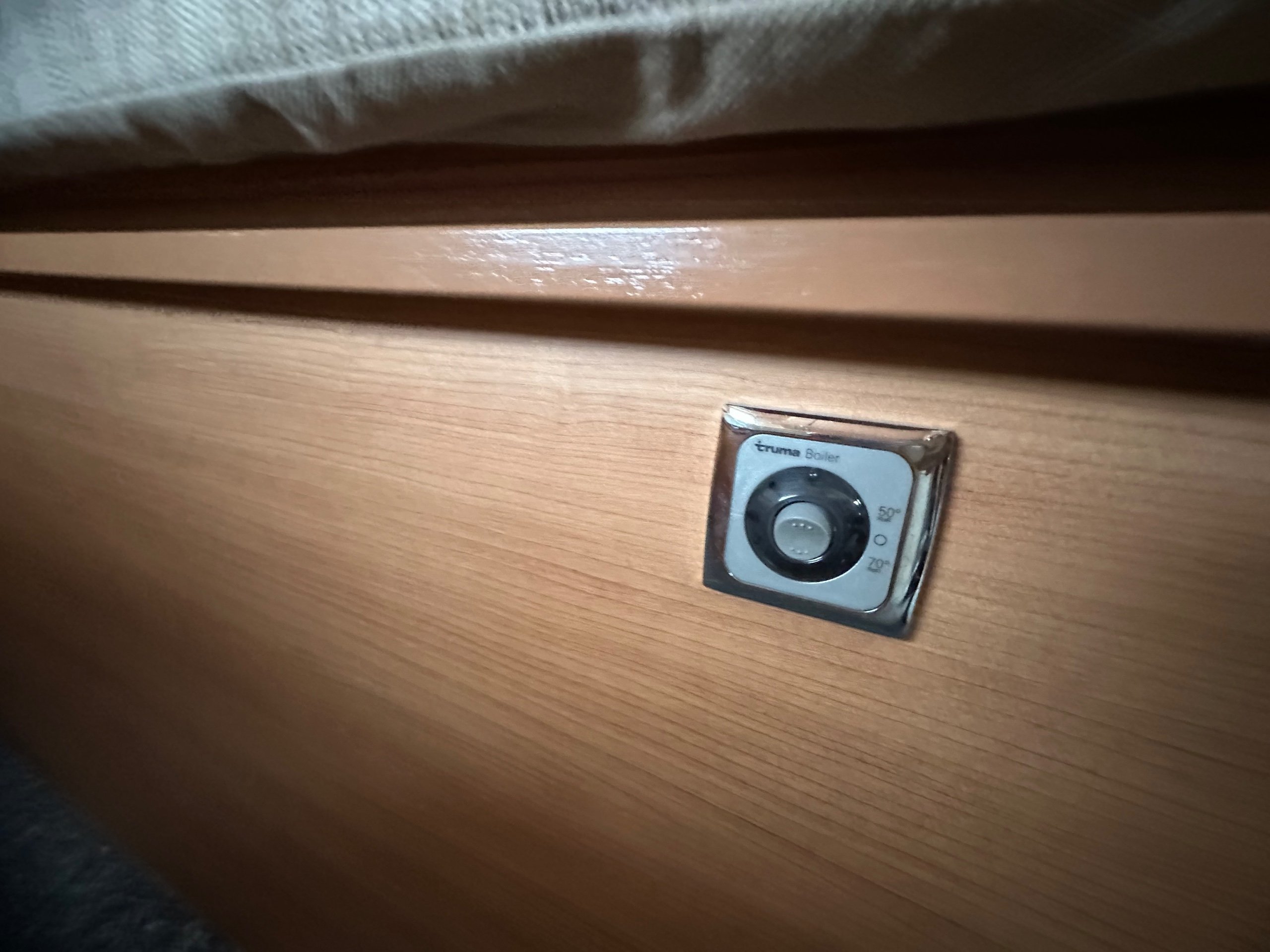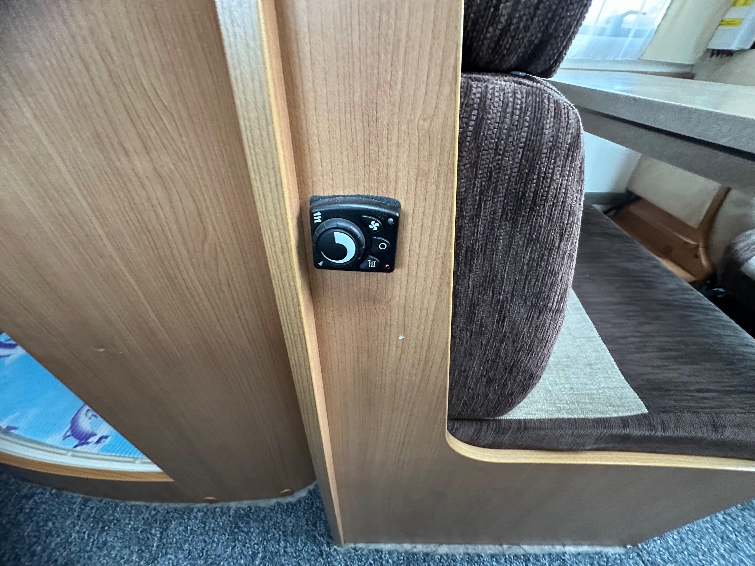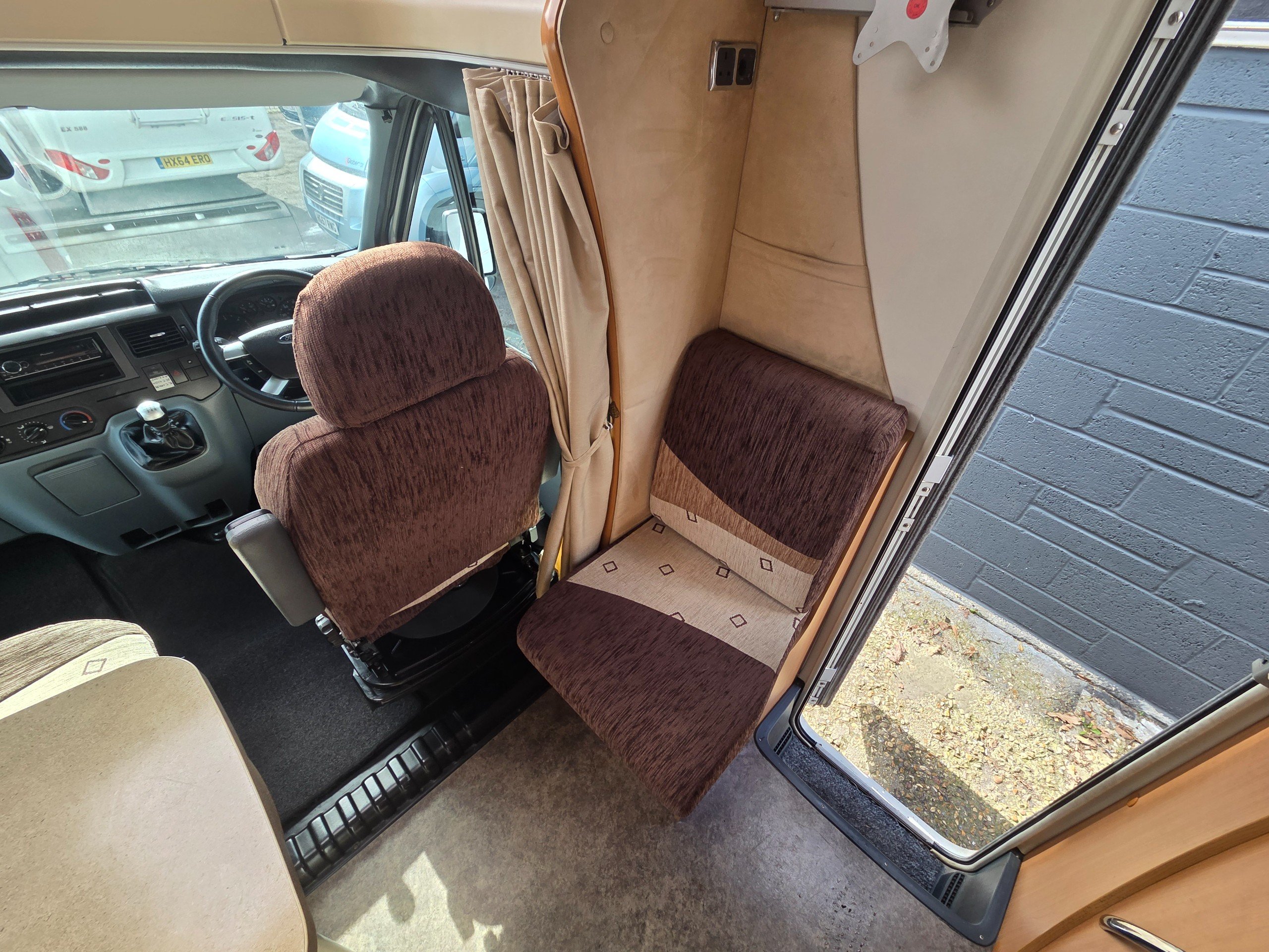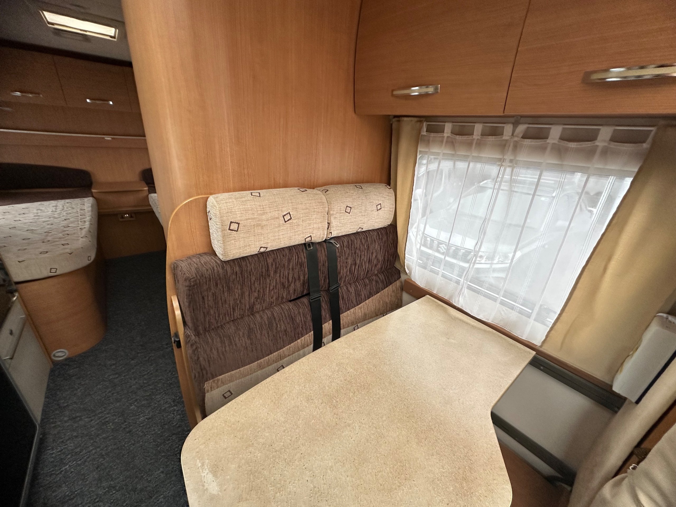 To the front is the lounge this is made up of a side single settee, forward facing dinnette which also houses 2 x 3 point seat belts and the cab seats swiveled around. The lounge also makes into a 3rd berth too. There is storage over head again as well as lovely skylight over the cab making it a bright place to be. There is space around the dining table with the extentsion spun out for 5 people great for having guests over.