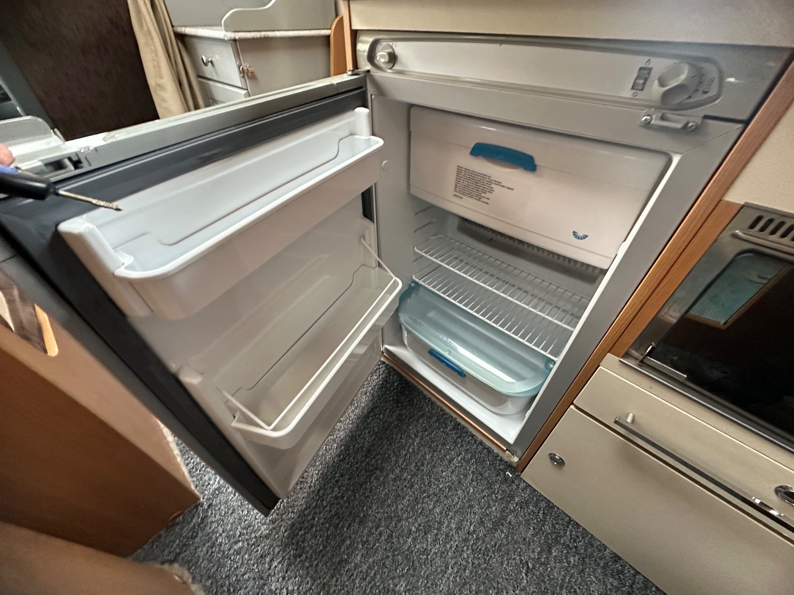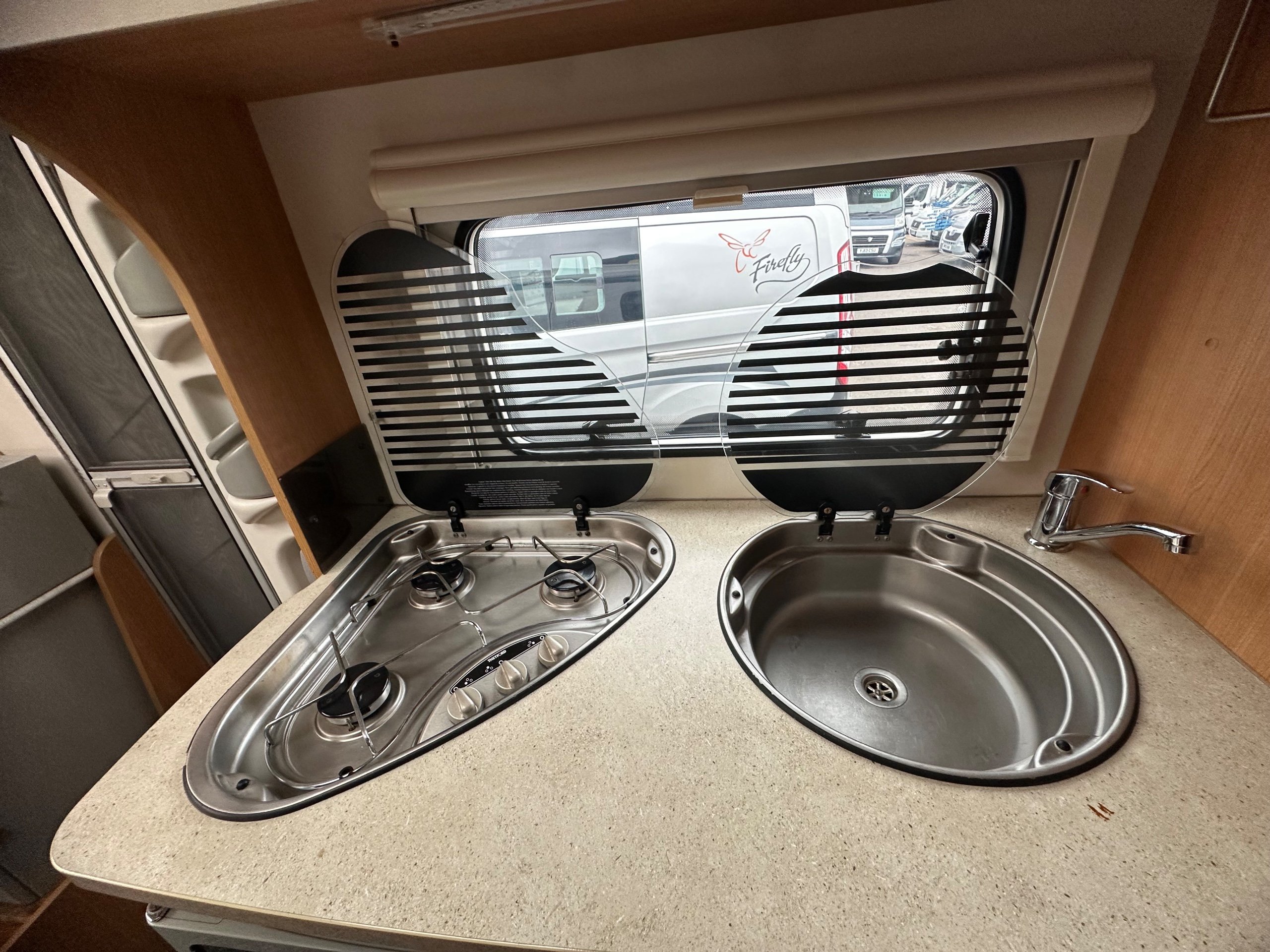 Centrally to the offside is the kitchen this has a 3 way fridge with freezer compartment, separate grill, 3 burner gas hob with glass lid, round sink with glass lid again having the glass lids allows for the more worktop space when they aren't being used. There is also storage for the groceries.