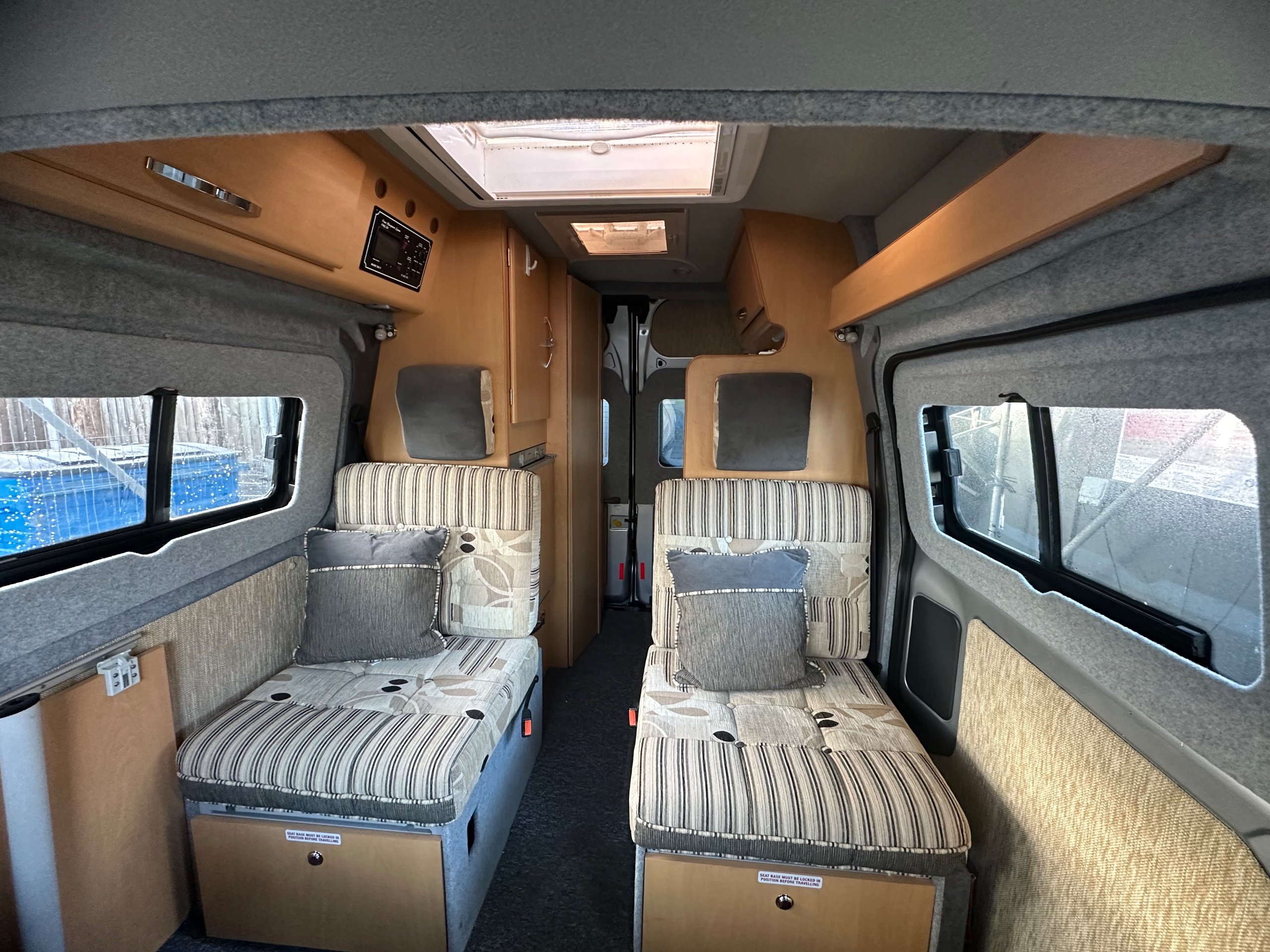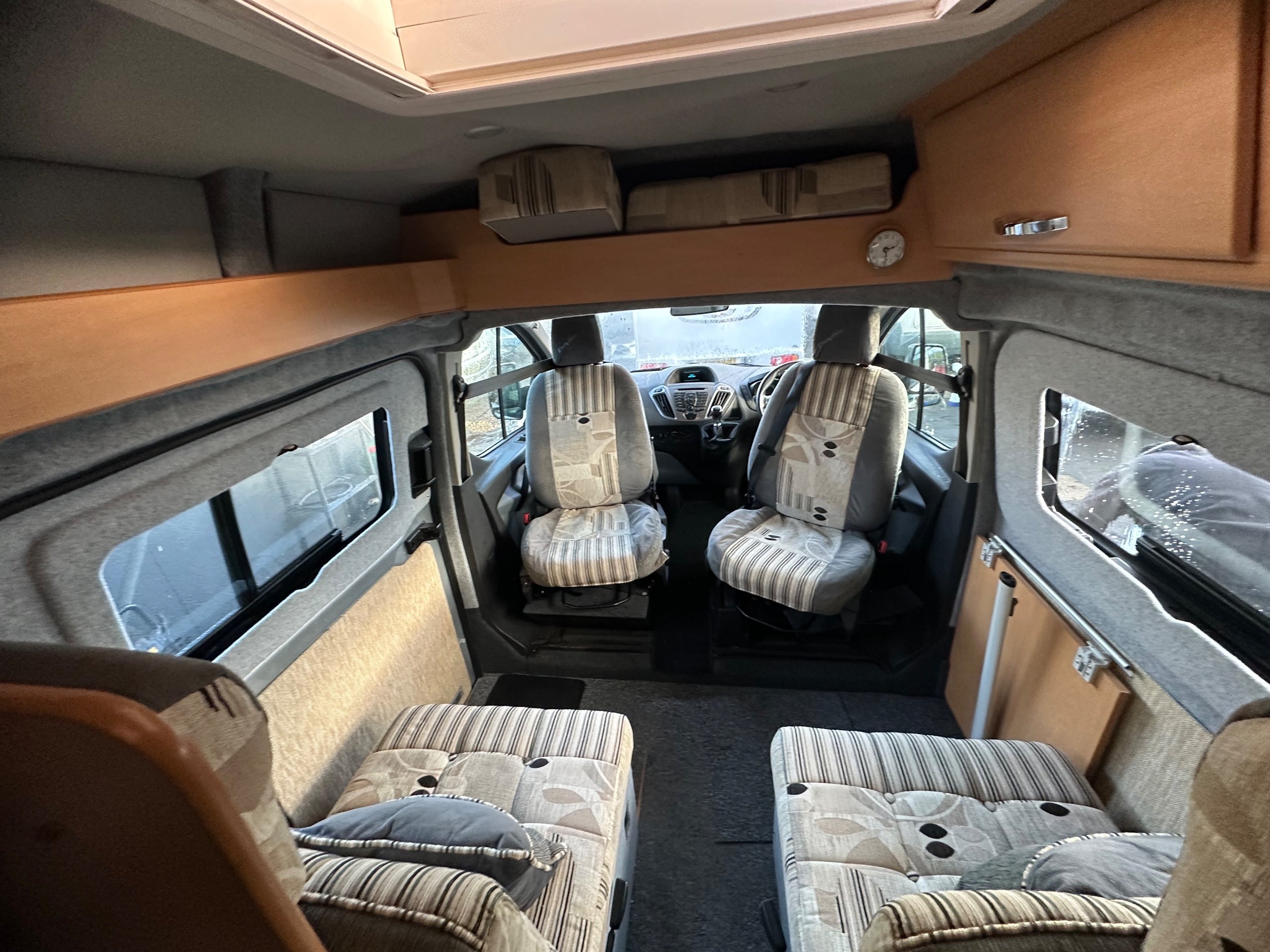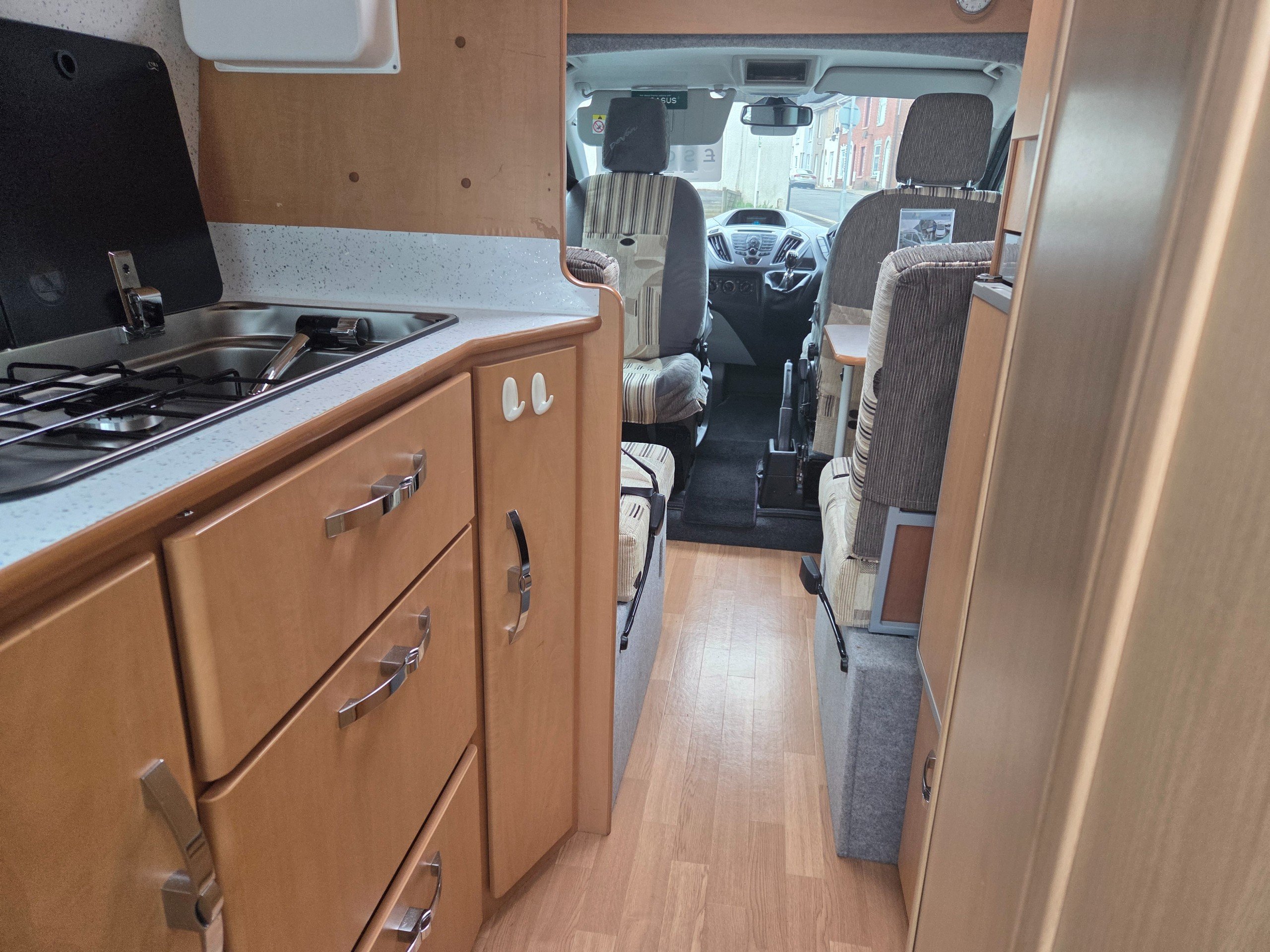 To the front is the lounge this makes into 2 single bed makes it much easier for getting up for the toilet in the night as you can just swing your legs around. You could of course leave the offisde bench down when lounging if you chose, this motorhome caravan also has the added benefit of a total of 4 traveling seat belts, great for taking friends/ family out for the day. This vehicle is in lovely condition inside and out.