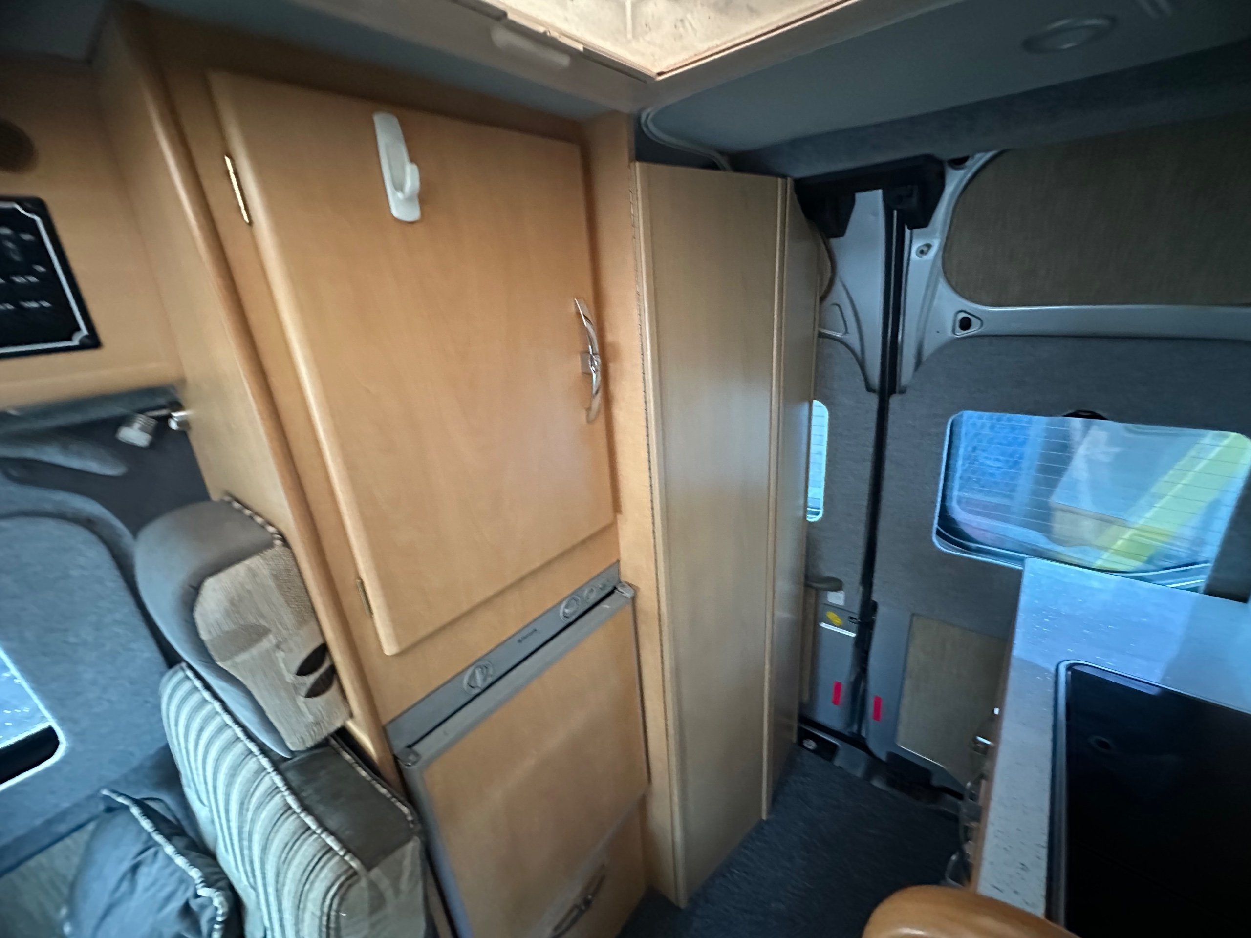 Opposite is the Toilet to rear which is covered with a door when not in use, a wardrobe and also the 3 way fridge with freezer box.