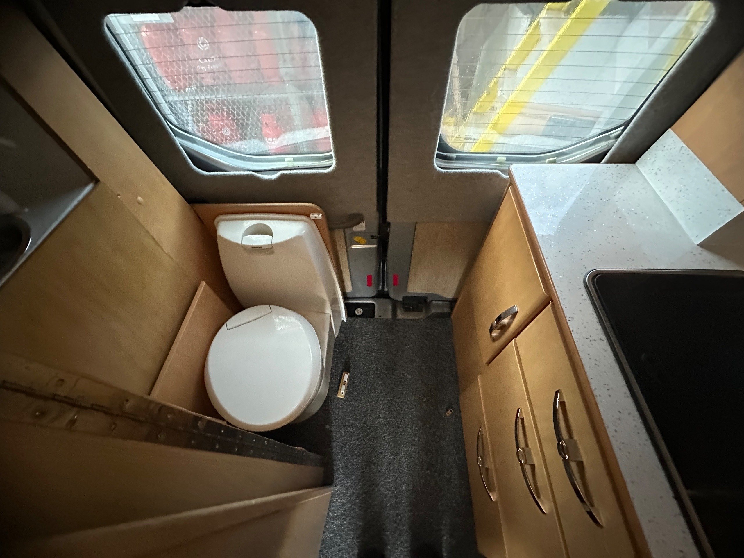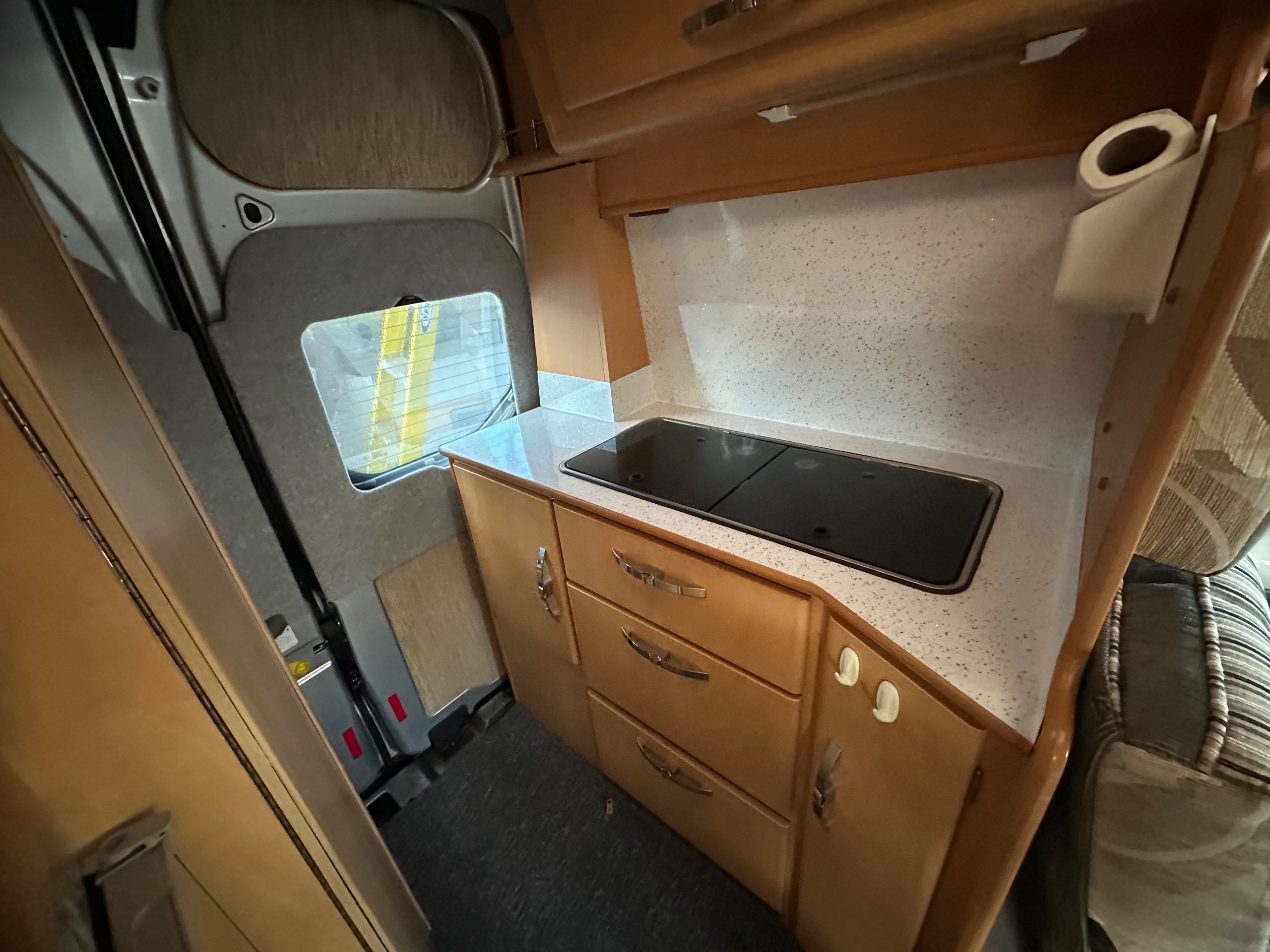 The rear kitchen is to the near side and has storage for food and pans etc and then there is a sink and 2 burner hob with glass lid so you have plenty of worktop space when not in use.