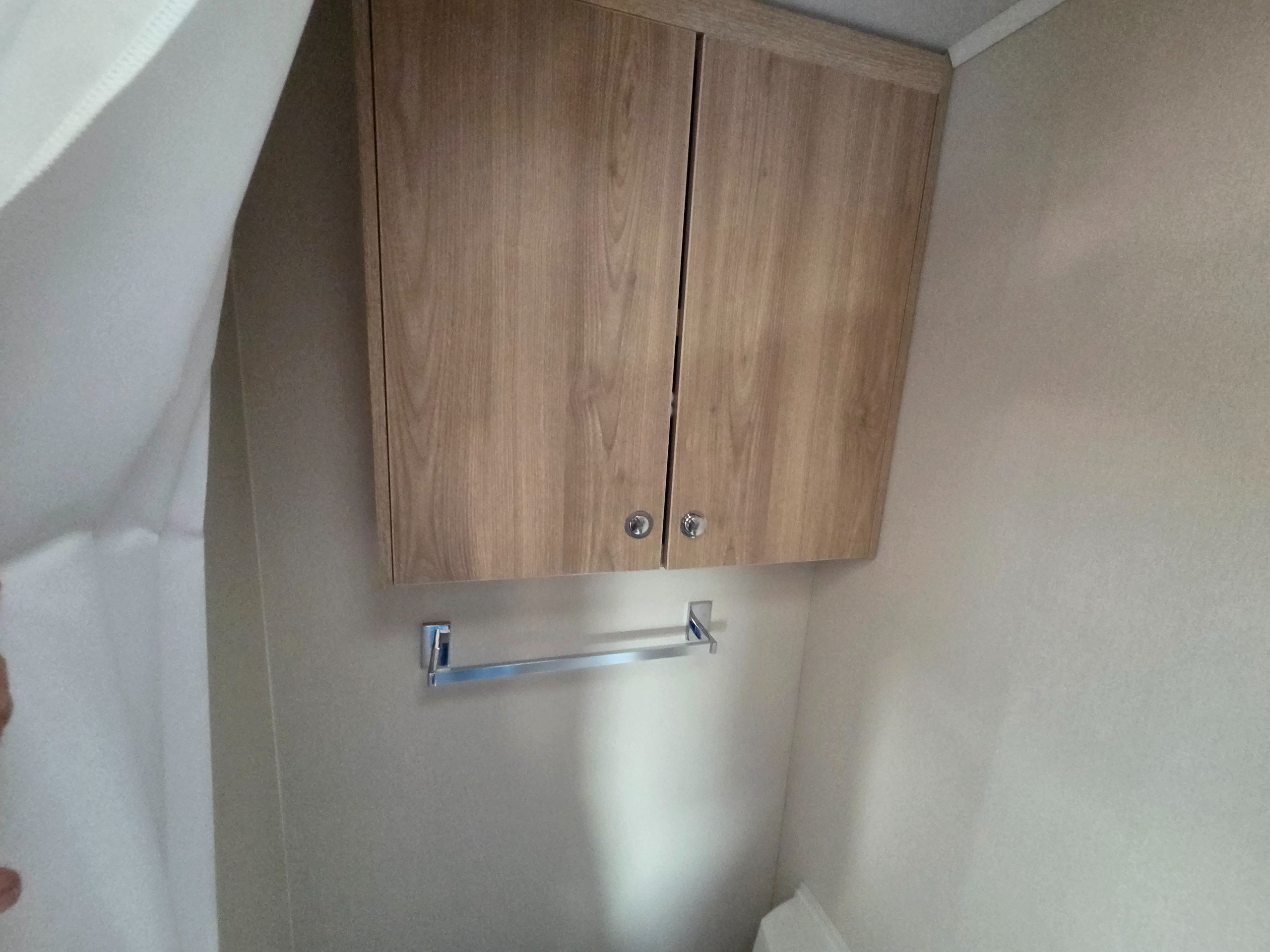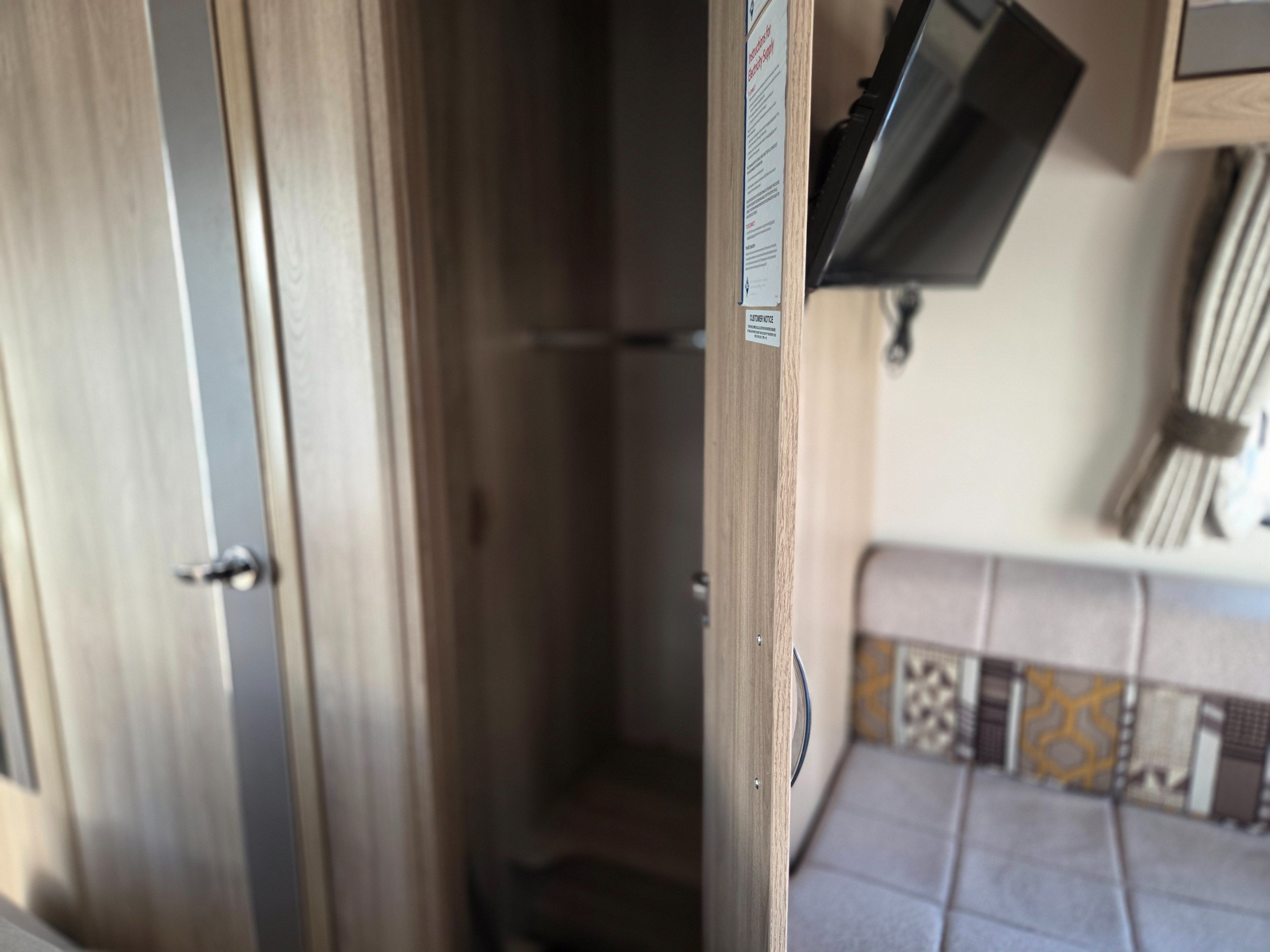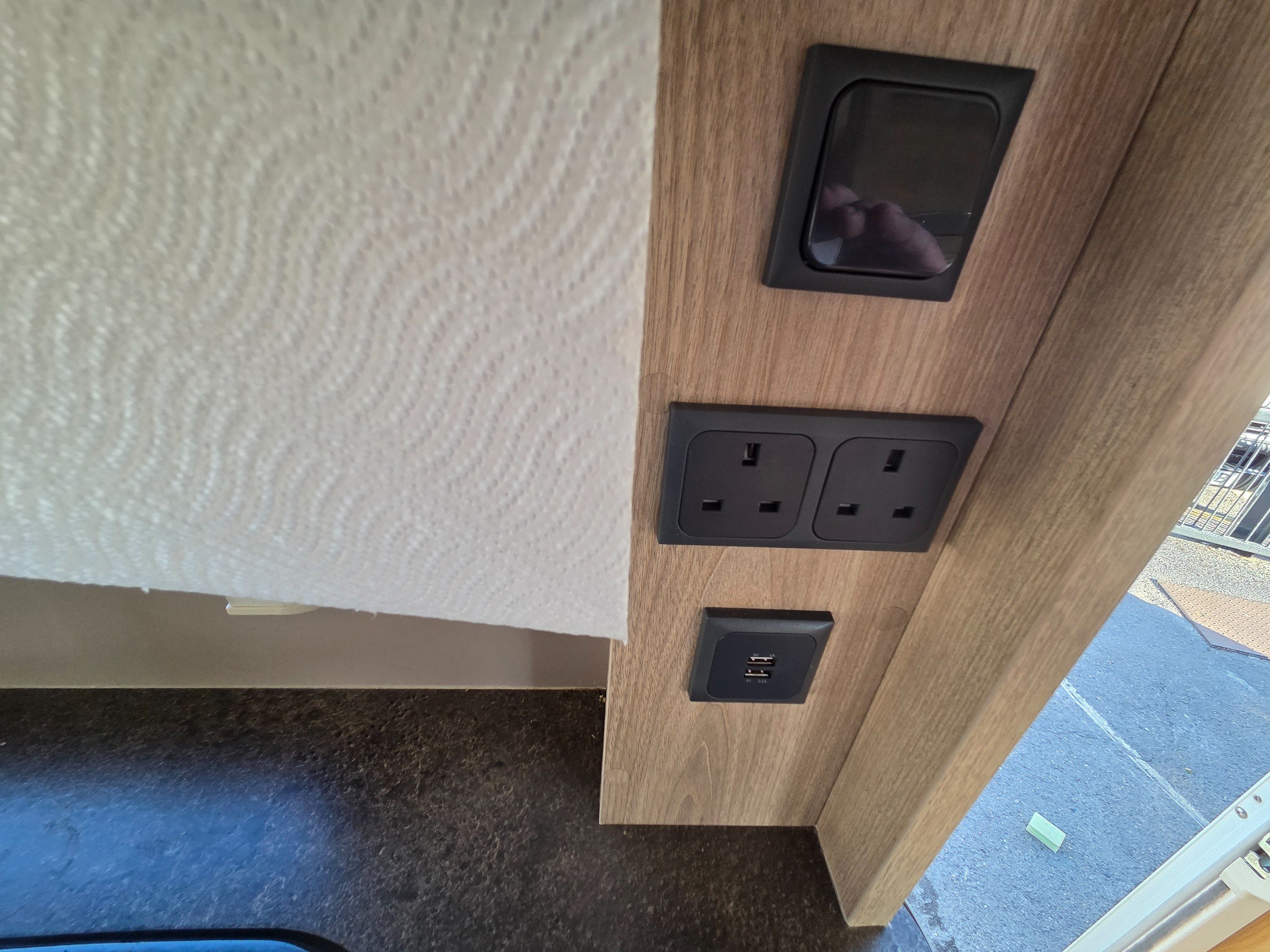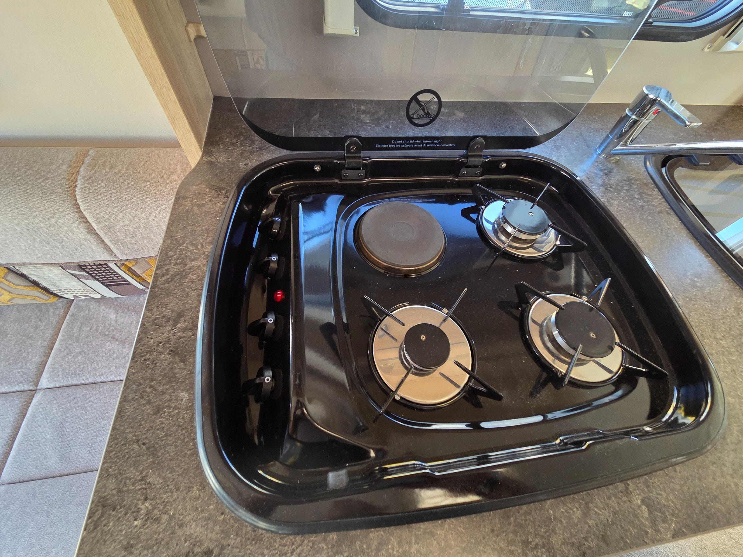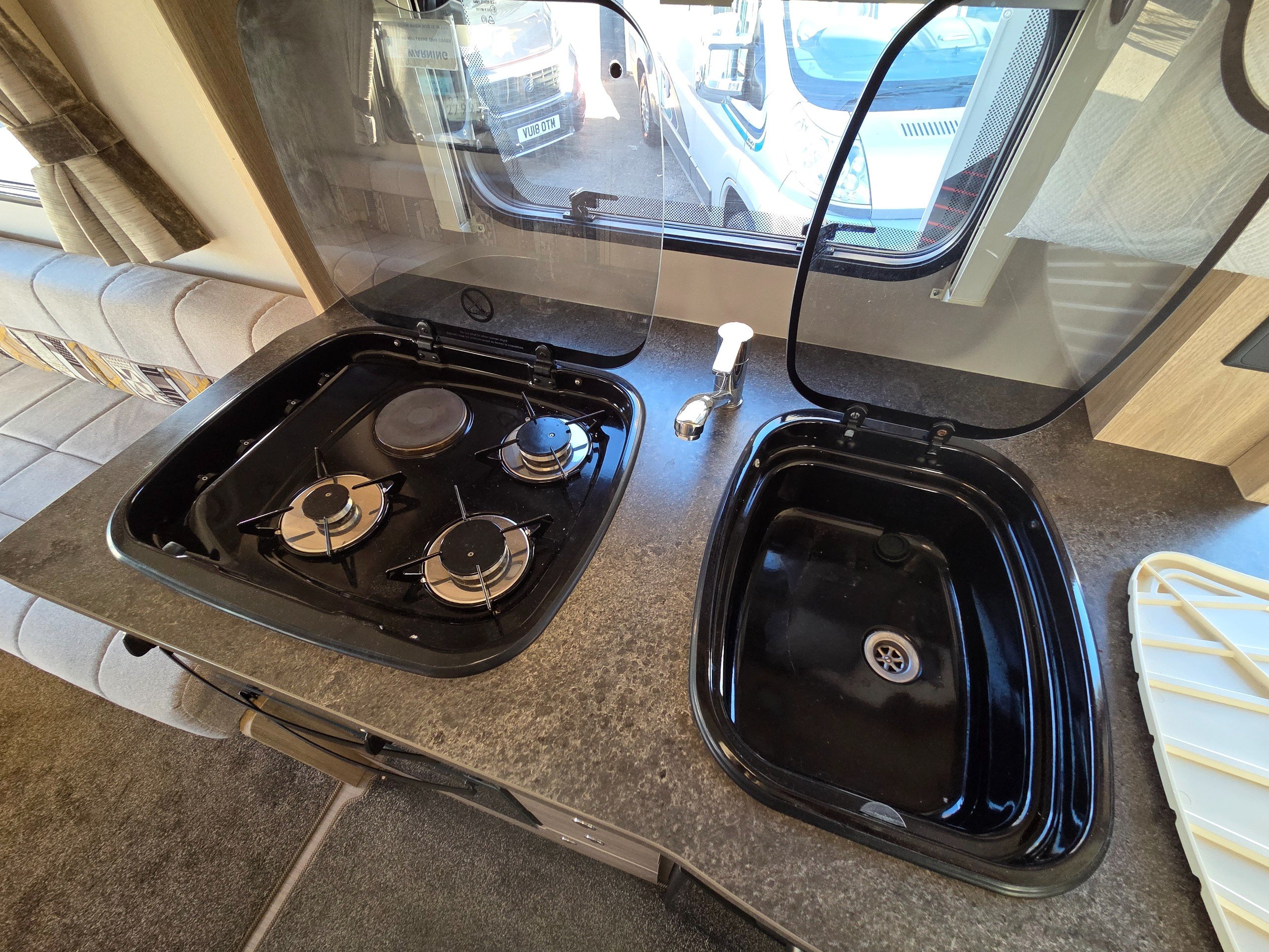 The kitchen is to the near side up from the lounge, there is an end drop leaf table somewhere to place the cuppa when watching TV or extra work surface when plating up. 3 burner gas hob, 1 electric hob with glass lid, separate oven, separate grill, microwave, 3 way fridge with freezer compartment, rectangle single with glass lid and drainer plastic infill. There are cupboards for the groceries high and low, 2 x 240v sockets for the kettle and air fryer extra along with some usb charging points for the tablets and phones.