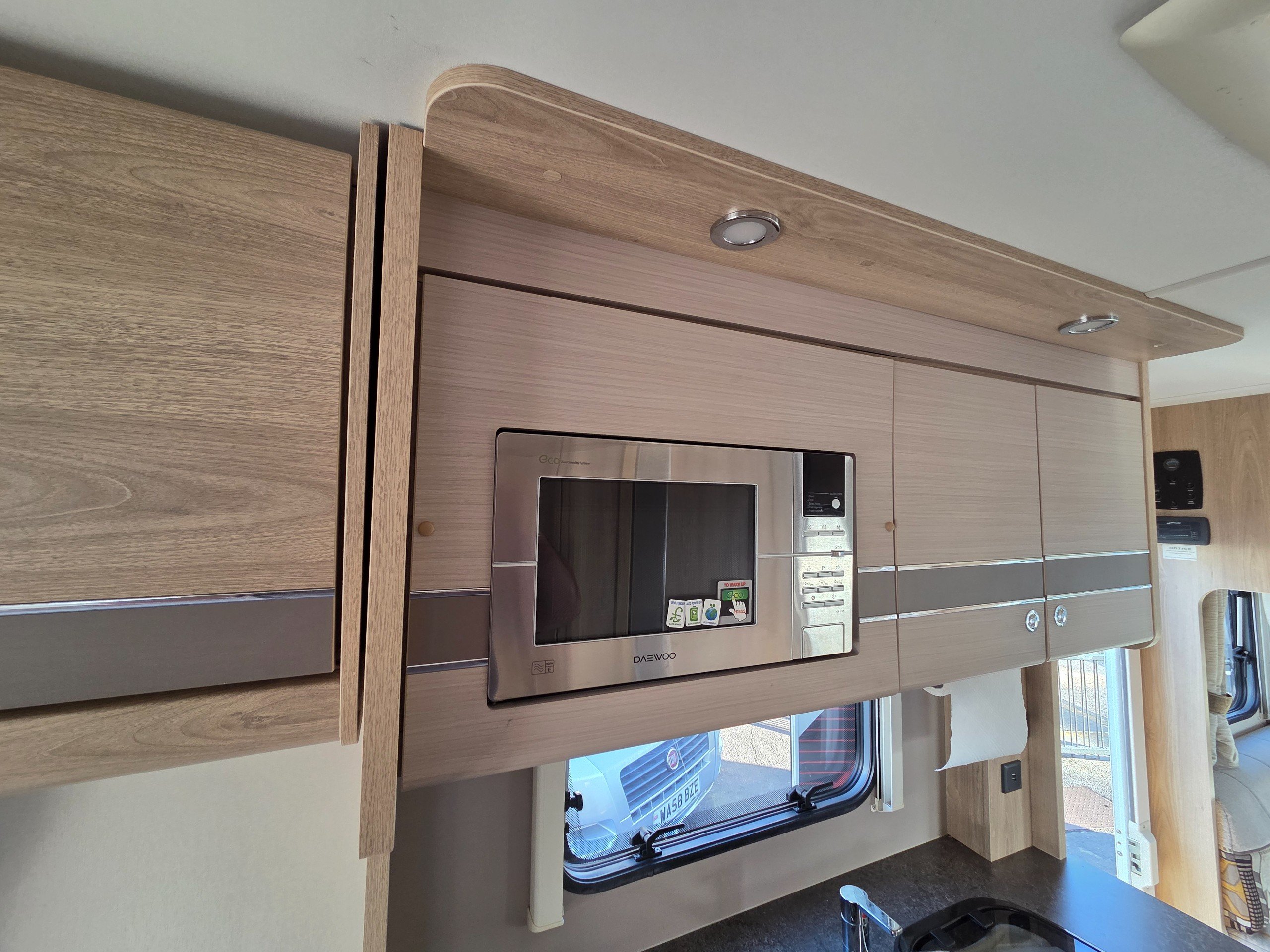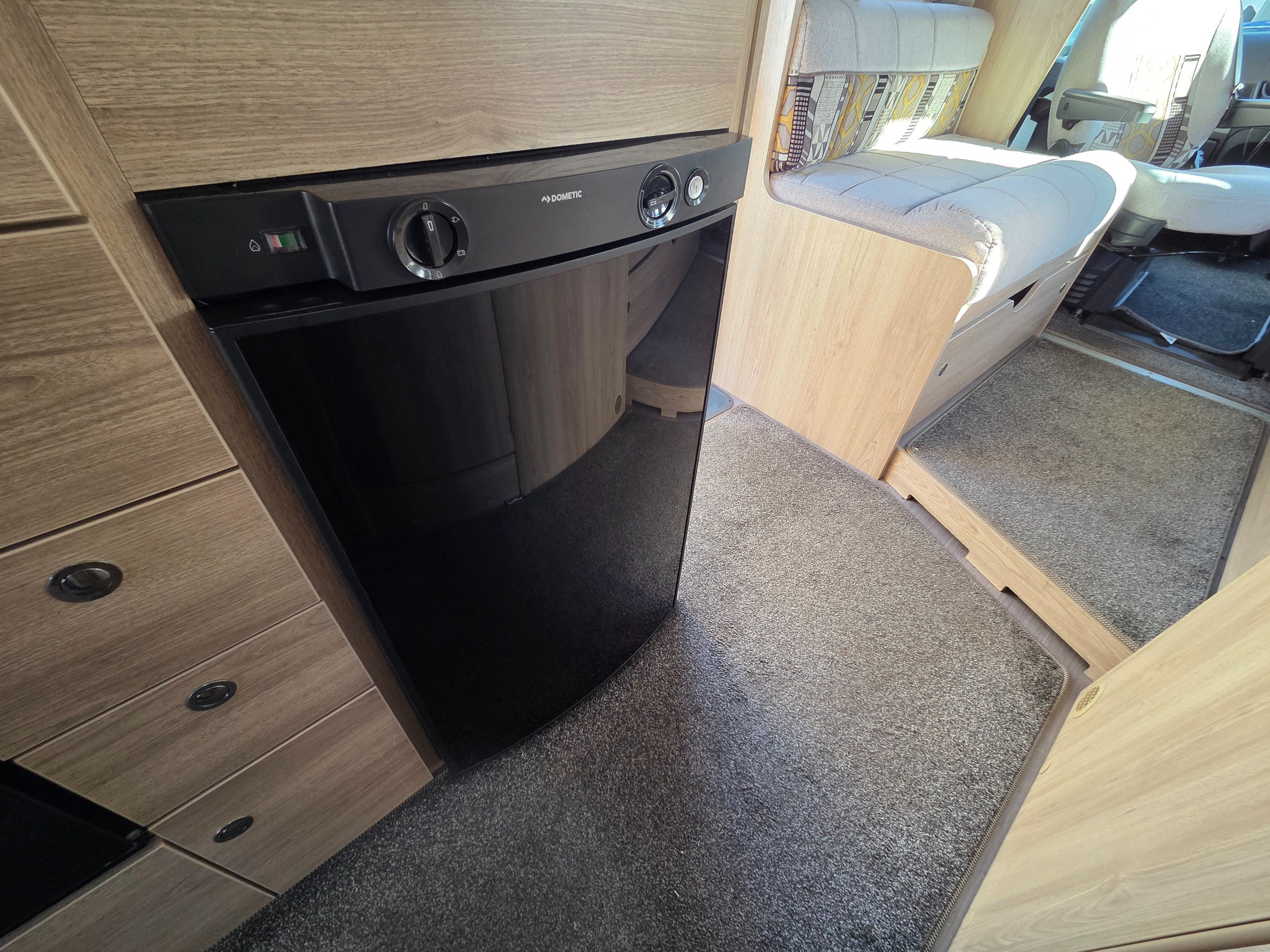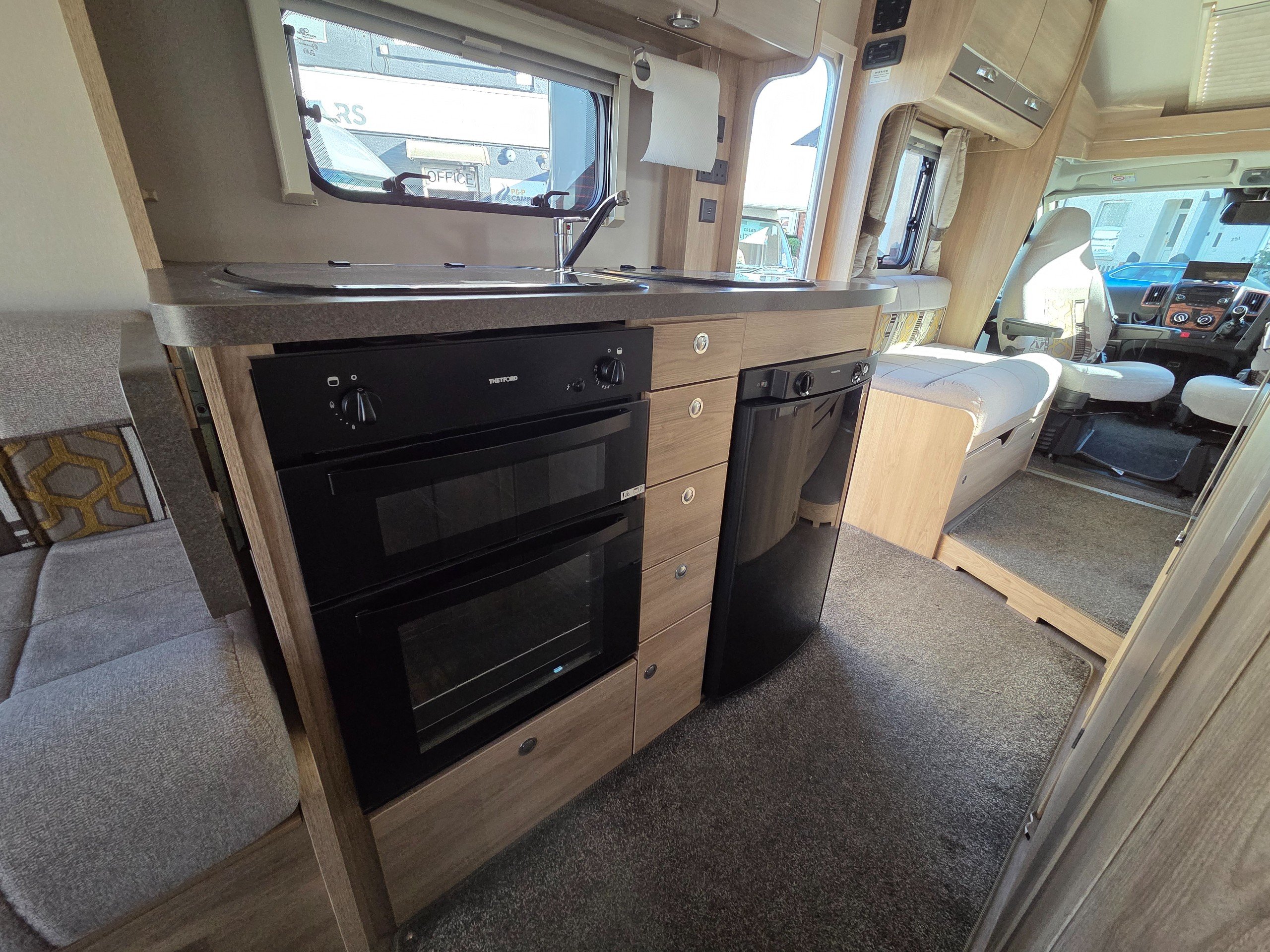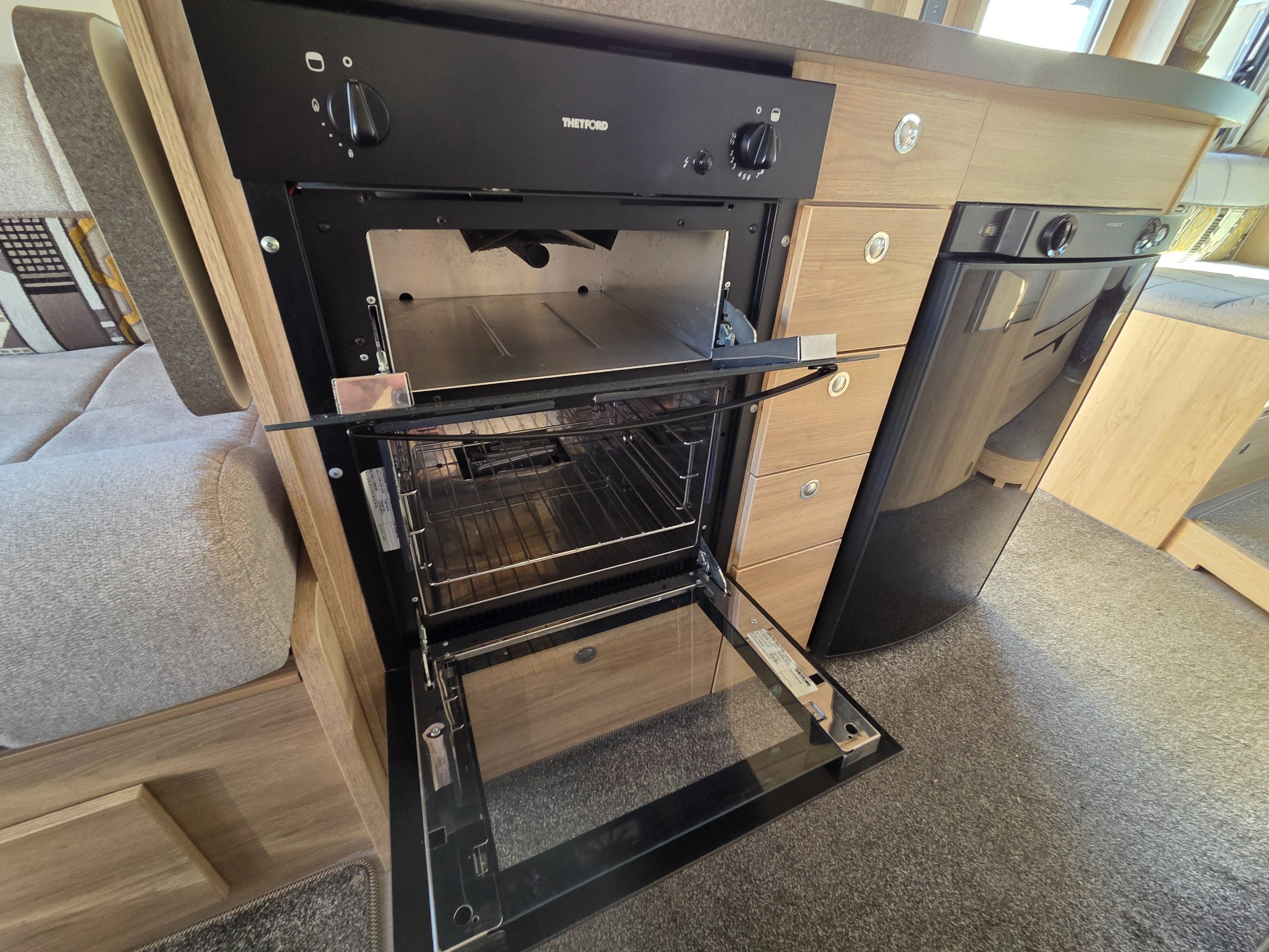 The kitchen is to the near side up from the lounge, there is an end drop leaf table somewhere to place the cuppa when watching TV or extra work surface when plating up. 3 burner gas hob, 1 electric hob with glass lid, separate oven, separate grill, microwave, 3 way fridge with freezer compartment, rectangle single with glass lid and drainer plastic infill. There are cupboards for the groceries high and low, 2 x 240v sockets for the kettle and air fryer extra along with some usb charging points for the tablets and phones.