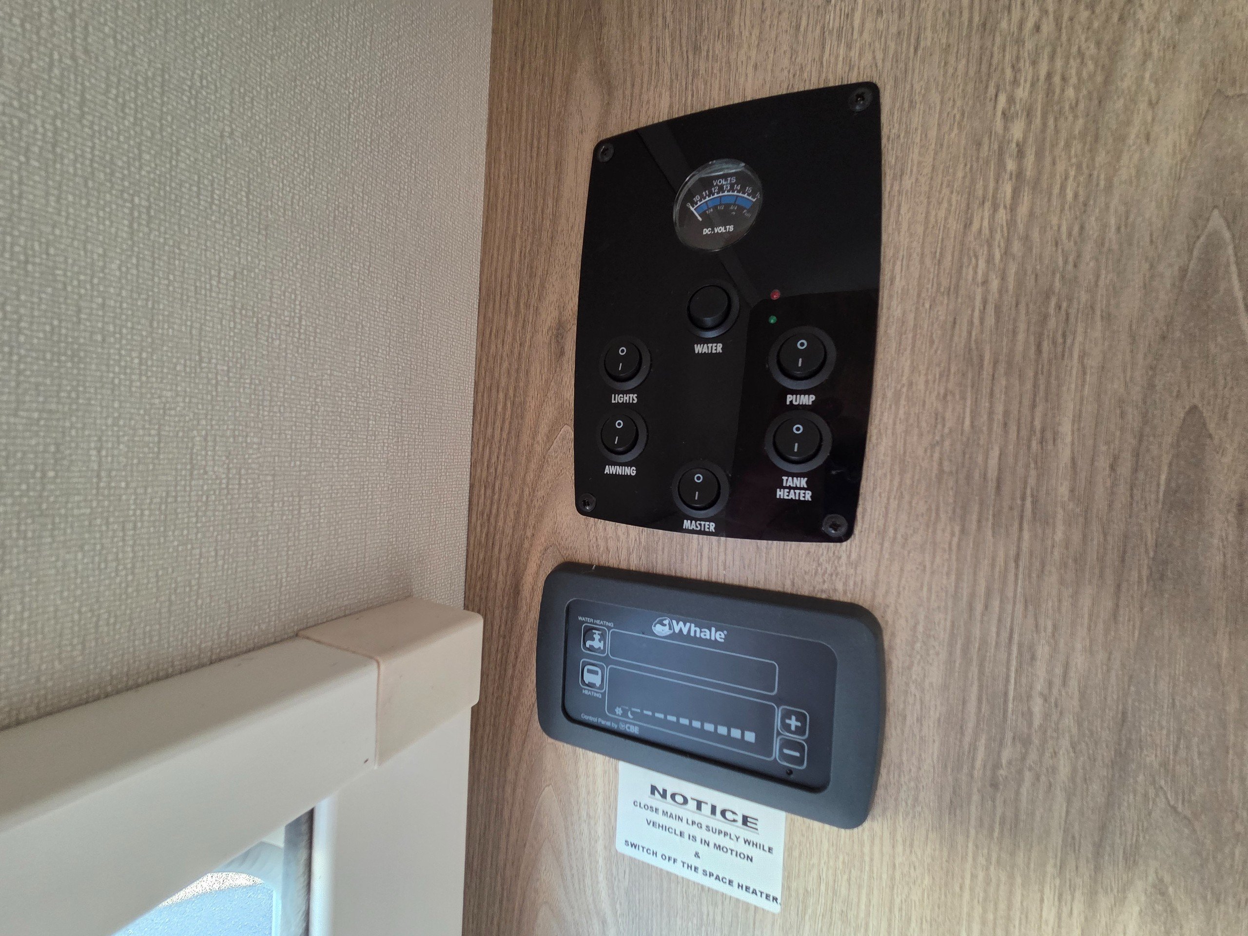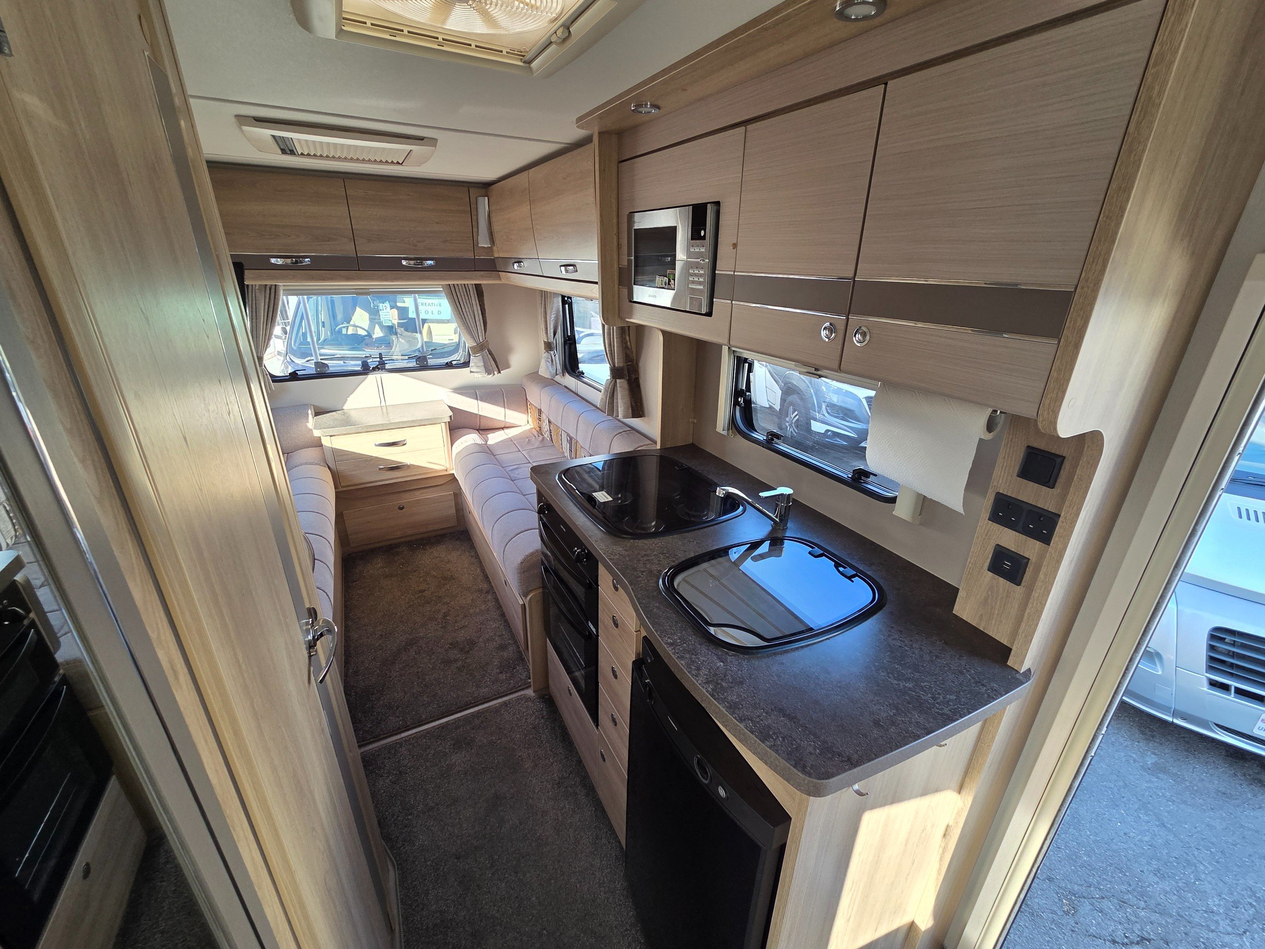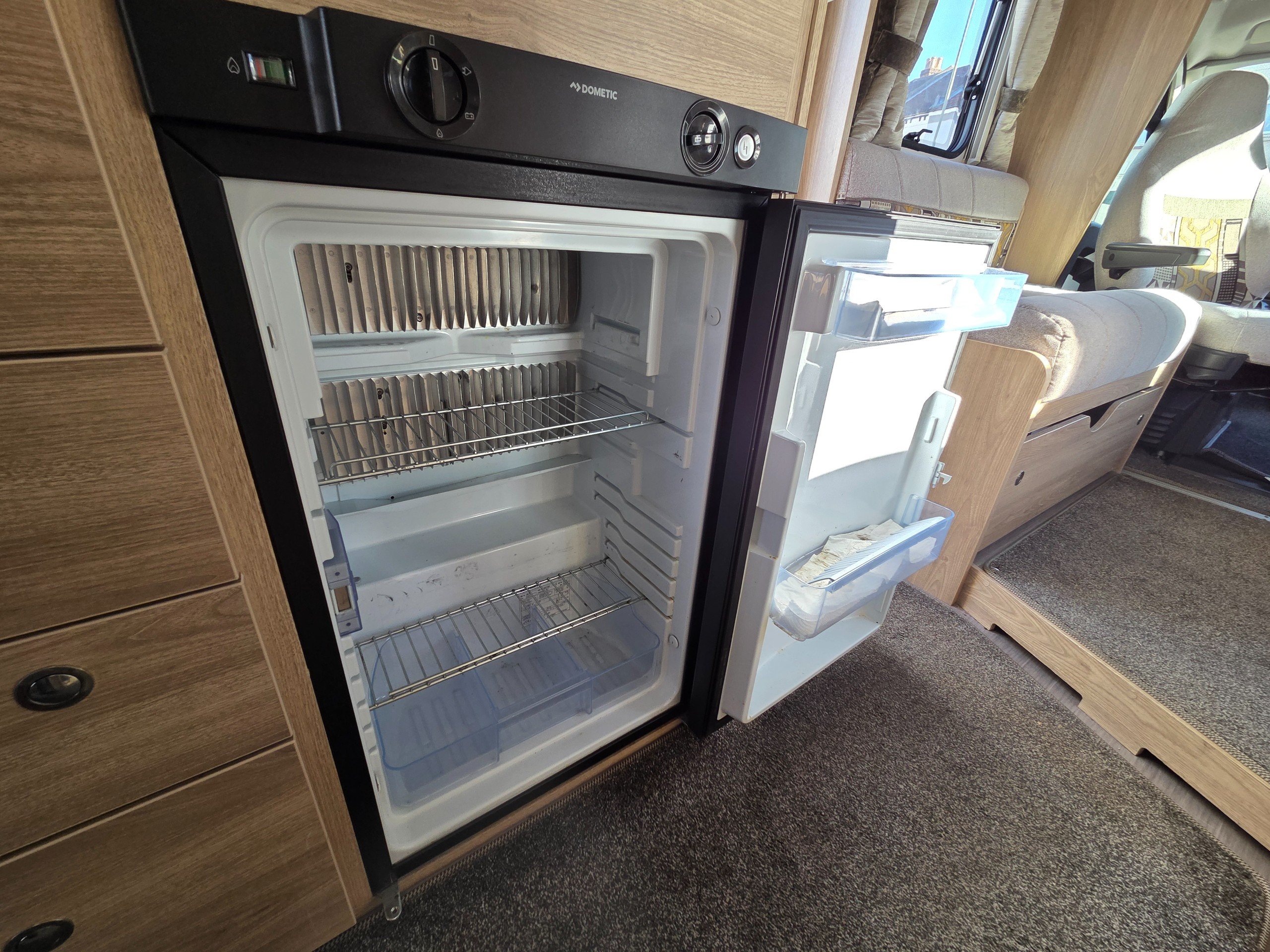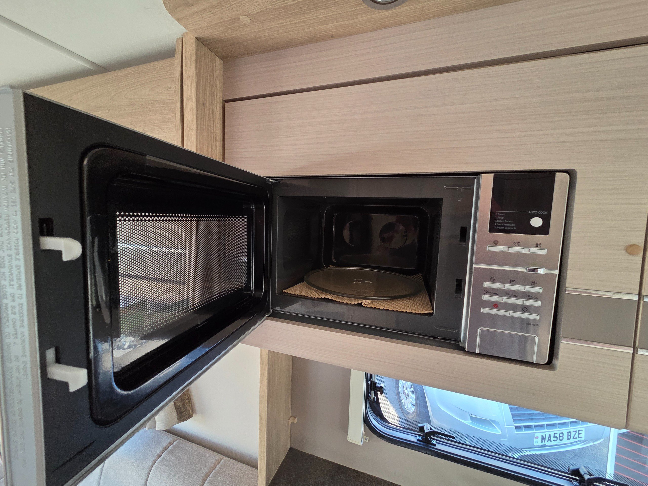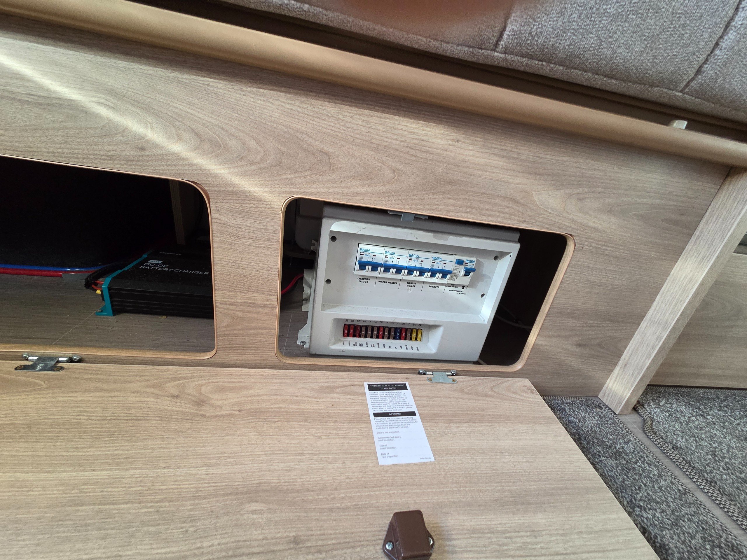 The kitchen is to the near side up from the lounge, there is an end drop leaf table somewhere to place the cuppa when watching TV or extra work surface when plating up. 3 burner gas hob, 1 electric hob with glass lid, separate oven, separate grill, microwave, 3 way fridge with freezer compartment, rectangle single with glass lid and drainer plastic infill. There are cupboards for the groceries high and low, 2 x 240v sockets for the kettle and air fryer extra along with some usb charging points for the tablets and phones.
